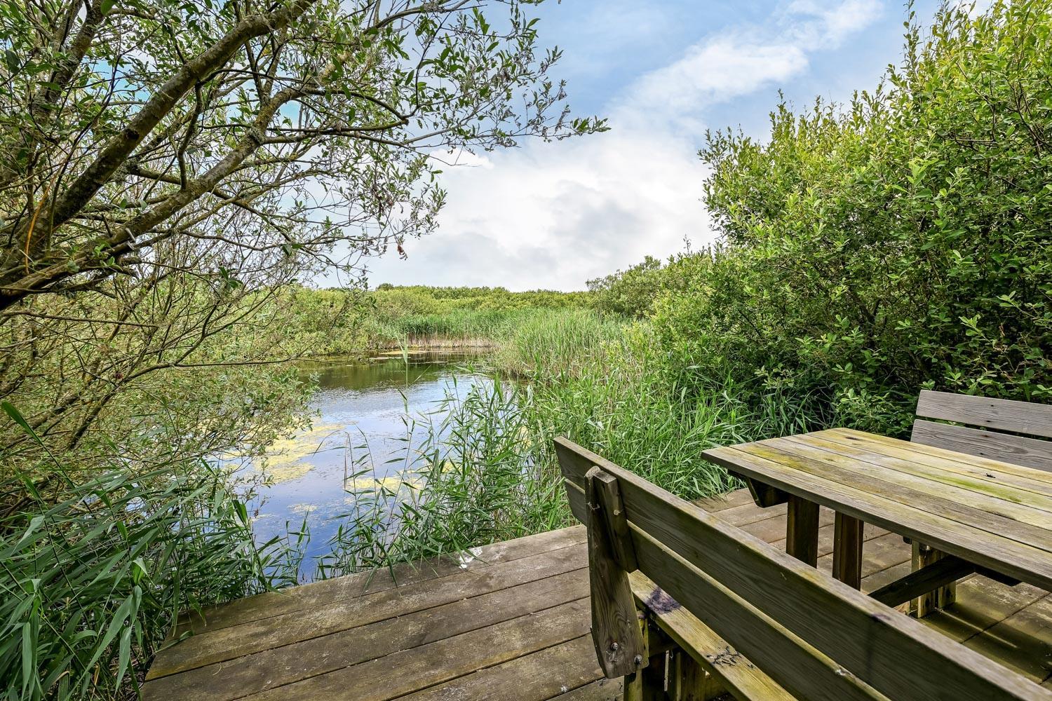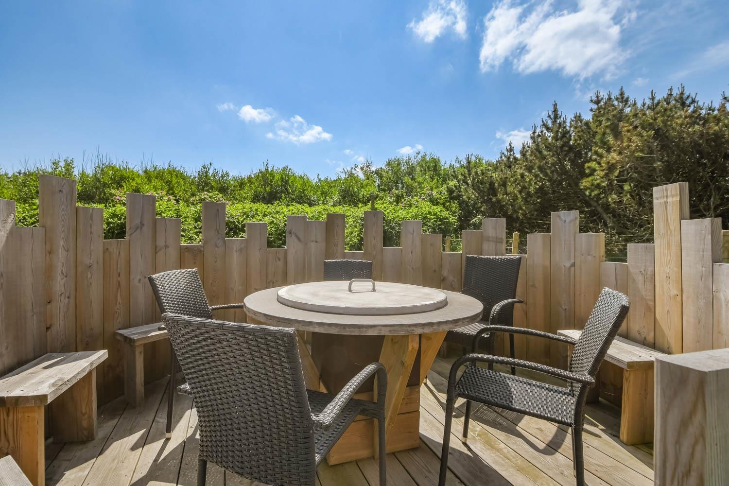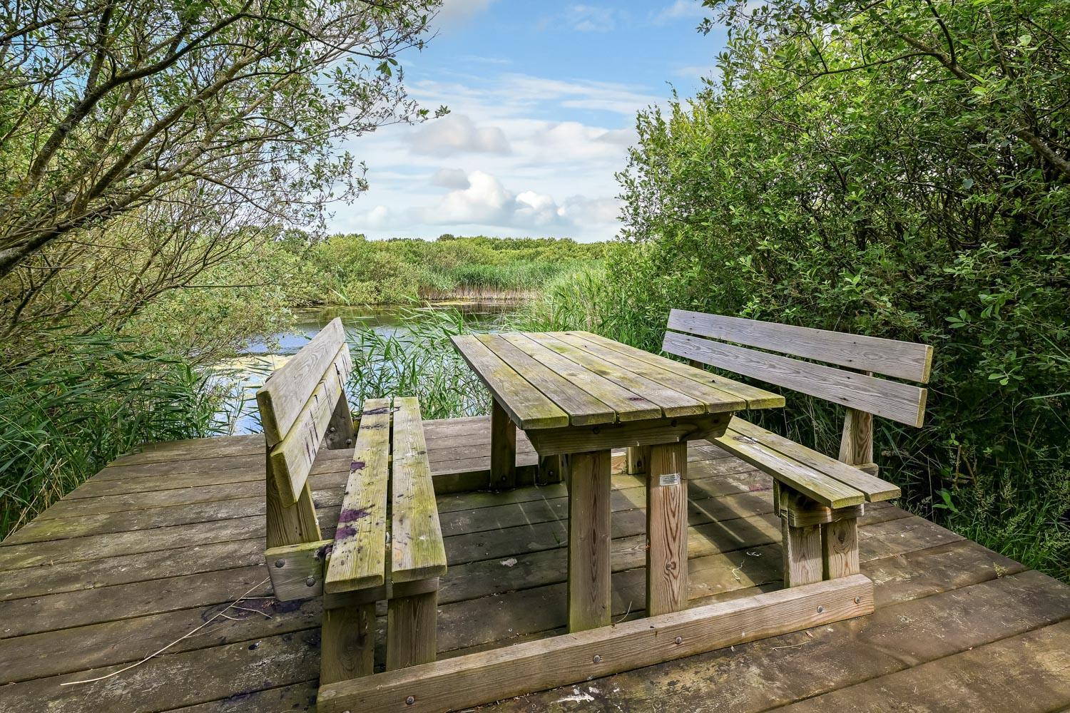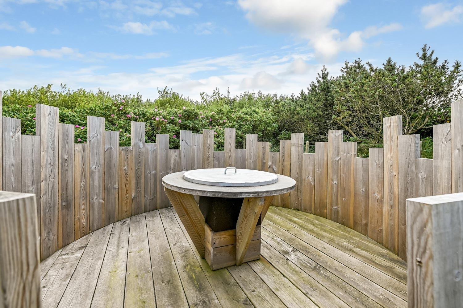 Beliggende på en dejlig privat grund på ca. 1.950 m2. Huset er beliggende tæt på en lille sø, hvor man fra terrassen med bord og bænkesæt kan sidde og nyde udsigten over søen. Huset ligger ca. 500 m fra indkøb og 750 m fra Vesterhavet. Fra lille entre er der udgang til naturgrunden og den dejlige nyanlagte træterrasse. Ved deb ene gavl af huset er der opstillet en bænk for her er der altid læ og der er det perfekte sted til at nyde en kop kaffe eller en god bog. Havemøbler og grill. Også området madsted ligger ca. 500 fra huset. Inden for 25-30 minutter kan flere aktiviteter og shoppingmuligheder nås.