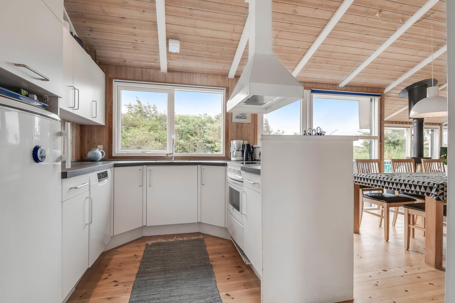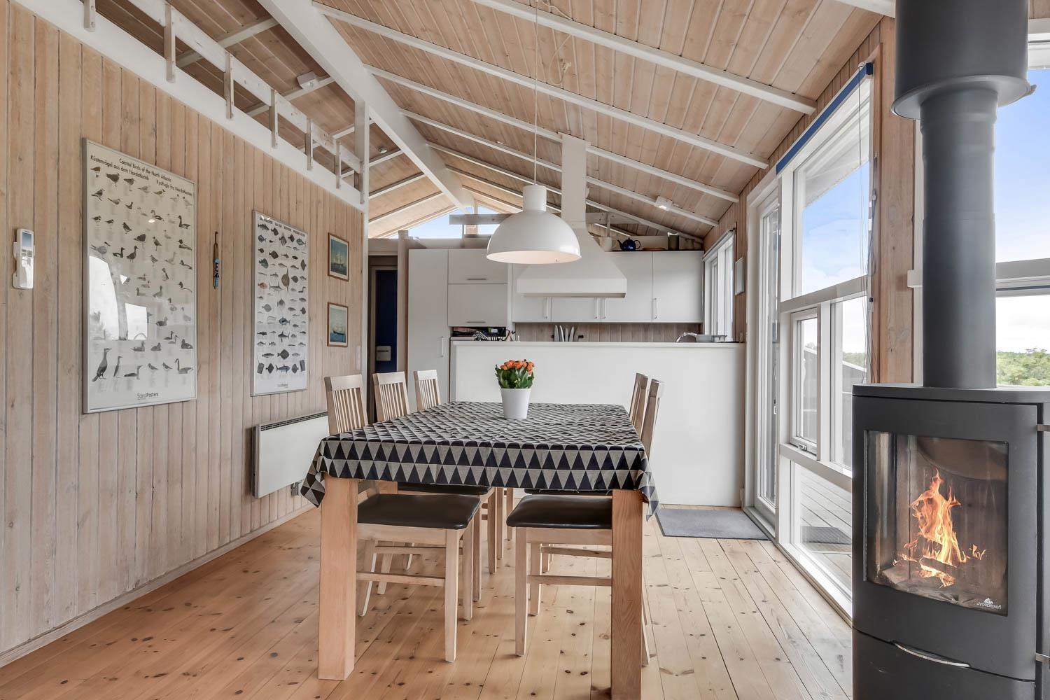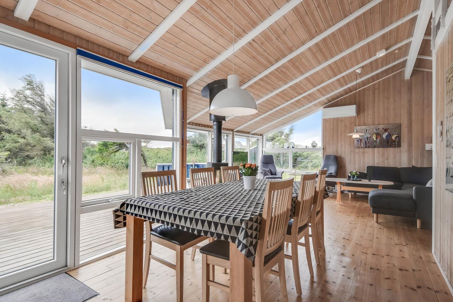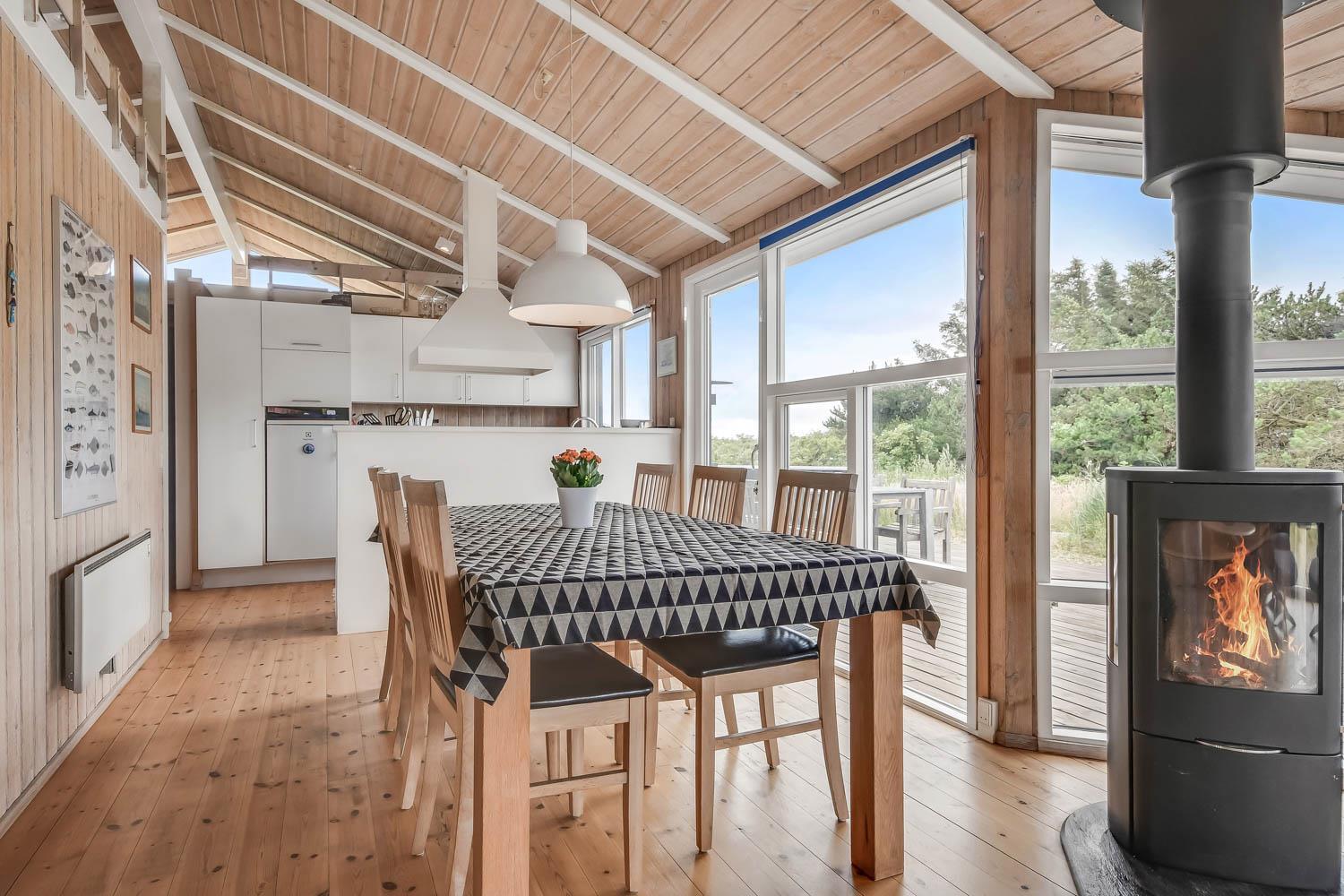 I entreen er der vaskemaskine og tørretumbler samt god mulighed for at hænge overtøjet op. Fra entreen er der indgang til et af husets badeværelser som er indrettet med toilet, håndvask og bruser, Fra entreen er der også indgang til 2 af husets soveværelser. Kombineret køkken og stue. Køkkenet er indrettet med komfur med keramisk kogeplade, køleskab, opvaskemaskine og mikroovn. Flot stue som er åbnet op til kip. Ved køkkenet er spisebordet placeret og i den anden ende af stuen er der flotte polstermøbler, TV med danske og tyske programmer samt Chromecast med mulighed for streaming af egne programmer. Der er en skøn brændeovn samt en varmepumpe som begge er medvirkende til at give et lavere forbrug. Fra stuen er der udgang til terrassen. Fra stuen er der også udgang til en gang hvorfra man kan komme ind på det sidste badeværelse i huset som rummer toilet, håndvask, bruser, spabad og adgang til sauna og her er der flisegulv med gulvvarme. Det andet soveværelse ligger også her. Huset har i alt 3 soveværelser: Dobbeltseng + Dobbeltseng + Dobbeltseng + Hems: 2 liggemuligheder. Til de mindste gæster er der barneseng og barnestol. 1 husdyr er tilladt. Ikke rygerhus.