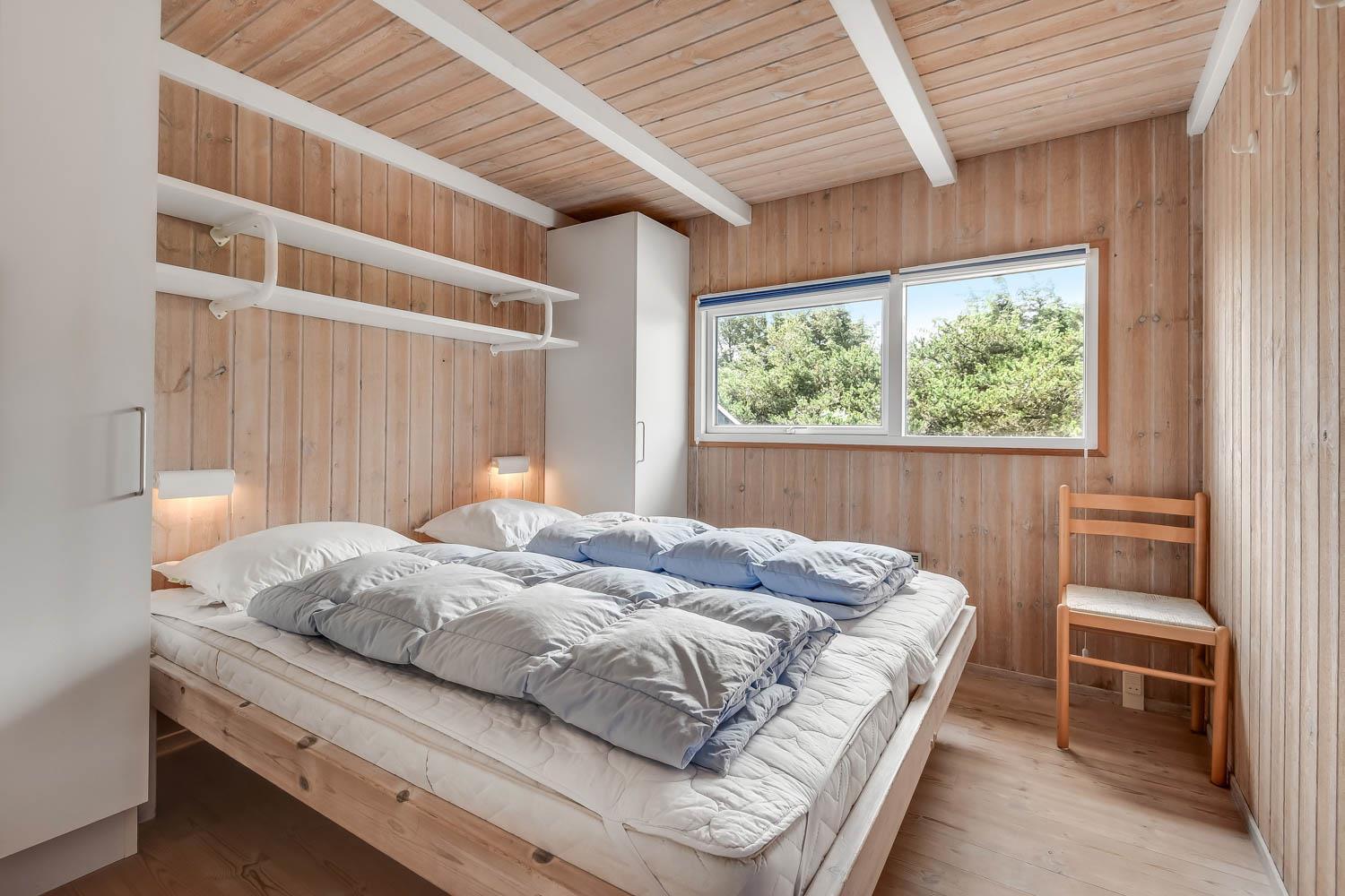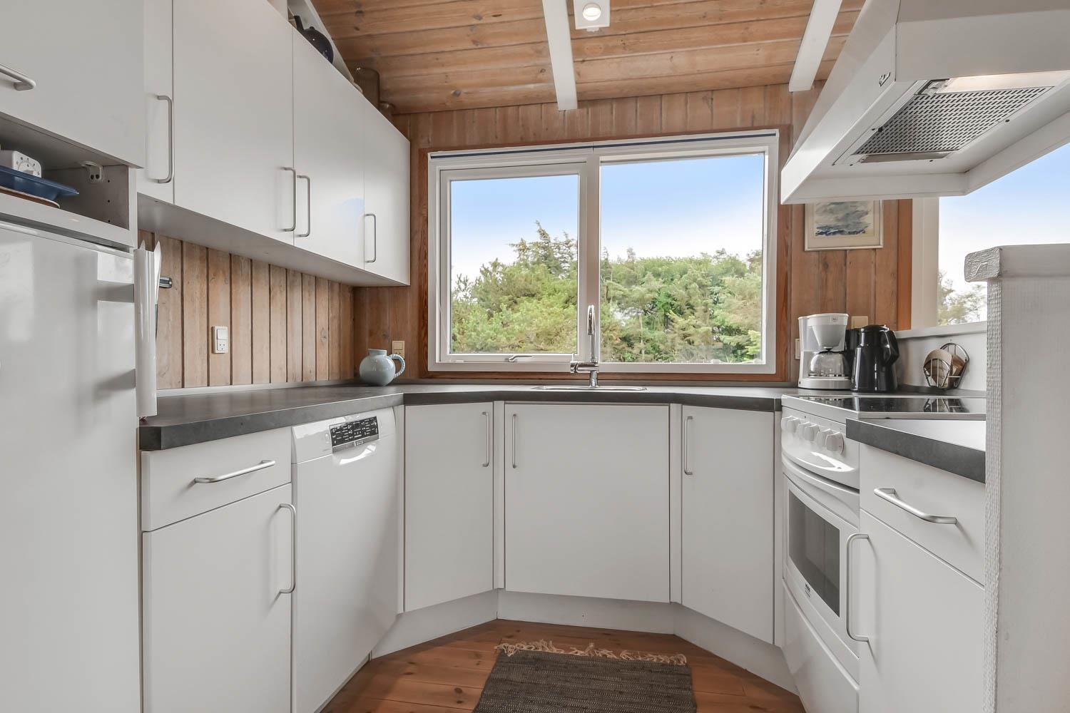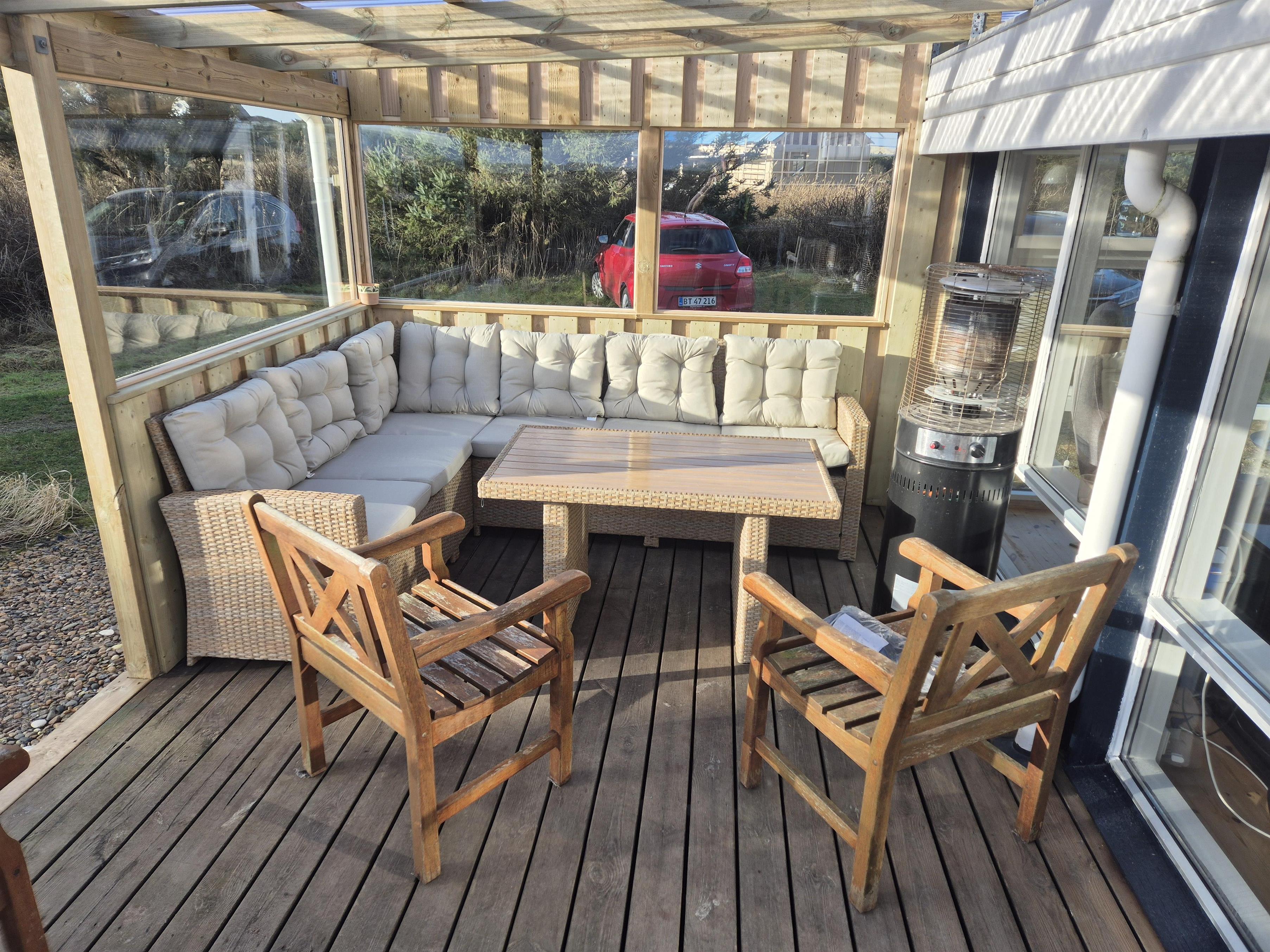 I entreen er der vaskemaskine og tørretumbler samt god mulighed for at hænge overtøjet op. Fra entreen er der indgang til et af husets badeværelser som er indrettet med toilet, håndvask og bruser, Fra entreen er der også indgang til 2 af husets soveværelser. Kombineret køkken og stue. Køkkenet er indrettet med komfur med keramisk kogeplade, køleskab, opvaskemaskine og mikroovn. Flot stue som er åbnet op til kip. Ved køkkenet er spisebordet placeret og i den anden ende af stuen er der flotte polstermøbler, TV med danske og tyske programmer samt Chromecast med mulighed for streaming af egne programmer. Der er en skøn brændeovn samt en varmepumpe som begge er medvirkende til at give et lavere forbrug. Fra stuen er der udgang til terrassen. Fra stuen er der også udgang til en gang hvorfra man kan komme ind på det sidste badeværelse i huset som rummer toilet, håndvask, bruser, spabad og adgang til sauna og her er der flisegulv med gulvvarme. Det andet soveværelse ligger også her. Huset har i alt 3 soveværelser: Dobbeltseng + Dobbeltseng + Dobbeltseng + Hems: 2 liggemuligheder. Til de mindste gæster er der barneseng og barnestol. 1 husdyr er tilladt. Ikke rygerhus.