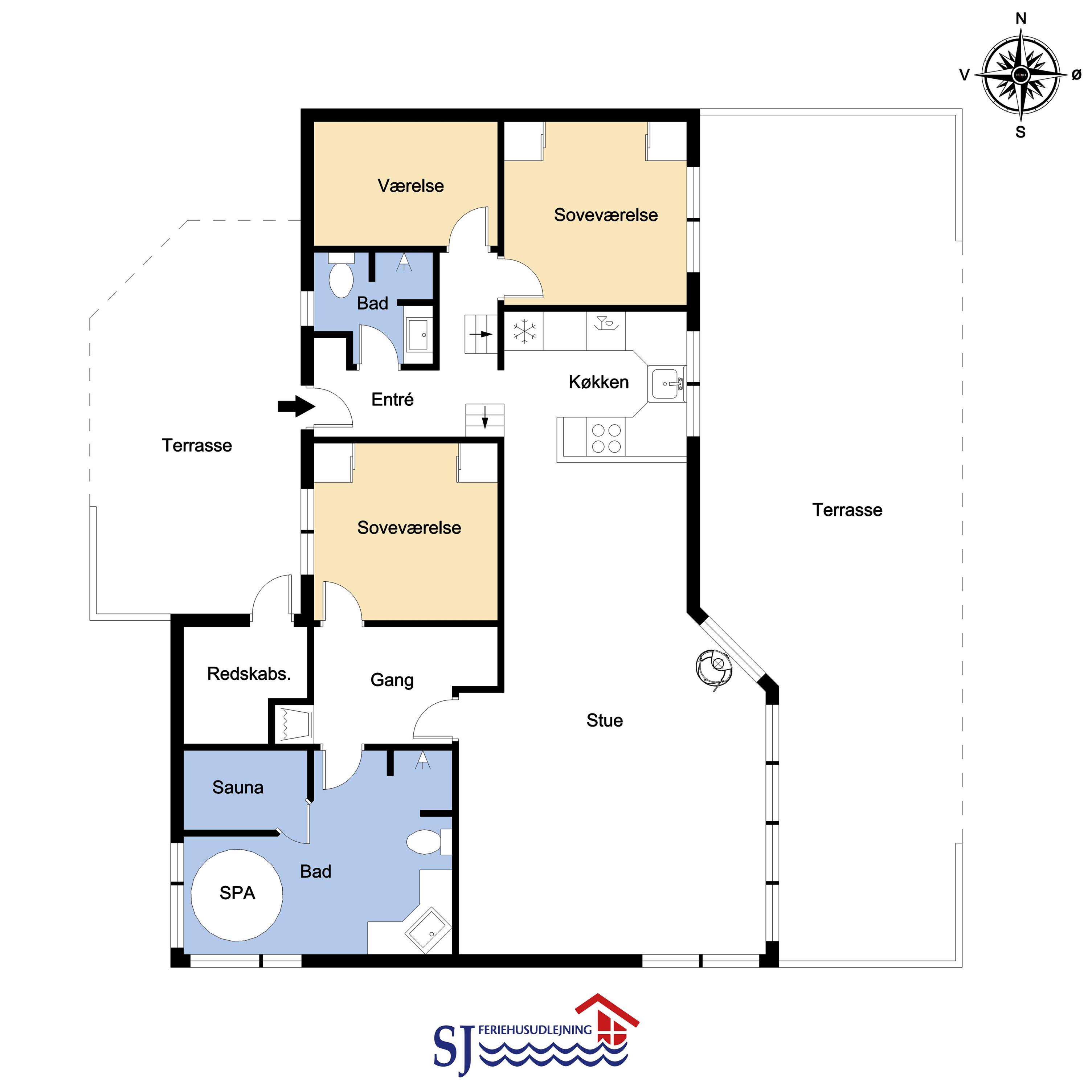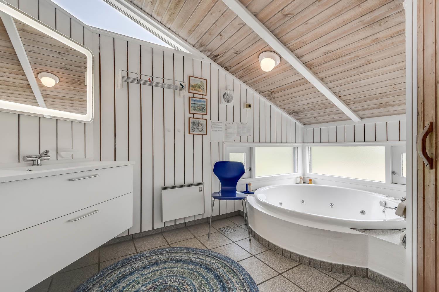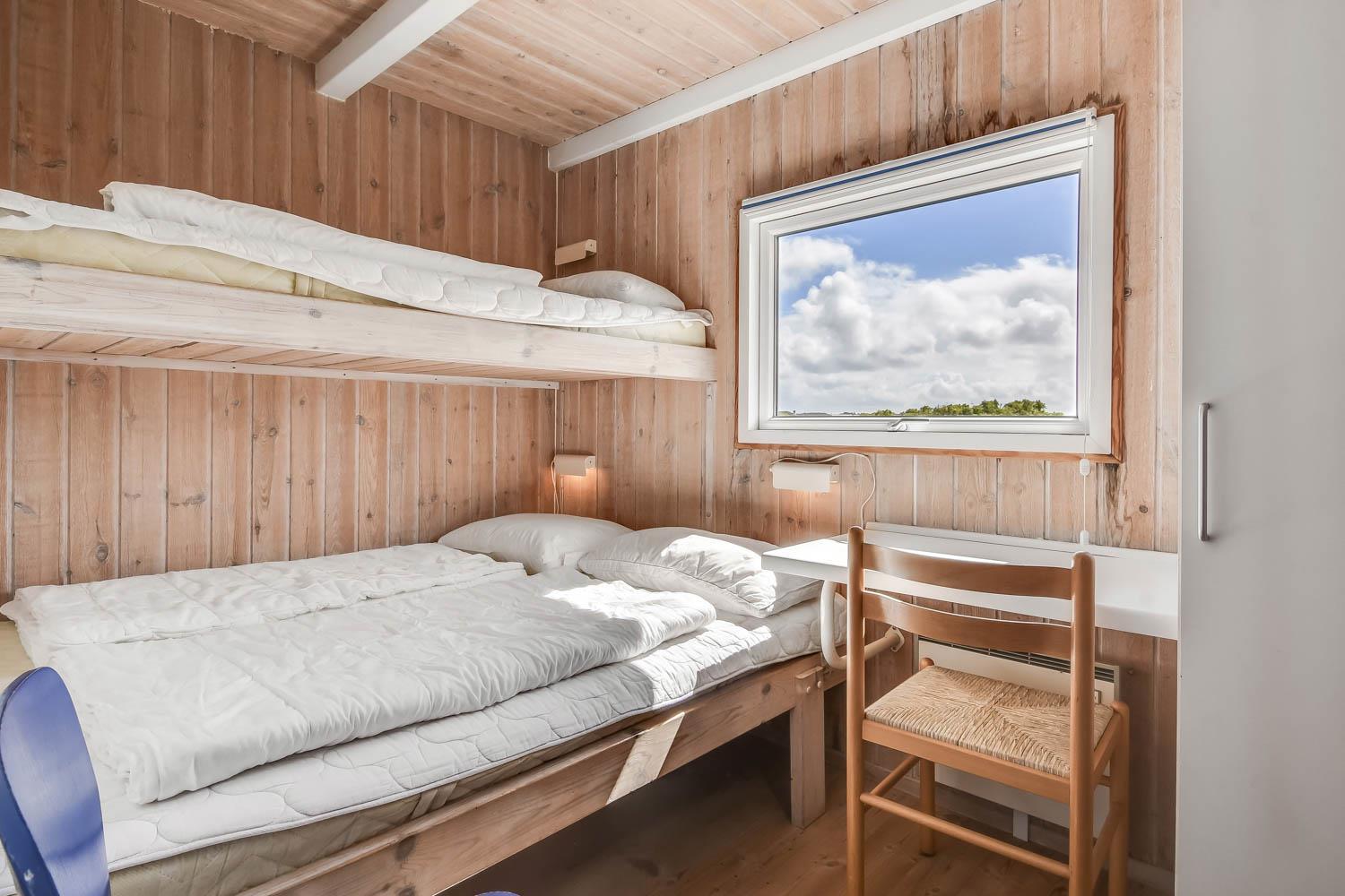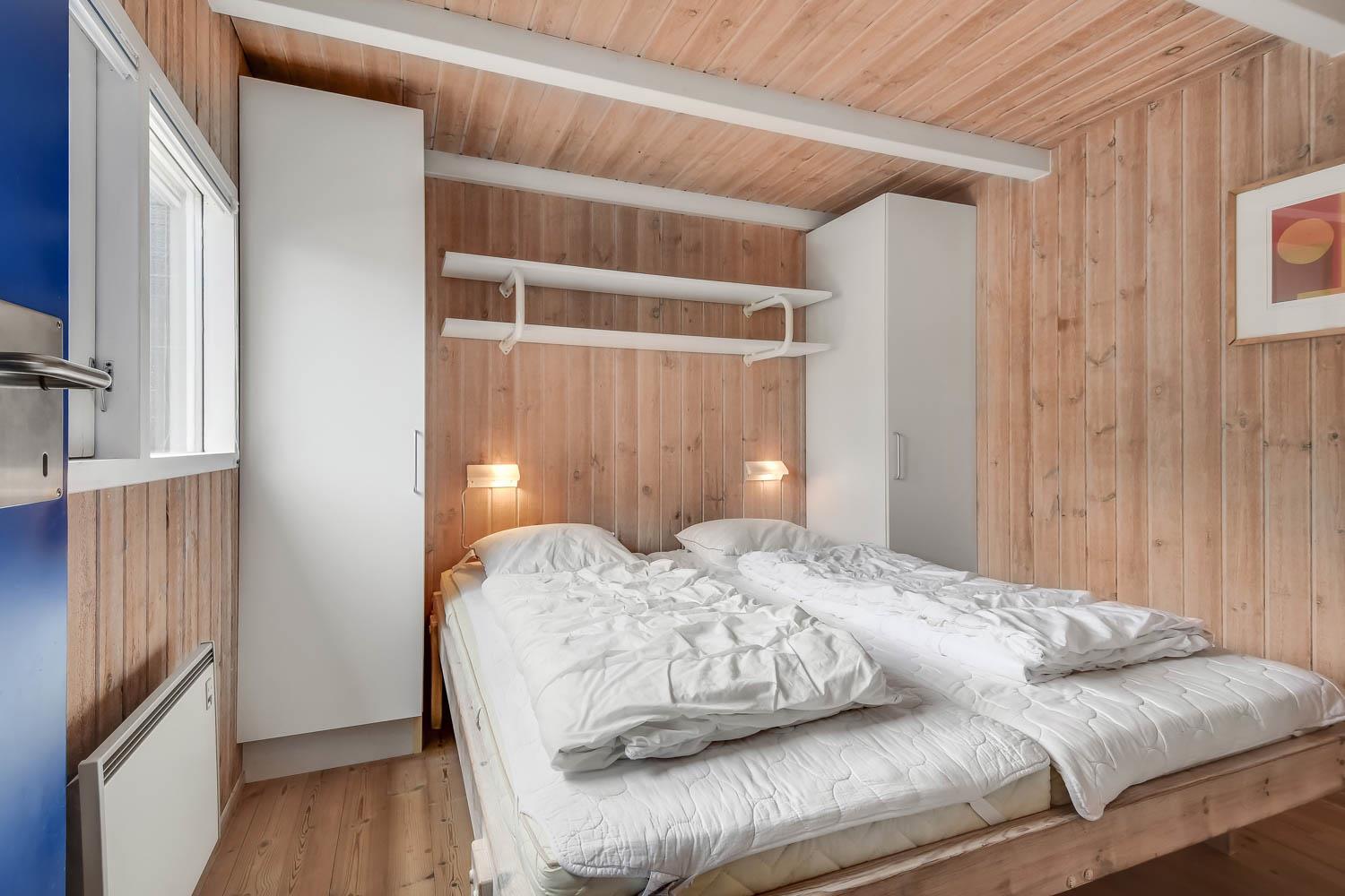 I entreen er der vaskemaskine og tørretumbler samt god mulighed for at hænge overtøjet op. Fra entreen er der indgang til et af husets badeværelser som er indrettet med toilet, håndvask og bruser, Fra entreen er der også indgang til 2 af husets soveværelser. Kombineret køkken og stue. Køkkenet er indrettet med komfur med keramisk kogeplade, køleskab, opvaskemaskine og mikroovn. Flot stue som er åbnet op til kip. Ved køkkenet er spisebordet placeret og i den anden ende af stuen er der flotte polstermøbler, TV med danske og tyske programmer samt Chromecast med mulighed for streaming af egne programmer. Der er en skøn brændeovn samt en varmepumpe som begge er medvirkende til at give et lavere forbrug. Fra stuen er der udgang til terrassen. Fra stuen er der også udgang til en gang hvorfra man kan komme ind på det sidste badeværelse i huset som rummer toilet, håndvask, bruser, spabad og adgang til sauna og her er der flisegulv med gulvvarme. Det andet soveværelse ligger også her. Huset har i alt 3 soveværelser: Dobbeltseng + Dobbeltseng + Dobbeltseng + Hems: 2 liggemuligheder. Til de mindste gæster er der barneseng og barnestol. 1 husdyr er tilladt. Ikke rygerhus.