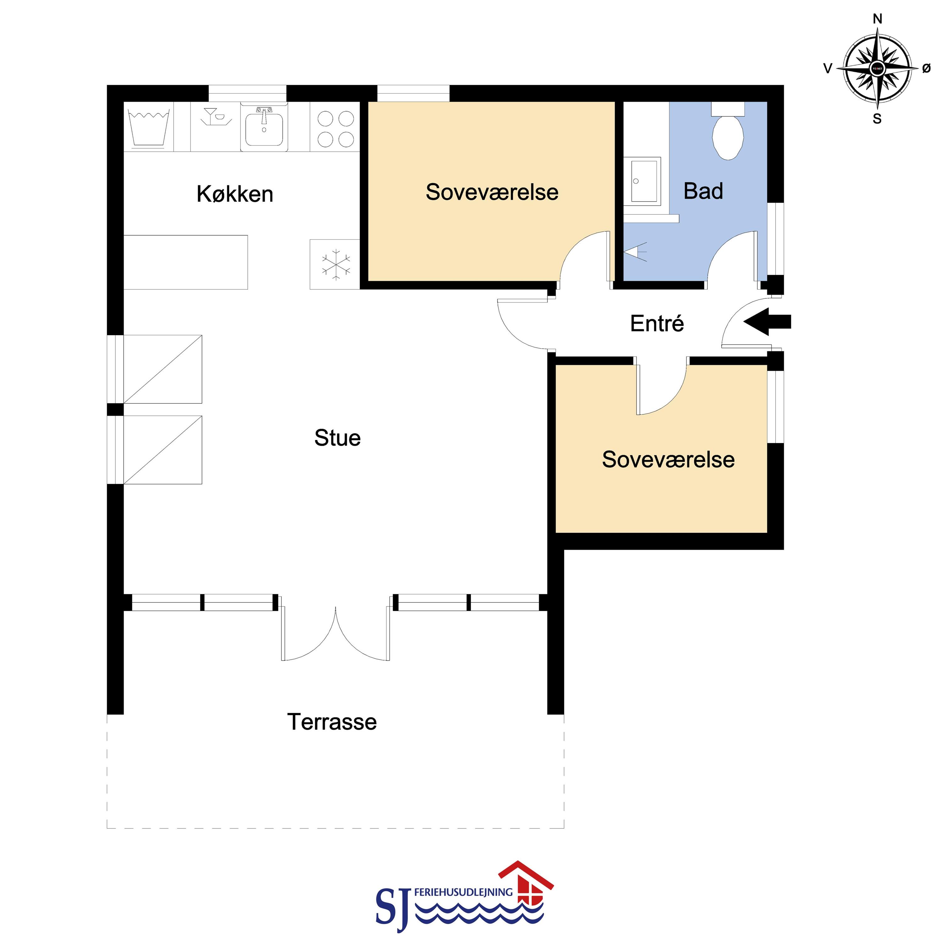 56 m2 stort, godt udnyttet træhus med 2 soveværelse (1DS, 1DS). Hyggelig, kombineret opholdsstue og køkkenhjørne. Opholdsstue med CD/radio, TV med danske og tyske programmer polstermøbler samt spisebord stole. Dejlig varmepumpe som bidrager til en god varme samt en billiger forbrugsafregning. Køkkenhjørne med glaskeramisk komfur, emhætte, køleskab, mikroovn, opvaskemaskine og service og køkkengrej. Mindre, godt udnyttet badeværelse med brus, toilet, håndvask og vaskemaskine. 1 husdyr må medbringes.