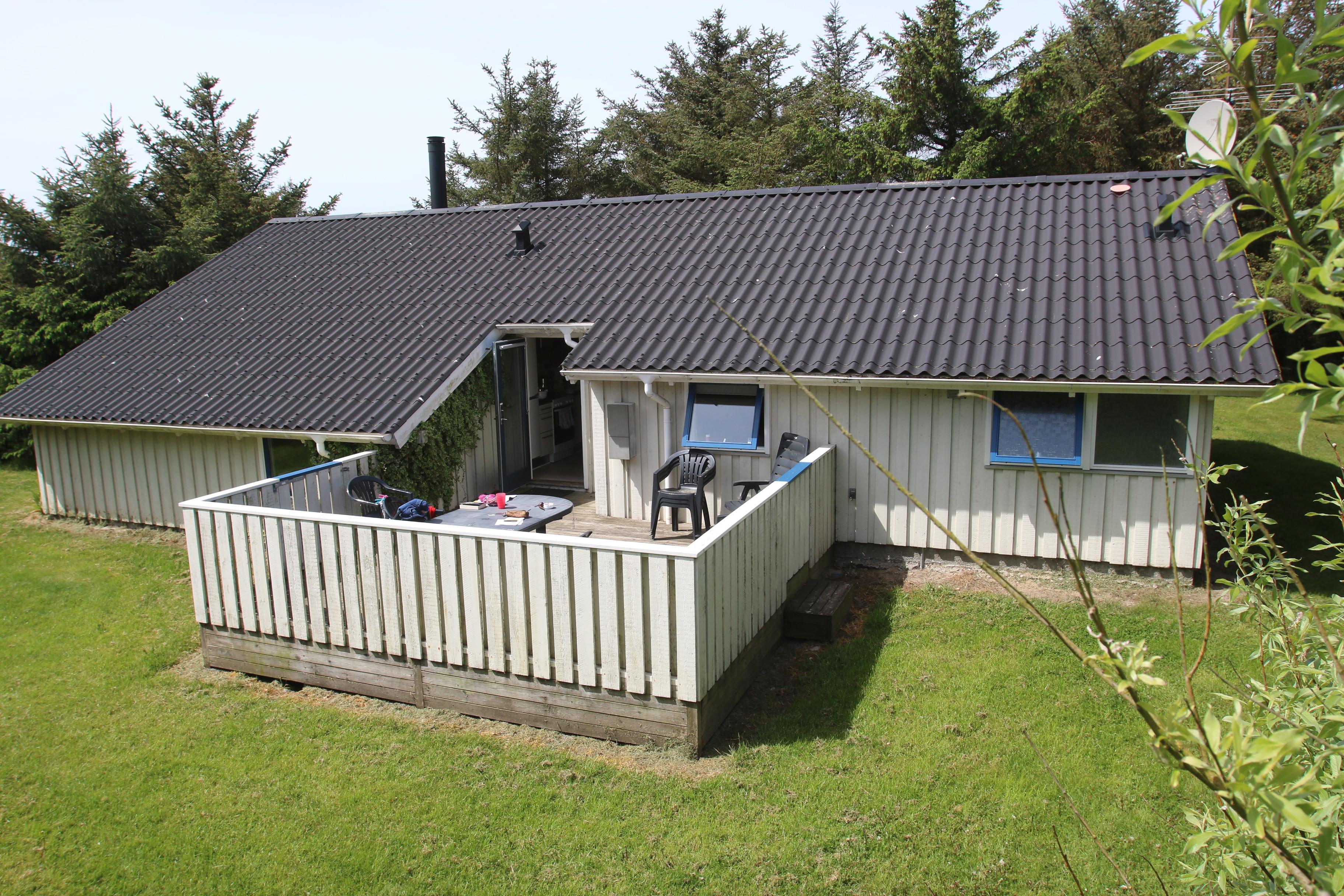 Huset ligger på en ca. 1.400m2 dejlig grund med mange solkroge. Terasseanlægget byder på gode havemøbler, liggestole og grill. Tæt ved terrassen er der opstillet gynge og sandkasse til børnene og terrassen er også perfekt til den hyggelige grillaften. Den velholdte naturgrund er omkranset af høje træer som giver dejligt læ, så solen kan nydes både morgen og aften. Kun ca. 250 m fra huset ligger det brusende Vesterhav som hver dag byder på nye maleriske oplevelse. I sæsonen kan du hente morgenbrød, købmandsvarer eller måske invitere familien ud at spise kun ca. 5 - 10 min på gåben fra huset. Så hvad enten du er til aktiv ferie eller total afslapning danner dette en dejlig ramme både hvad angår hus, beliggenhed og omgivelser.