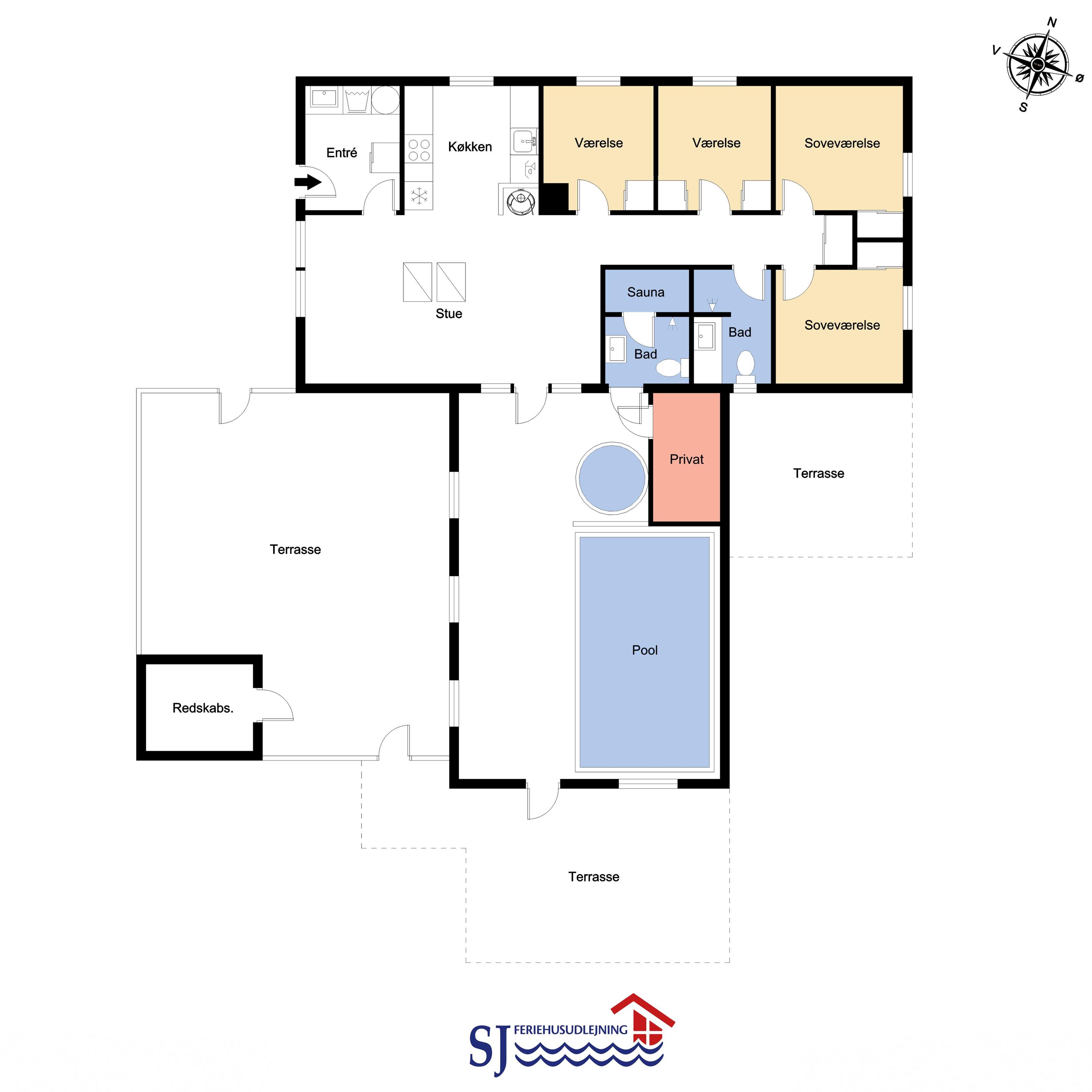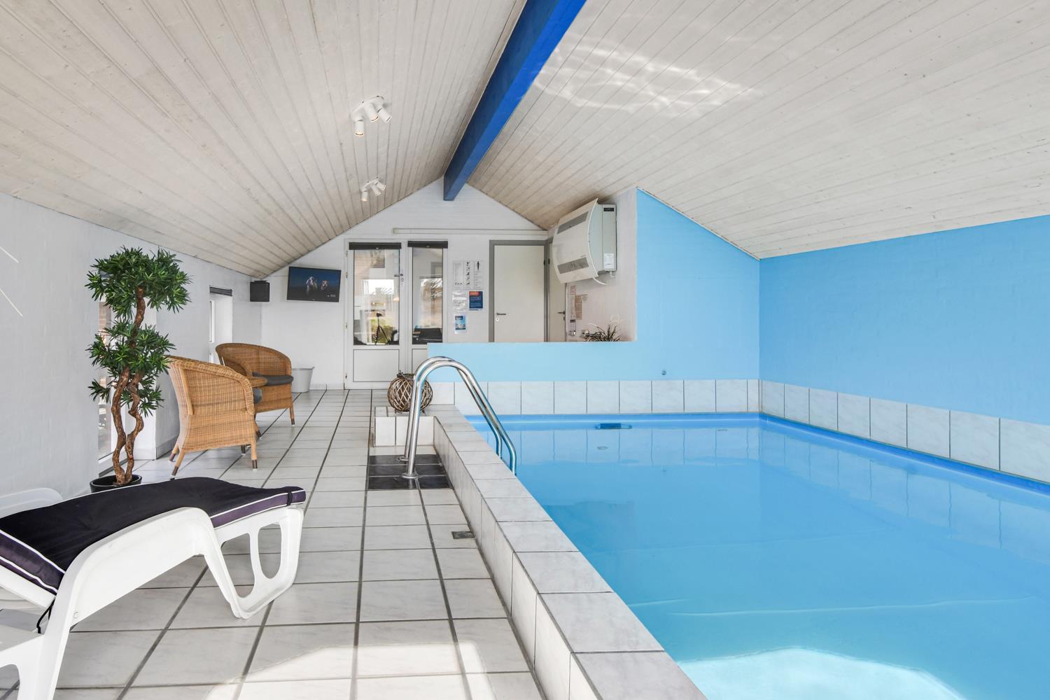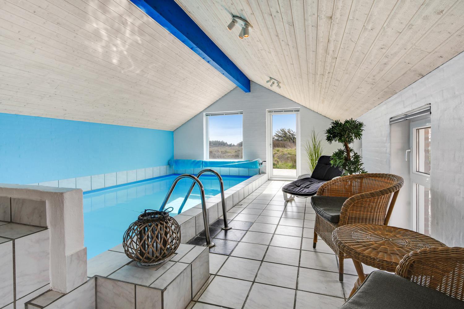 Det åbne køkken er indrettet med alle tænkelige hjælpemidler som bl.a. opvskemaskine, mikroovn og køle/fryseskab. Stuen er med brændeovn, fladskærms-TV med DR1 og TV2 samt parabol med tyske kanaler, der er desuden DVD, CD-afspiller og spillekonsol. I stuen er der også en skøn brændeovn, som man kan nyde fra de komfortable møbler med en god bog i hånden og en varm kop te eller kaffe. 4 store soveværelser med 1DS + 1DS + 2S + 4K. Til de små gæster er der barneseng og barnestol til rådighed. 2 badeværelser begge med gulvvarme og bruser, det ene er i forbindelse med husets poolrum, og herfra er der direkte adgang til saunaen. Poolrummet har en 15 m2 stor pool med undervandsbelysning og svømmetræner samt et spabad til 4 personer. Her kan man rigtig slappe af med svømmeture i poolen og massage i spaen for til sidst at gå ind i saunaen og få kroppen varmet igennem. Der er installeret 2 varmepumper i huset som gør huset meget energivenligt og besparende. 2 hunde er tilladt. Har man el-bil eller en Plug-In hybrid, så er der opsat ladeboks ved huset. Dette er et ikke rygerhus. Depositum vintersæson kr. 3000 og sommersæson kr. 2200