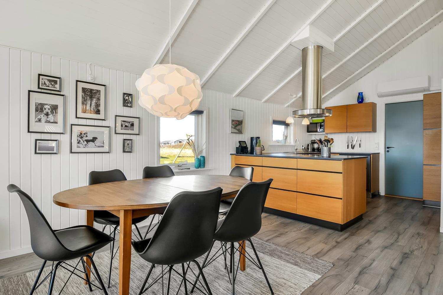 Flot og nyrenoveret og veludstyret feriehus i træ beliggende i et roligt feriehusområde tæt på Vesterhavet og Ferring Sø. Gratis internetadgang.