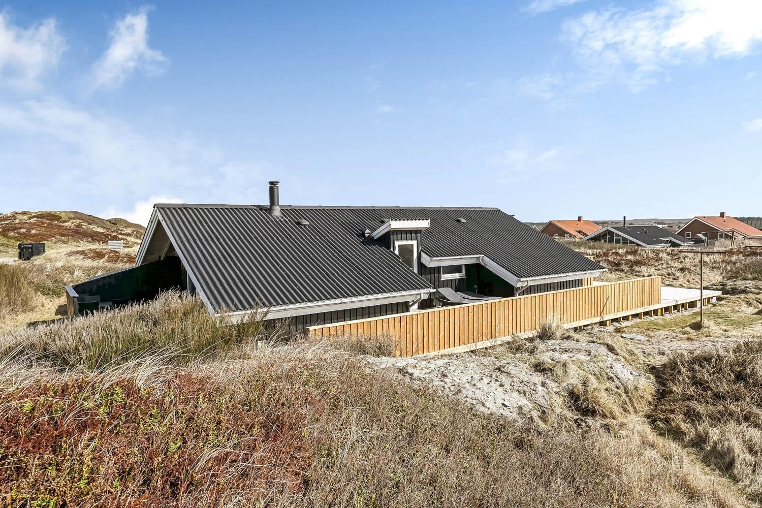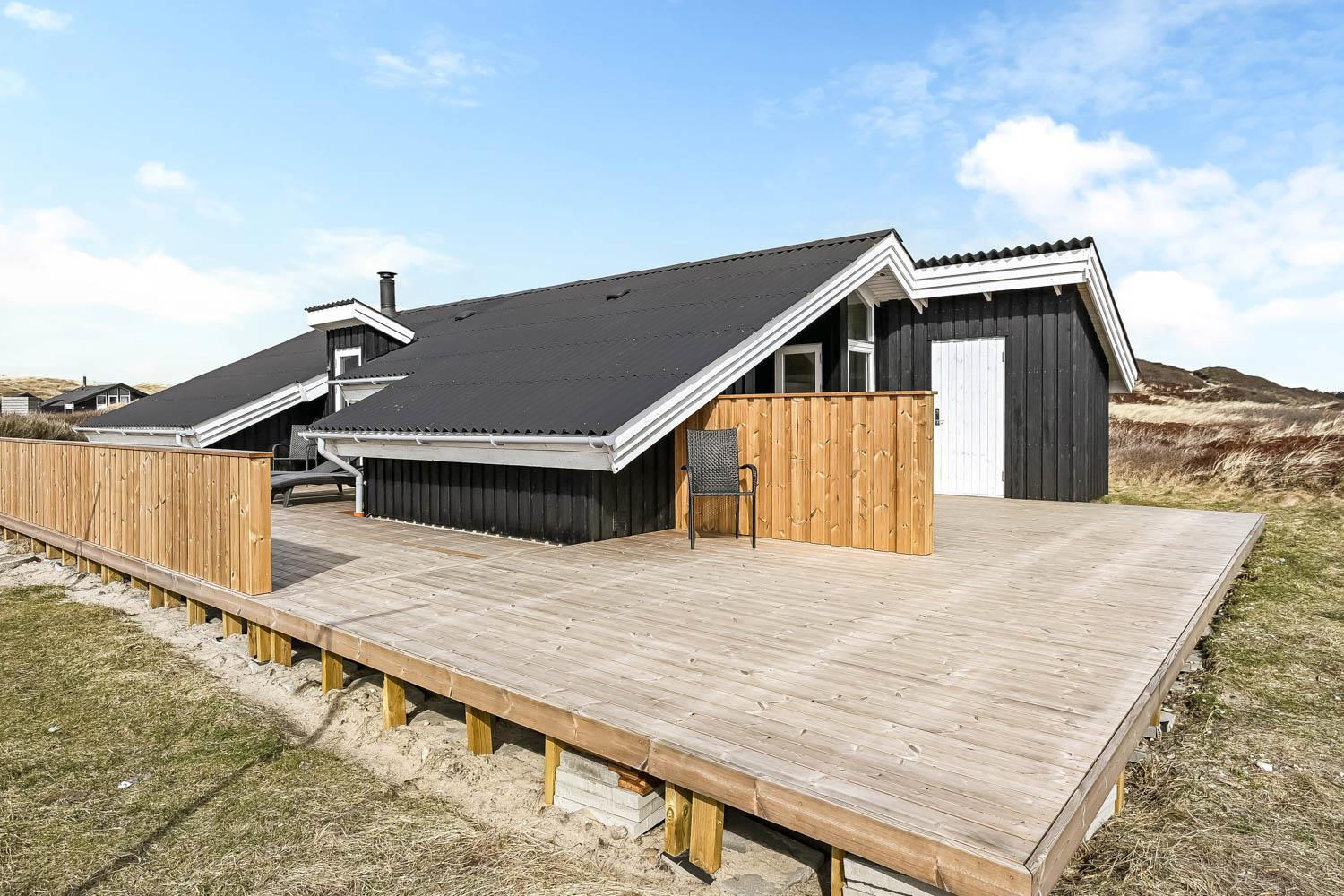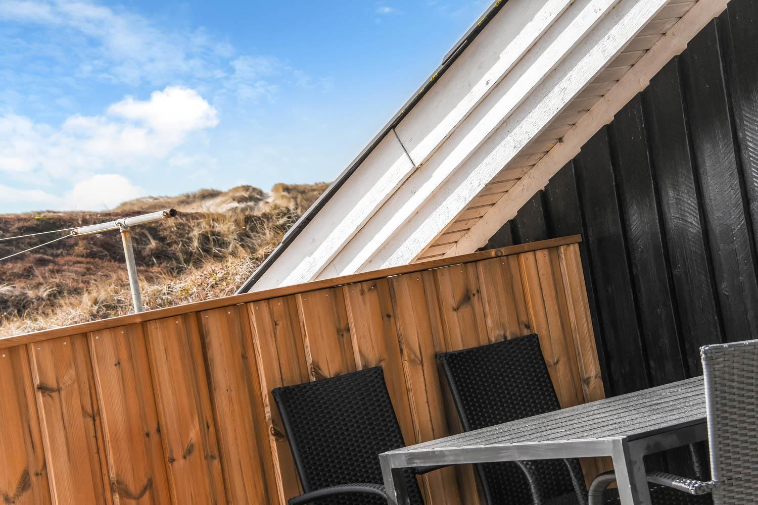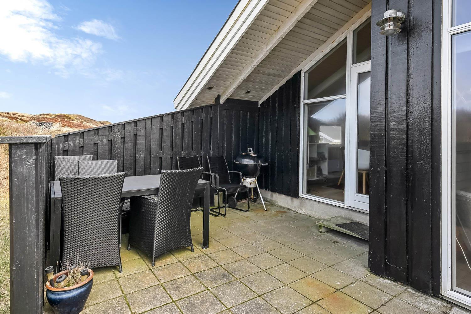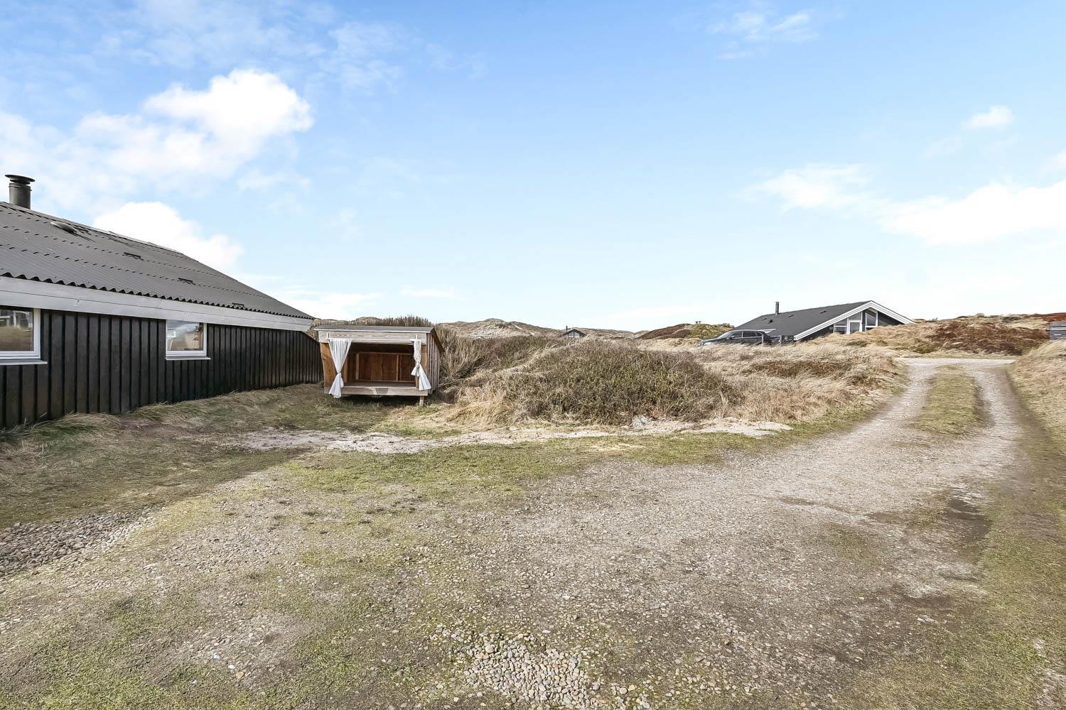 Huset er beliggende i en dejlig klitområde tæt ved Vesterhavet og har 3 terrasser, hvoraf en er delvis overdækket. Der forefindes mange havemøbler, liggestole og grill. Nyd at der altid er mulighed for at finde en plads i solen, et læsted eller en grillaften til lyden af bølgernes brusen som høres i baggrunden. Der er et shelter. Den dejligt beliggende feriebolig med klitudsigt, vil danne rammerne om jeres helt unikke ferie tæt ved Vesterhavet. Nyd at Vesterhavet hver dag fortæller en ny historie, som i kan opleve på tætteste hold.