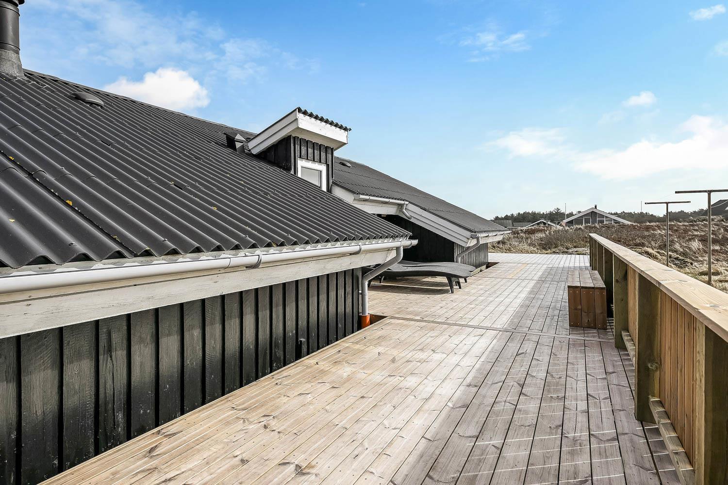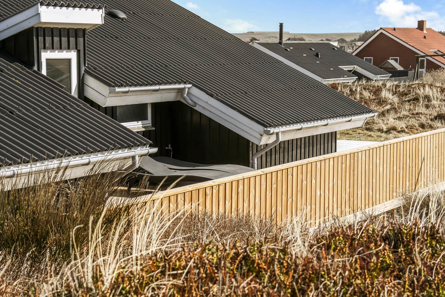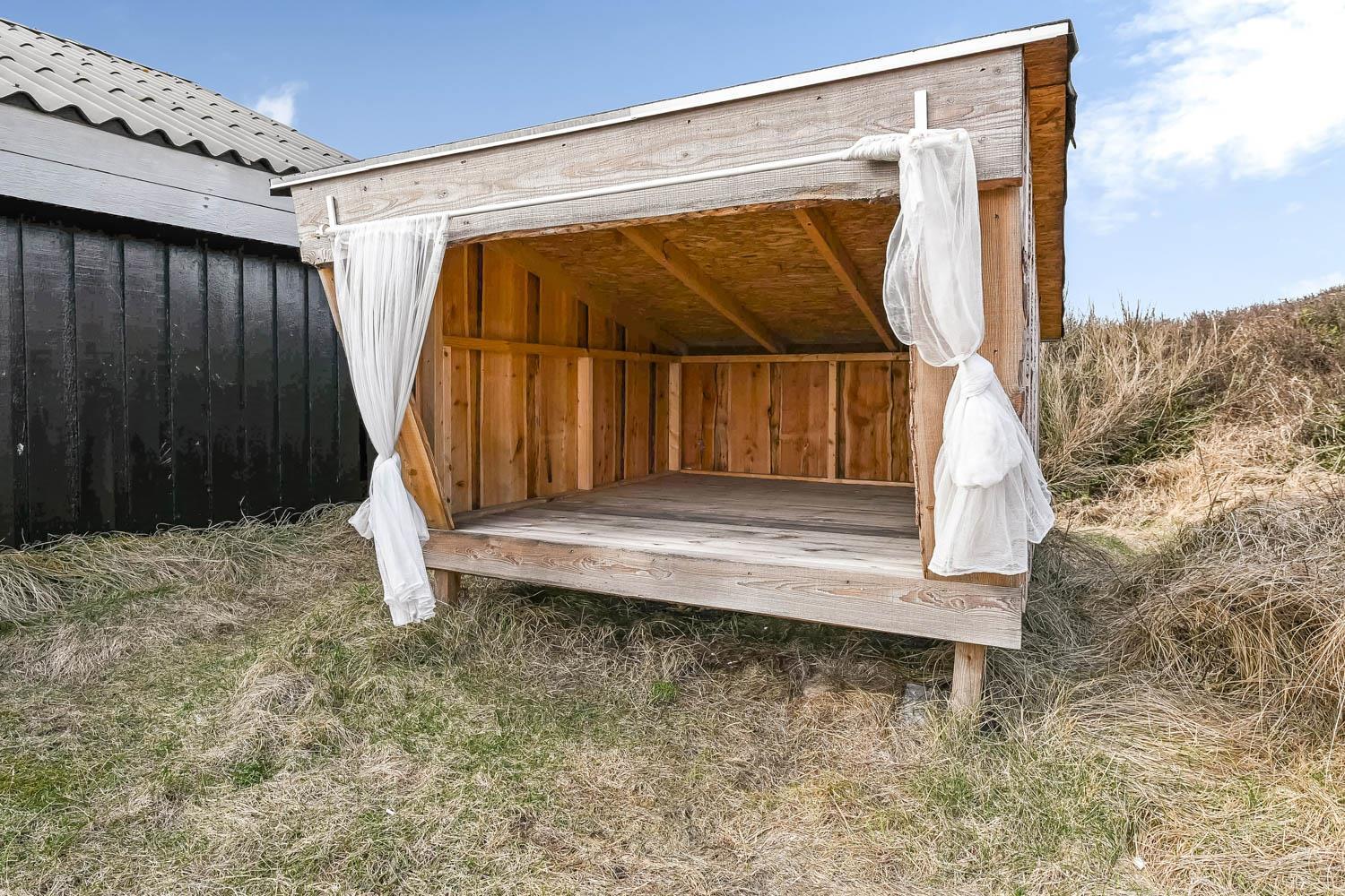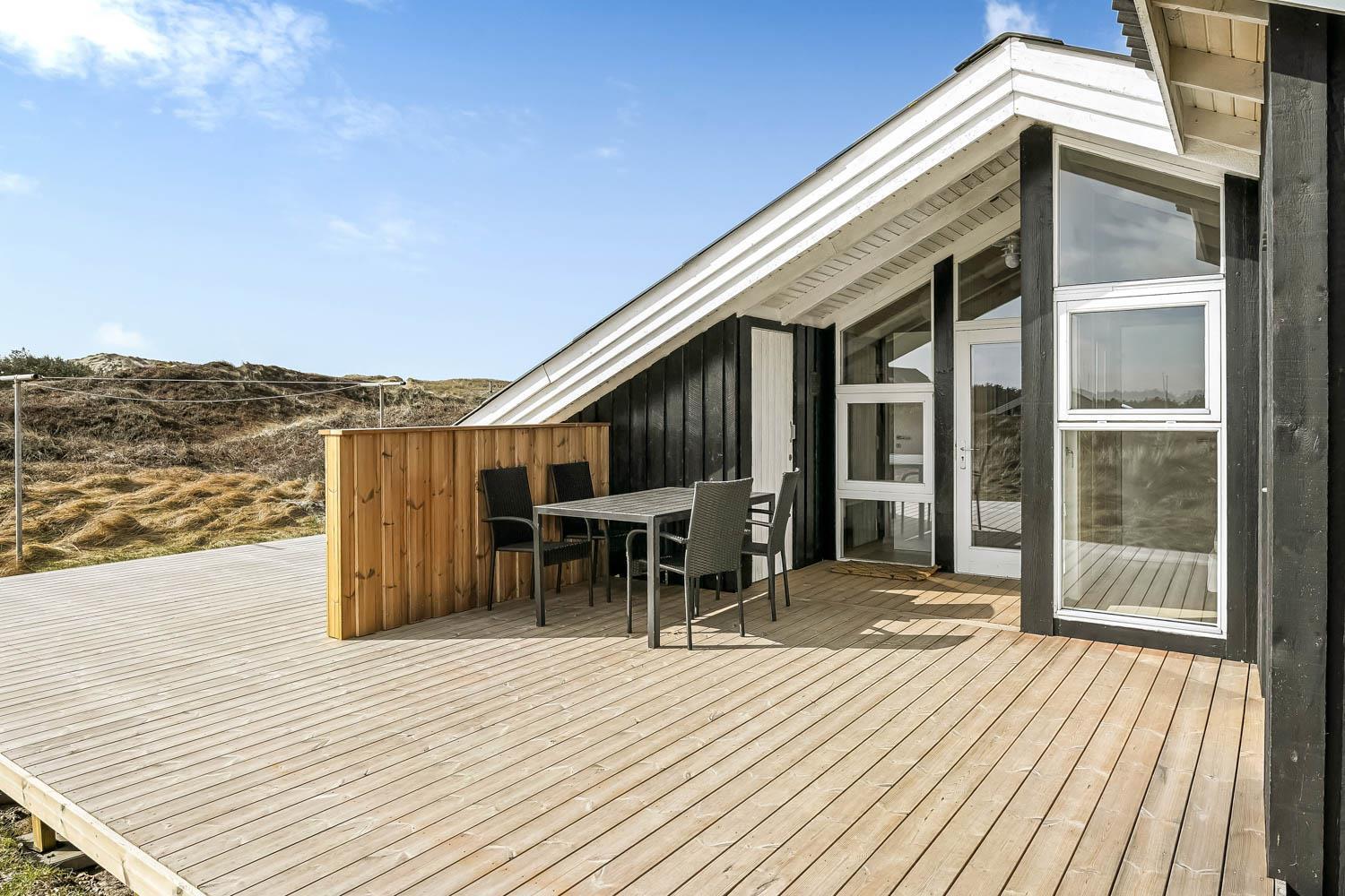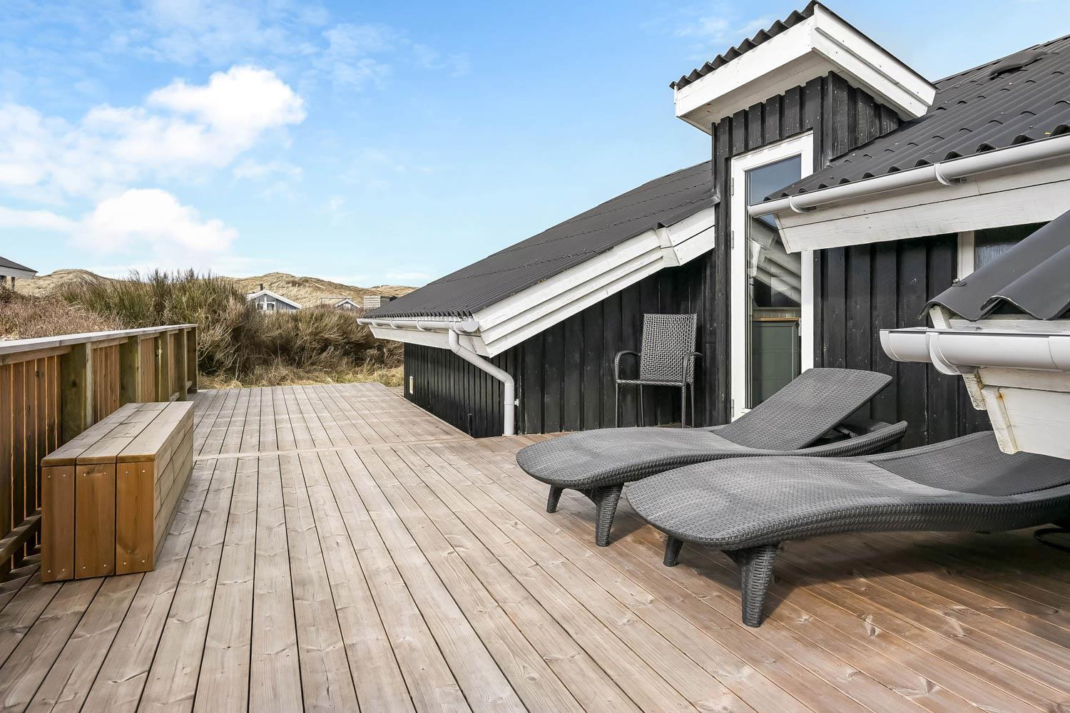 Huset er beliggende i en dejlig klitområde tæt ved Vesterhavet og har 3 terrasser, hvoraf en er delvis overdækket. Der forefindes mange havemøbler, liggestole og grill. Nyd at der altid er mulighed for at finde en plads i solen, et læsted eller en grillaften til lyden af bølgernes brusen som høres i baggrunden. Der er et shelter. Den dejligt beliggende feriebolig med klitudsigt, vil danne rammerne om jeres helt unikke ferie tæt ved Vesterhavet. Nyd at Vesterhavet hver dag fortæller en ny historie, som i kan opleve på tætteste hold.