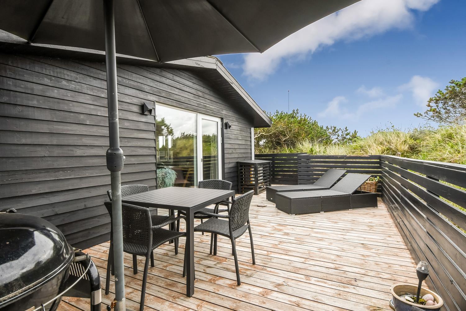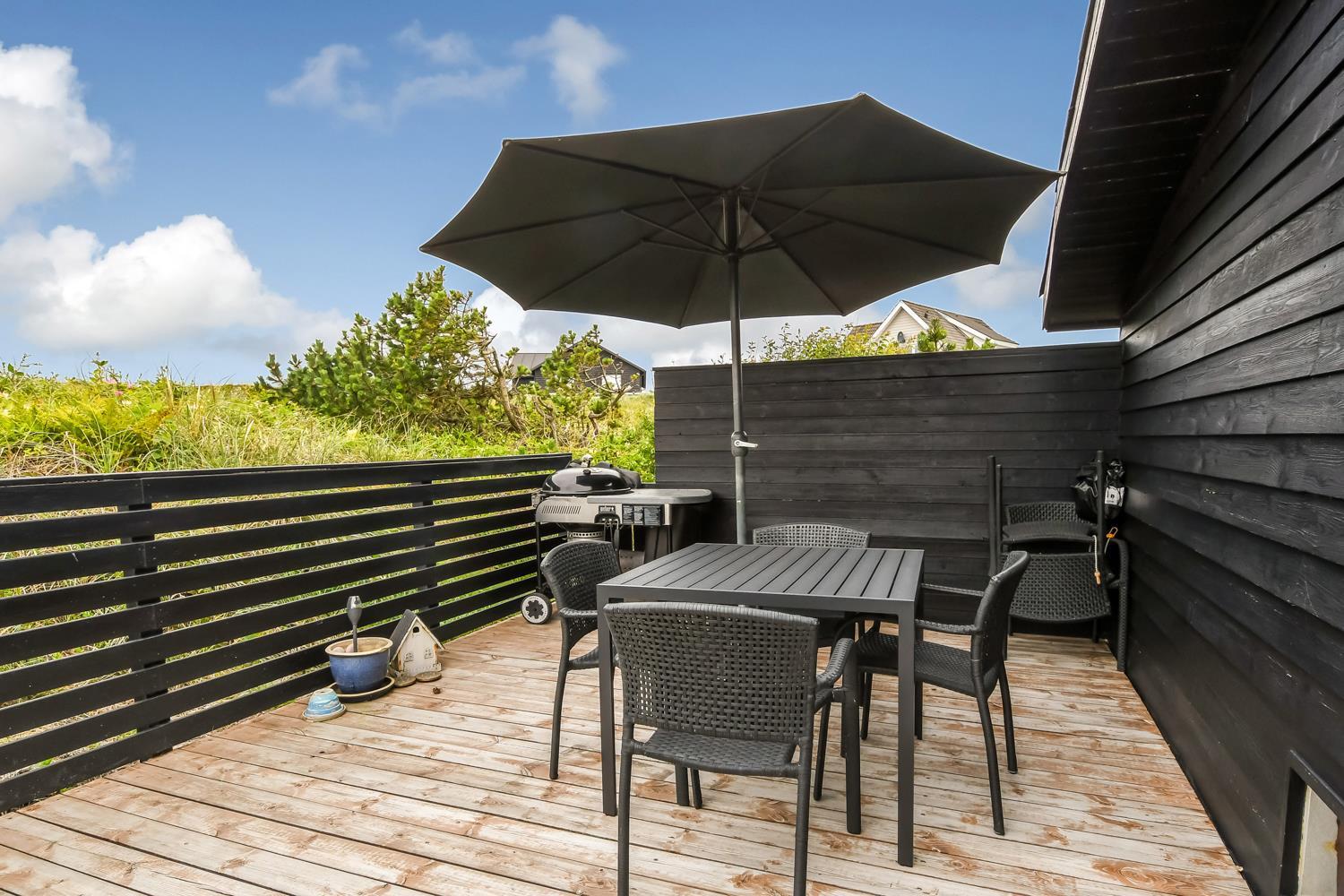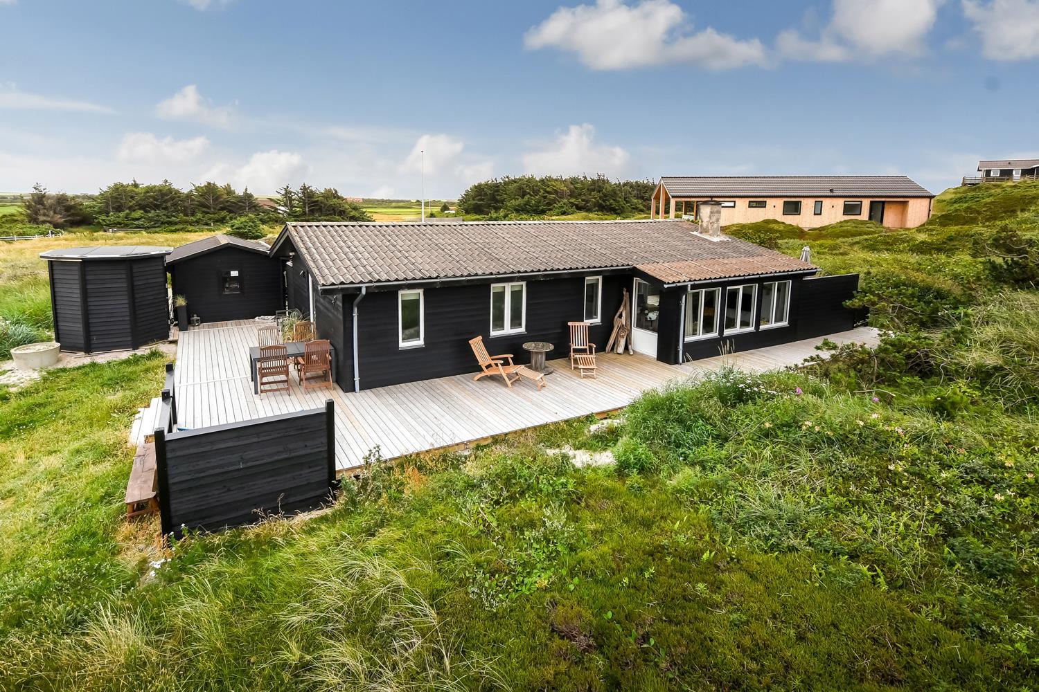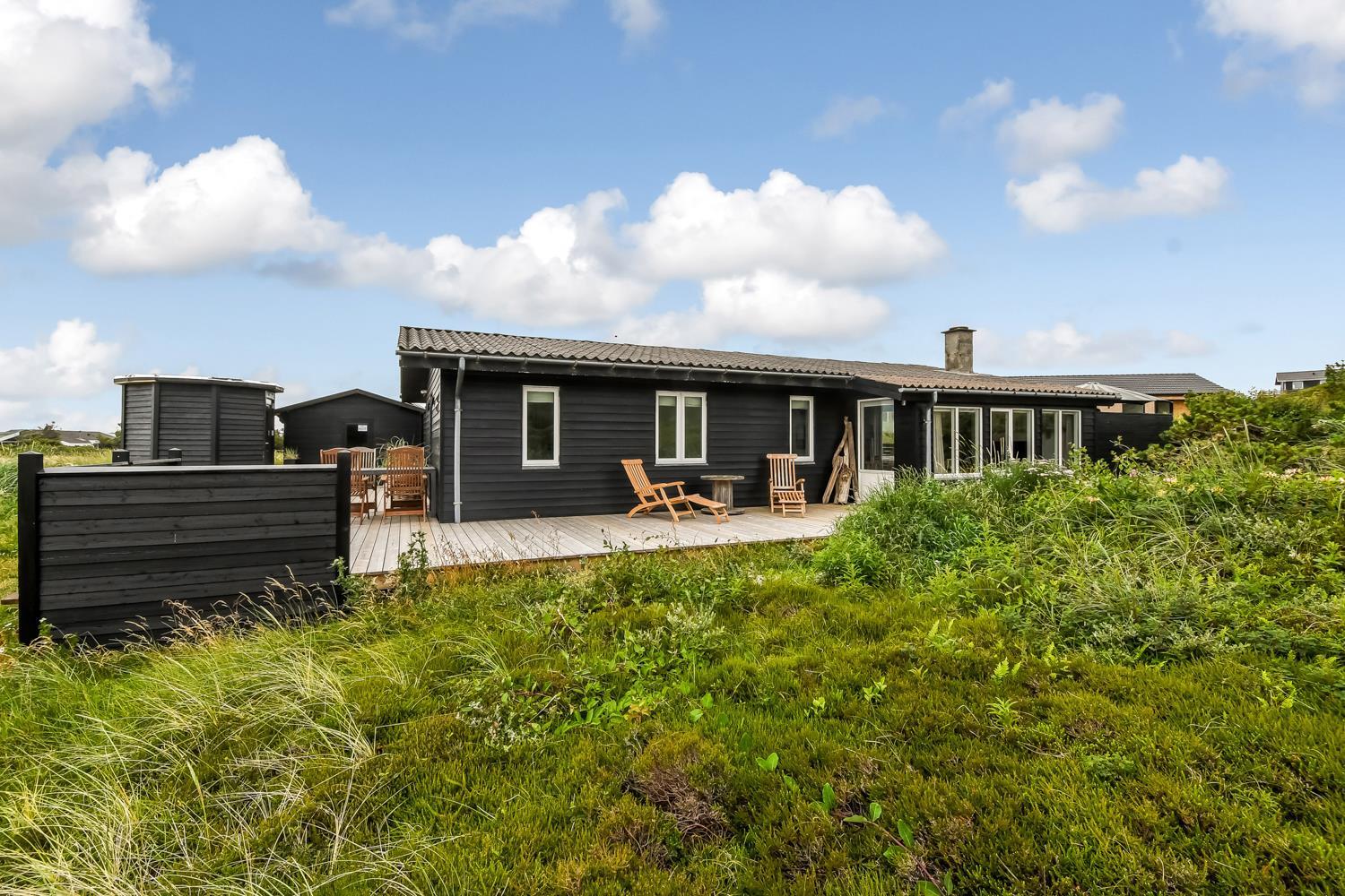 Feriehuset er beliggende på en ca. 1.284 m2 meget privat grund. Lækker lukket terrasseanlæg med havemøbler, solvogne og grill. Terrasseanlægget løber også langs med huset og er meget privat. Der er altid mulighed for at finde en plads i solen og det er nemt at spise udenfor i havemøblerne, da man derved kan bringe forsyninger ud direkte fra stue og køkken. Fra huset er der ikke langt til klitterne og på den anden side venter en bred strand og Vesterhavet med mange muligheder. Her kan man bade, sole sig, vandre, samle rav, lyst fiske eller flyve med drage. Det er altid en god start eller slutning på dagen, at trave en tur over klitten og nyde synet af Vesterhavet. Der er omkring 1500 m til nærmeste købmand, som kun har åbent i sommerhalvåret eller man kan begive sig de 4 km til Harbøre hvor der både er Brugsen og Rema1000, som for øvrigt har åbent alle dage året rundt. Dette hus har et godt udgangspunkt til at udforske området fra hvad enten man gør det til fods eller fra bil. Tag eventuelt med den Danmarks berømte jernbane VLTJ, som har et trinbræt 1000 m fra huset ved Viktoria Street Station. Ikke rygerhus.