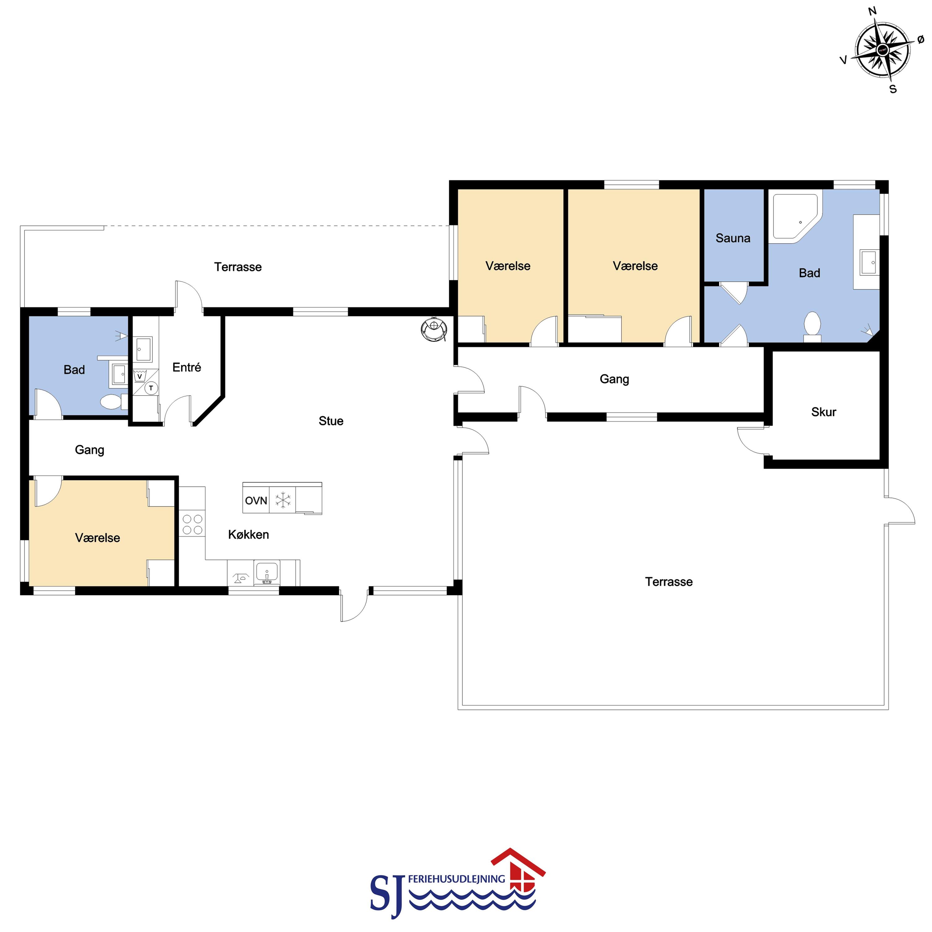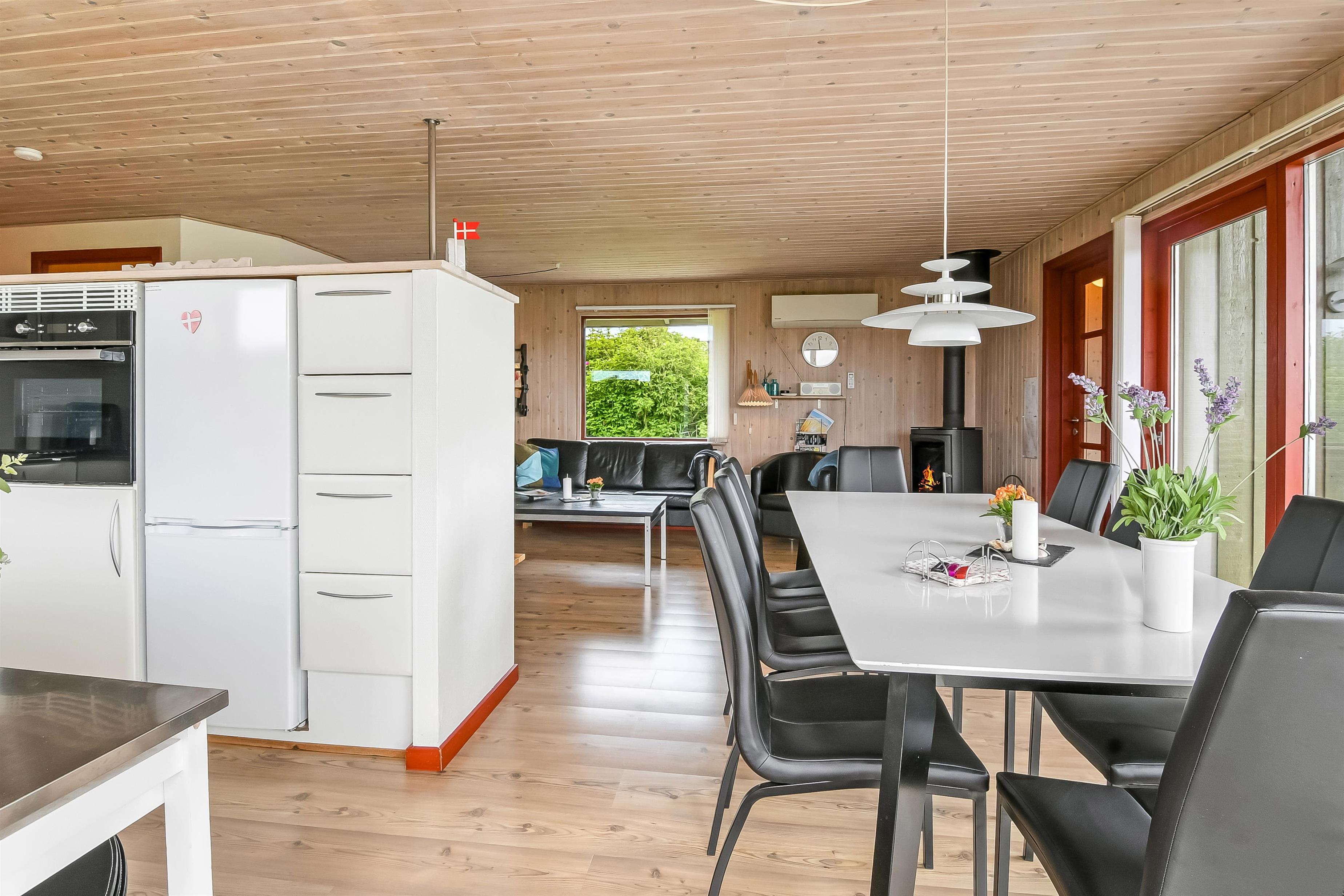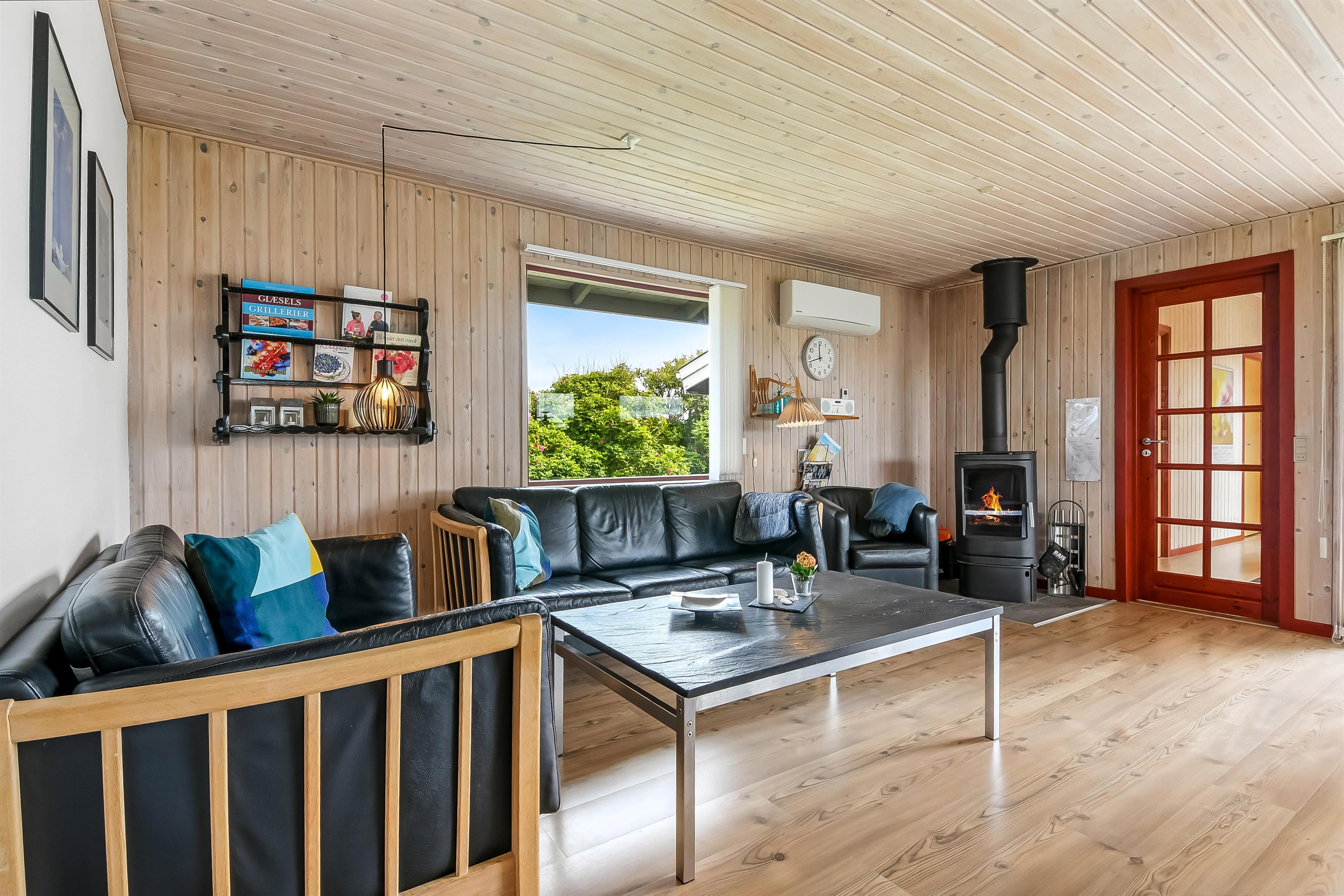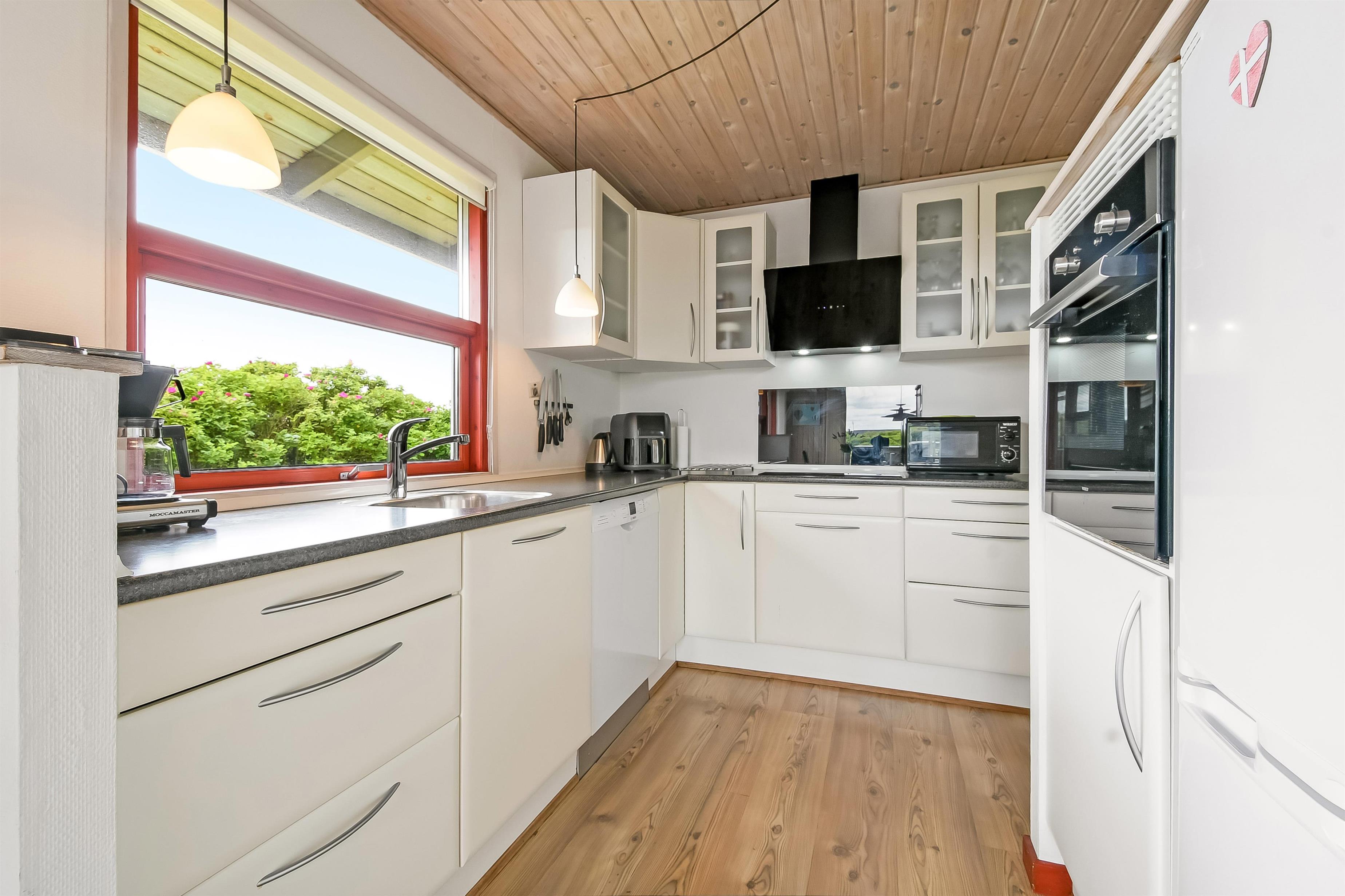 Huset, der blev renoveret i 2004, fremstår lyst og indbydende med en hyggelig atmosfære, hvor både familie og venner kan nyde ferien. I entreen finder I vaskemaskine, tørretumbler og god plads til overtøj, mens den hyggelige stue byder på 55” TV med danske kanaler og TV2, parabol med tyske kanaler, stereoanlæg med CD samt trådløst internet. Den varme brændeovn og varmepumpen sørger for behagelig varme året rundt, perfekt til kølige aftener. Køkkenet er veludstyret med induktionskomfur, køleskab med fryser, mikroovn og opvaskemaskine, så madlavning bliver både nem og fornøjelig. Huset har tre komfortable soveværelser samt to moderne badeværelser – det ene med spabad og sauna – begge med gulvvarme.