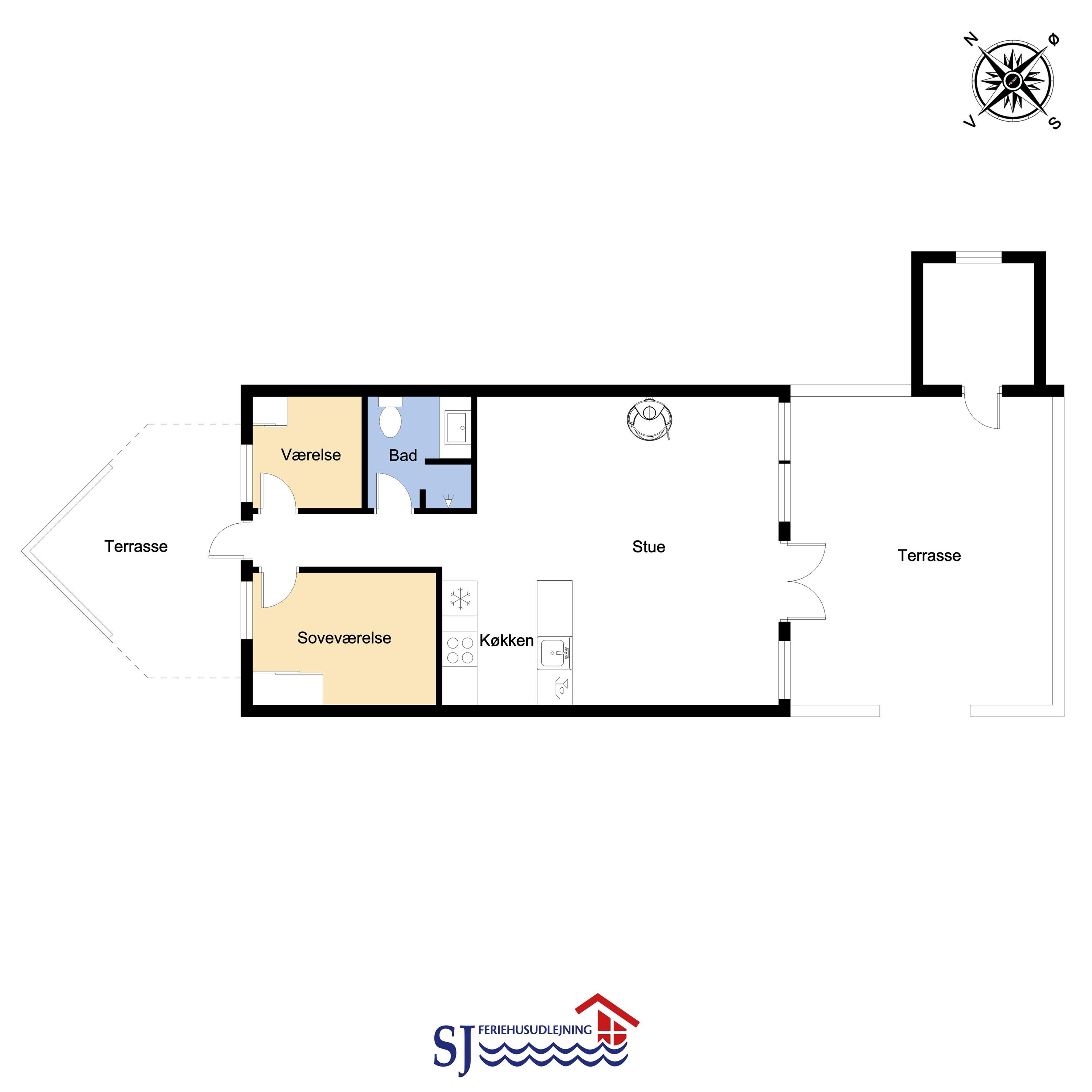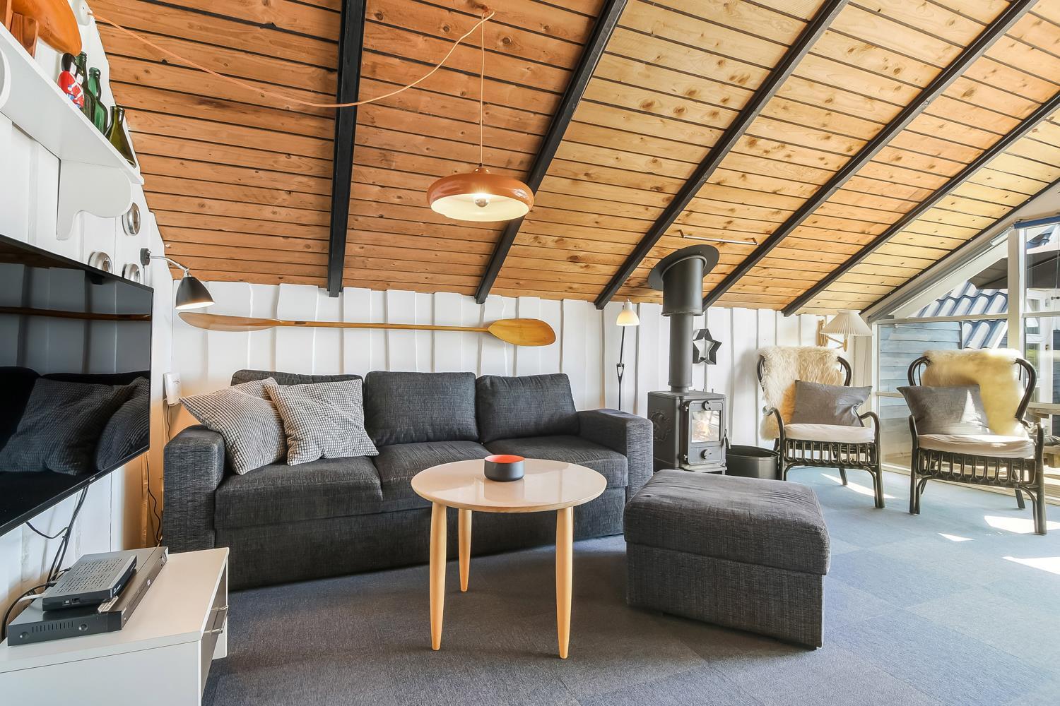 Huset er hyggeligt indrettet med en stue, som har TV med danske og tyske kanaler samt en brændeovn, der giver en dejlig varme året rundt. Køkkenet er godt udstyret med glaskeramisk komfur, køle-/fryseskab, opvaskemaskine og mikroovn. Badeværelset har toilet, håndvask, bruser og gulvvarme.