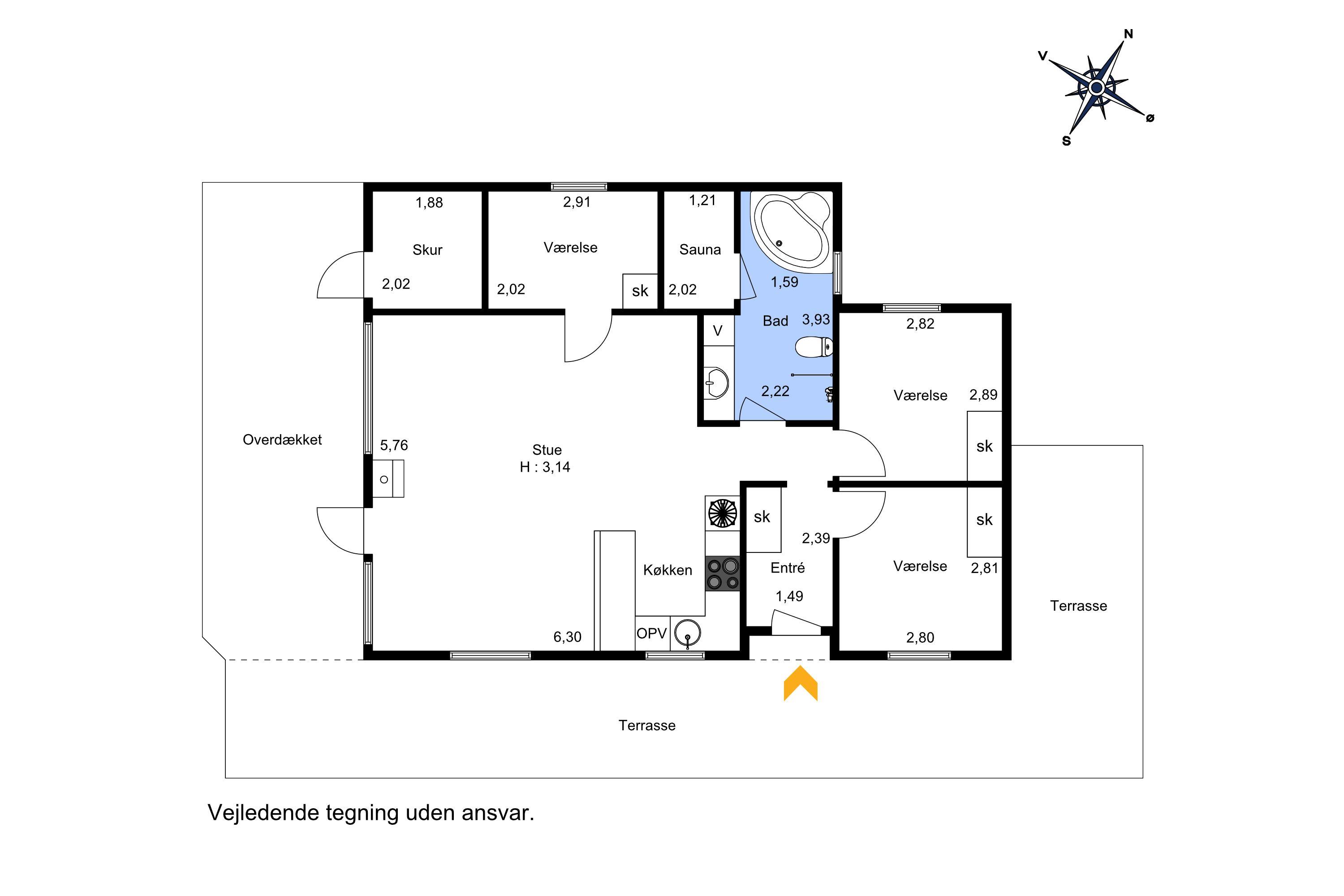 Feriehuset er indbydende, lyst og hyggeligt indrettet. Stuen og køkkenet er lyst med store vinduespartier, som giver et godt lysindfald, loft åben til kip. Opholdsstuen er indrettet med polstermøbler, TV med danske og tyske programmer. I stuen kan man nyde varmen fra brændeovnen eller varmepumpen, som er med til at mindske forbrugsomkostningerne. Spiseafdeling er placeret tæt på køkkenet. Åbent og lyst køkken. Køkkenet er veludstyret og indeholder bl.a. glaskeramisk komfur, mikroovn, køle-fryseskab og opvaskemaskine. 3 gode soverum: 1DS + 1DS + 1S. Laminatgulve i hele huset som er meget rengøringsvenlige. Badeværelse med toilet, håndvask, bruser, vaskemaskine, spa og adgang til sauna, klinkegulv. Ikke rygerhus. Husdyr ikke tilladt.