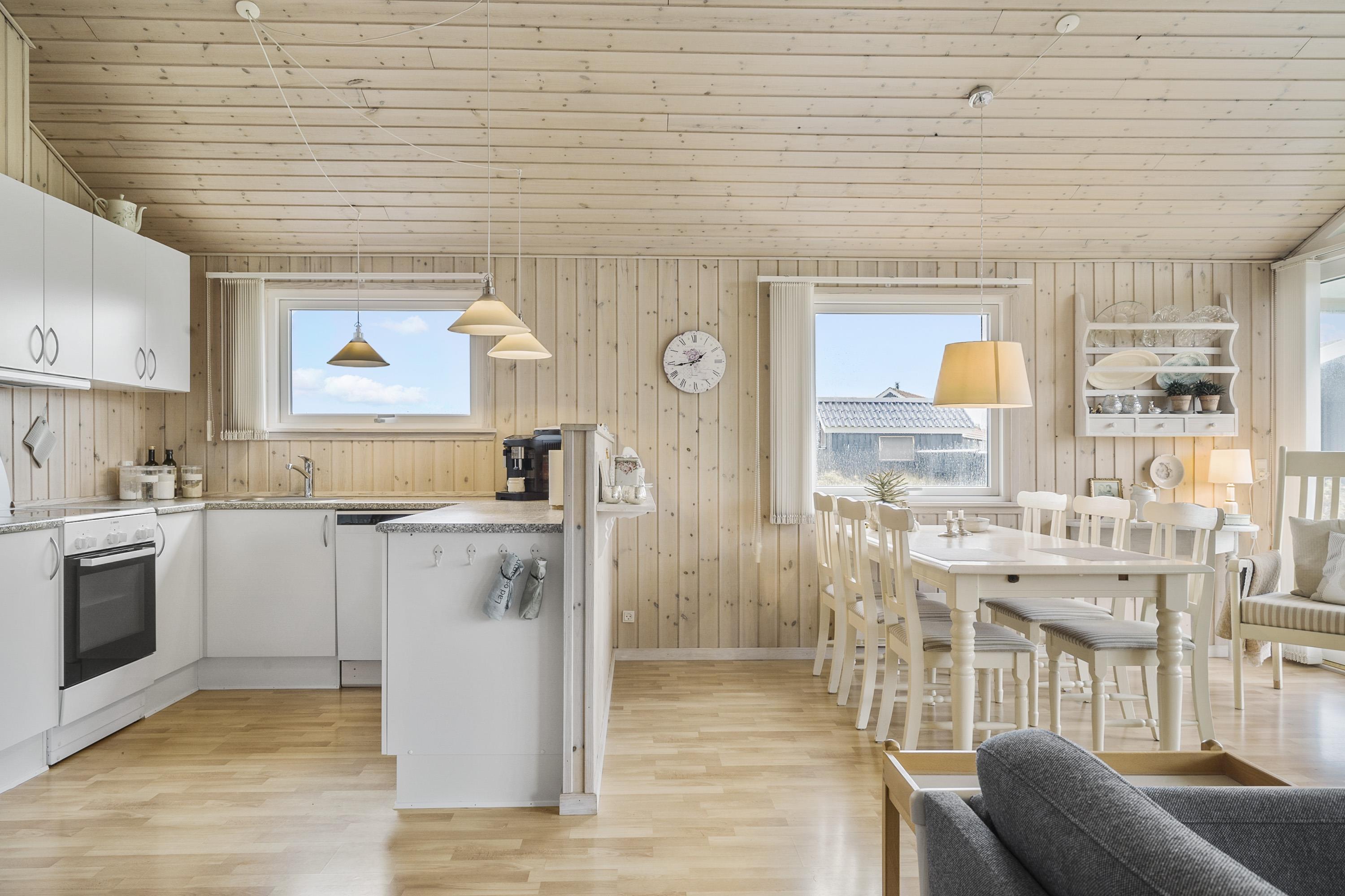 Hyggeligt feriehus til 6 personer i Vejlby Klit med dejlig åbent og lyst kombineret køkken og opholdsstue. På den anden side af vejen, fører der en sti direkte til stranden gennem klitterne. Gratis internettilgang. Husdyr ikke tilladt.