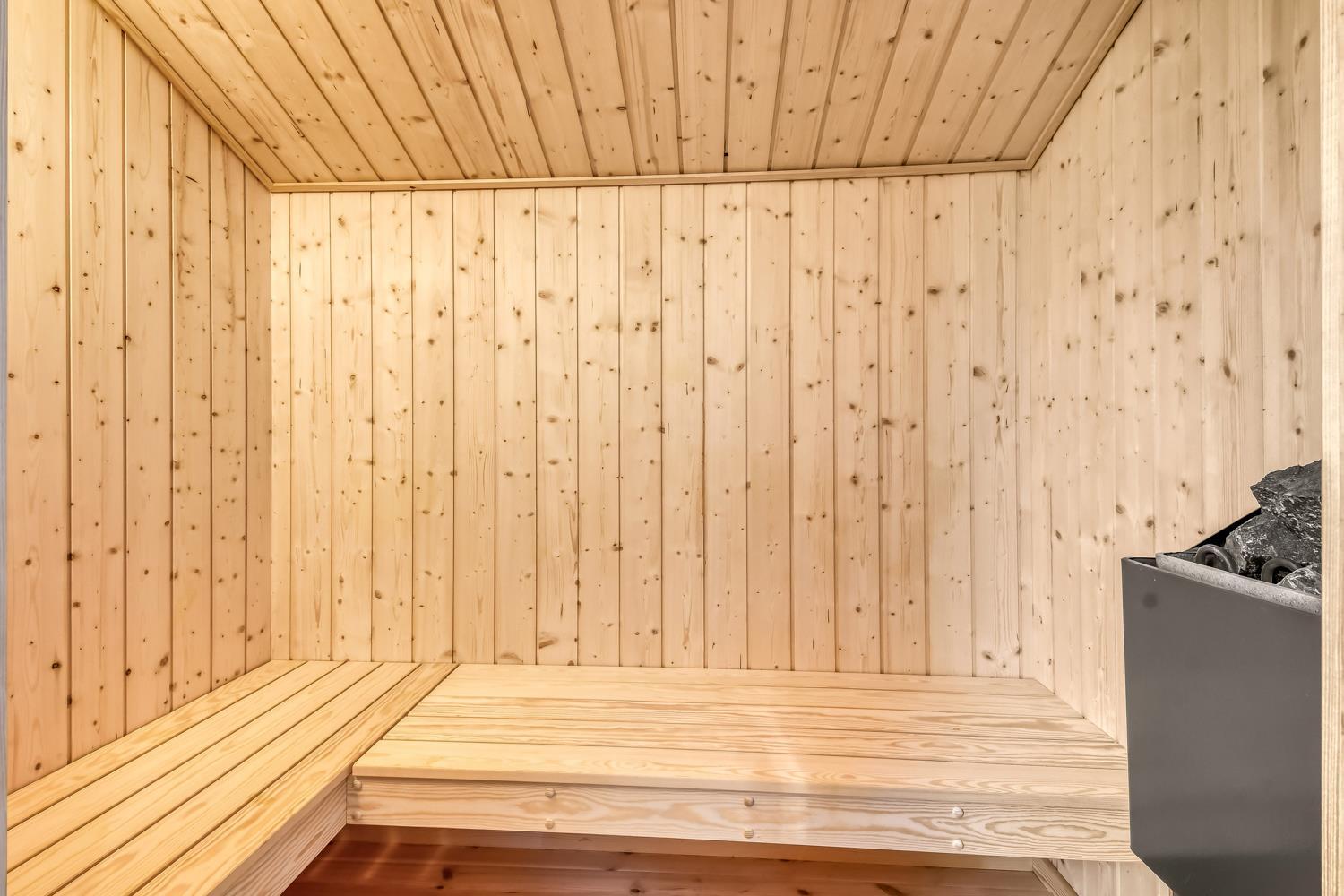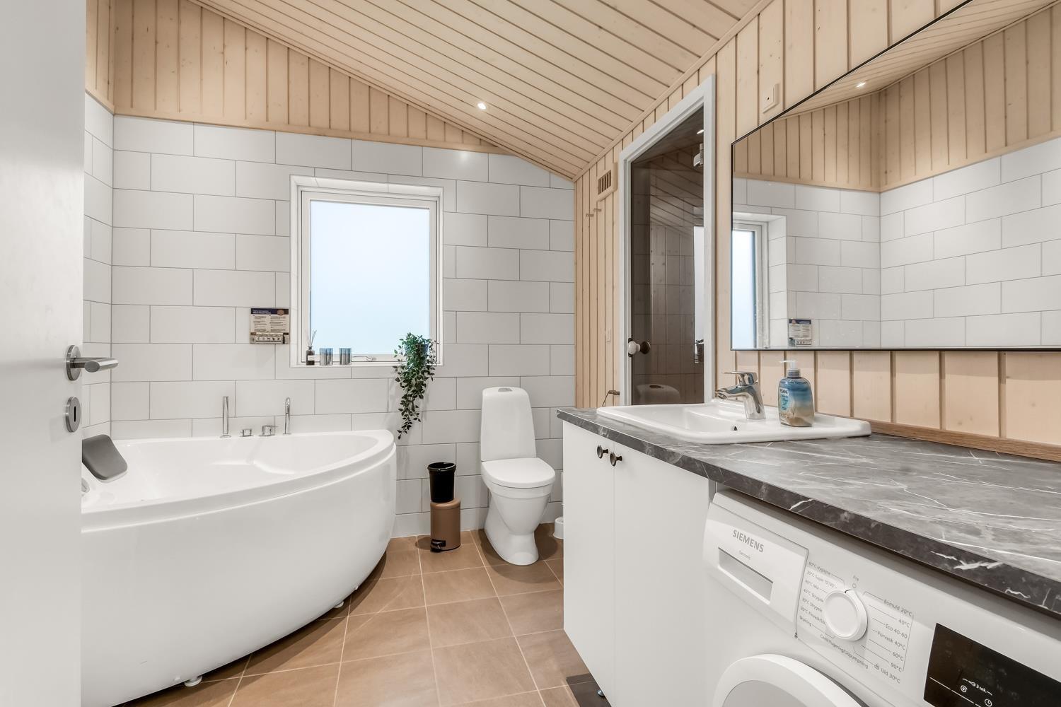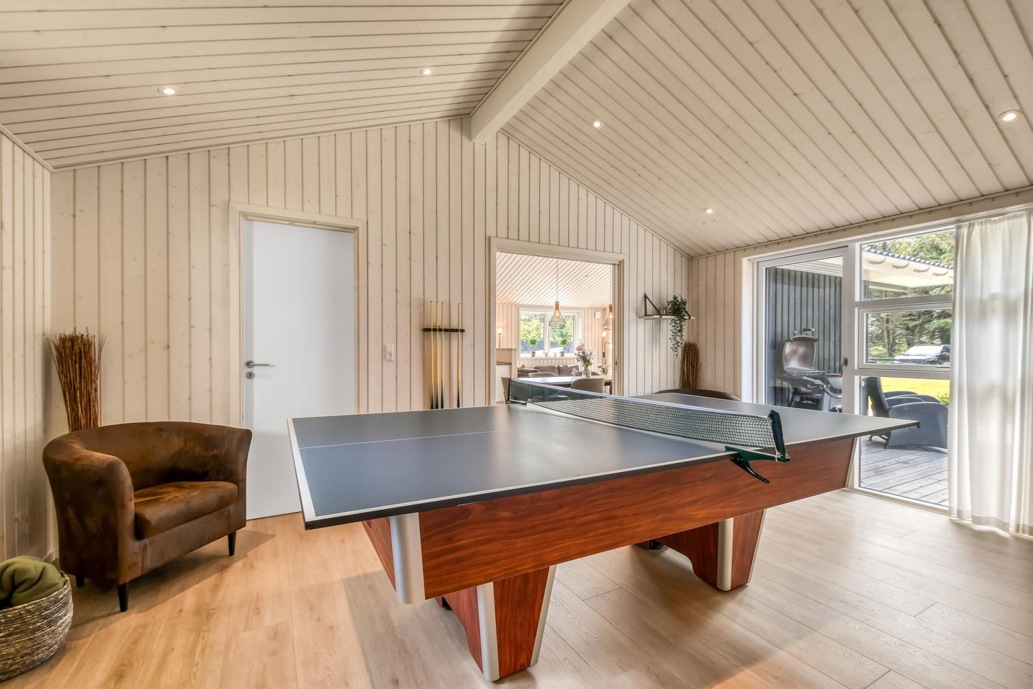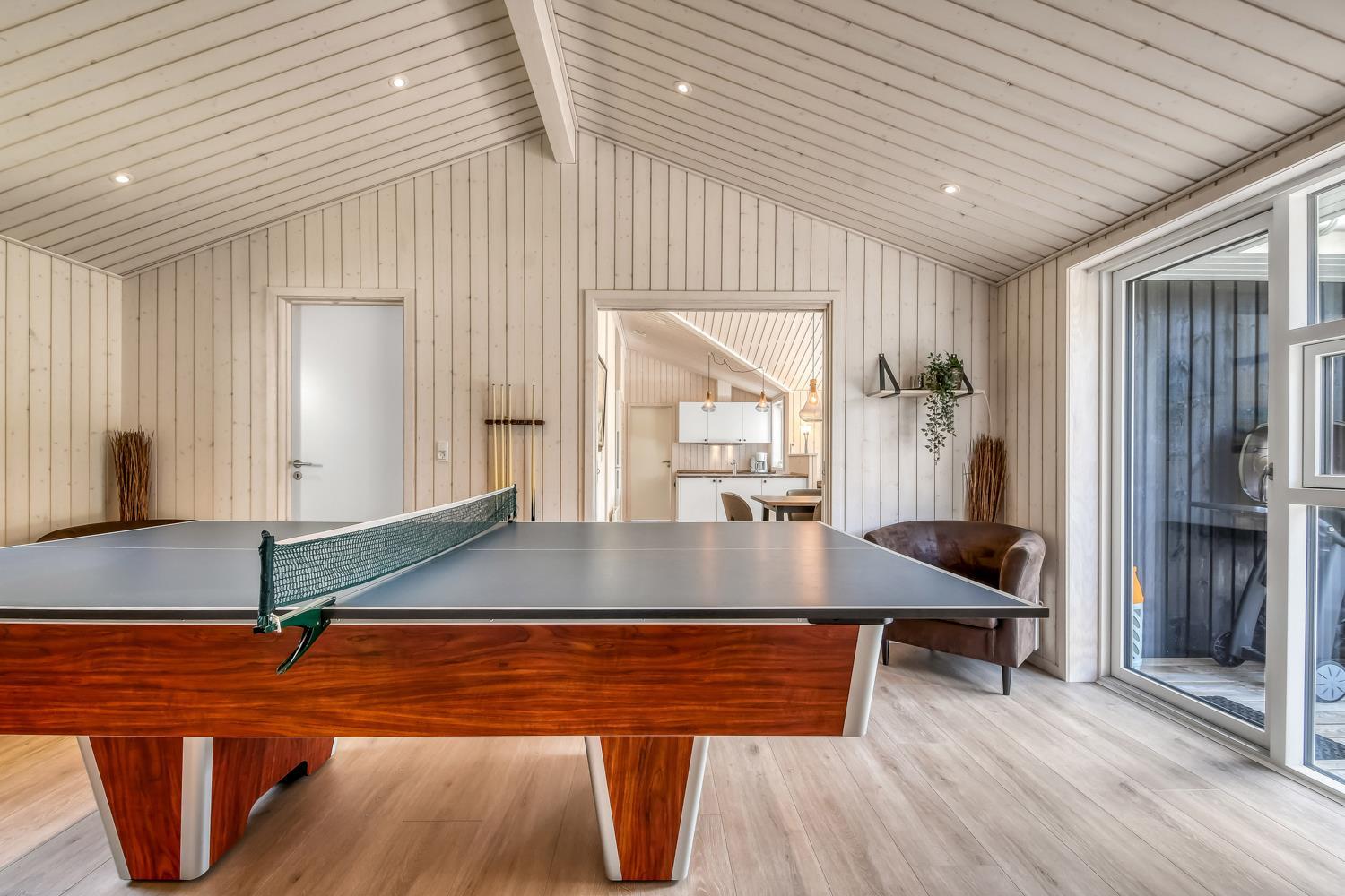 Aktivitetsrummet indeholder: Kombineret pool- og bordtennisbord samt ekstra smart-TV med danske og tyske Tv-programmer, radio og mulighed for streamings tjenester via indbtgget Chromecast. Her kan man få flere timer til at gå. 2 badeværelser, med toilet, håndvask, bruser og gulvvarme. I det store badeværelse findes husets wellness afdeling med indendørs spabad og direkte adgang til saunaen. Vaskemaskine er der også. Varmepumpe og brændeovn som gør huset særdeles energivenligt og bevirker også at der er særdeles billigt at opvarme, selv i koldere perioder. Huset lejes ikke ud til ungdomsgrupper. Har man el-bil eller en Plug-in hybrid, så er der lade boks til Type 2 lade stik, der kan lade op til 11 kWh. Ikke ryger hus. Max. 2 hunde tilladt.