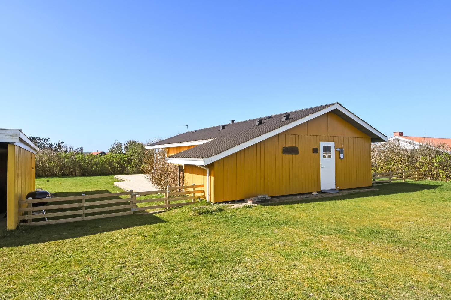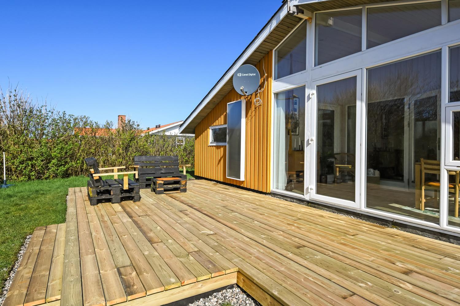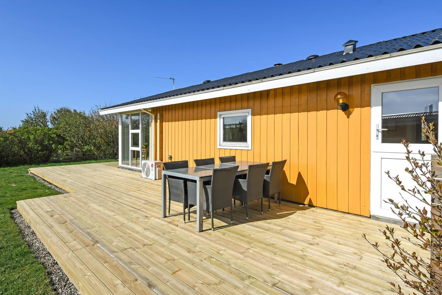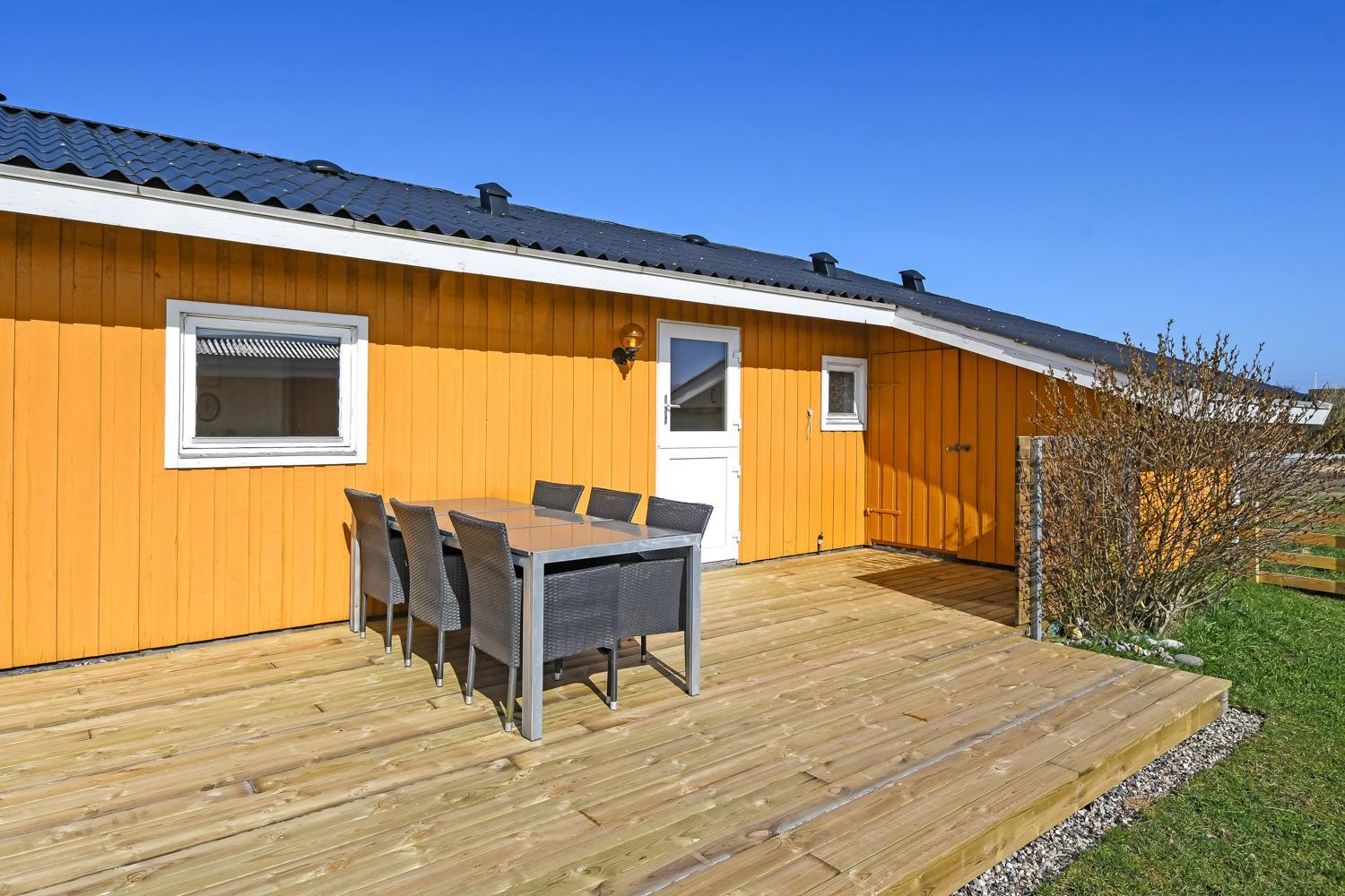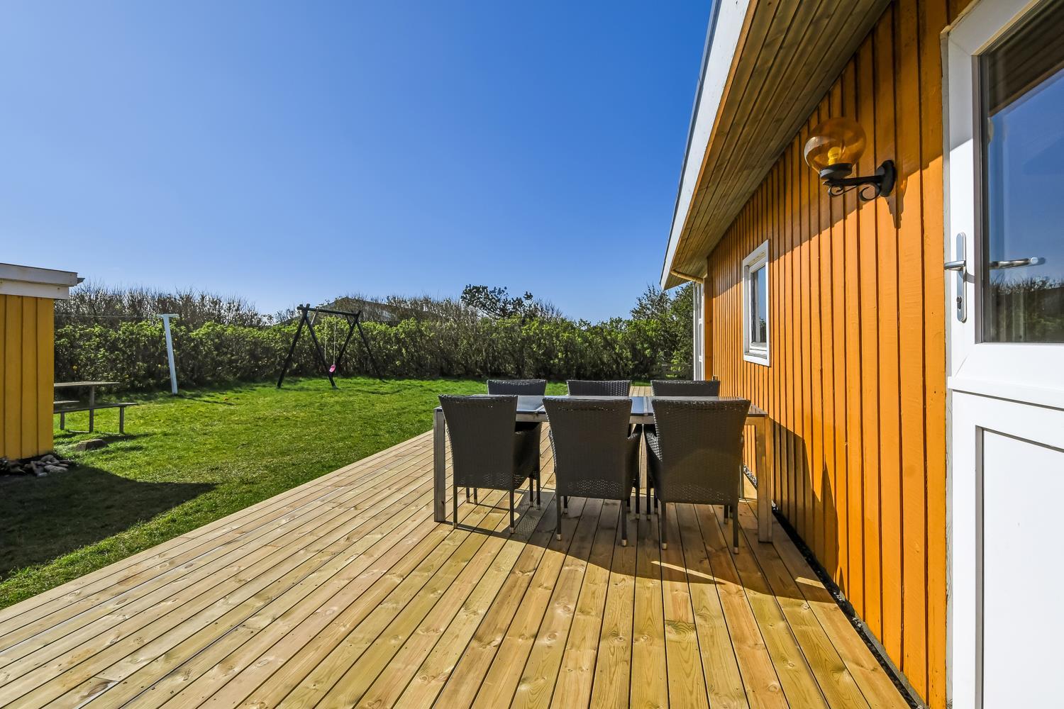 Huset er omgivet af et stort træterrasseanlæg. Hele terrassen er omkranset af et stakit og en bekymringsfri, lukket have, hvor både børn og hunde kan slå sig løs. Gyngestativ, havemøbler, parasol og grill. Området omkring Vejlby og Ferring sø ligger ikke langt fra det brusende Vesterhav, indkøbsmuligheder, legeplads og stranden. Naturen indbyder til udendørsaktiviteter året rundt - uanset om det er gåture i landskabet omkring søen eller en strandtur. Der er kun 300 meter til Vejlby Torv med købmanden og Cafe John Wayne, så dette gør kun ferien endnu mere komfortabel. Vejlby Klit er omgivet af vand på begge sider med Vesterhavet mod vest som altid er et besøg værd. Her kan man bade, lave sandslotte, fiske, flyve med drage eller ganske enkelt blot gå en lang tur og nyde ensomheden eller familiens nærvær. Det samme gælder iøvrigt den tætte beliggenhed til Ferring Sø hvor der går en vandrerute rundt om.