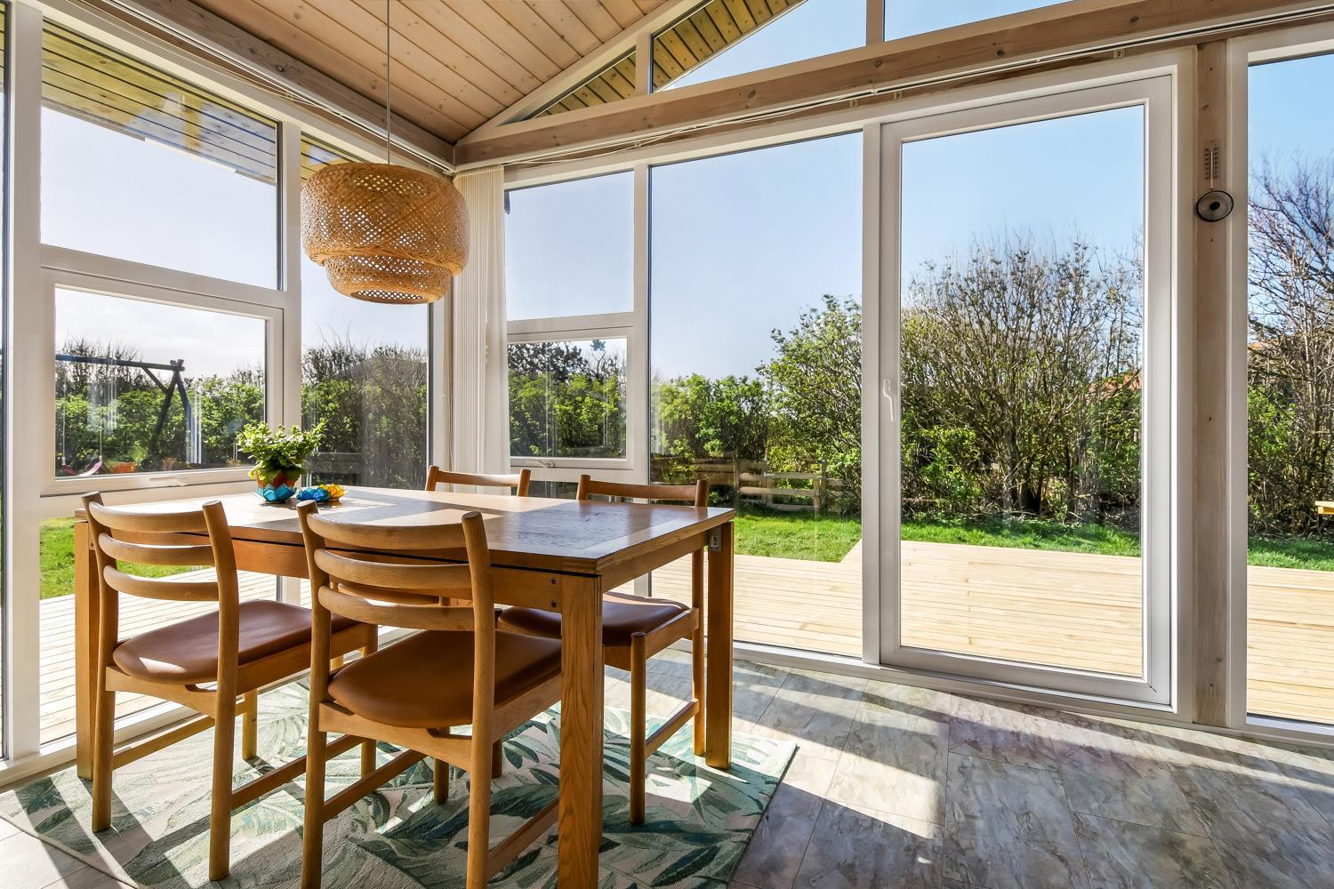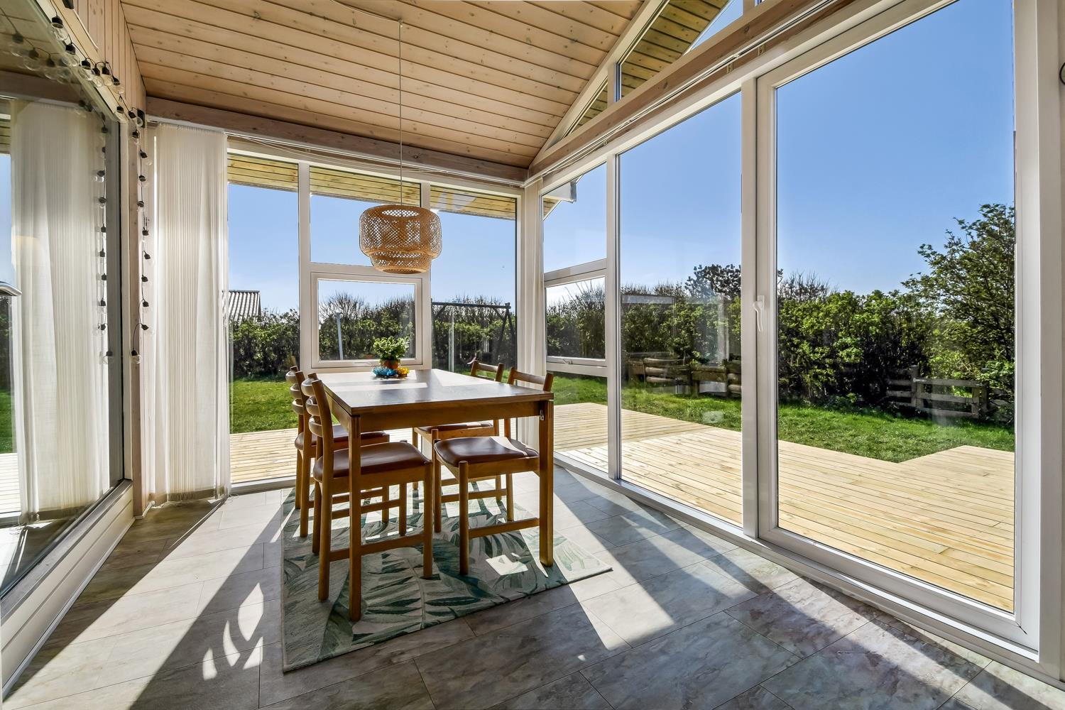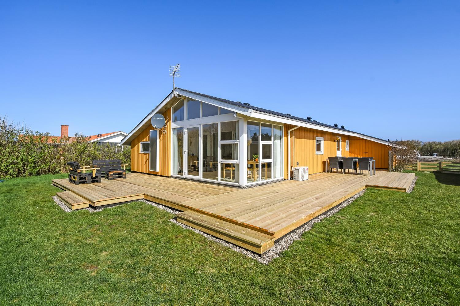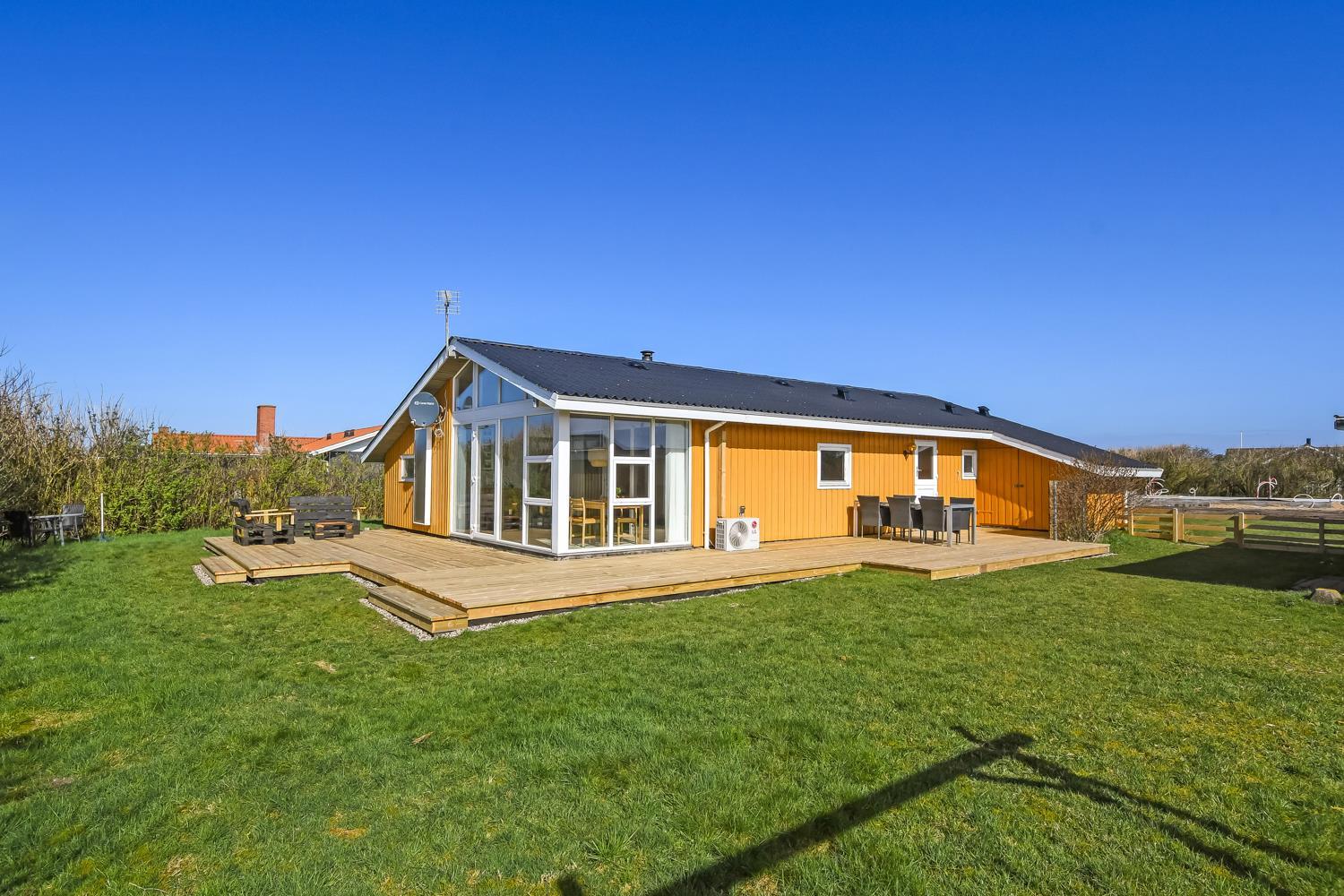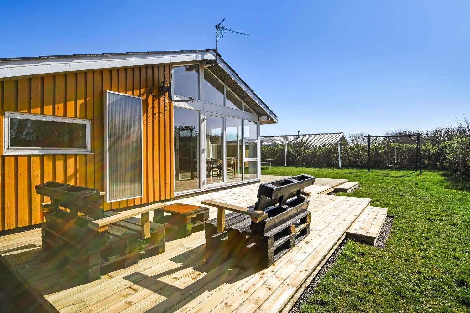 Huset er omgivet af et stort træterrasseanlæg. Hele terrassen er omkranset af et stakit og en bekymringsfri, lukket have, hvor både børn og hunde kan slå sig løs. Gyngestativ, havemøbler, parasol og grill. Området omkring Vejlby og Ferring sø ligger ikke langt fra det brusende Vesterhav, indkøbsmuligheder, legeplads og stranden. Naturen indbyder til udendørsaktiviteter året rundt - uanset om det er gåture i landskabet omkring søen eller en strandtur. Der er kun 300 meter til Vejlby Torv med købmanden og Cafe John Wayne, så dette gør kun ferien endnu mere komfortabel. Vejlby Klit er omgivet af vand på begge sider med Vesterhavet mod vest som altid er et besøg værd. Her kan man bade, lave sandslotte, fiske, flyve med drage eller ganske enkelt blot gå en lang tur og nyde ensomheden eller familiens nærvær. Det samme gælder iøvrigt den tætte beliggenhed til Ferring Sø hvor der går en vandrerute rundt om.