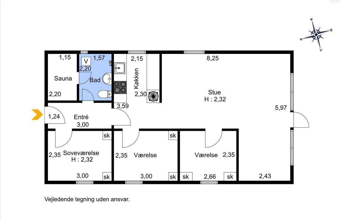 Et godt udnyttet træhus på 74 m2 med gratis Internet. Bilen parkeres lige ved huset. En mindre entré byder velkommen og sørger for adgang til husets værelser, badeværelse og kombineret køkkenhjørne og opholdsstue. 3 soveværelser (1DS, 1DS, 1DB sovesofa med gode madrasser og lameller). Hyggelig opholdsstue med pæne, moderne polstermøbler, spiseplads, fladskærms tv med tyske og danske kanaler og DVD / Radio / Bluetoothhøjtaler. Varmepumpen og den dejlige brændeovn formindsker regningen for opvarmning ved afrejse og understreger hyggen i stuen. Godt køkkenhjørne med komfur med keramiske kogeplader, emhætte, mikroovn, køleskab med lille fryseboks og opvaskemaskine. Trægulvene i hele huset, gør at det er let at rengøre. Husets badeværelse har klinkegulv med gulvvarme, toilet, håndvask, bruseniche, adgang til sauna samt vaskemaskine. Max. 1 husdyr tilladt. Ikke ryger hus.