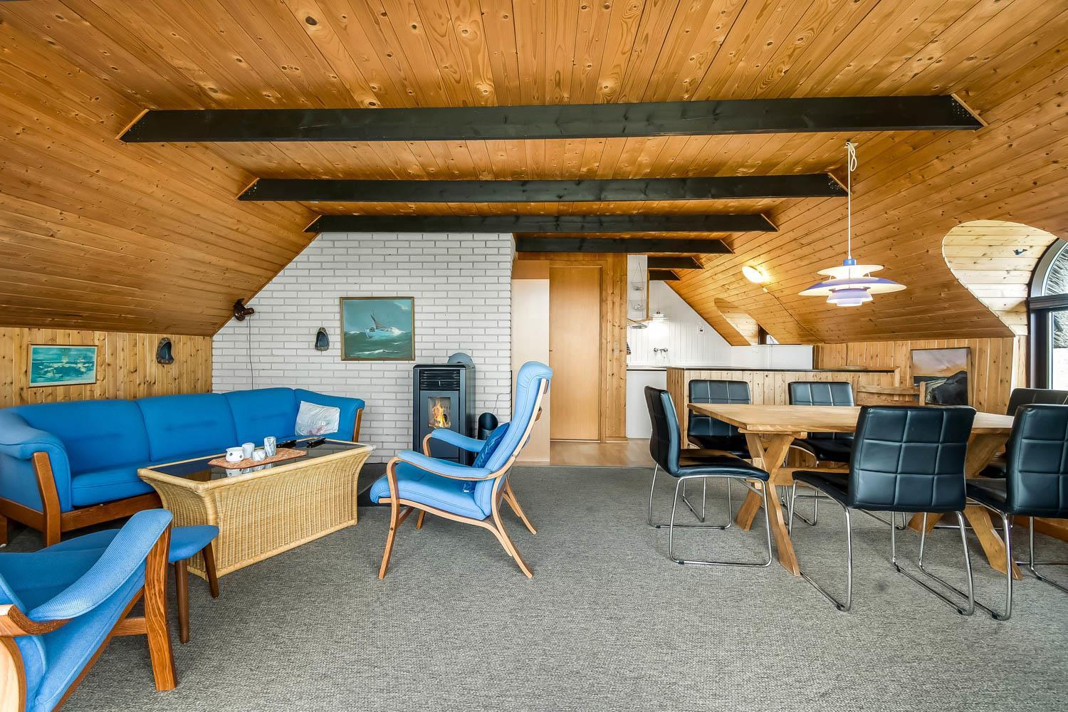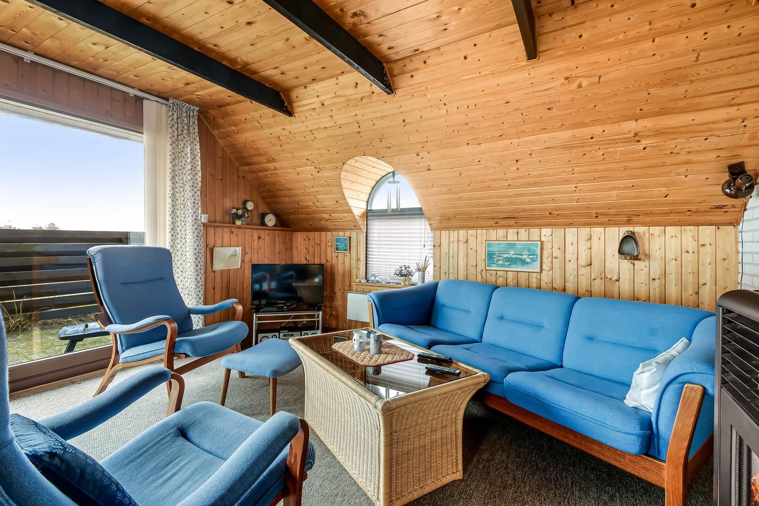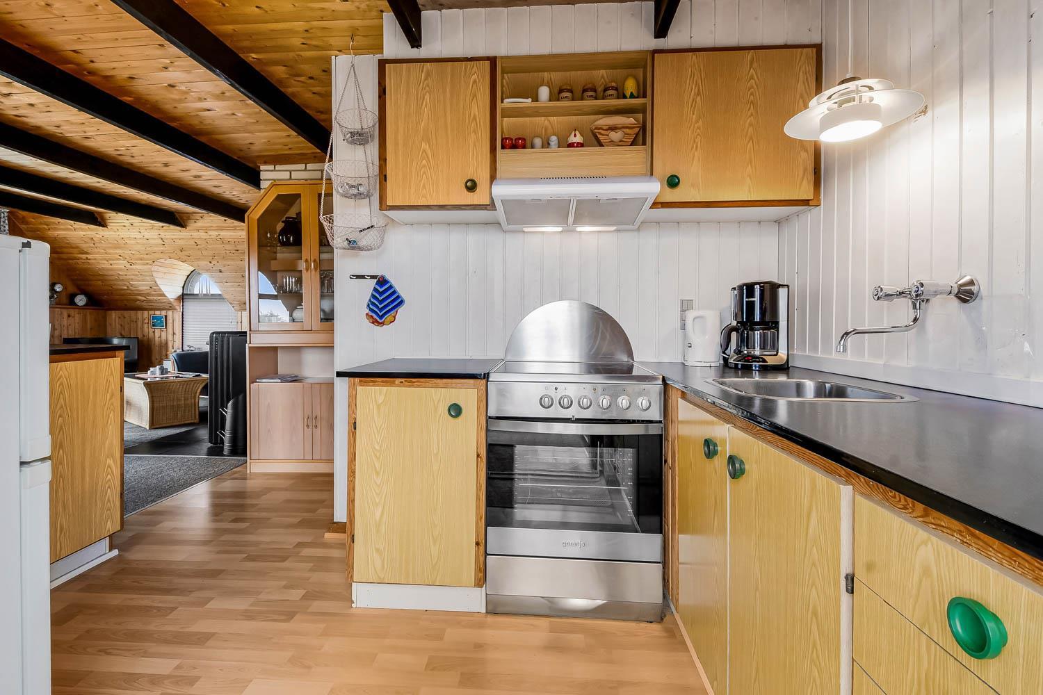 72 m2 stort stenhus. Lille Entré med afhængeplads. Opholdsstue og åbnet køkkenhjørne. Opholdsstue har udsigt til klitterne og er indrettet med polstermøbler, TV med danske og tyske programmer samt mulighed for streaming af TV-programmer / radio-programmer / Apps via Chromecast. Radio og CD-afspiller samt spisebord og brændeovn til træpiller (træpiller kan købes i huset). Køkkenhjørne med komfur med glaskeramiske kogeplade og emhætte. Køleskab med fryseboks er placeret i gangen. Ældre, lille badeværelse med toilet, håndvask og bruser. Der er gulvtæpper i opholdsrum og soveværelser. Husdyr ikke tilladt. Ikke ryger hus.