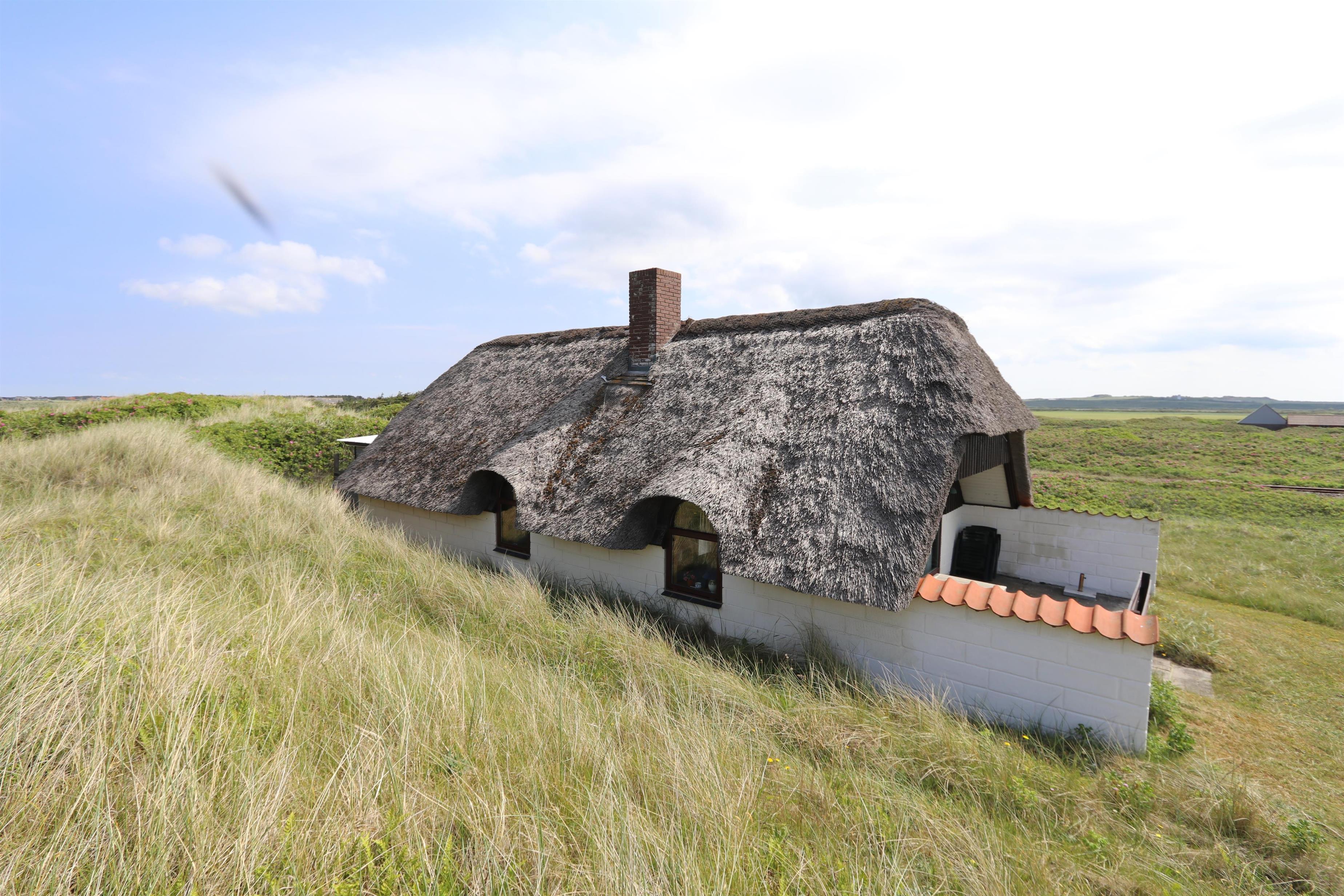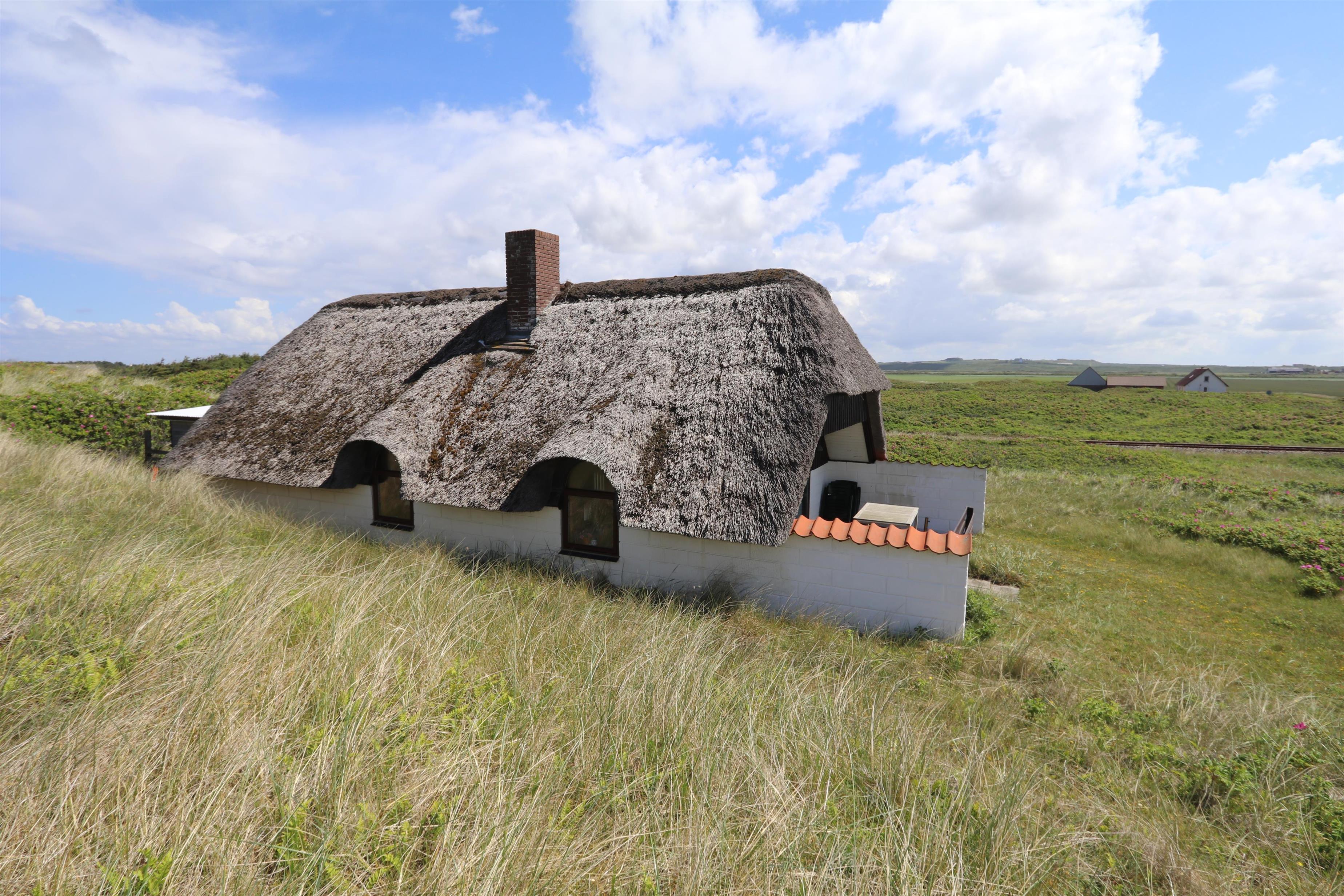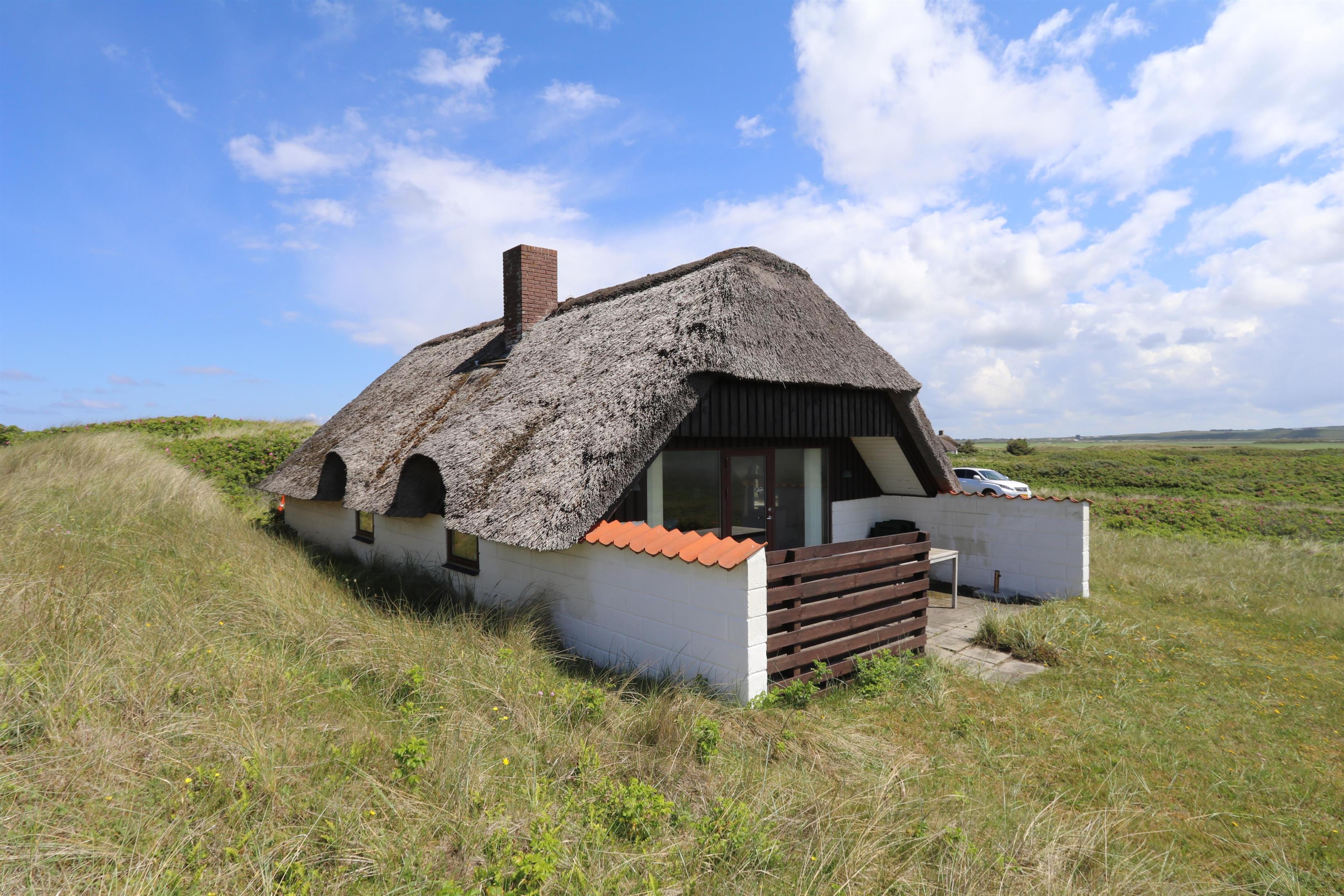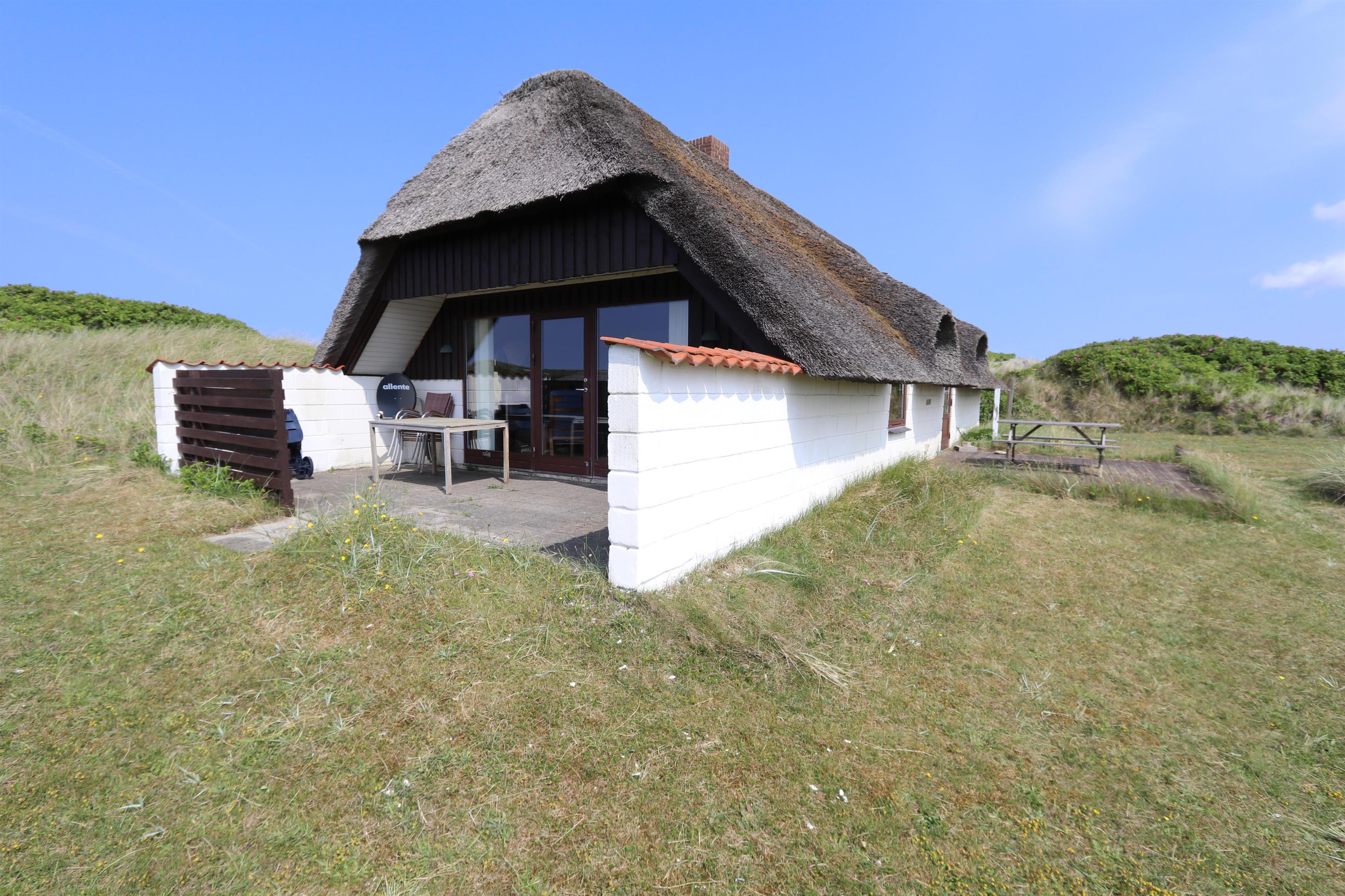 Ældre, velholdt feriehus med stråtag og gratis internet. Huset er roligt beliggende, for enden af en blind vej og lige bag ved første, brede klitrække til Vesterhavet med den dejlige sandstrand i Vejlby Klit.