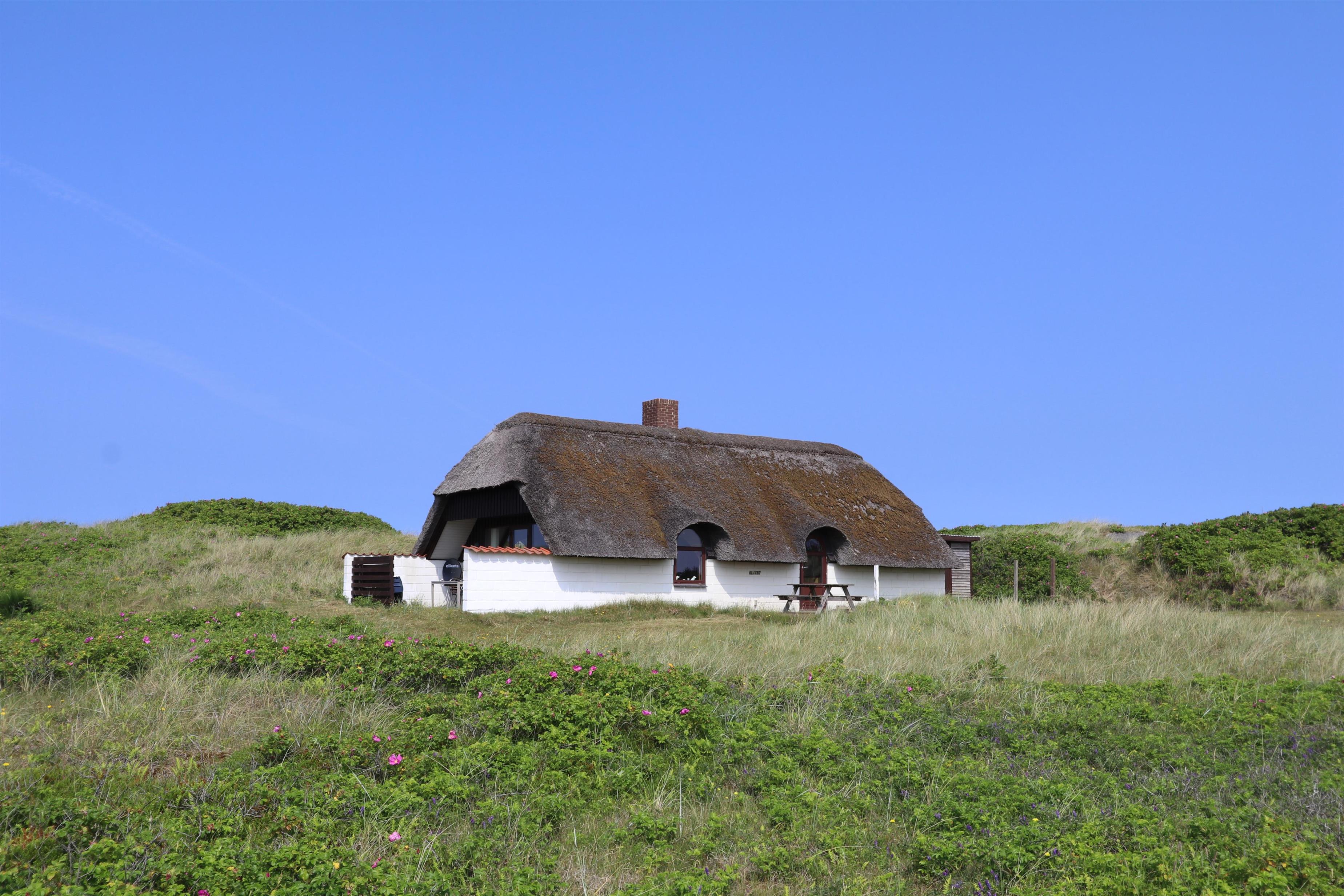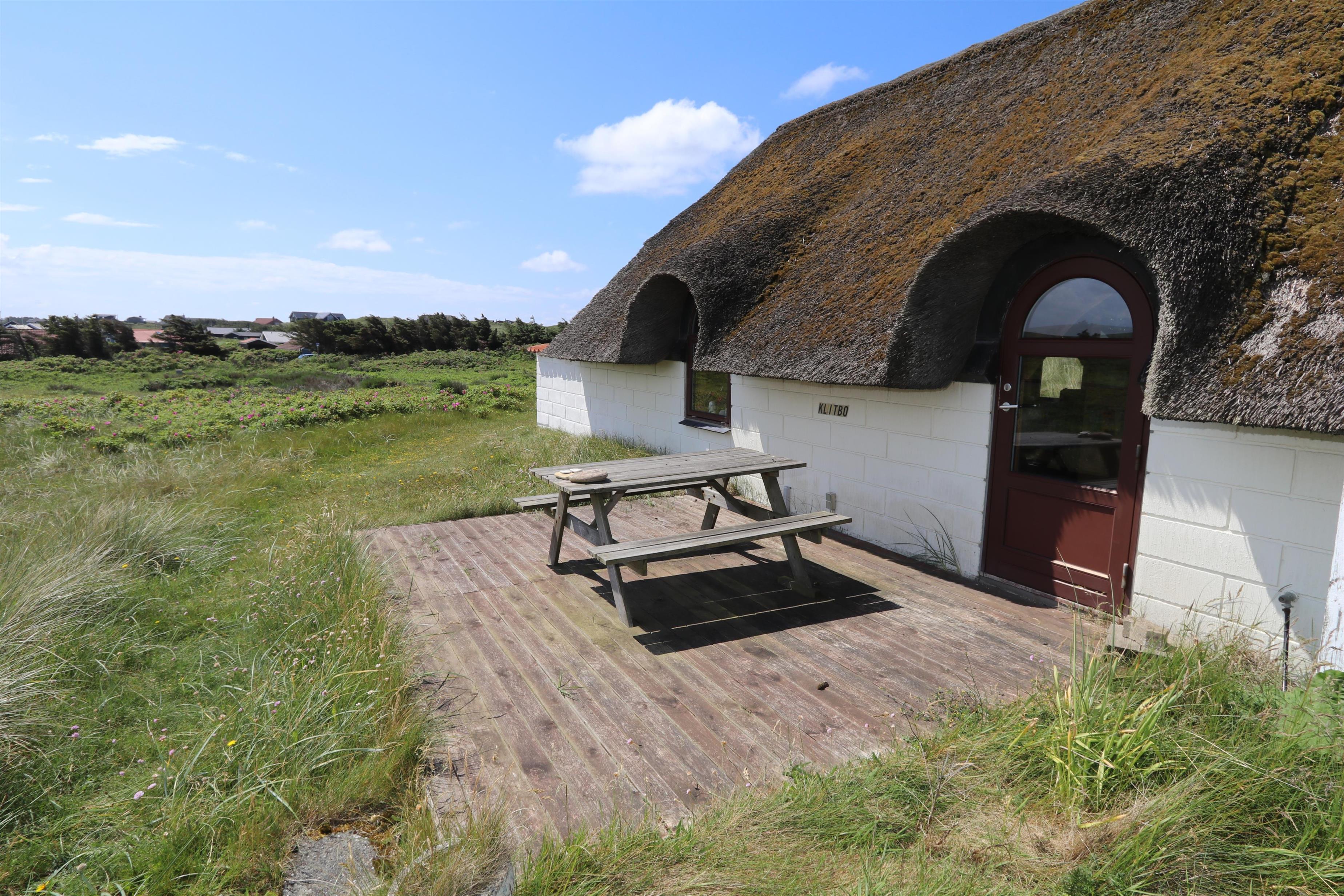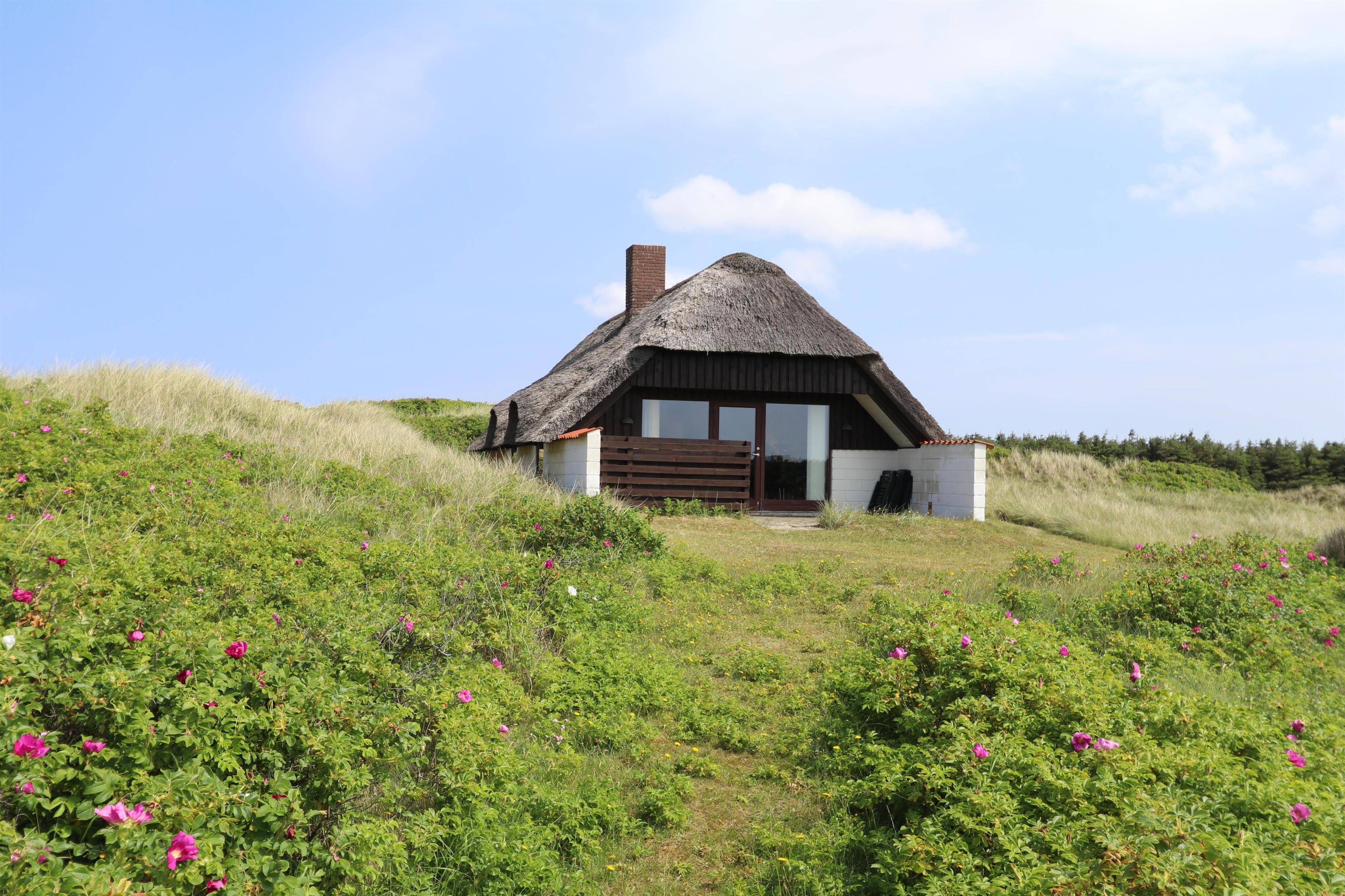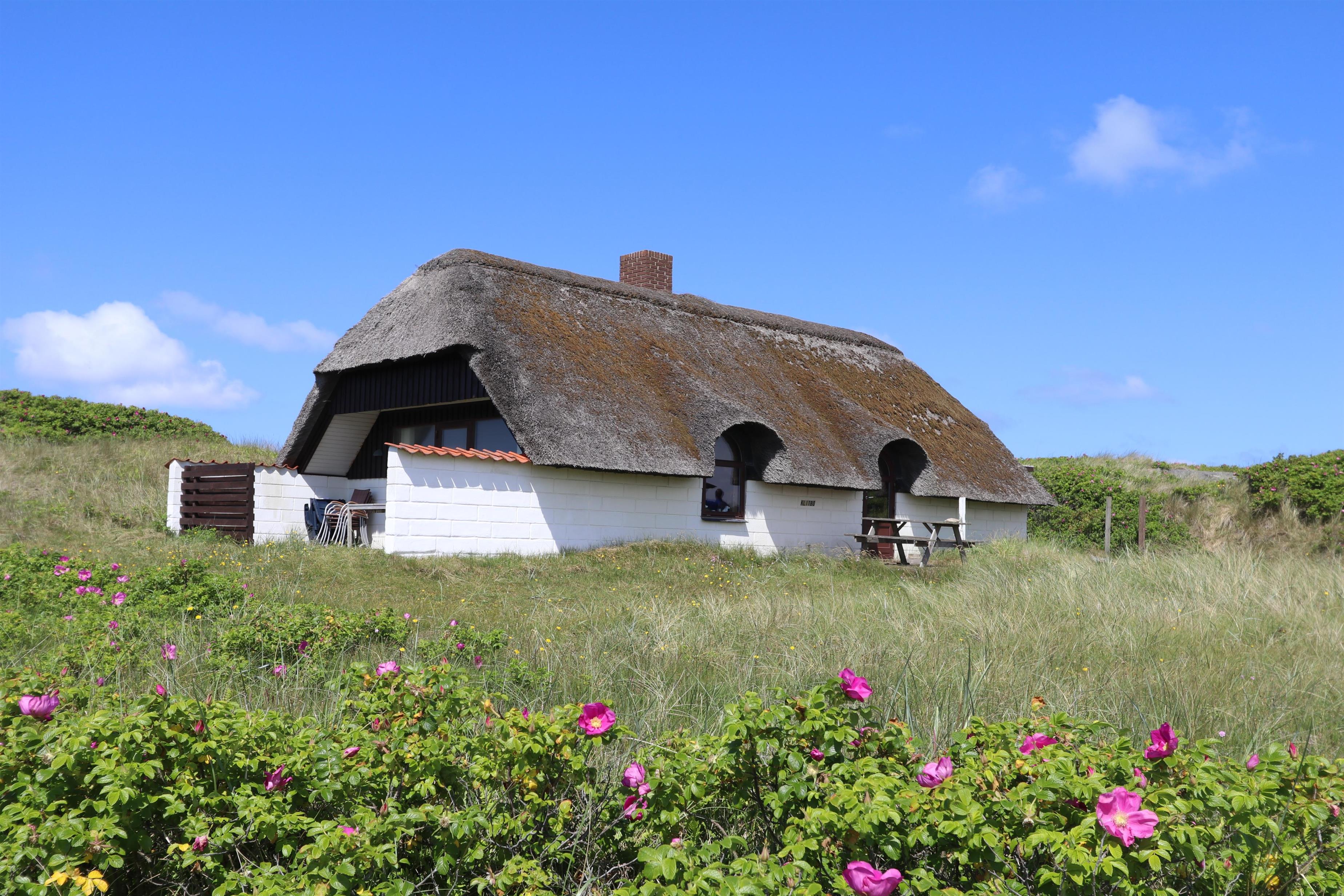 Ældre, velholdt feriehus med stråtag og gratis internet. Huset er roligt beliggende, for enden af en blind vej og lige bag ved første, brede klitrække til Vesterhavet med den dejlige sandstrand i Vejlby Klit.