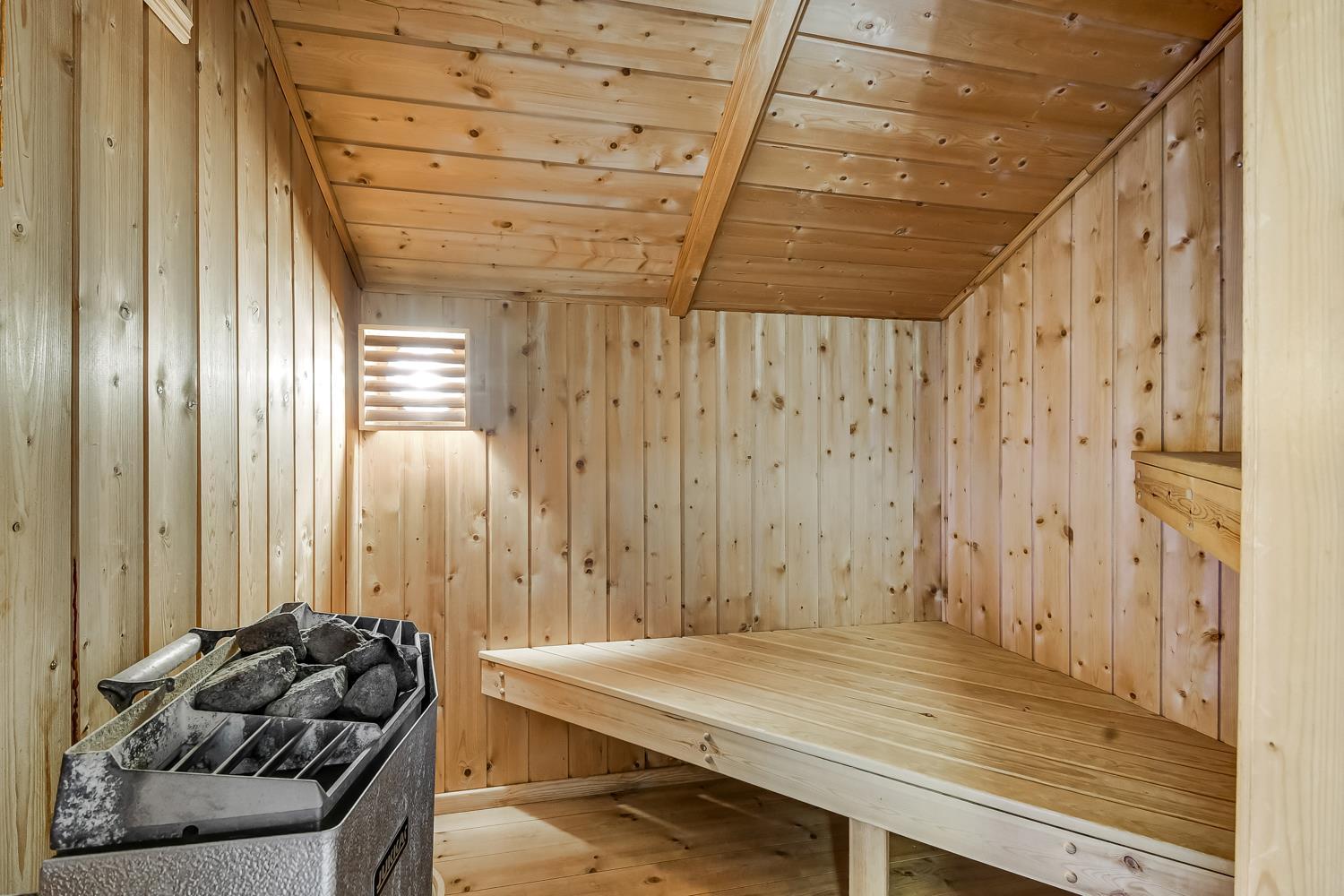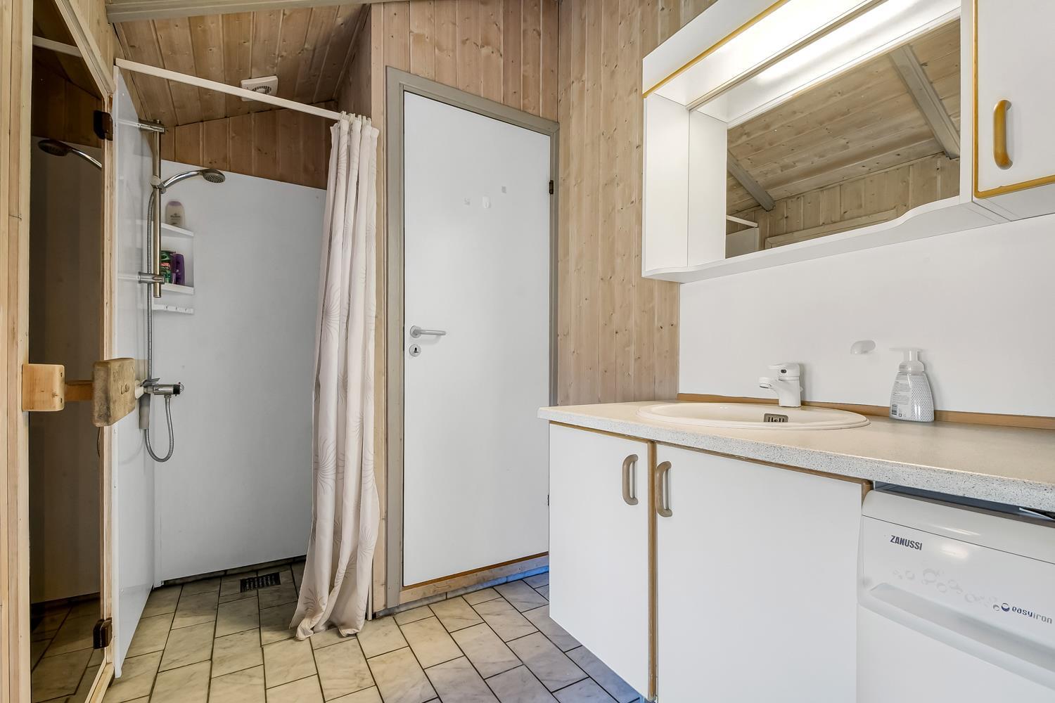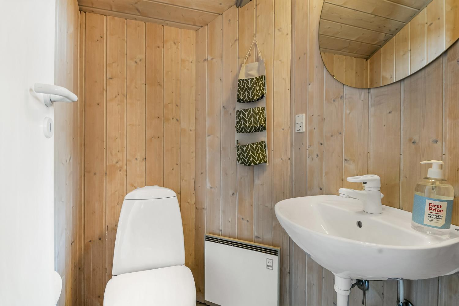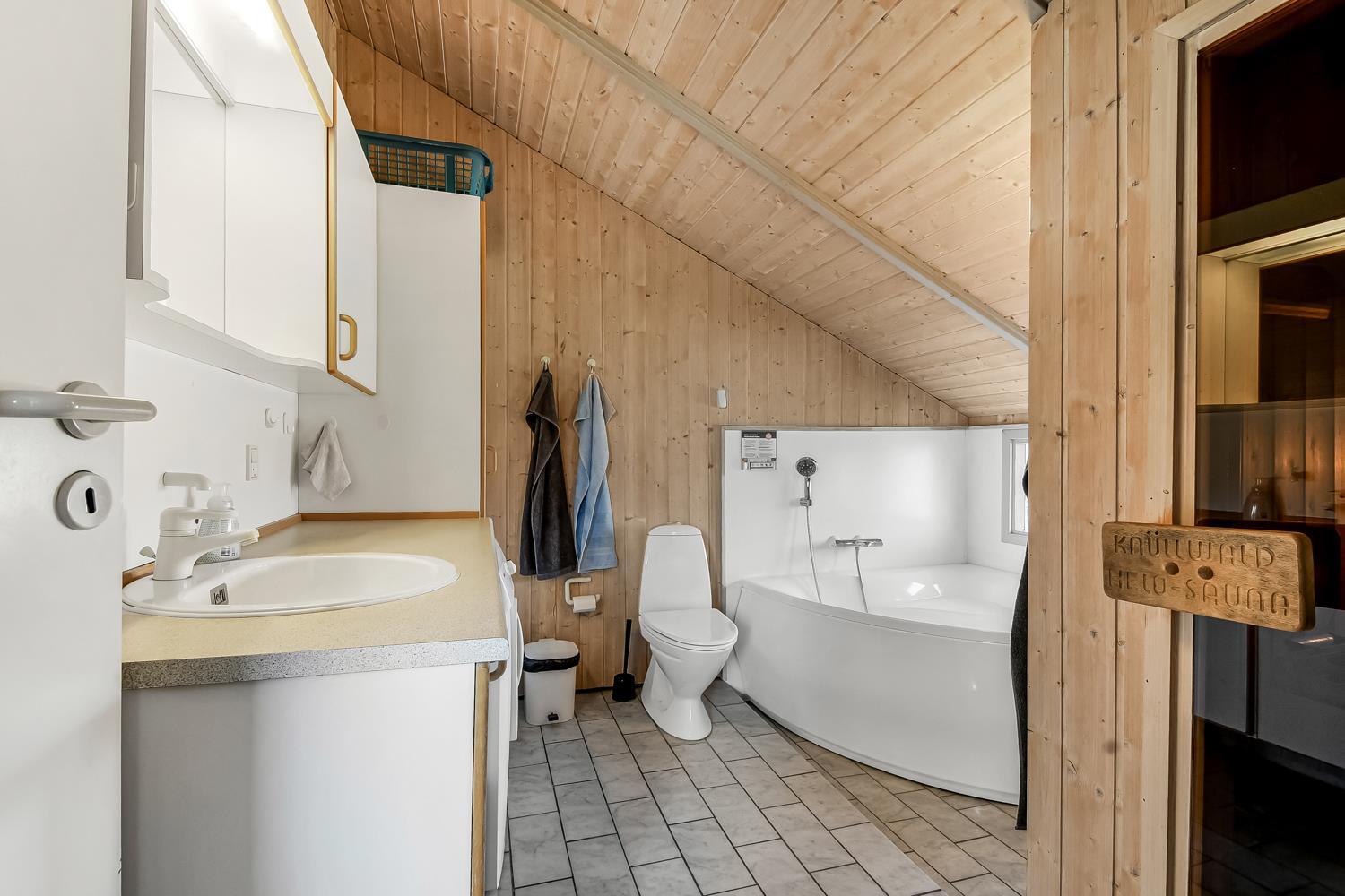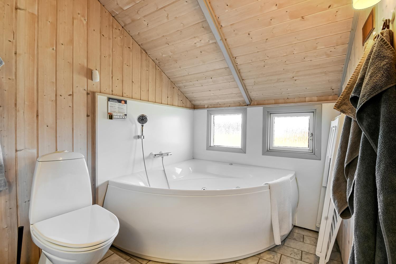 Badeværelset er særdeles flot med gulvvarme, toilet, håndvask, bruser og en 2-personers whirlpool med direkte adgang til husets sauna. Derudover er der et gæstetoilet samt vaskemaskine og tørretumbler. Køkkenet er fuldt udstyret med el-komfur, emhætte, køle-/fryseskab, opvaskemaskine og mikroovn. Til de mindste gæster er der en barnestol.