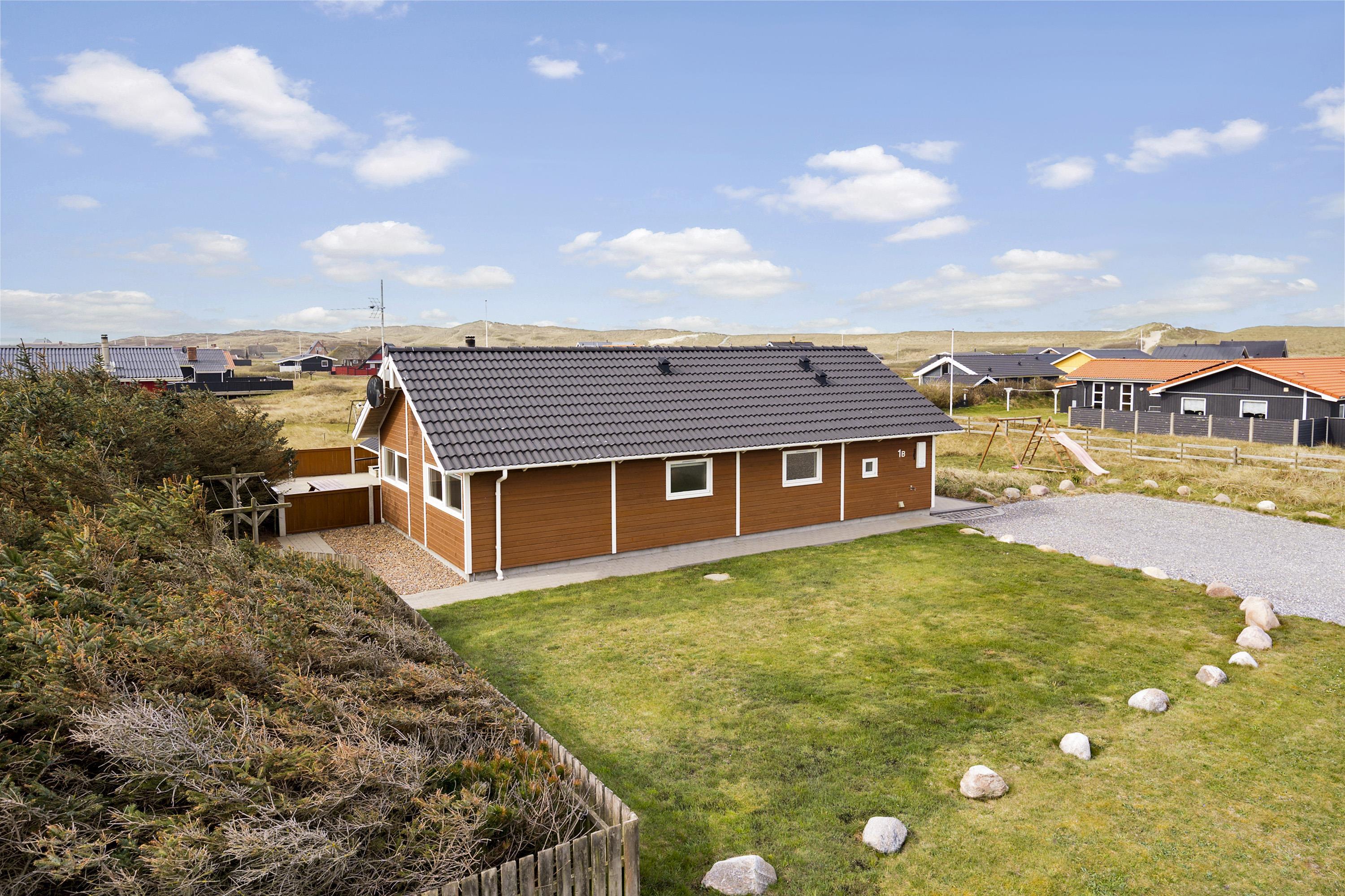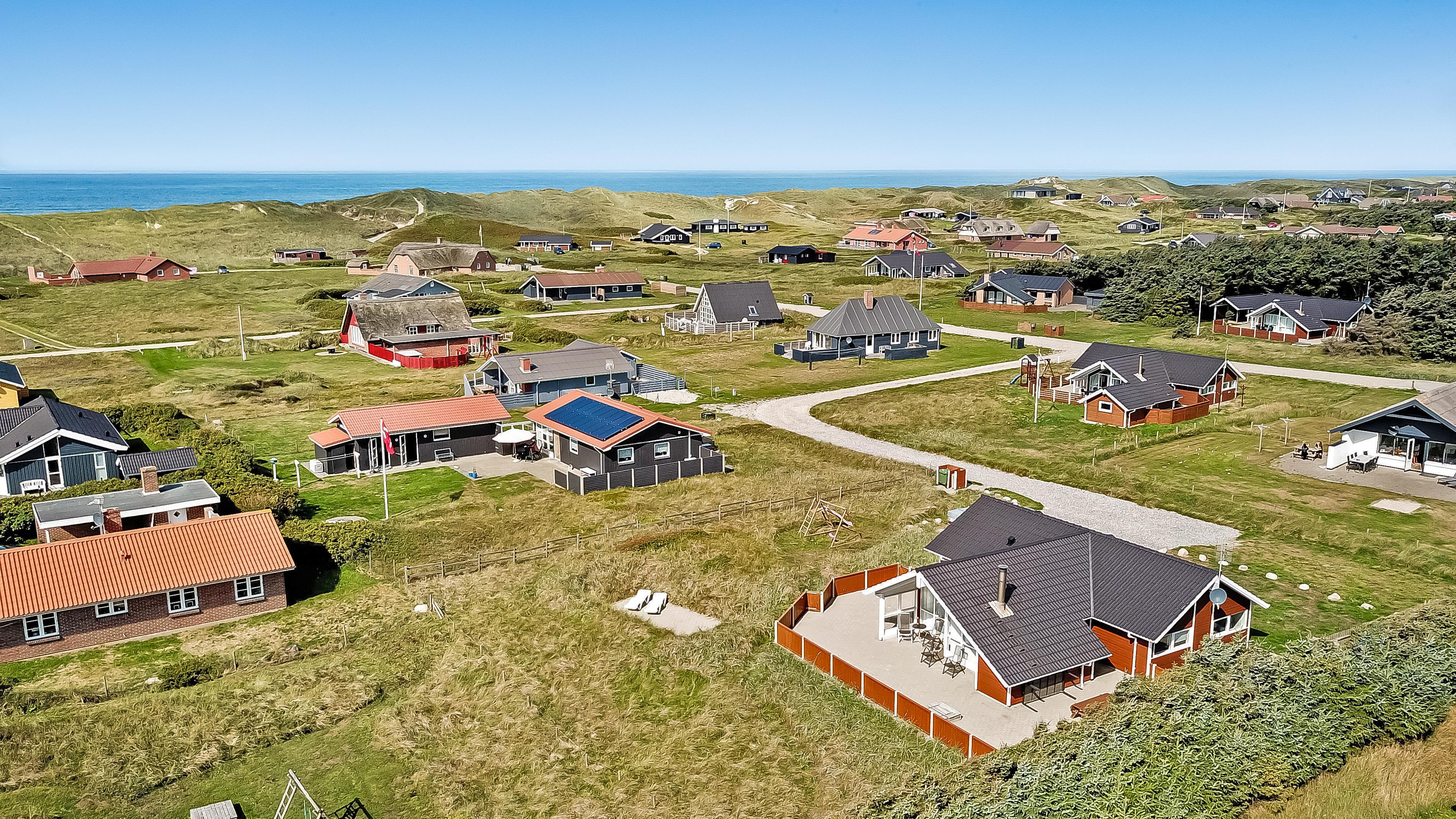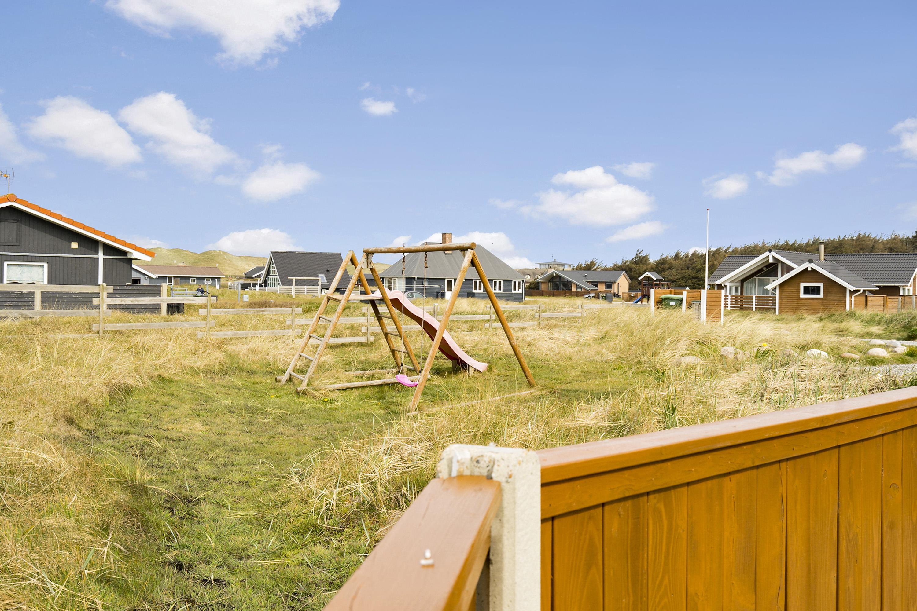 Huset er omgivet af en stor terrasse, som er indhegnet, her er der altid mulighed for at finde læ og nyde solen. Der er naturligvis havemøbler, solvogne og en grill, så man kan få den hyggelige stemning på terrassen og nyde aftensmaden direkte fra grillen. Fra dette hus er der blot 150 m til den dejlige, hvide sandstrand og Vesterhavet, hvor man kan få mange timer til at gå med lange spadsereture eller blot sidde i en klit og nyde havets brusen og den afslappende ro, et hav giver. Vil man ud på tur, kan man tage det lokale VLTJ tog, som kører fra Vemb til Thyborøn. Der er mulighed for at købe en familiebillet, som kan bruges en hel dag, hvilket kan give mulighed for at besøge både havnebyen Thyborøn og Lemvig uden at skulle bruge bilen. Offentlig legeplads blot 200-300 m fra huset. Ladestation til E-biler findes 100 m fra huset.