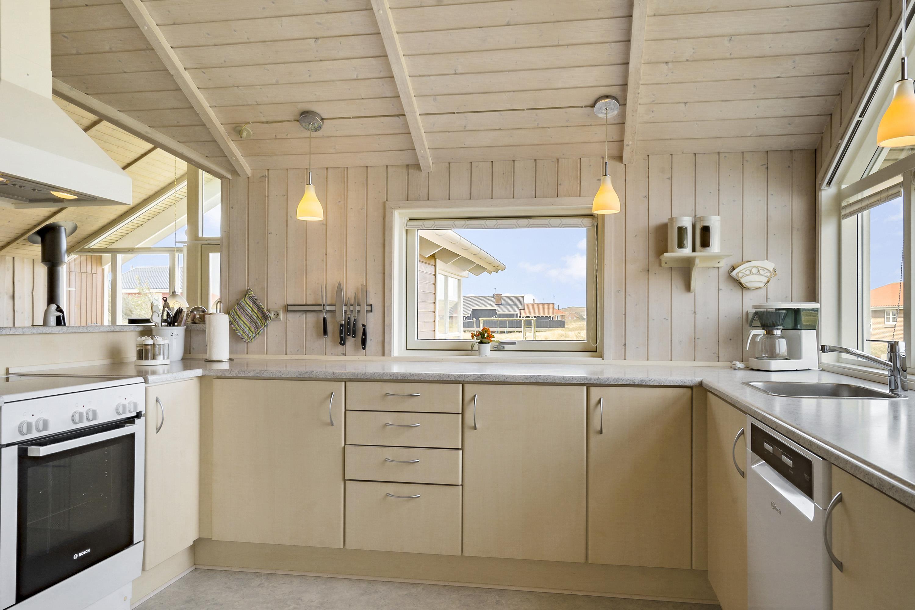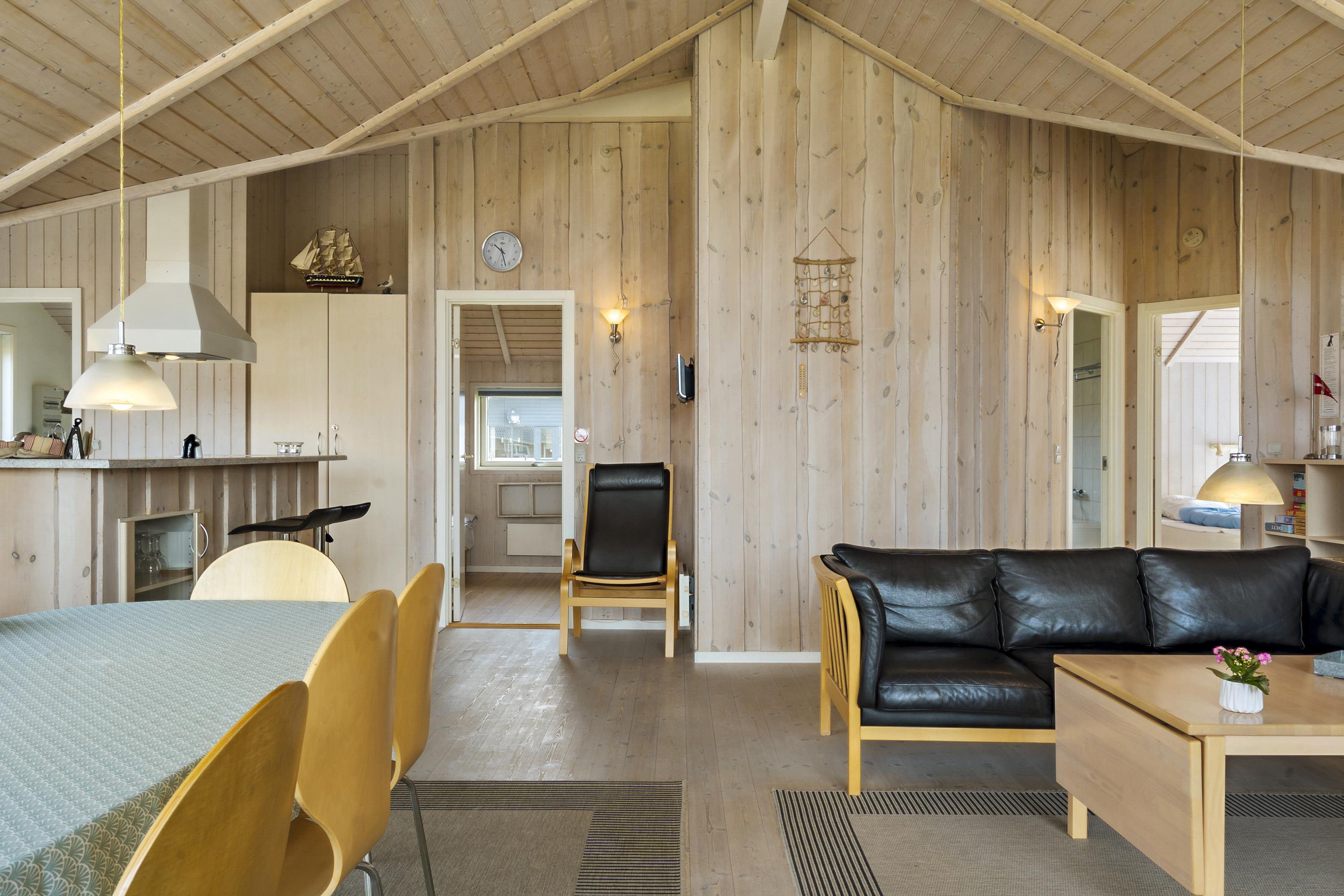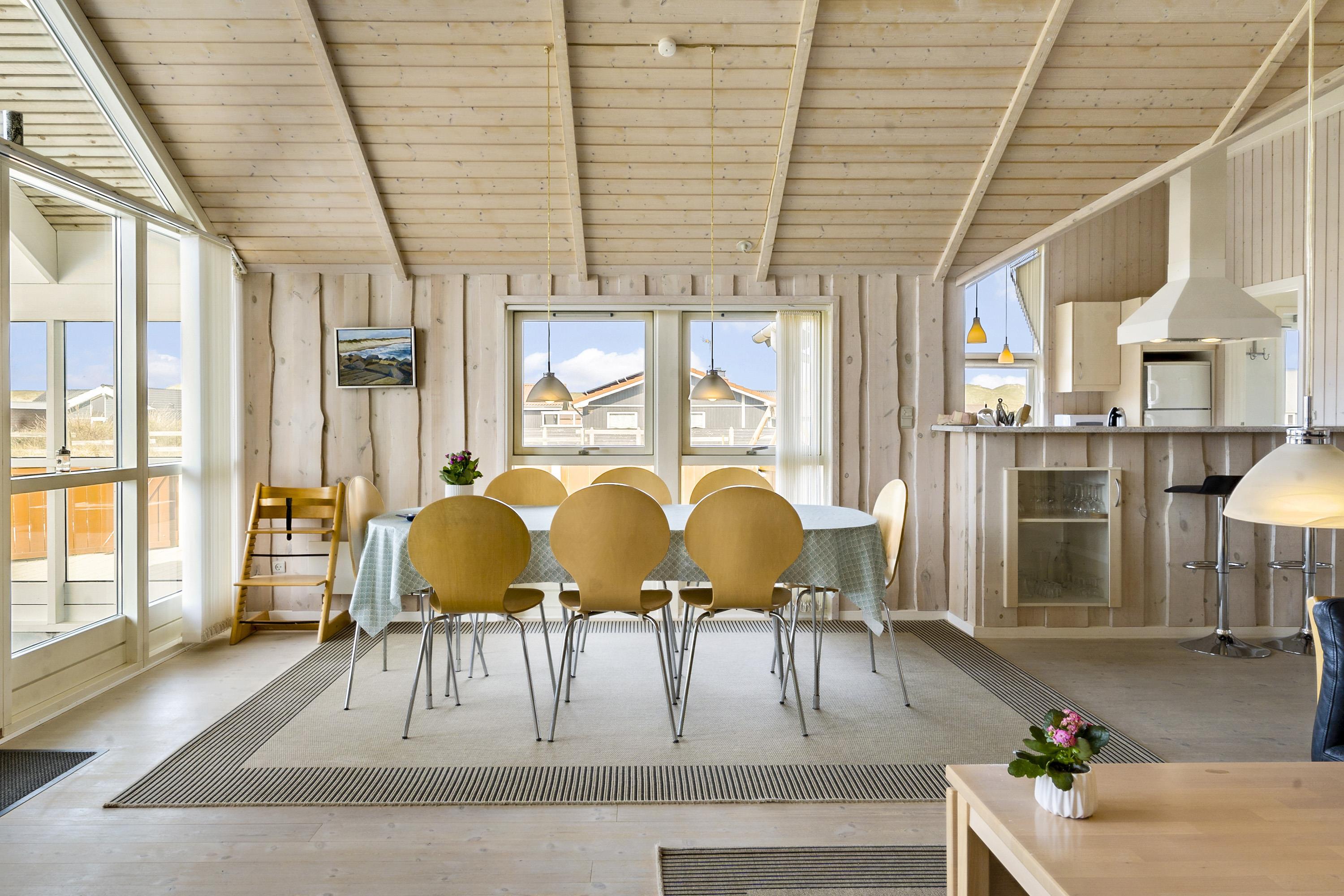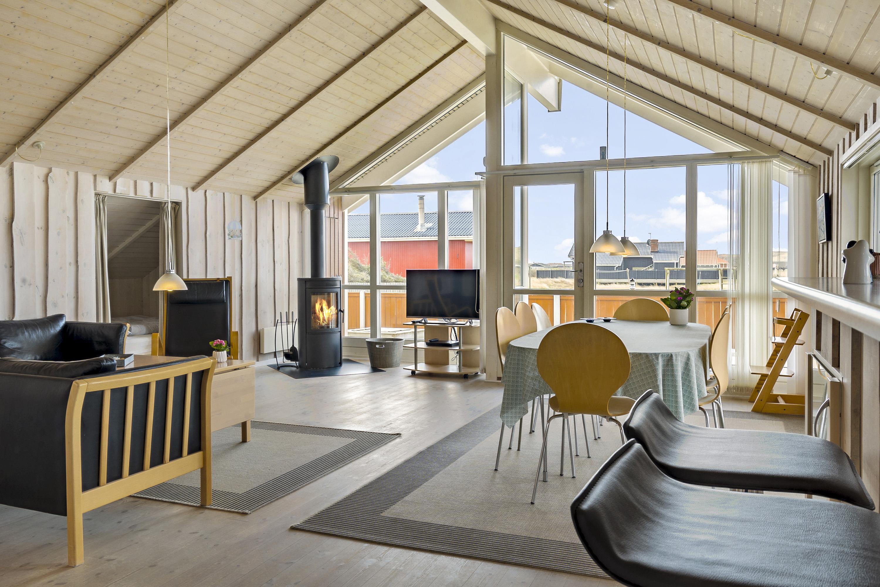 Huset er meget lyst og venligt indrettet med store vinduespartier, som giver et godt lysindfald. Køkkenet er veludstyret og indeholder alle tænkelige former for hjælpemidler såsom opvaskemaskine, mikroovn og køle/fryseskab. Stuen er med komfortable møbler, selvfølgelig et fladskærms-TV med DR1 og en parabol til de tyske kanaler. DVD og CD. Slap af foran den knitrende brændeovn som sammen med varmepumpen hjælper med at reducere udgiften til varmeregningen. Husets 3 soverum er indrettet med 1DS + 1DS + 2S, og så er der desuden i stuen en alkove med 2 sovemuligheder. Der er åbent til kip i stuen, og de lyse trævægge og lofter giver sammen med lysindfaldet fra de store vinduer en lys og venlig atmosfære i rummet. Til de helt små er der barneseng og barnestol til rådighed. Dejligt badeværelse med toilet, håndvask, bruser, spabad, gulvvarme og direkte adgang til sauna. Ekstra toilet med toilet, håndvask og gulvvarme. Bryggers med vaskemaskine og tørretumbler. 1 husdyr er tilladt. Dette hus er et ikke rygerhus.