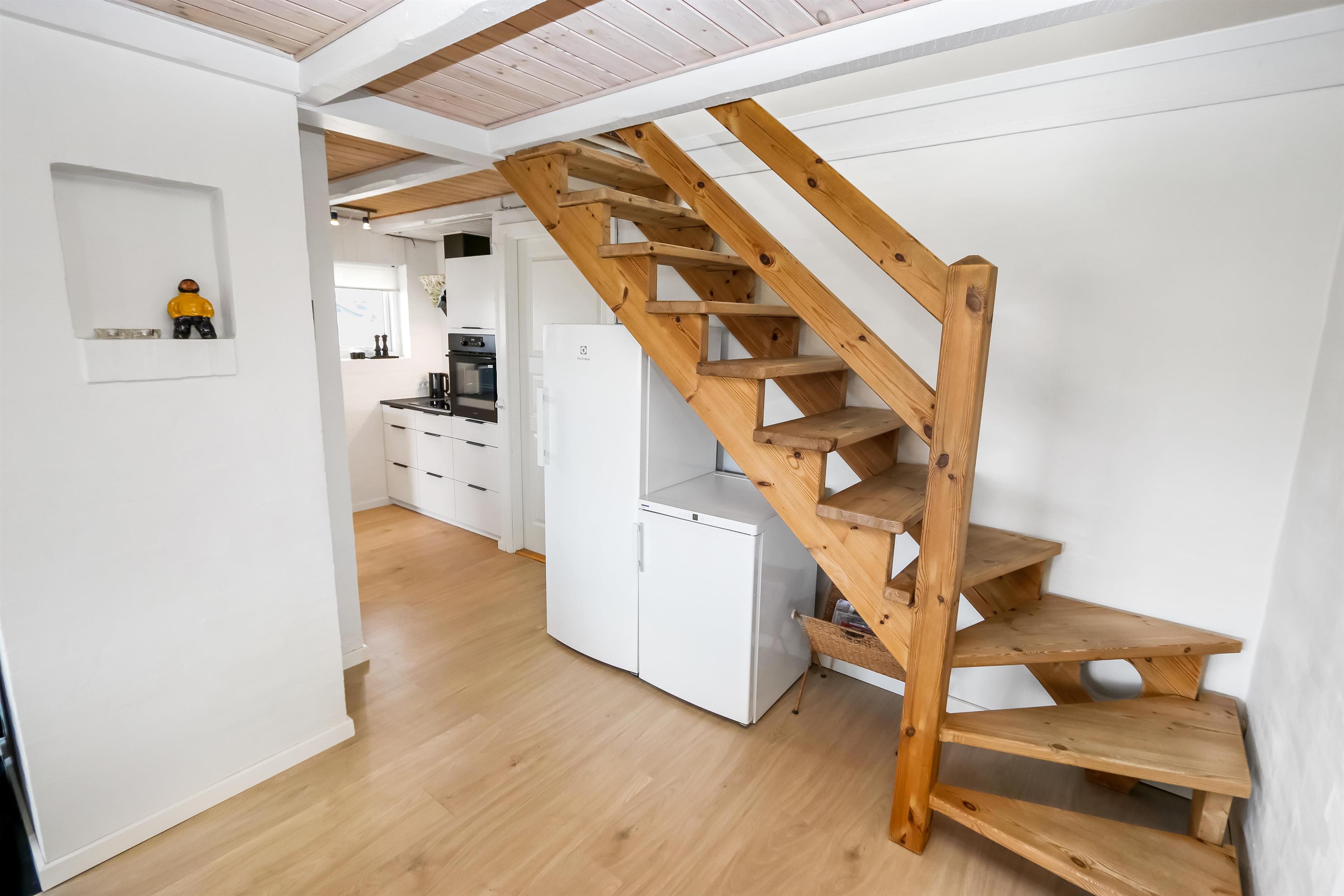 I stueetagen findes en stor, hyggelig stue med kamin og parabol-TV (med tyske kanaler). Køkkenet er godt indrettet med glaskeramisk komfur, køle-/fryseskab, opvaskemaskine og mikroovn, hvilket gør madlavning både nemt og bekvemt. Derudover er der to badeværelser med toilet, håndvask, bruser og gulvvarme; det store badeværelse har spa og adgang til sauna.