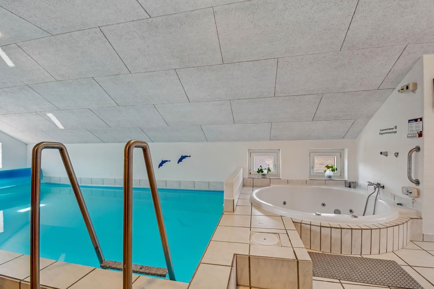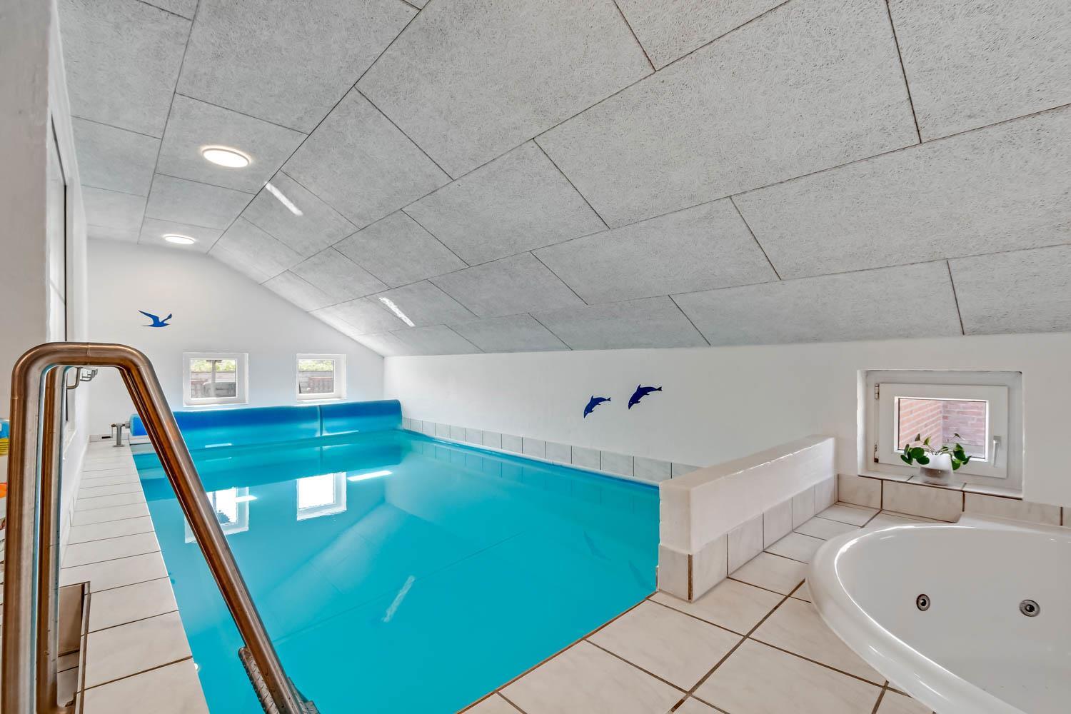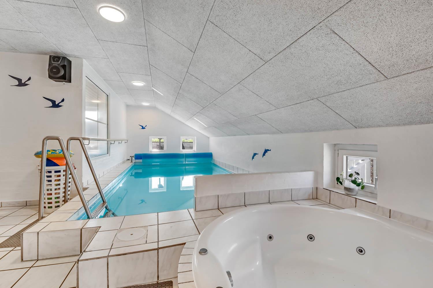 Meget hyggelig indrettet stue med komfortable møbler og brændeovn. Her er der fladskærms-TV med DR1 og TV2 samt en parabol, hvorfra der kan tages tyske programmer. Bryggers med vaskemaskine og tørretumbler. Meget veludstyret køkken bl.a. med opvaskemaskine, mikroovn, og køle/fryseskab. 4 gode soveværelser som indeholder 1DS + 1DS + 2S + 2S samt en hems med 2 sovemuligheder. Til de små gæster er der barneseng og barnestol. I poolrummet er der ud over selve poolen, som er med svømmetræner, et 4-5 personers spabad, herfra er der adgang til et badeværelse med toilet, håndvask, bruser og sauna. Huset badeværelse er med bruser, håndvask og toilet samt gulvvarme. 2 husdyr er tilladt. Huset har jordvarme og er efter efterisoleret med 400 mm - som gør det særdeles energivenligt. Depositum vintersæson kr. 3000 og sommersæson kr. 2200.