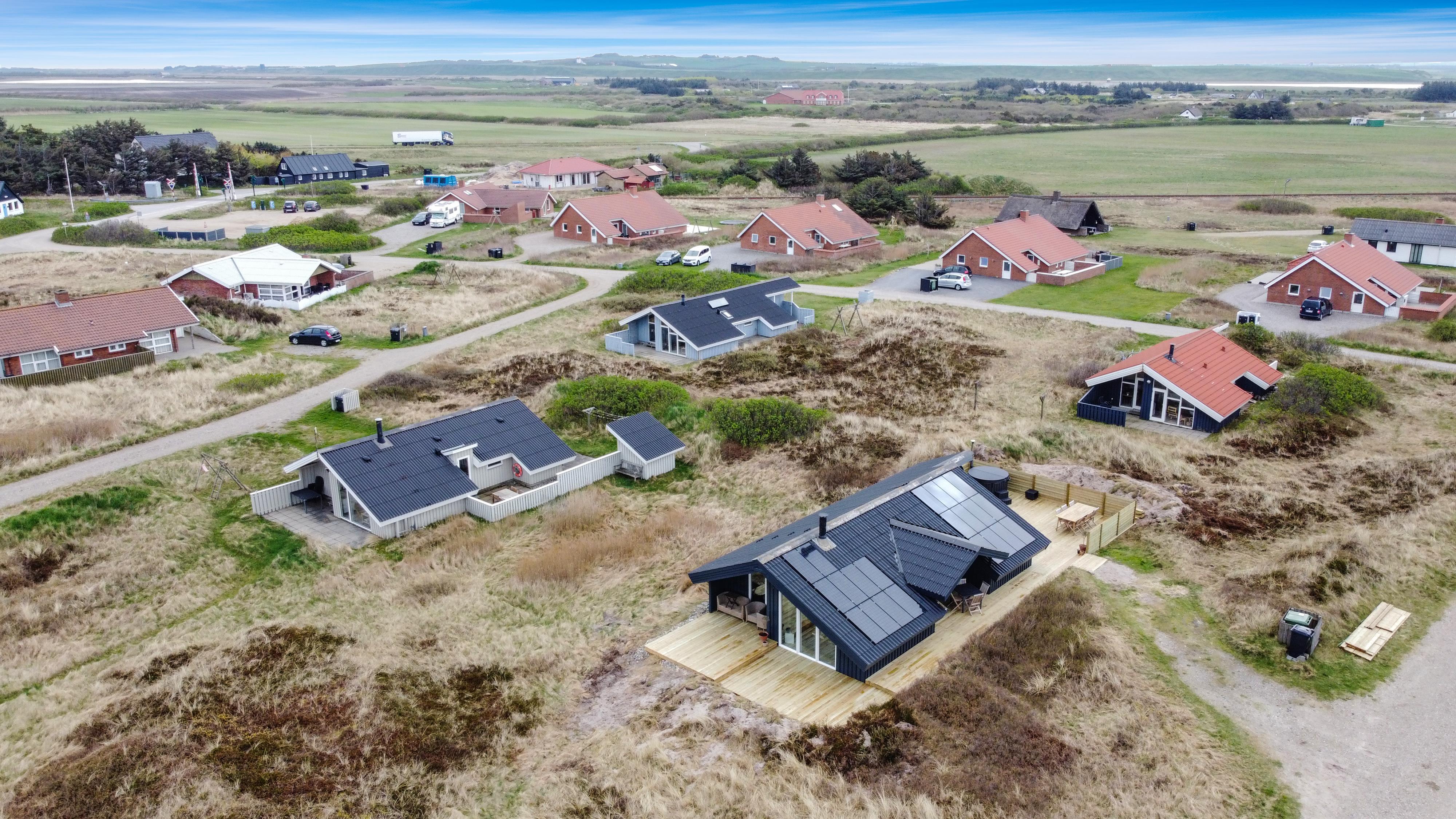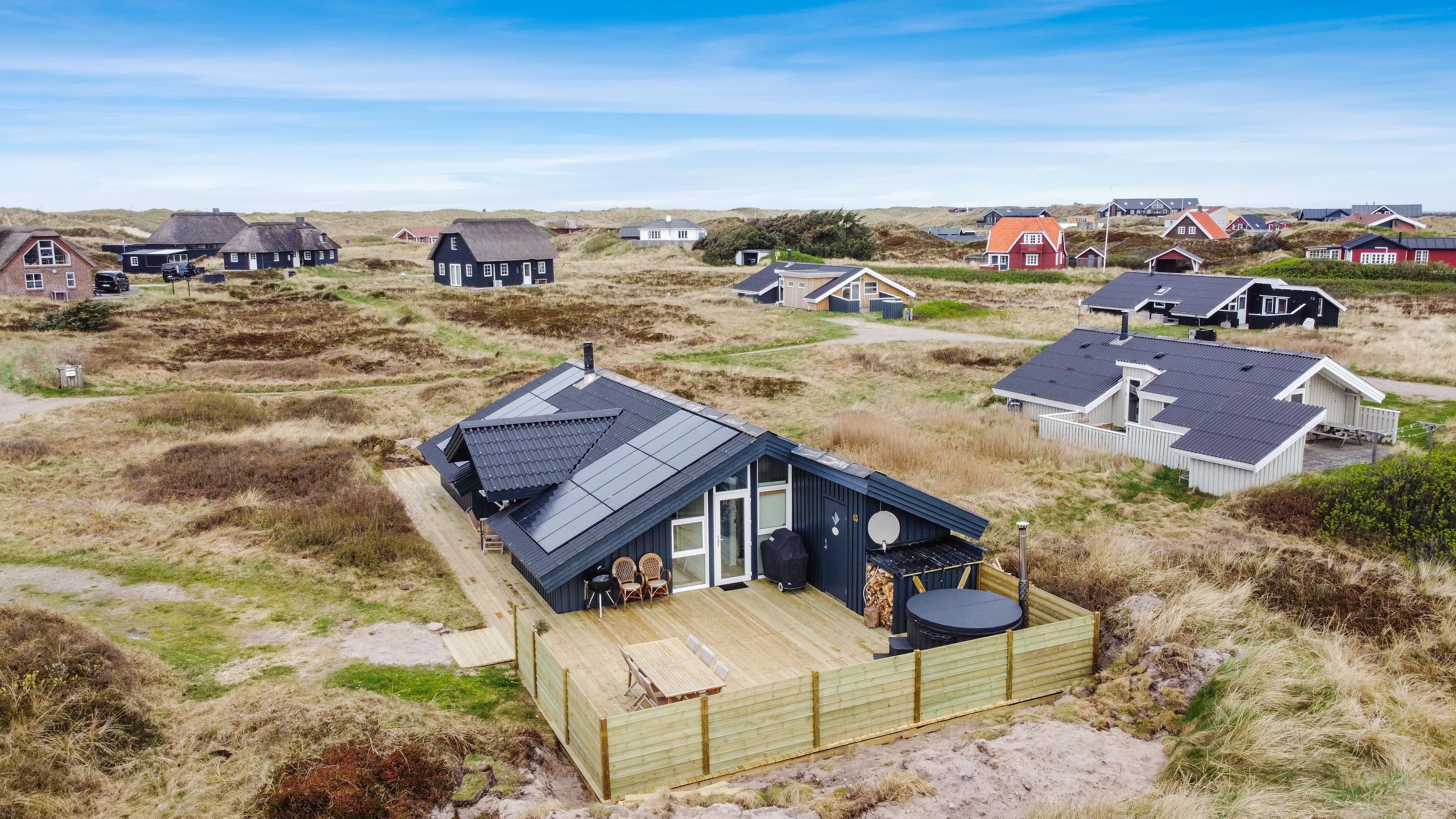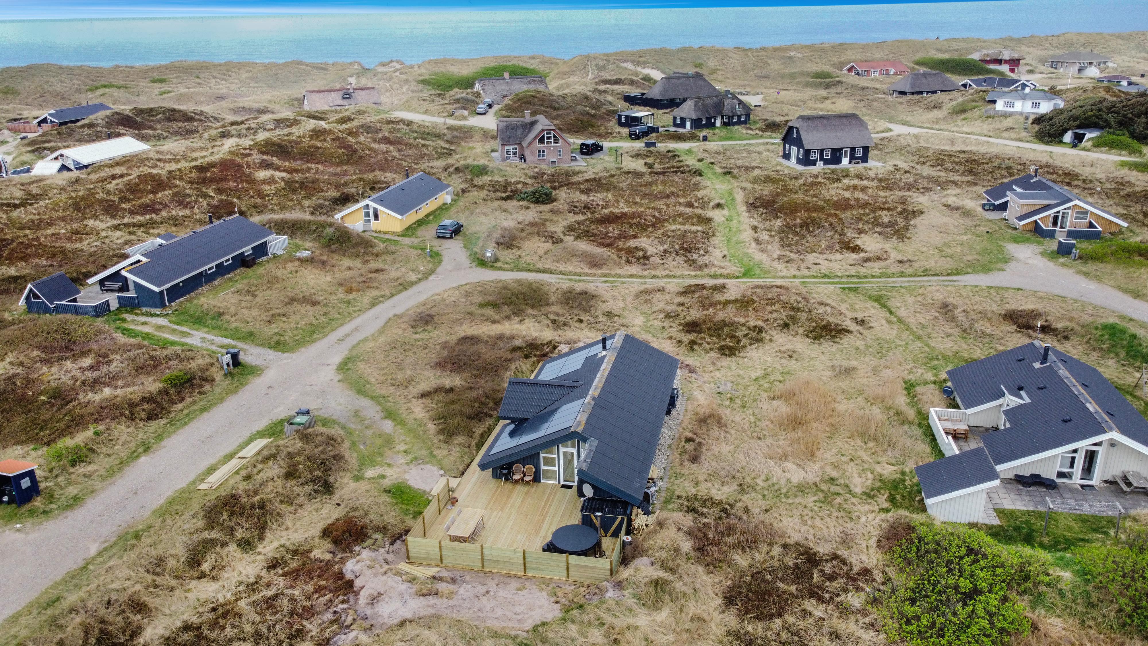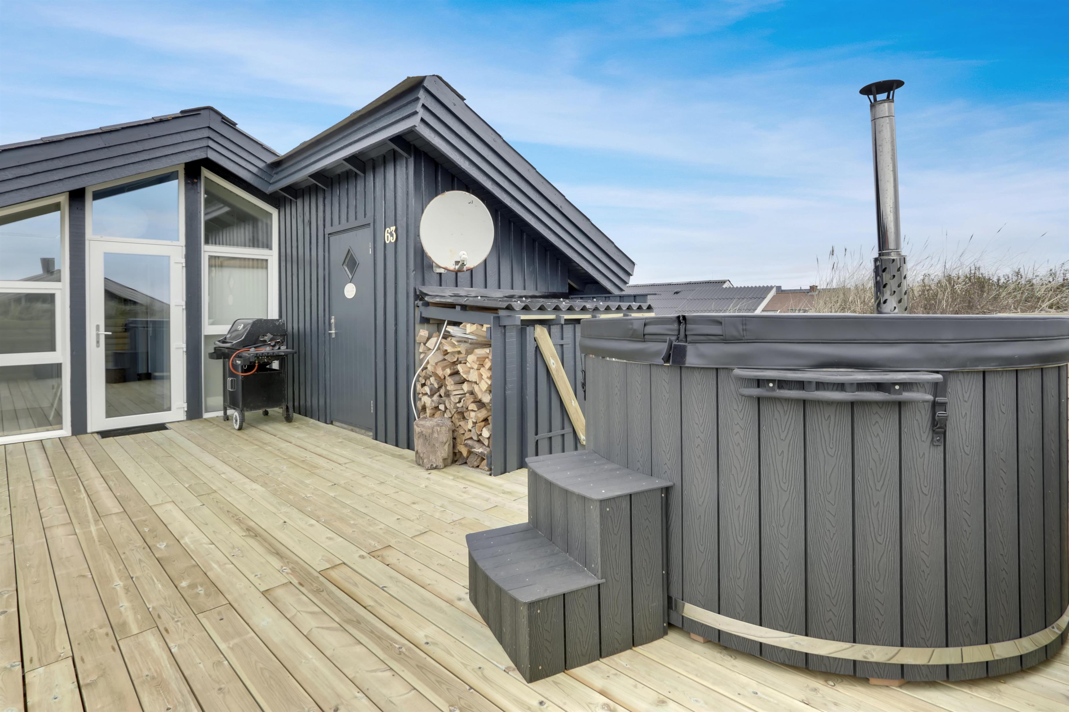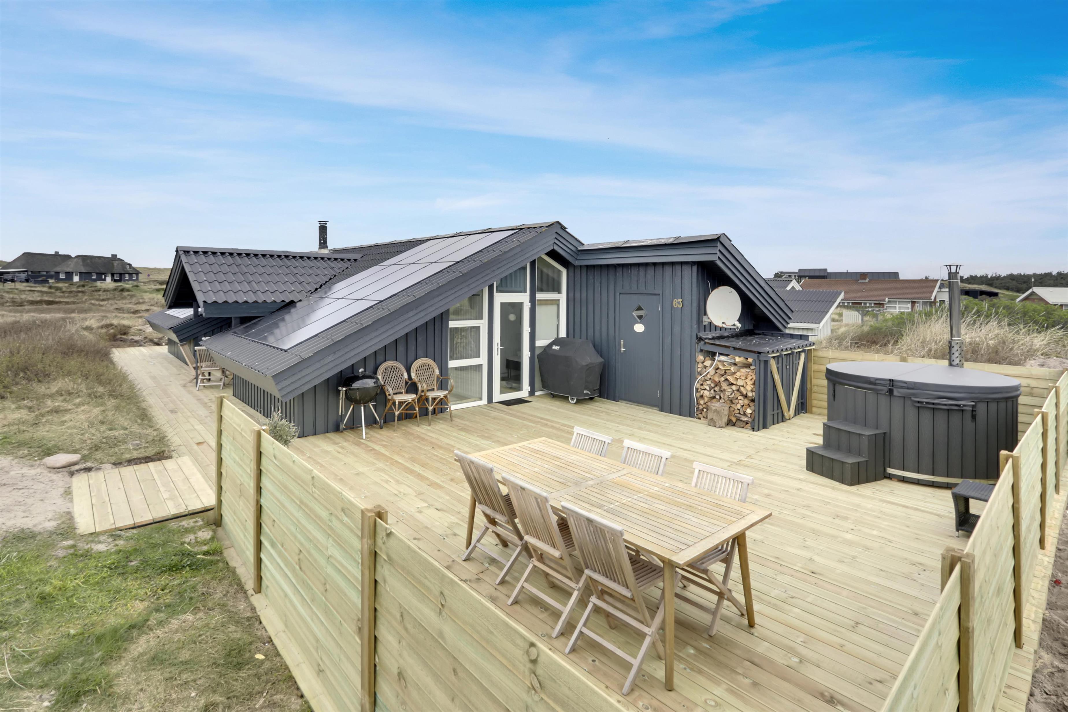 Huset ligger på en ca. 2.600 m2 stor klitgrund. På den store terrasse er der vildmarksbad som opvarmes med jeres medbragte brænde. Der er udgang til 3 dejlige terrasser som er forbundet med en dejlig flisebelagt gangsti, i 2025 er terrasserne blevet gjort størrer. Terrassen med udgang fra køkkent er delvis overdækket. Der er havemøbler og solvogne til rådighed samt en gasgrill. Fra terrasserne kan man høre havets brusen. Nyd en gåtur ved Vesterhavet. Find sten og rav eller sæt jer i klitterne og nyd solnedgangen over havet.