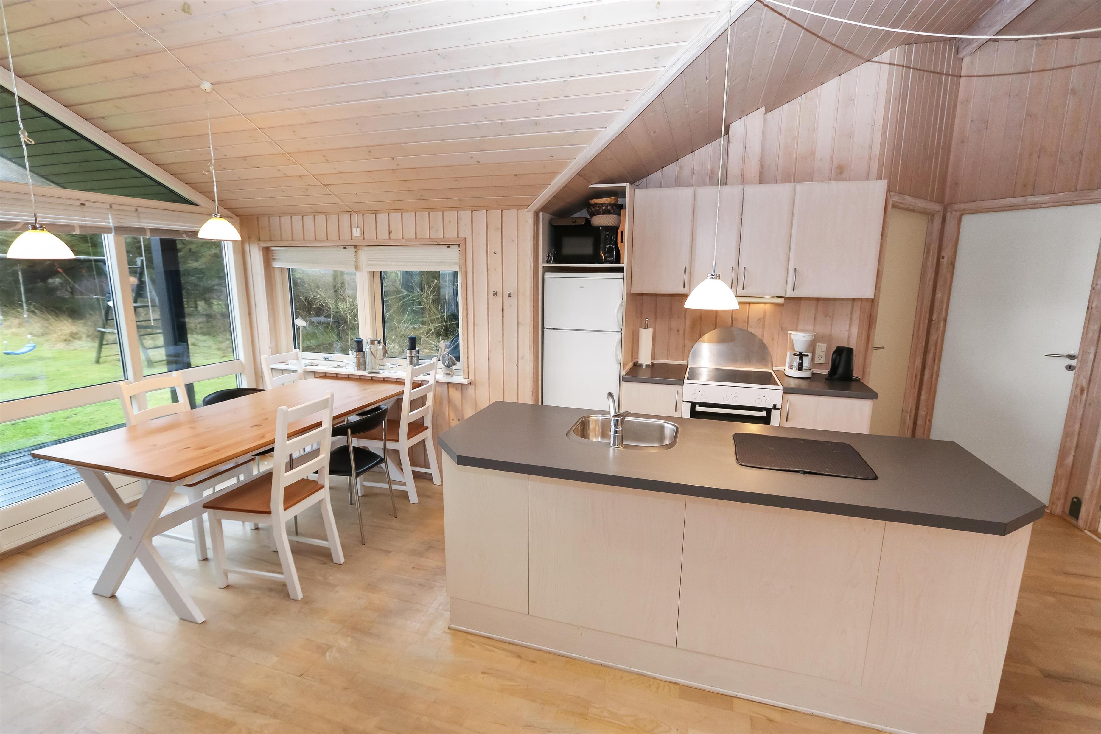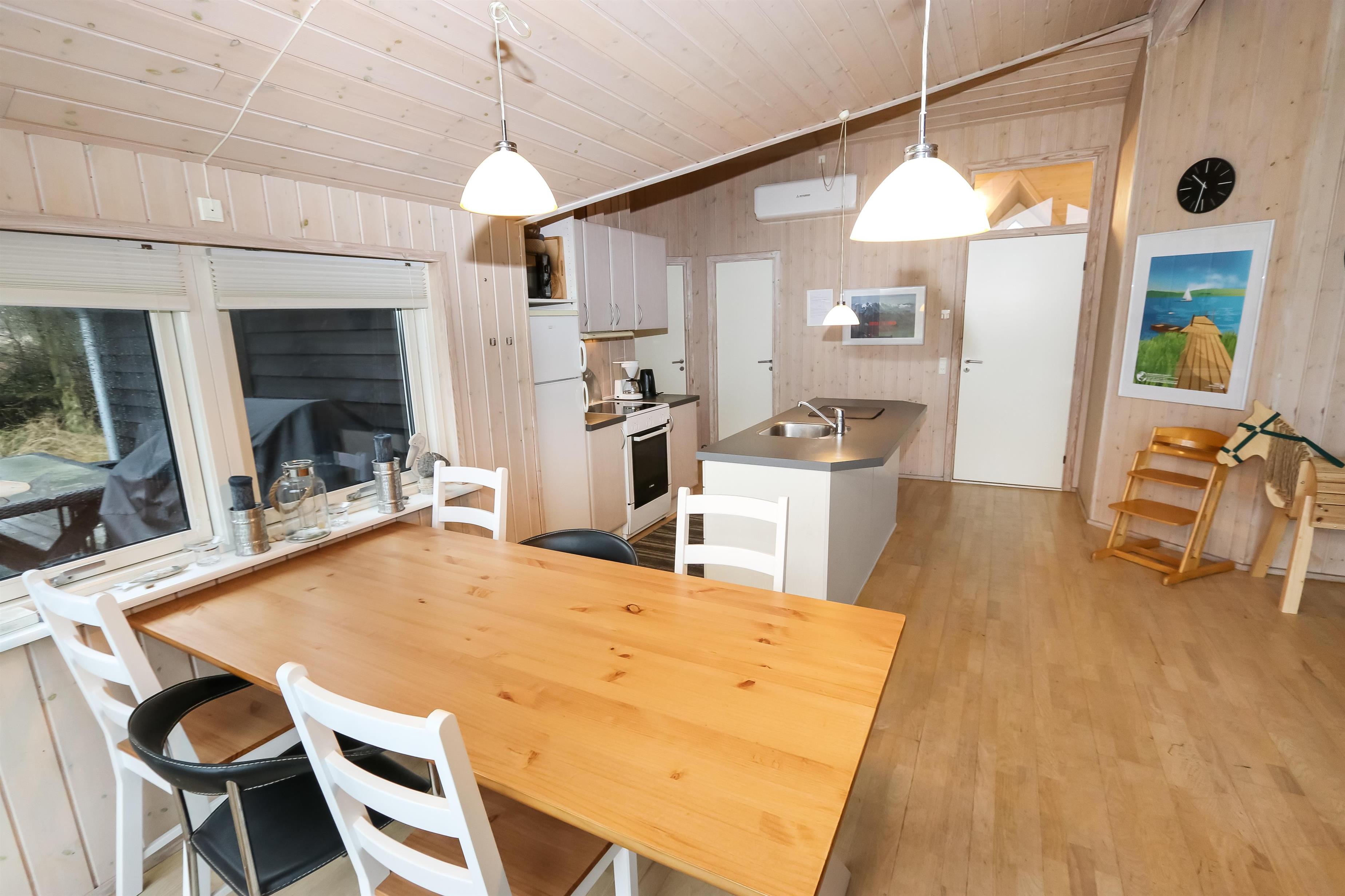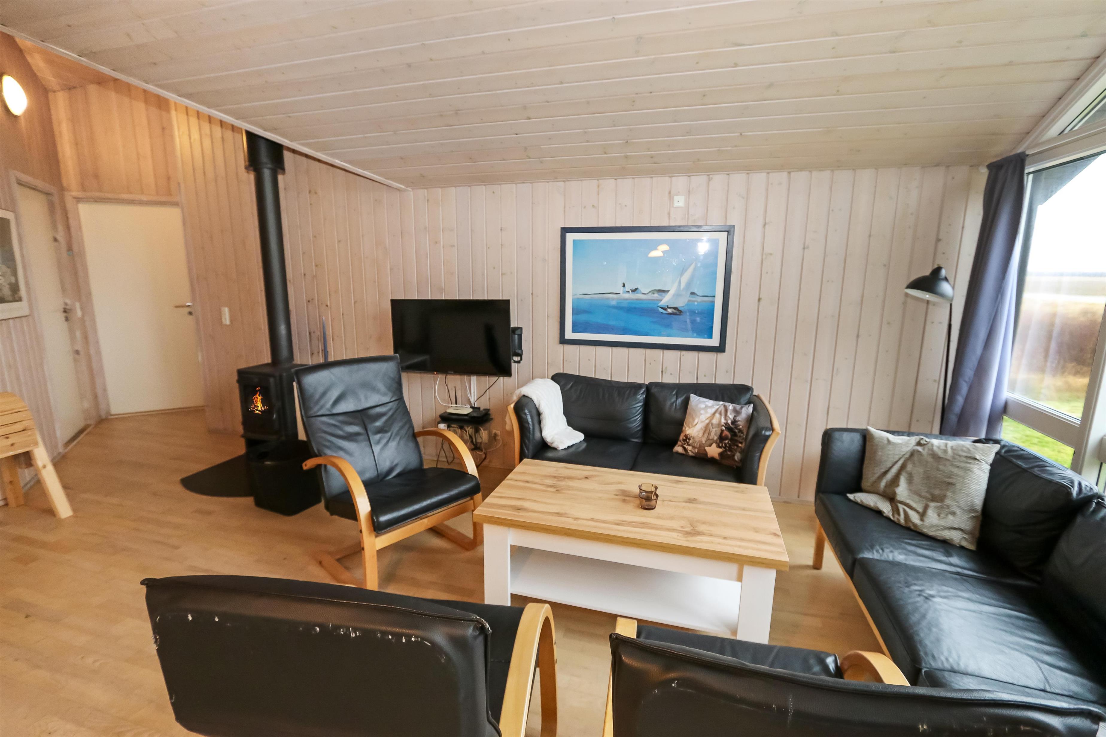 Huset er moderne indrettet og lofter og vægge er hvidlamineret træ. Trægulve med løse tæpper. I indgangen er der mulighed for at vaske og tørre tøj. Køkkenet som er kombineret med stuen er velindrettet og godt udstyret. Særdeles veludstyret m. glaskeramisk komfur, køle/fryseskab, opvaskemaskine og mikroovn og meget mere. Stuen er indrettet med pæne lædermøbler, TV med DR kanaler, parabol med tyske programmer, DVD og CD. Slap af foran den knitrende brændeovn, der sammen med varmepumpen sørger for en behagelig og billig opvarming. Der er gratis trådløst internet i huset. 2 badeværelser heraf et med spabad og direkte adgang til sauna, toilet, håndvask, bruser og gulvvarme. Det andet er kun med håndvask og toilet. 4 soveværelser: Dobbeltseng + Dobbeltseng + 2 senge + 2 senge. Husdyr tilladt. Huset bliver udlejet som hjemmekontor iflg aftale med ejer. Huset lejes ikke ud til ungdomsgrupper.