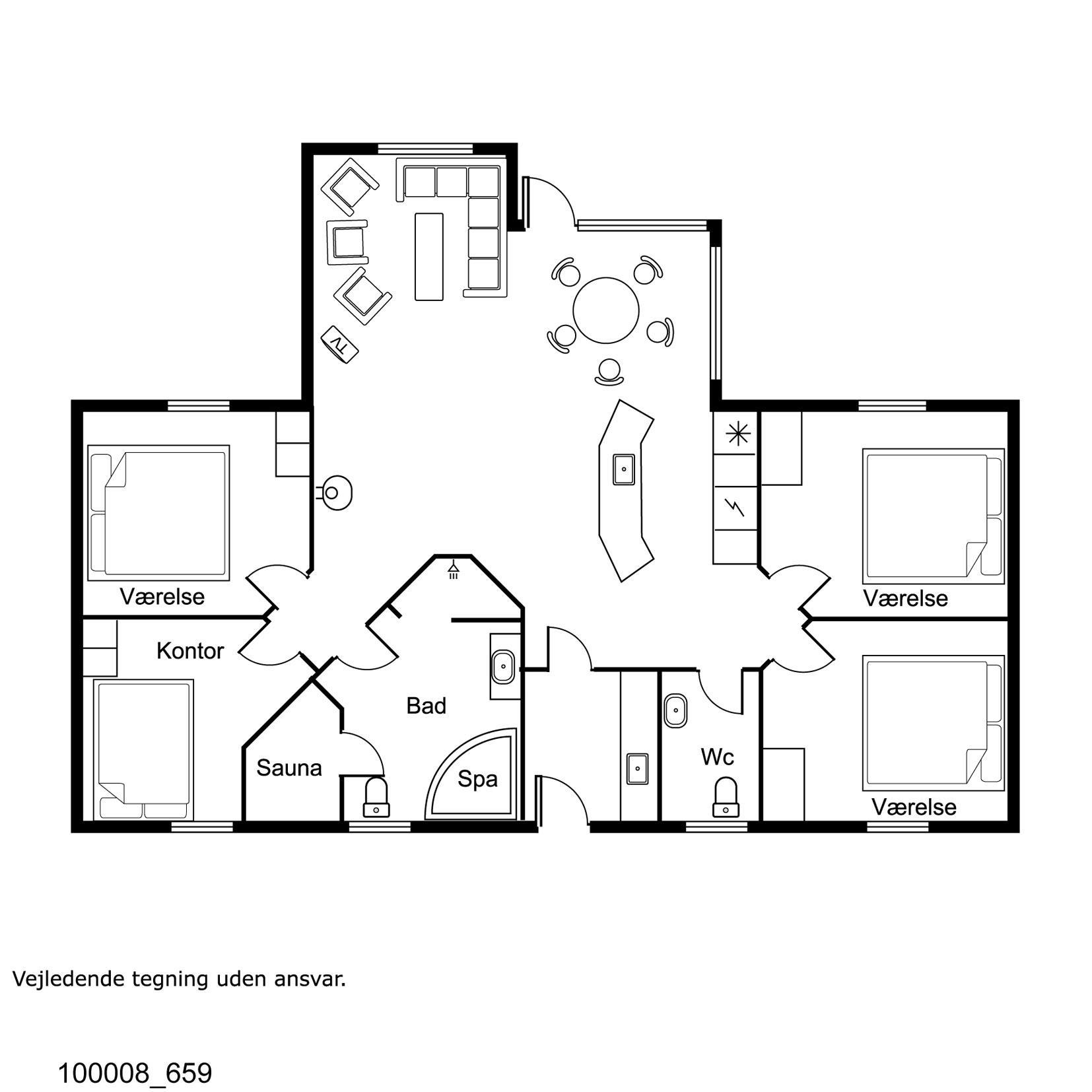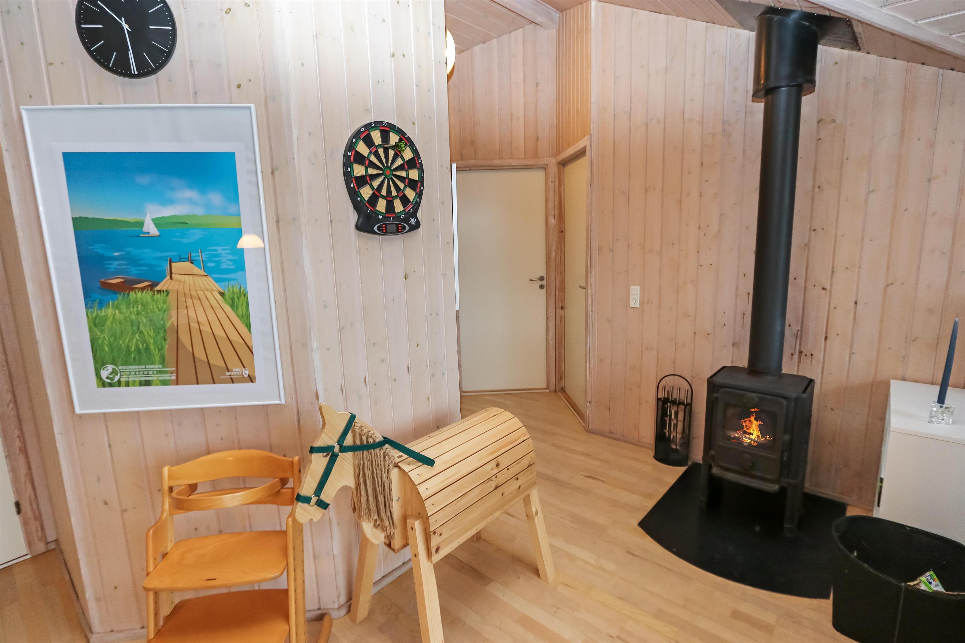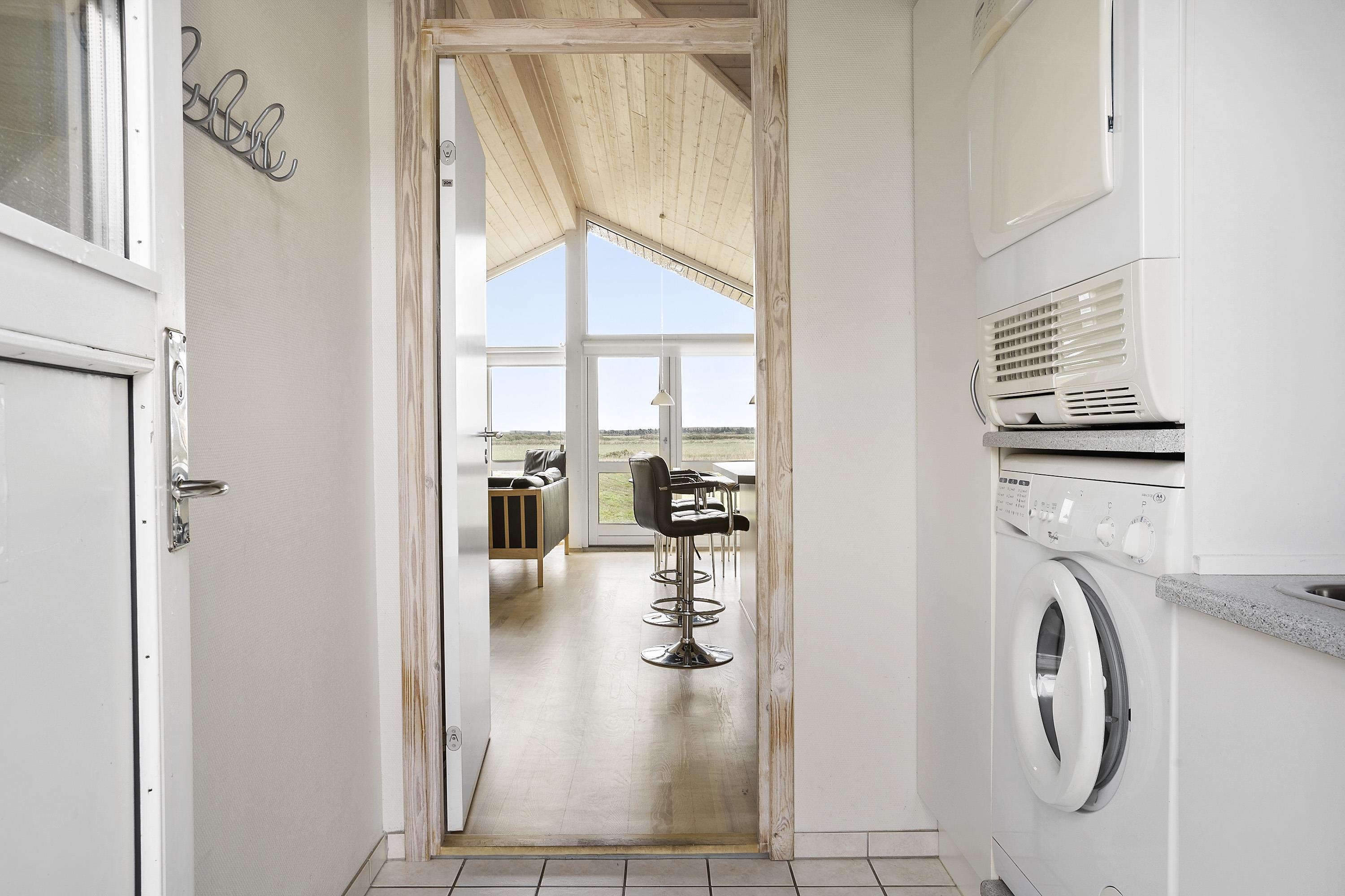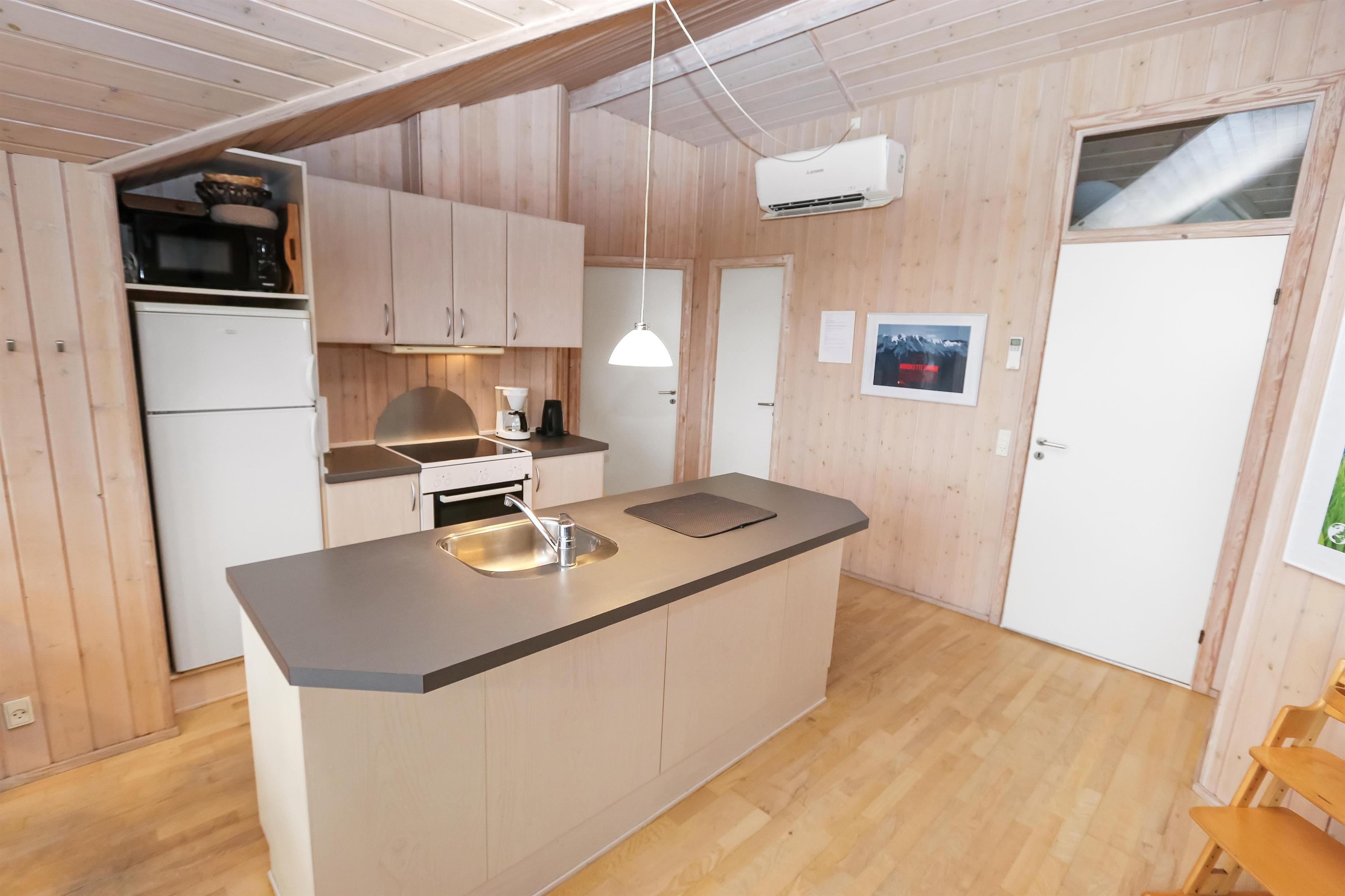 Huset er moderne indrettet og lofter og vægge er hvidlamineret træ. Trægulve med løse tæpper. I indgangen er der mulighed for at vaske og tørre tøj. Køkkenet som er kombineret med stuen er velindrettet og godt udstyret. Særdeles veludstyret m. glaskeramisk komfur, køle/fryseskab, opvaskemaskine og mikroovn og meget mere. Stuen er indrettet med pæne lædermøbler, TV med DR kanaler, parabol med tyske programmer, DVD og CD. Slap af foran den knitrende brændeovn, der sammen med varmepumpen sørger for en behagelig og billig opvarming. Der er gratis trådløst internet i huset. 2 badeværelser heraf et med spabad og direkte adgang til sauna, toilet, håndvask, bruser og gulvvarme. Det andet er kun med håndvask og toilet. 4 soveværelser: Dobbeltseng + Dobbeltseng + 2 senge + 2 senge. Husdyr tilladt. Huset bliver udlejet som hjemmekontor iflg aftale med ejer. Huset lejes ikke ud til ungdomsgrupper.