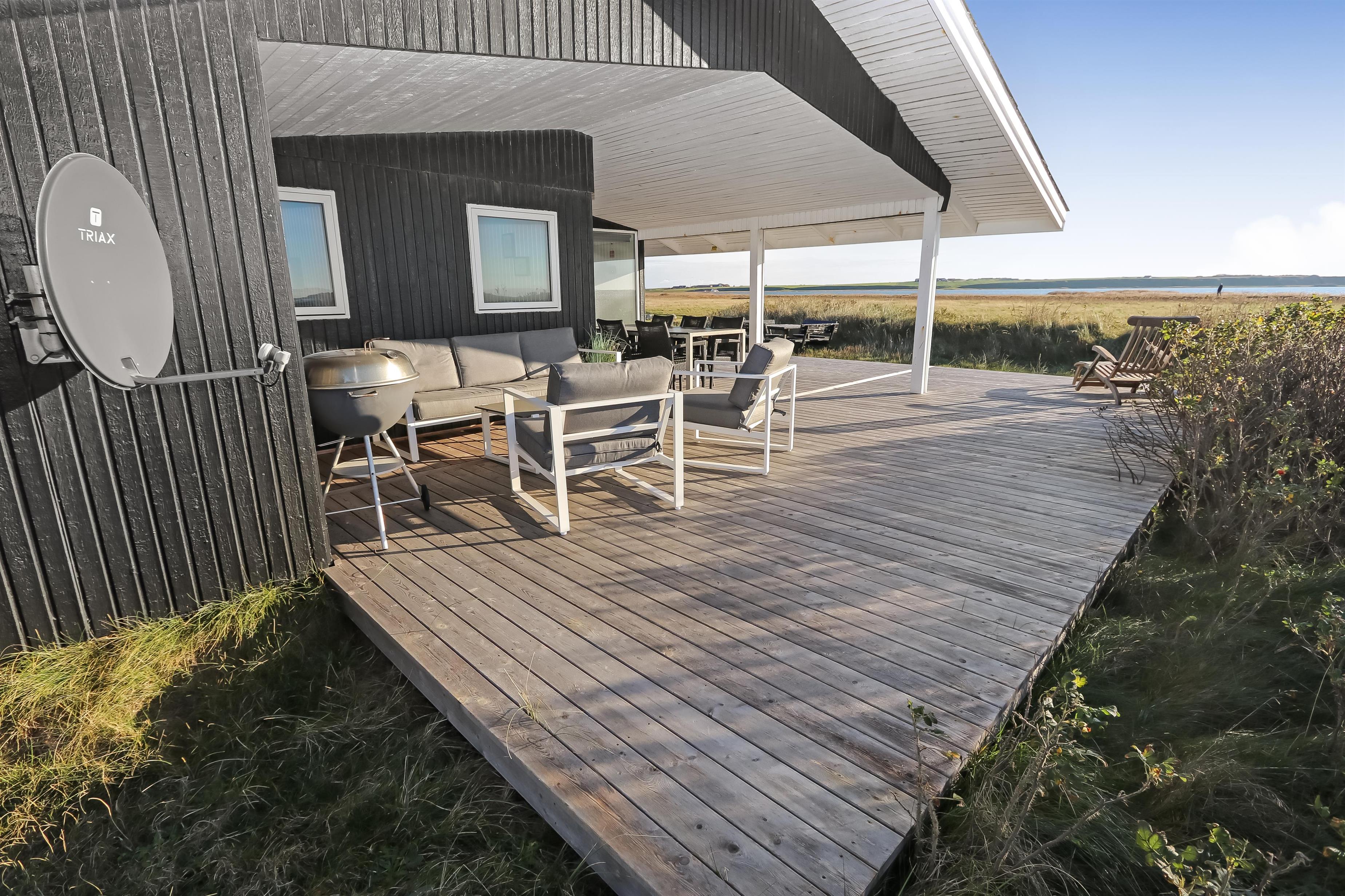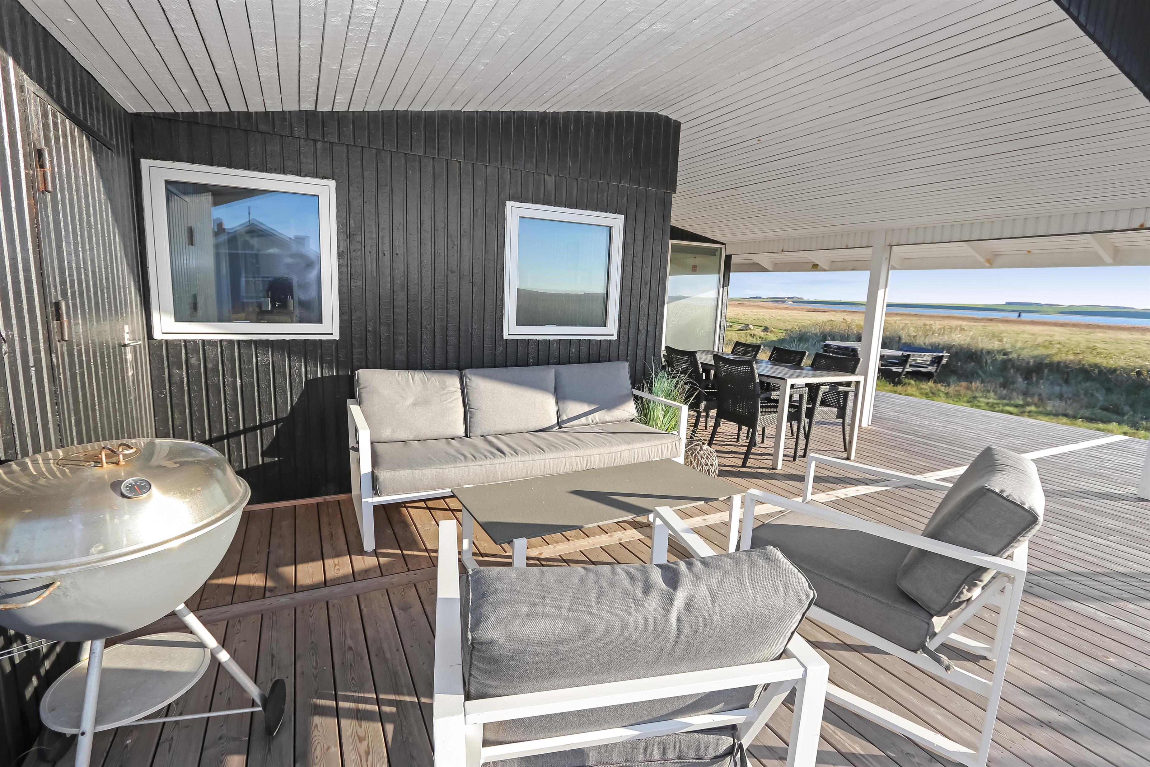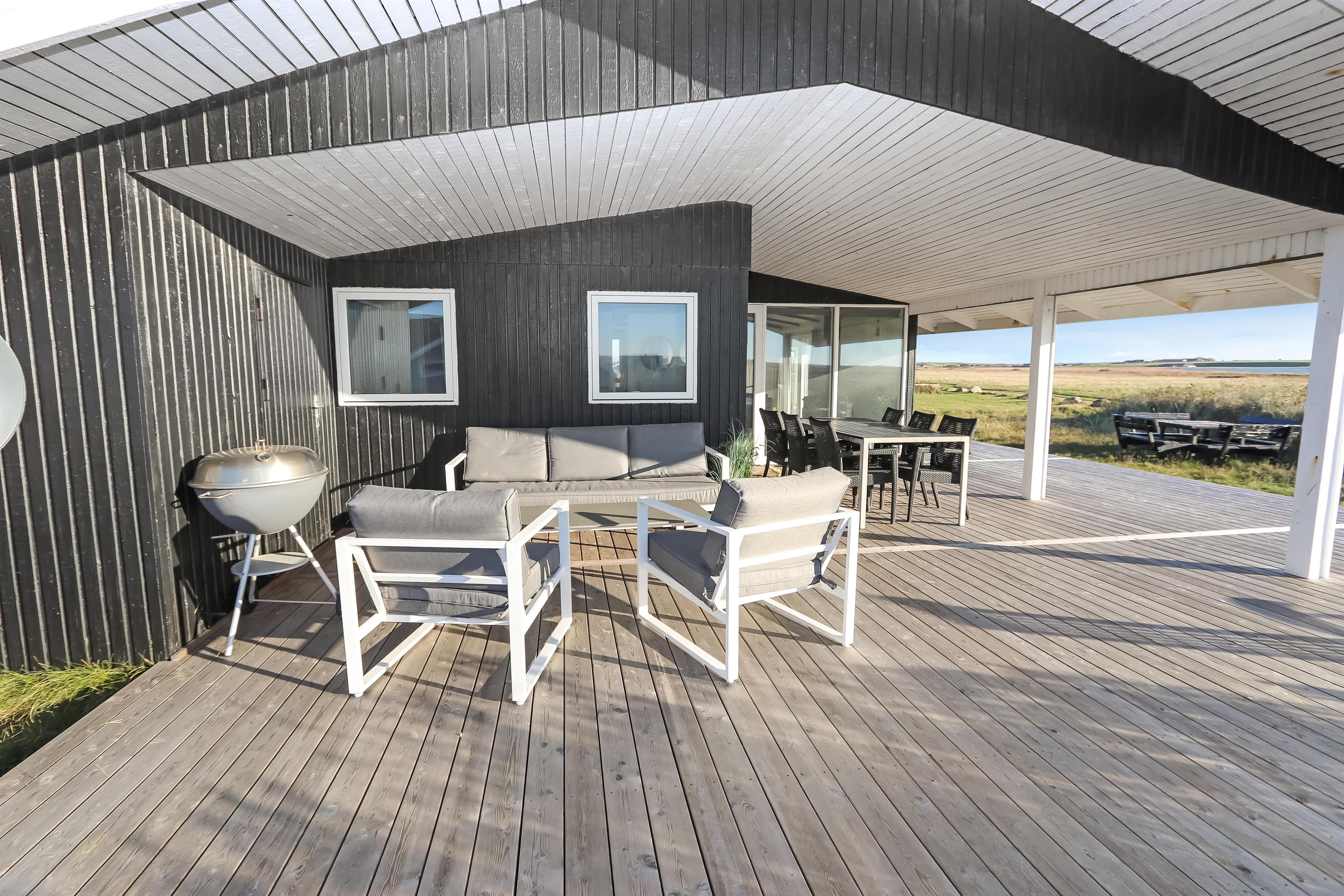 Huset har også en overdækket terrasse med havemøbler og en grill, der ligger op til hyggelige grillaftener, mens I nyder den fantastiske omkringliggende natur.
