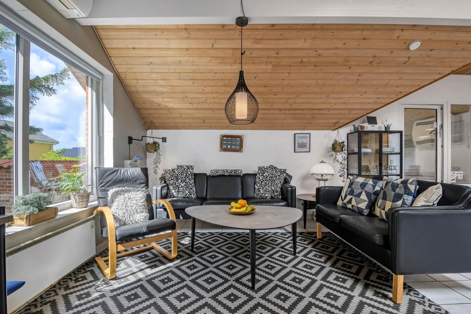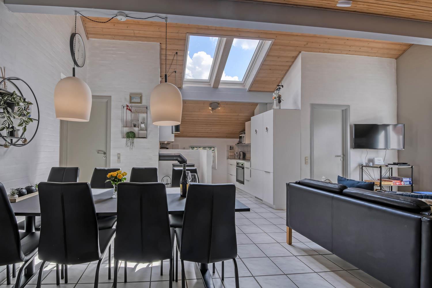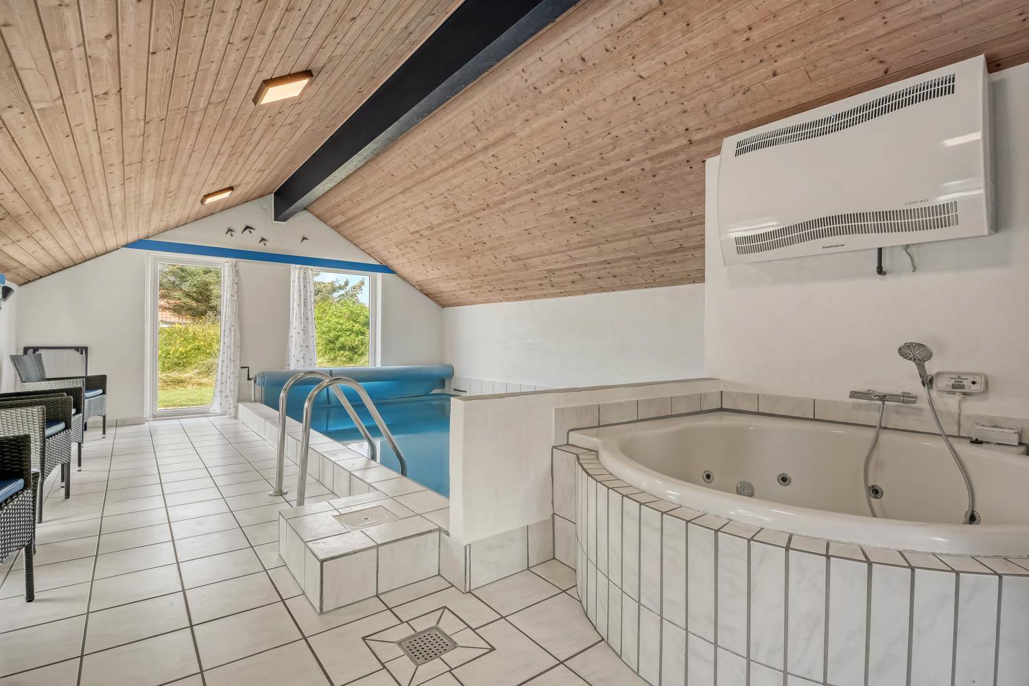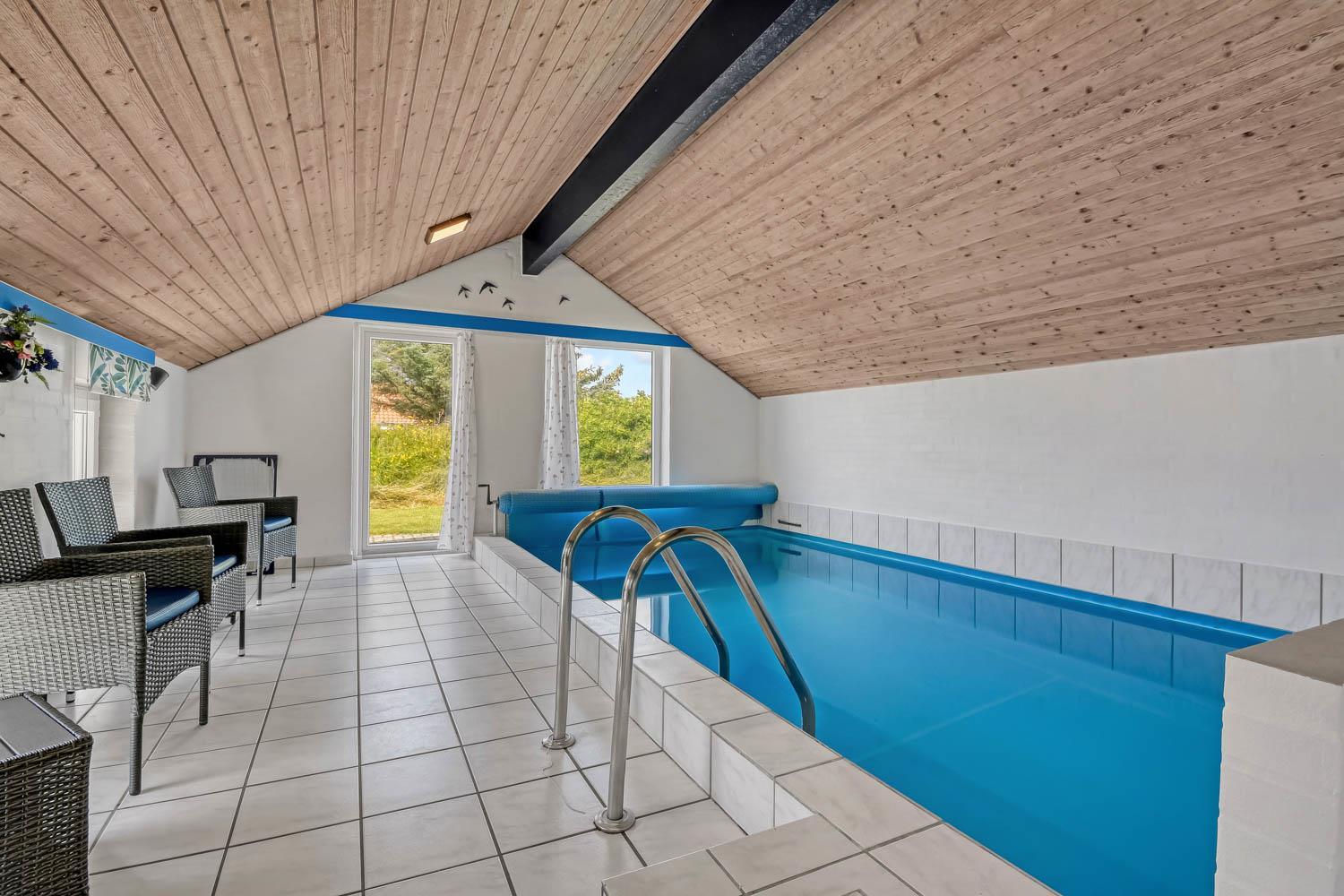 Huset er 153 m2 stort og har 4 dejlige soverum (1xdobbeltseng, 1xdobbeltseng, 2xenkeltsenge og 2xenkeltsenge). I hjertet af huset findes et veludstyret køkken/alrum hvor loftet går til kip og hvor de store vinduer bidrager til den hyggelige feriestemning. Her er alt i hårde hvidevarer; komfur med glaskeramiske kogeplader, emhætte, opvaskemaskine, mikroovn, køle-/fryseskab med fryseboks. Nyd maden ved spisebordet eller slap af i de behagelige sofamøbler. TV i stuen er med danske og tyske kanaler, DVD og CD afspiller. Skulle det blive for koldt, eller skal stemningen blusses op, sætter man blot gang i husets brændeovn, hvor flammerne og den intensive varme kan nydes og sammen med husets varmepumpe er de begge medvirkende til en god varme samt et lavere forbrug. Der er hvide klinkegulve i stue og køkkenområde med gulvvarme og der er gulvtæpper i soveværelserne. Husets wellness pool-afdeling rummer udover poolen et ekstra TV, spabad og en sauna og huset har hele 2 badeværelser, med toilet, bruser, håndvask samt gulvvarme. Vaskemaskine og tørretumbler er en selvfølge og er placeret i husets entré. Der er udgang til husets store indhegnede terrasse. På terrassen er der havemøbler, parasol. Huset er et ”ikke ryger hus”. Max. 2 husdyr er tilladt. Der er installeret varmepumpe i huset, hvilket betyder at du som gæst kan spare en del på din elvarmeregning - varmepumpen leverer op til 4 gange så meget effekt, som den bruger. I udhuset er der en ekstra 100 l fryser. Huset lejes ikke ud til ungdomsgrupper. Har man el-bil eller en Plug-In hybrid, så er der mulighed for opladning gennem opsat ladeboks på gavlen i den nordlige ende af huset. Til de mindste gæster er der en højstol. Depositum vintersæson kr. 4.500 og sommersæson kr. 2.500. Obligatorisk slutrengøring.