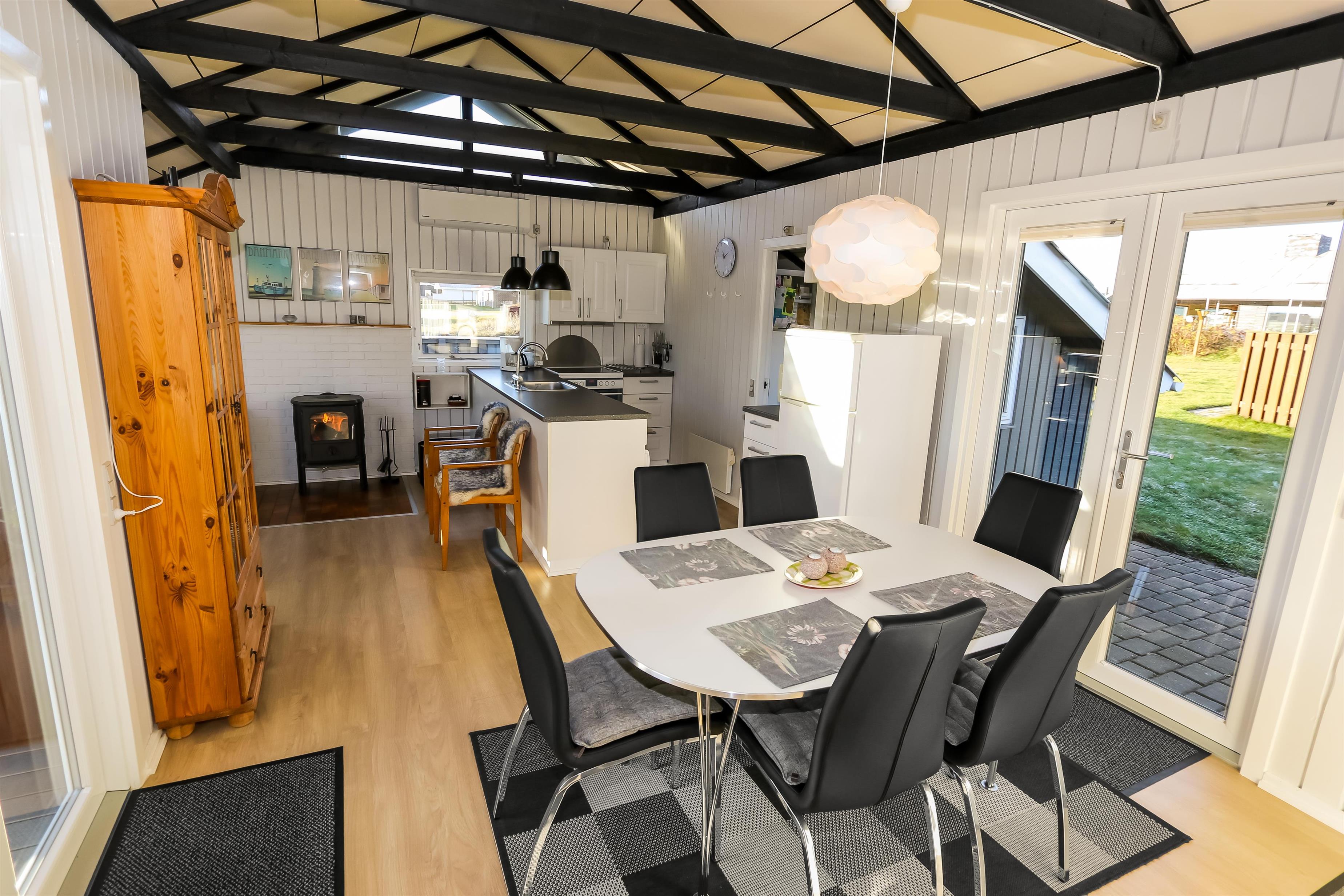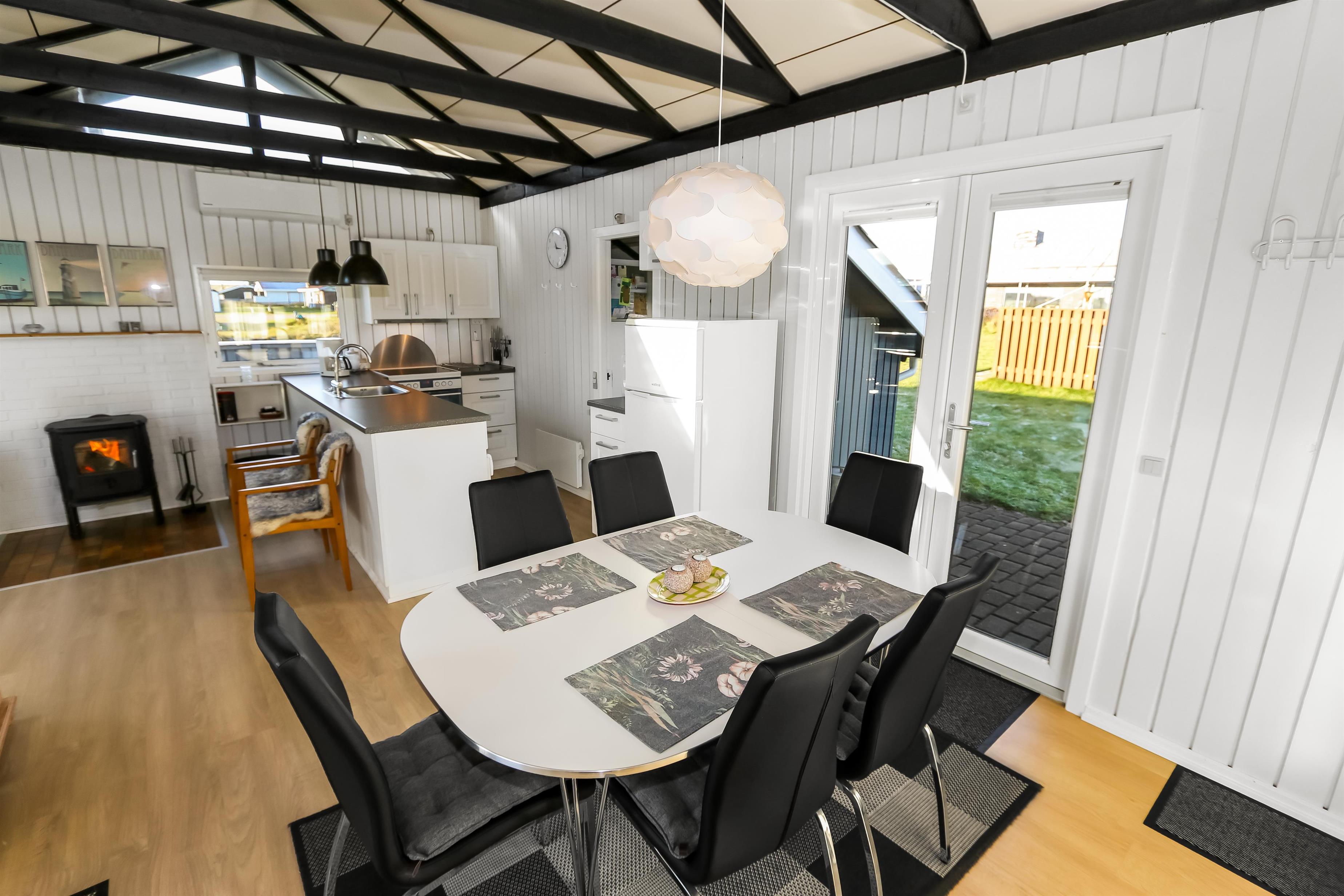 Udgang fra opholdsstuen til en dejlig indhegnet træterrasse med havemøbler, grill og liggestole. En fantastisk terrasse som er perfekt til familien som har børn og hund. Sid på terrassen og nyd udsigten når solen går ned bag de høje klitter og flyt havemøblerne og nyd solen hele dagen fra morgen til aften. Kun ca. 275m fra huset ligger det brusende Vesterhav som hver dag byder på nye maleriske oplevelse og i har kig til Ferring sø. Der er massere af muligheder for en god gå, løbe eller cykeltur og i sæsonen kan du hente morgenbrød, købmandsvarer eller måske invitere familien ud at spise kun ca. 5-10 min på gåben fra huset. Perfekt til den lille familie som ønsker central beliggenhed i dejlige rammer hele året rundt.