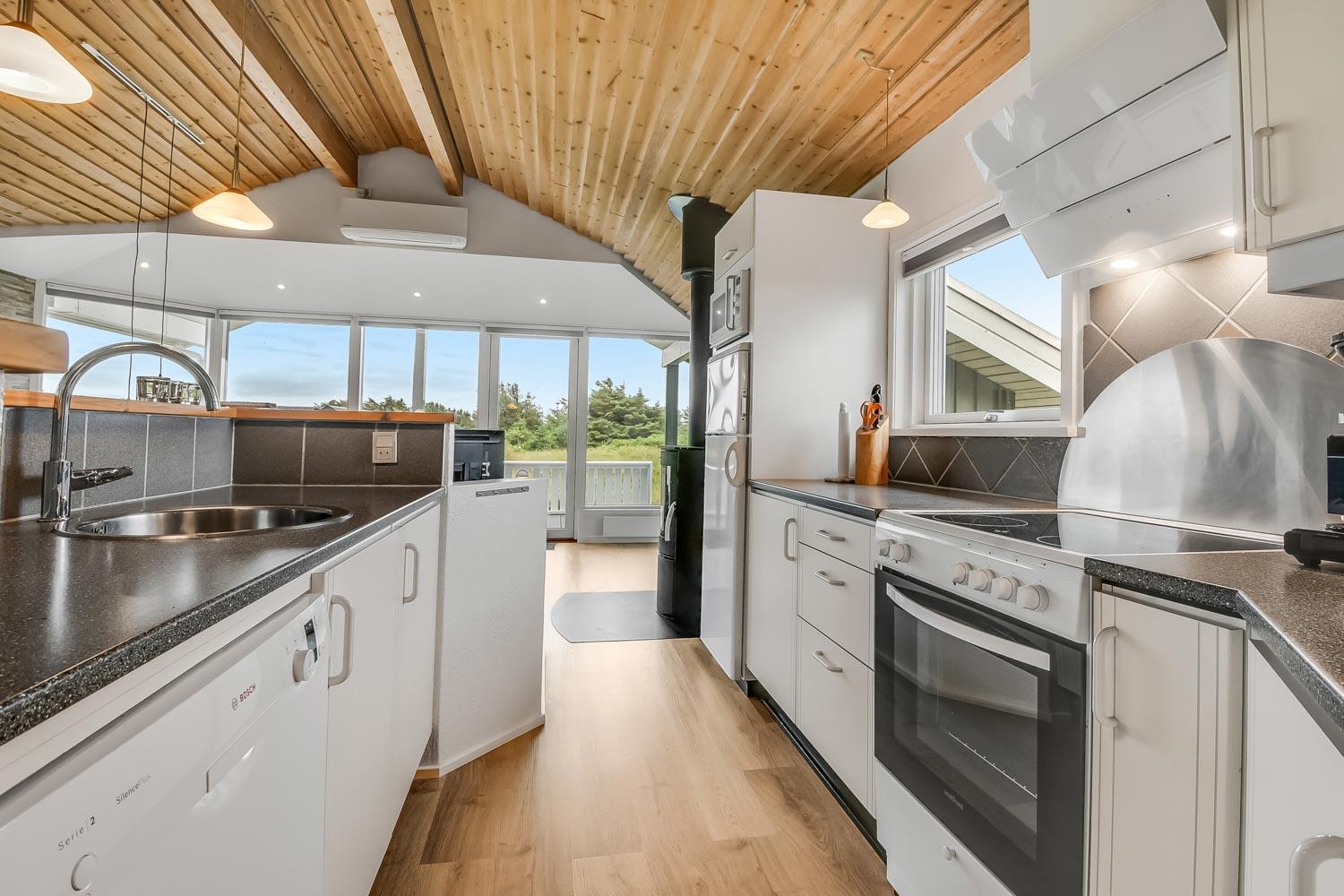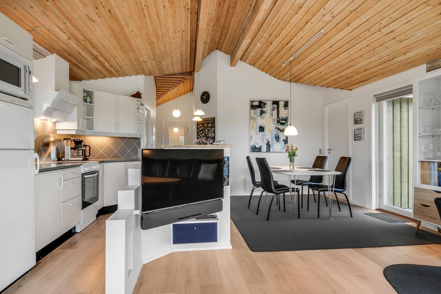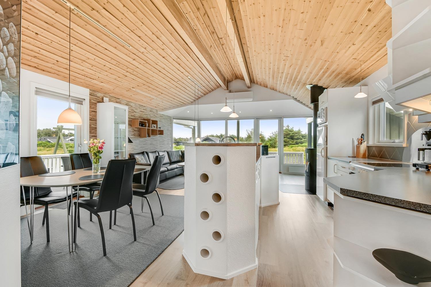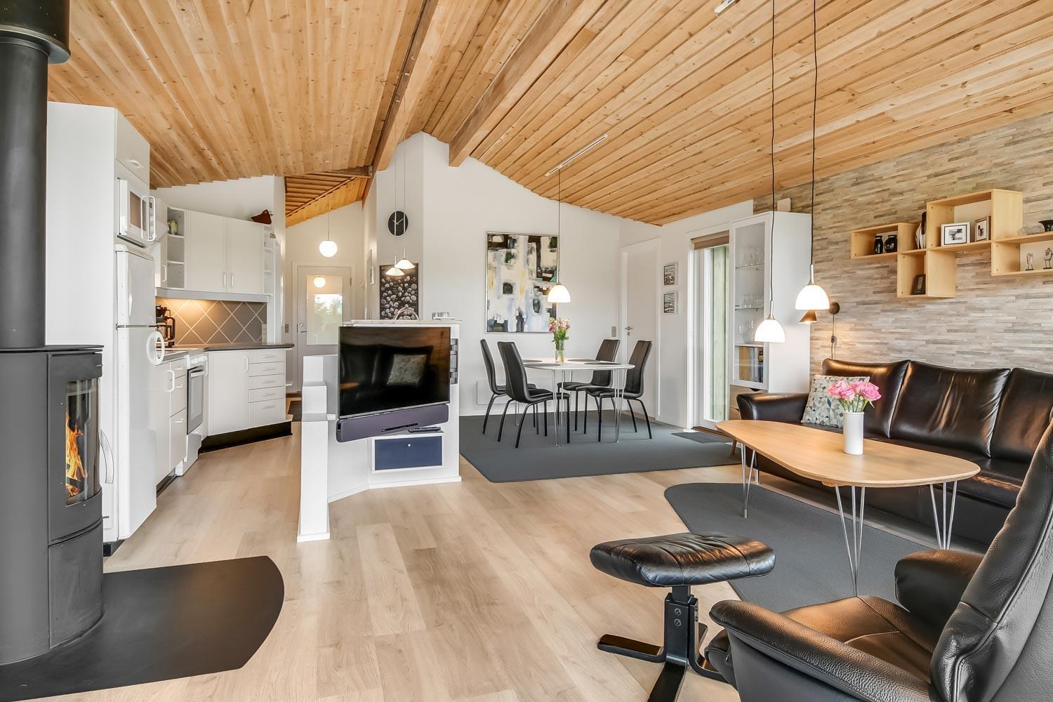 Dette meget smagfuldt og velholdte feriehus i træ er på 100 m2. Huset er indrettet med 3 dejlige værelser 1DS + 1DS + 2S og dertil kommer 2 ligge- muligheder i stuen (i en alkove). Stuen og køkken er kombineret og de store vinduespartier giver et godt lysindfald i hele rummet, der er trægulv i stueafdelingen og klinker i køkkenafdelingen. Stuen er indrettet med lædermøbler og spisebord som står tæt på køkkenet. Der er TV med parabol (kun tyske programmer) og danske programmer og der er ligeledes mulighed for at streame jeres egne TV eller radioprogrammer. Flot og meget veludstyret køkken med glaskeramisk komfur, kele-/fryseskab, opvaskemaskine og mikroovn. Meget flot badeværelse som er med toilet, håndvask, bruser, spa og indgang til sauna samt gulvvarme. Der er også et gæstetoilet med toilet og håndvask, her står også husets vaskemaskine og tørretumbler. I stuen er der også en skøn brændeovn som sammen med varmepumpen giver en behagelig varme også i de kolde perioder. Husdyr er ikke tilladt og rygning er ikke tilladt. Har man el-bil eller en Plug-In hybrid, så er der opsat ladeboks ved huset.