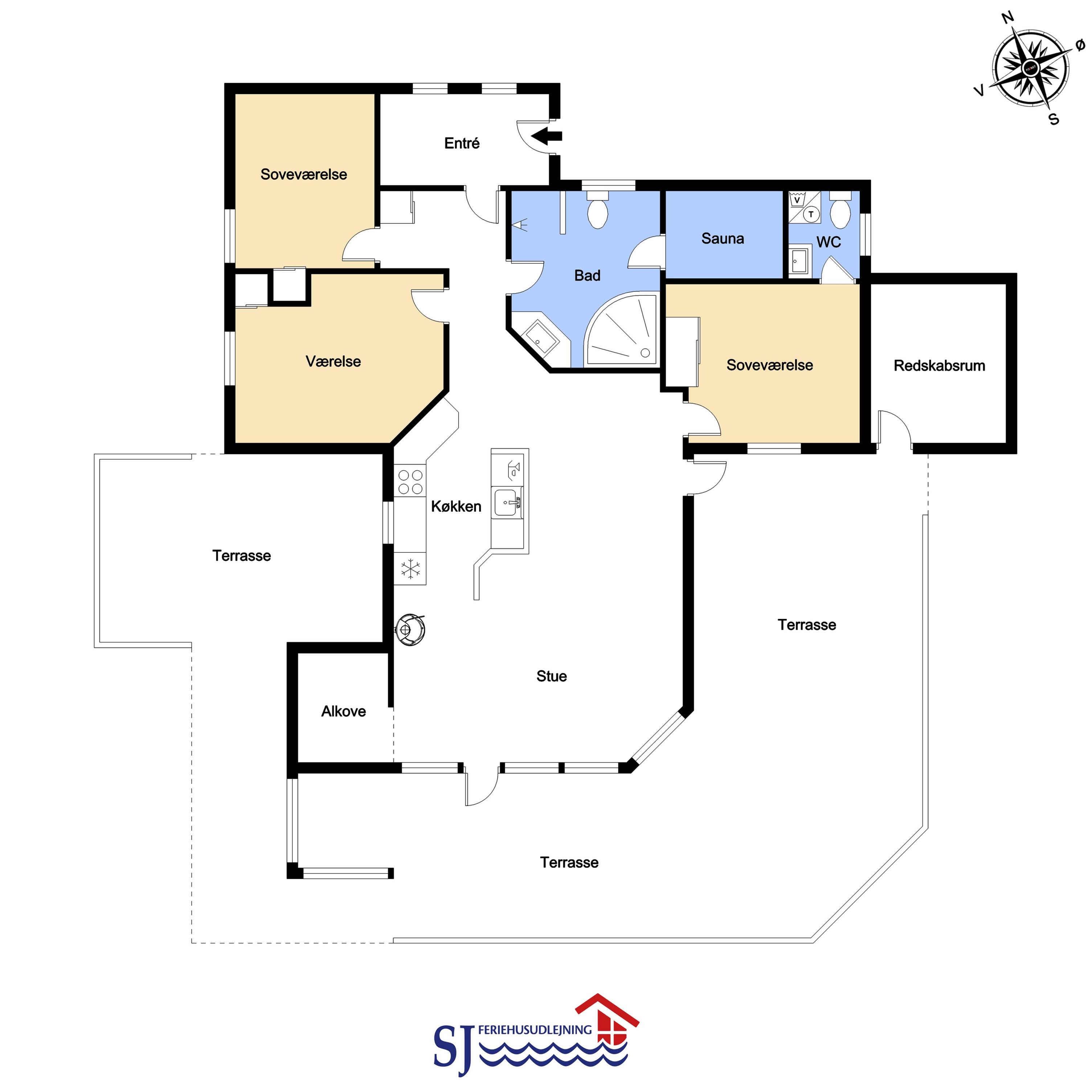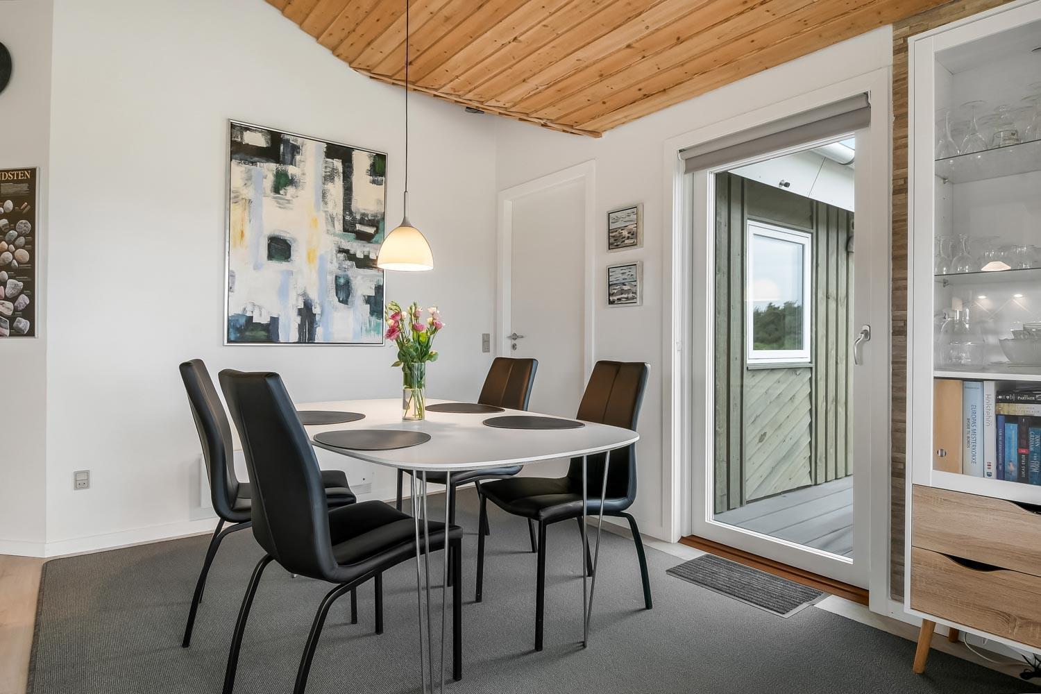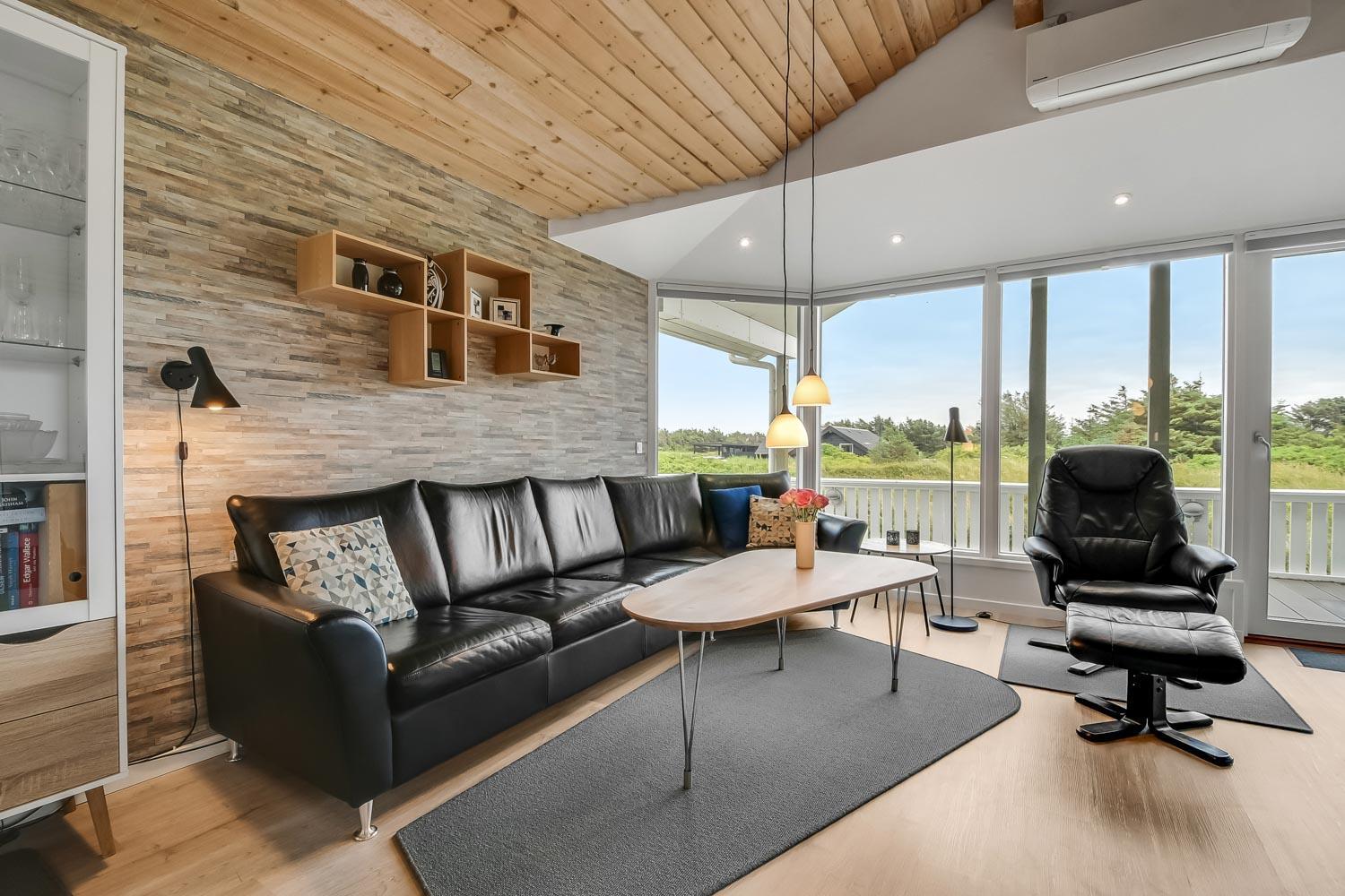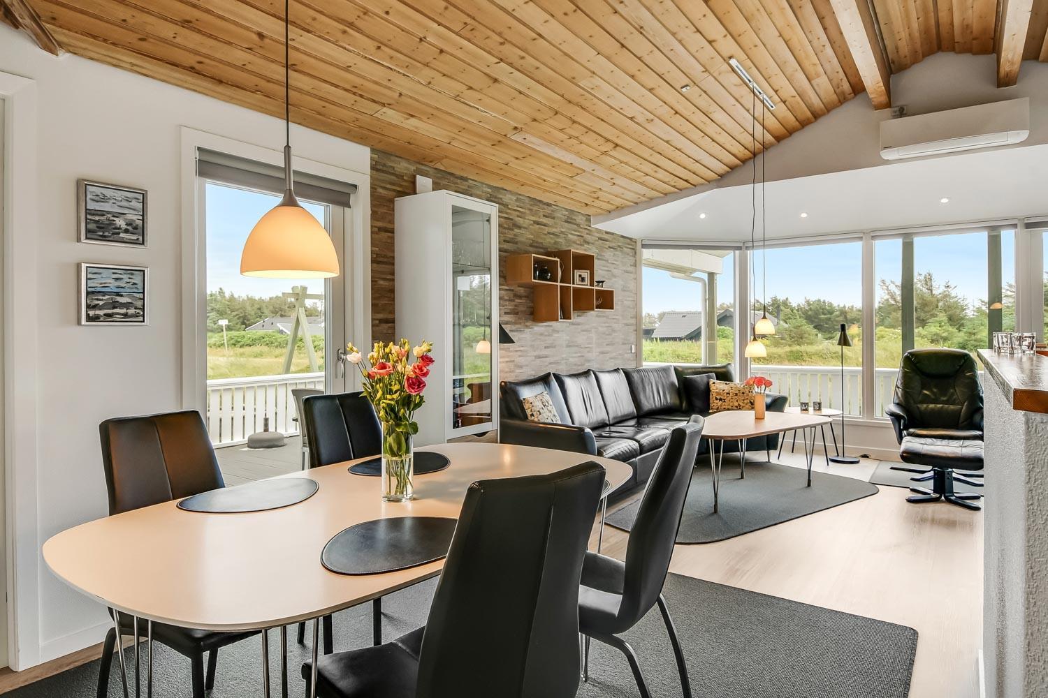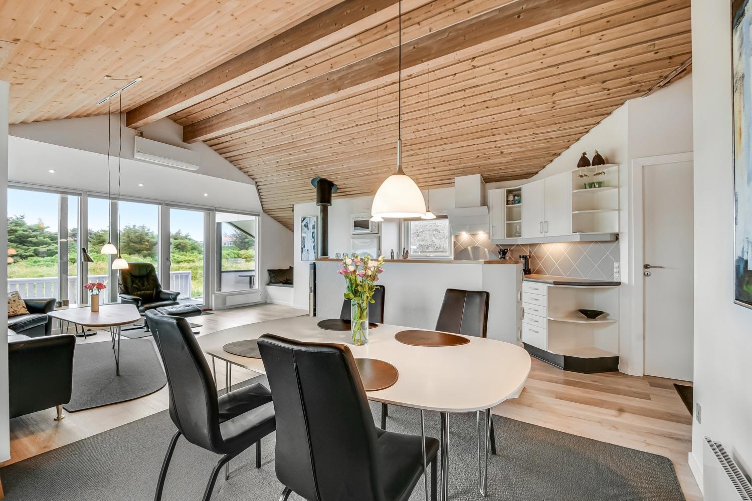 Dette meget smagfuldt og velholdte feriehus i træ er på 100 m2. Huset er indrettet med 3 dejlige værelser 1DS + 1DS + 2S og dertil kommer 2 ligge- muligheder i stuen (i en alkove). Stuen og køkken er kombineret og de store vinduespartier giver et godt lysindfald i hele rummet, der er trægulv i stueafdelingen og klinker i køkkenafdelingen. Stuen er indrettet med lædermøbler og spisebord som står tæt på køkkenet. Der er TV med parabol (kun tyske programmer) og danske programmer og der er ligeledes mulighed for at streame jeres egne TV eller radioprogrammer. Flot og meget veludstyret køkken med glaskeramisk komfur, kele-/fryseskab, opvaskemaskine og mikroovn. Meget flot badeværelse som er med toilet, håndvask, bruser, spa og indgang til sauna samt gulvvarme. Der er også et gæstetoilet med toilet og håndvask, her står også husets vaskemaskine og tørretumbler. I stuen er der også en skøn brændeovn som sammen med varmepumpen giver en behagelig varme også i de kolde perioder. Husdyr er ikke tilladt og rygning er ikke tilladt. Har man el-bil eller en Plug-In hybrid, så er der opsat ladeboks ved huset.