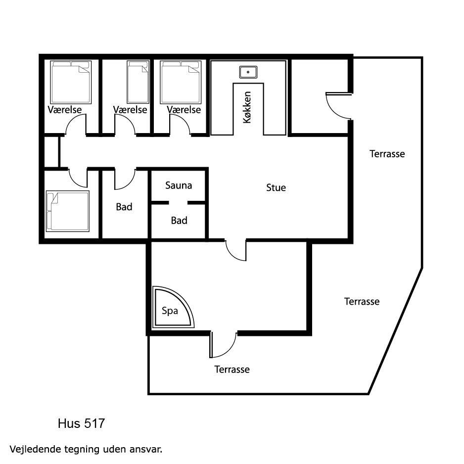 Huset er indrettet med fire gode soverum (DS) (DS) (2S) (1S). I begge soveværelser med dobbeltseng er der tv. Til børnene er der højstol. Rygning er ikke tilladt. 2 husdyr er tilladt.