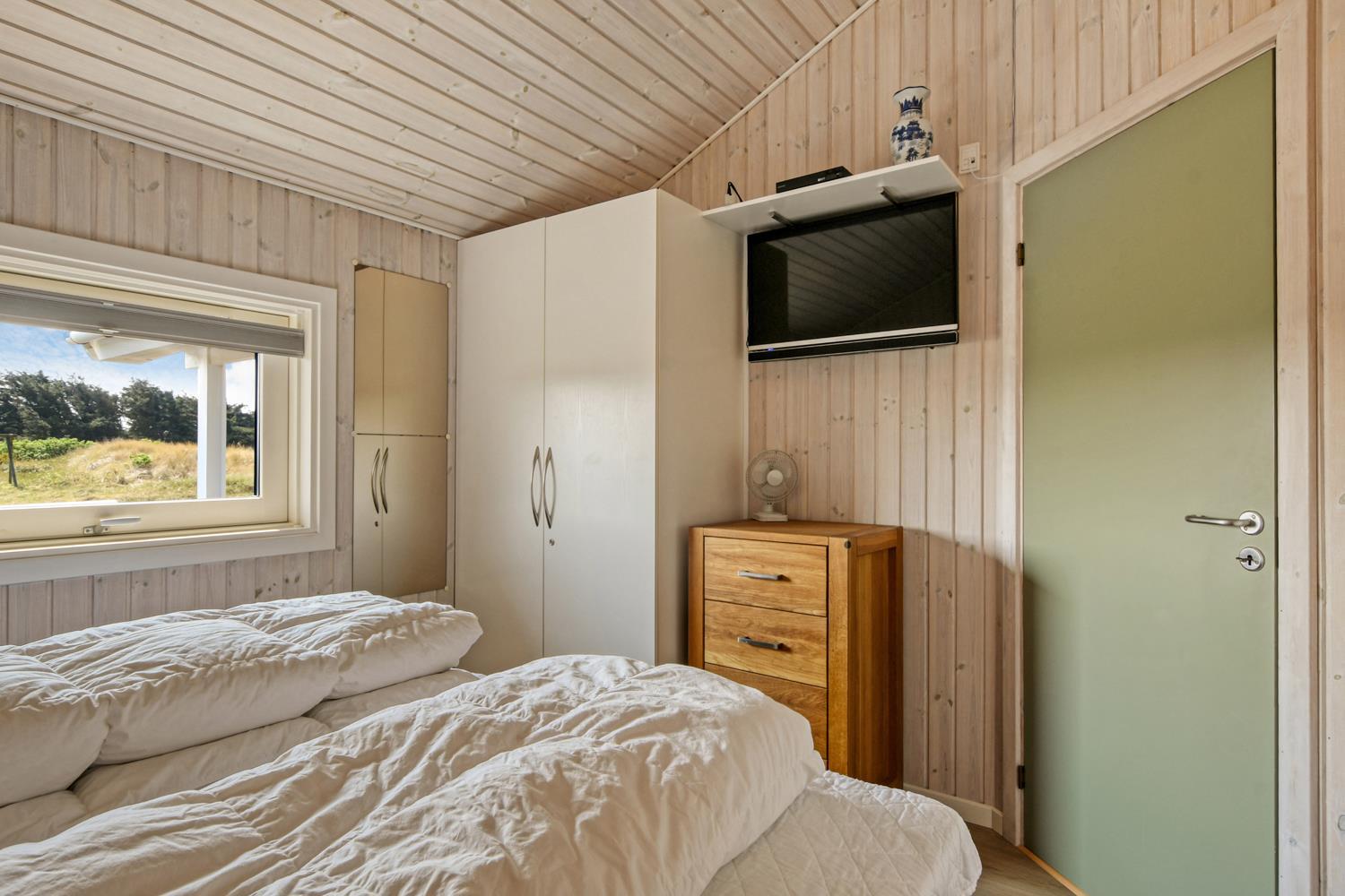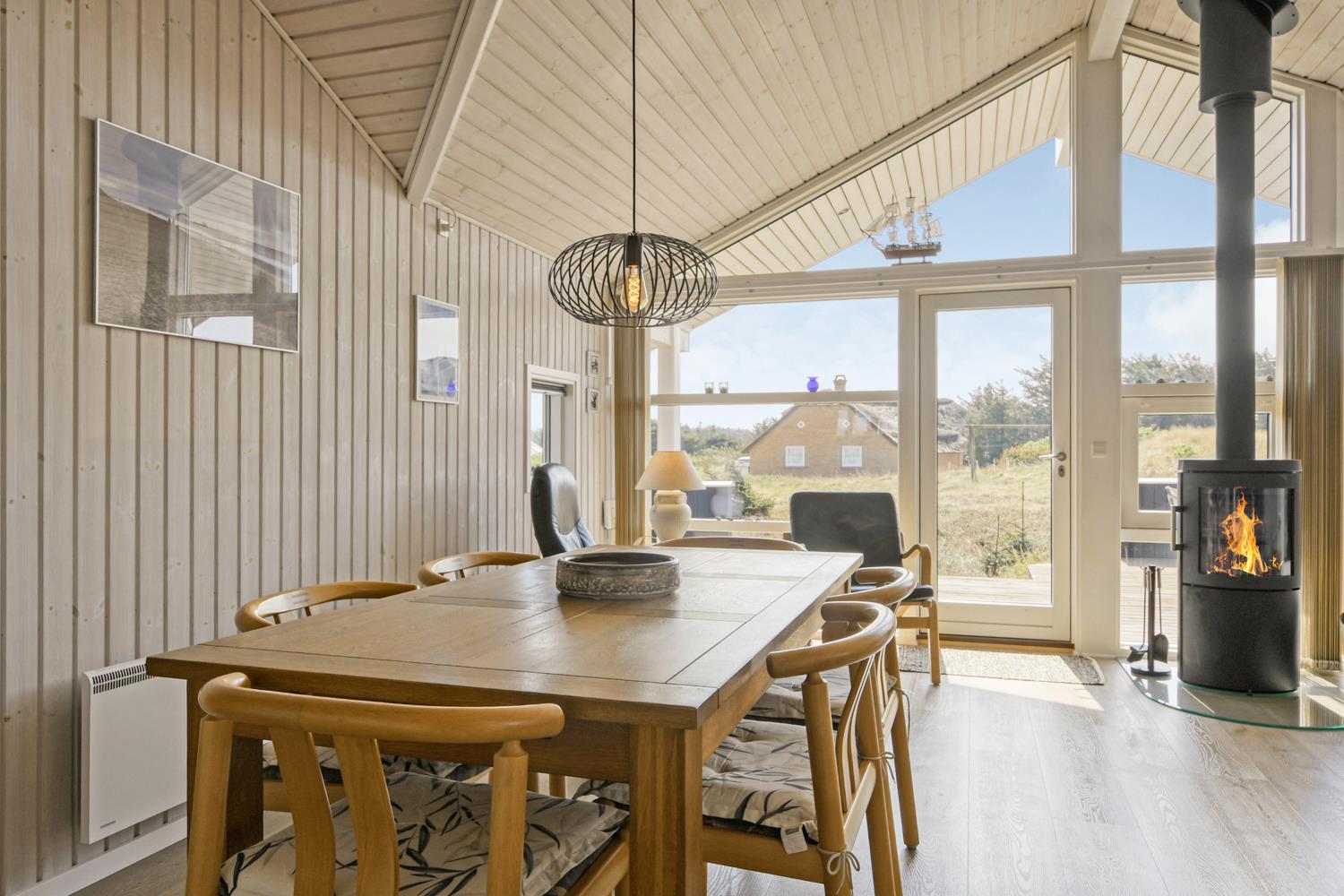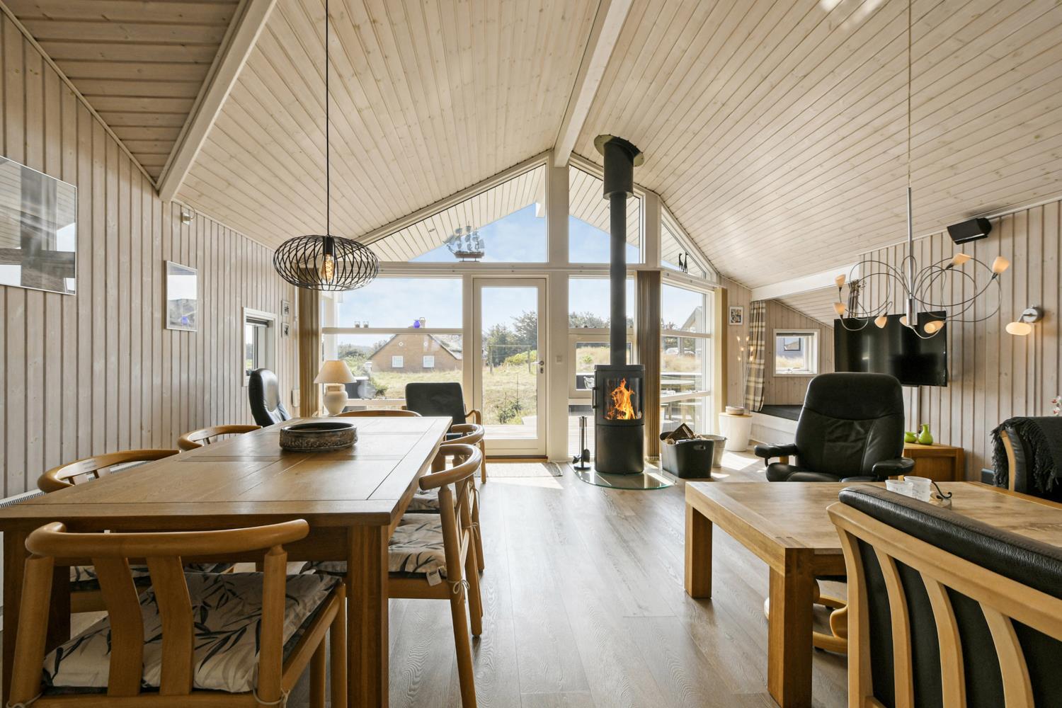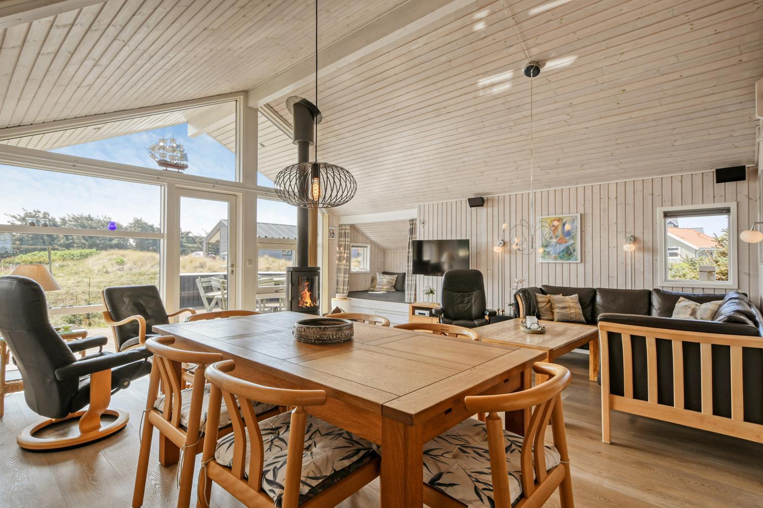 Dette velplejede feriehus på 92 m2, er godt isoleret, desuden er der brændeovn og varmepumpe som begge er medvirkende til at reducere varmeforbruget. I stuen er der et stort vinduesparti som er medvirkende til at give et godt lysindfald i hele rummet. Der er nye laminatgulve i hele huset. 3 soveværelser: 1DS + 1DS + 1S. I stuen er der en alkove med 2 sovepladser. I det ene soveværelse er der TV og DVD. Og på hemsen er der også 2 sovemuligheder, det er en meget stejl stige som fører op til hemsen. Hyggelig indrettet stue med brændeovn, F-TV med danske og tyske kanaler. Dejligt køkken med glaskeramisk komfur, køle-/fryseskab, opvaskemaskine, mikroovn og emhætte. Badeværelse med toilet, håndvask, bruser, spabad samt adgang til sauna og gulvvarme, her er der også en vaskemaskine og en tørretumbler. Gæstetoilet med håndvask og toilet. Til de mindste gæster er der babybadekar, barneseng og barnestol. Ikke rygerhus og husdyr er ikke tilladt.
