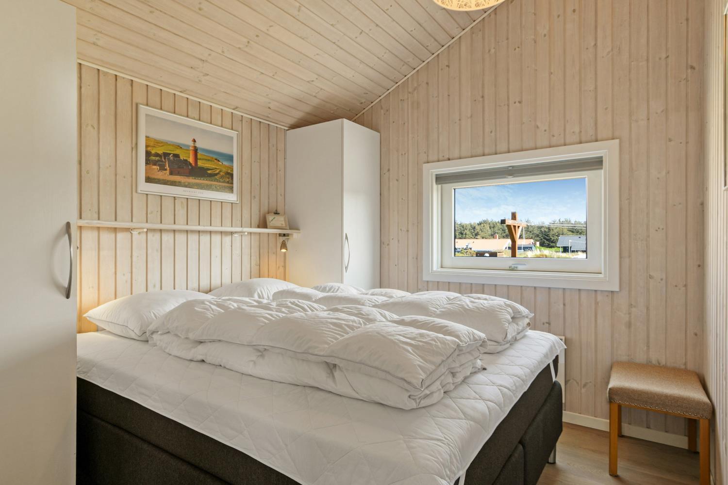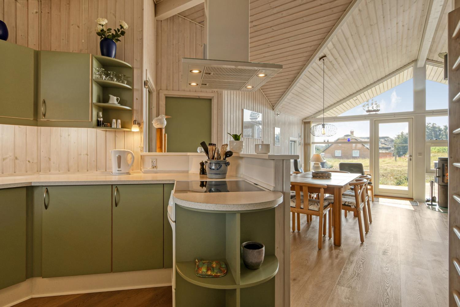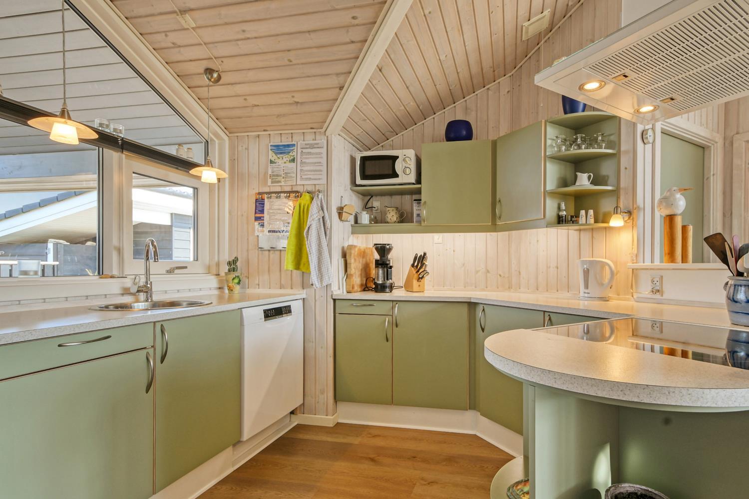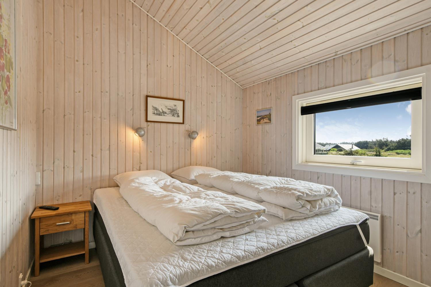 Dette velplejede feriehus på 92 m2, er godt isoleret, desuden er der brændeovn og varmepumpe som begge er medvirkende til at reducere varmeforbruget. I stuen er der et stort vinduesparti som er medvirkende til at give et godt lysindfald i hele rummet. Der er nye laminatgulve i hele huset. 3 soveværelser: 1DS + 1DS + 1S. I stuen er der en alkove med 2 sovepladser. I det ene soveværelse er der TV og DVD. Og på hemsen er der også 2 sovemuligheder, det er en meget stejl stige som fører op til hemsen. Hyggelig indrettet stue med brændeovn, F-TV med danske og tyske kanaler. Dejligt køkken med glaskeramisk komfur, køle-/fryseskab, opvaskemaskine, mikroovn og emhætte. Badeværelse med toilet, håndvask, bruser, spabad samt adgang til sauna og gulvvarme, her er der også en vaskemaskine og en tørretumbler. Gæstetoilet med håndvask og toilet. Til de mindste gæster er der babybadekar, barneseng og barnestol. Ikke rygerhus og husdyr er ikke tilladt.