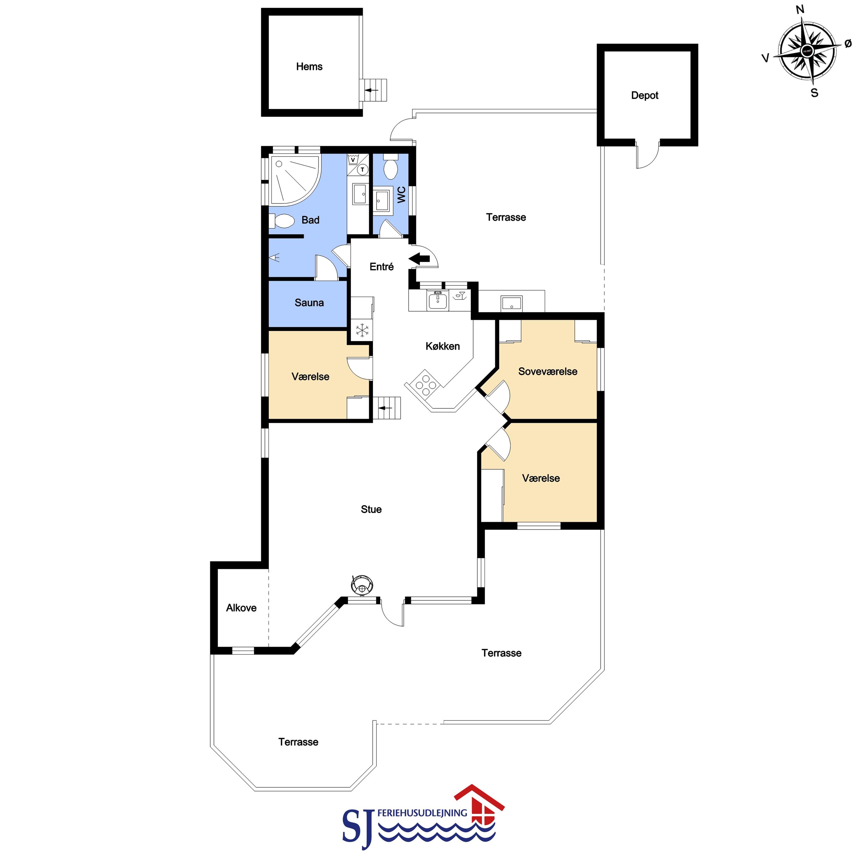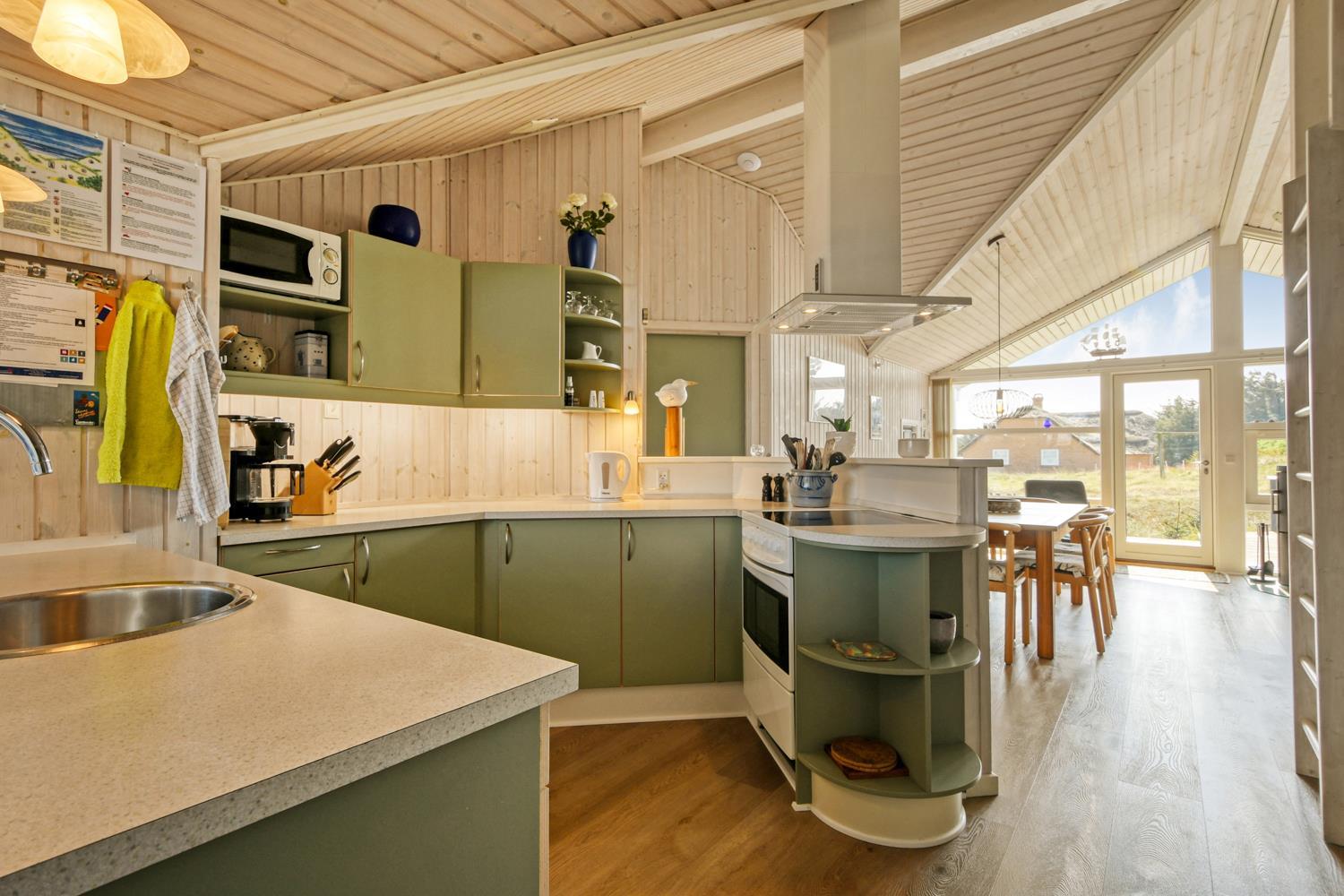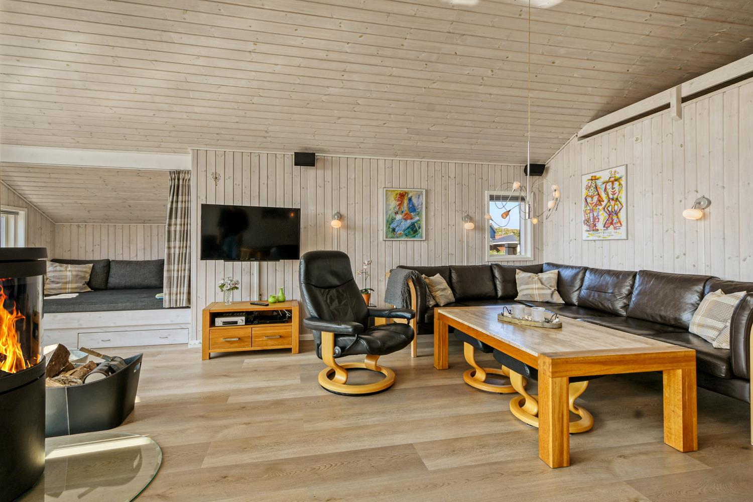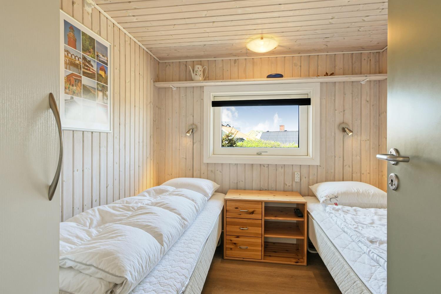 Dette velplejede feriehus på 92 m2, er godt isoleret, desuden er der brændeovn og varmepumpe som begge er medvirkende til at reducere varmeforbruget. I stuen er der et stort vinduesparti som er medvirkende til at give et godt lysindfald i hele rummet. Der er nye laminatgulve i hele huset. 3 soveværelser: 1DS + 1DS + 1S. I stuen er der en alkove med 2 sovepladser. I det ene soveværelse er der TV og DVD. Og på hemsen er der også 2 sovemuligheder, det er en meget stejl stige som fører op til hemsen. Hyggelig indrettet stue med brændeovn, F-TV med danske og tyske kanaler. Dejligt køkken med glaskeramisk komfur, køle-/fryseskab, opvaskemaskine, mikroovn og emhætte. Badeværelse med toilet, håndvask, bruser, spabad samt adgang til sauna og gulvvarme, her er der også en vaskemaskine og en tørretumbler. Gæstetoilet med håndvask og toilet. Til de mindste gæster er der babybadekar, barneseng og barnestol. Ikke rygerhus og husdyr er ikke tilladt.