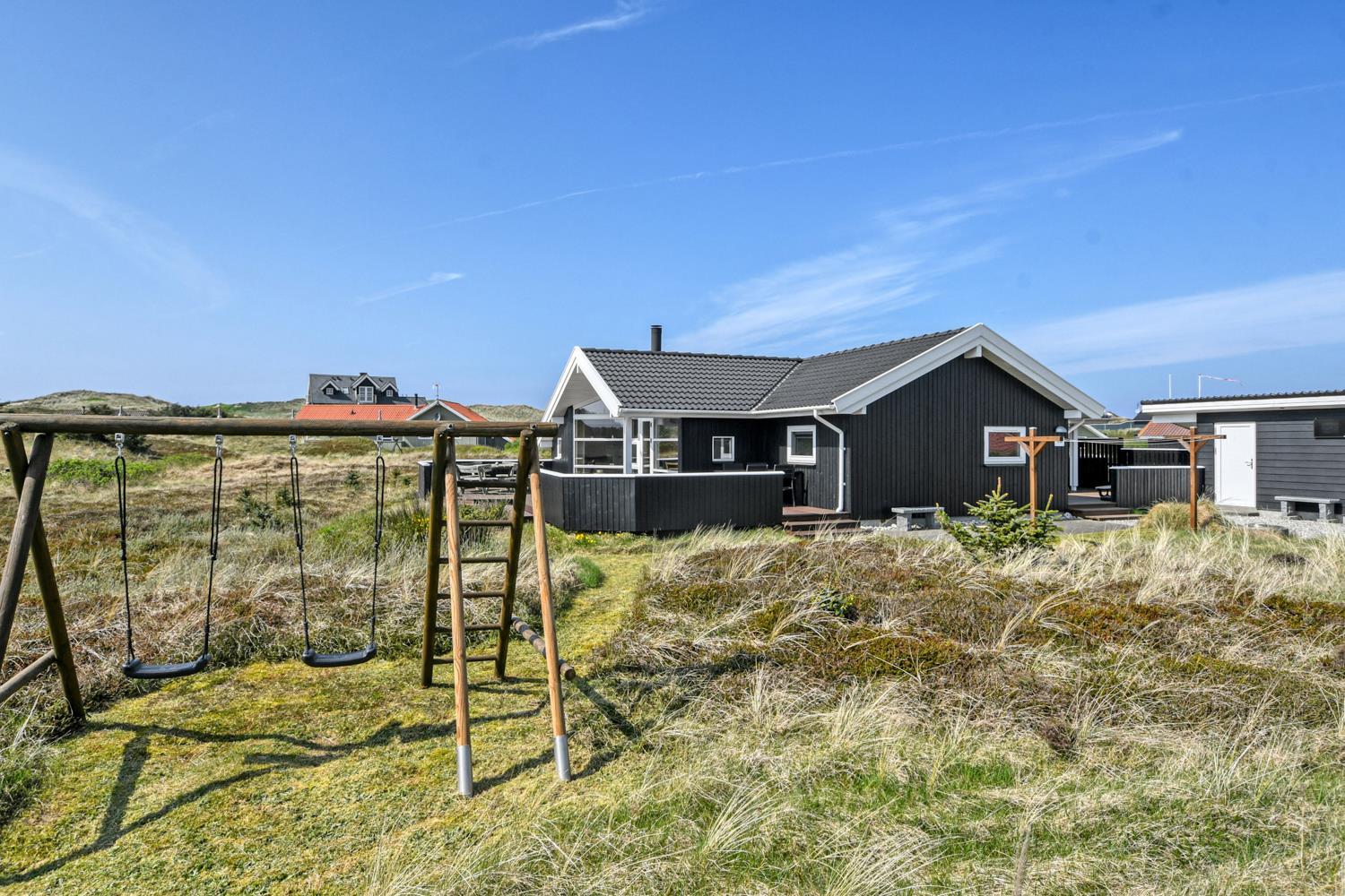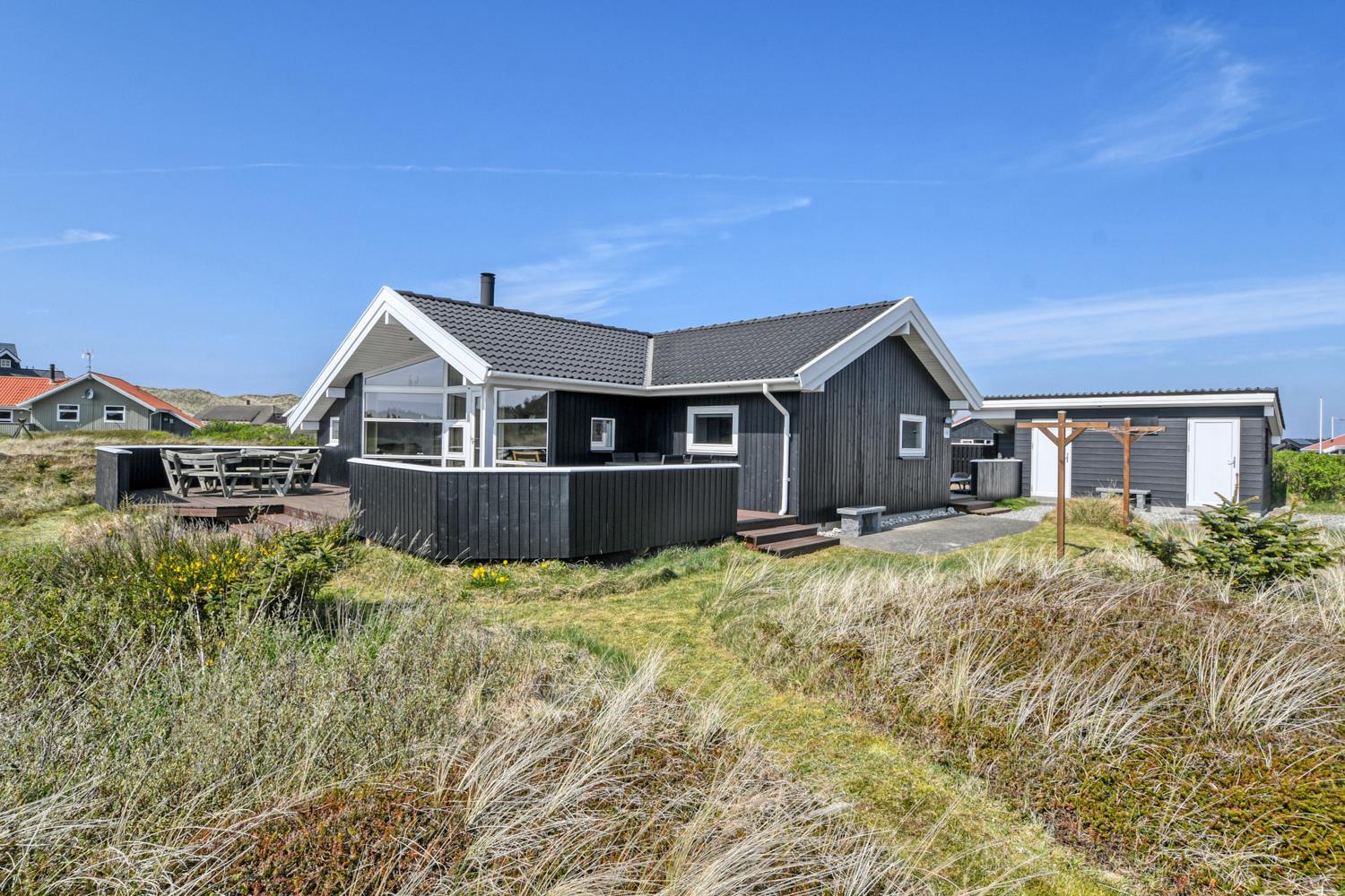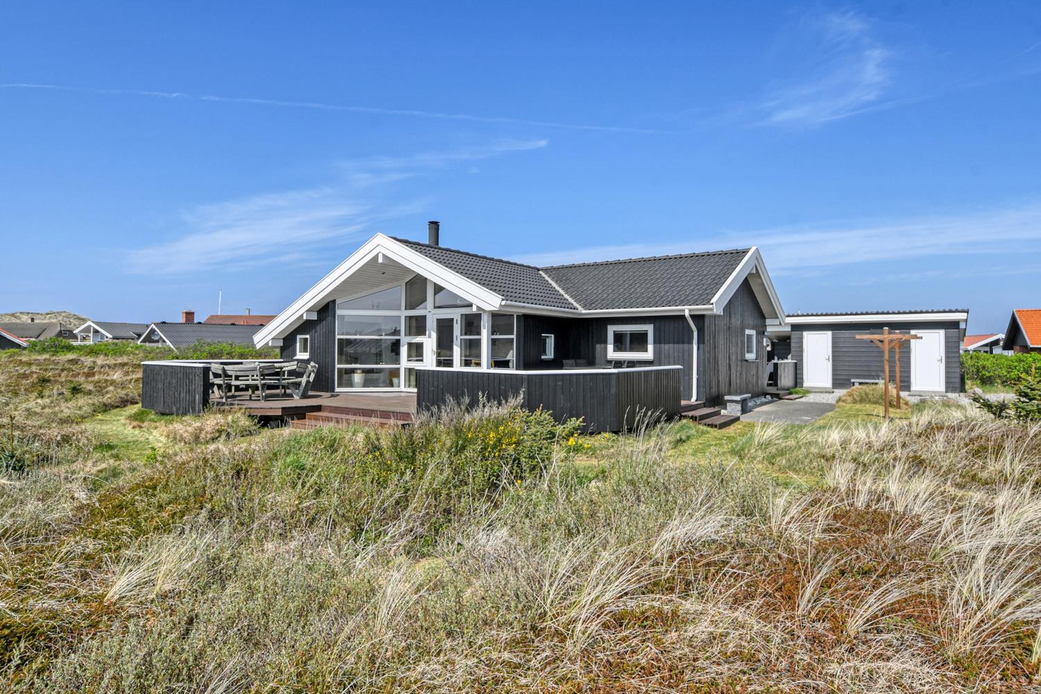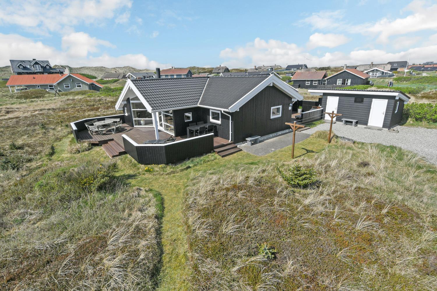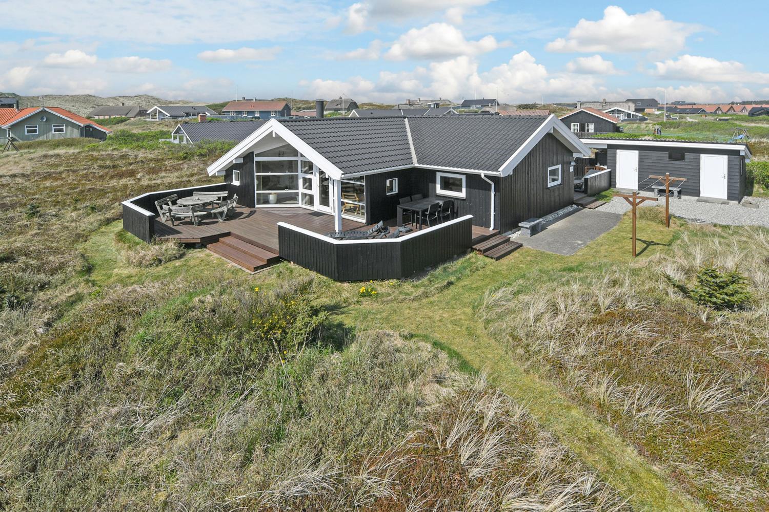 Dette flotte og velplejede feriehus er beliggende i et attraktivt klitområde på en 120 m2 klitgrund blot 250 meter fra områdets bedste strand og ligeledes kun ca. 500 m til et sæsonåbent supermarked.