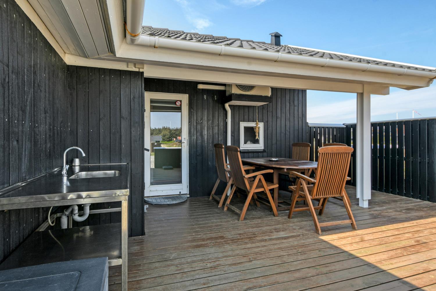 Flot sommerhus beliggende i et attraktivt klitområde på en 1200 m2 klitgrund kun 250 meter til områdets bedste strand og ligeledes kun ca. 500 meter til supermarked, som har åbent det meste af året. Fra stuen er der udgang til en delvis overdækket og delvis indhegnet terrasse med havemøbler, 3 solvogne, parasol samt en lille gasgrill (gasflaske dertil skal man selv medbringe). Til de mindste gæster er der en gynge. Nyd at huset ligger i gåafstand til Vesterhavet. Fra terrassen har man en skøn udsigt over området og de høje klitter ved Vesterhavet. Husets anden terrasse har også havemøbler og som noget ekstra råder huset også over en fiskerenseplads, denne terrasse er også delvis overdækket og lukket. Fra huset er der i bil kun en kort køretur til Thyborøn eller Lemvig. Begge byer byder på flere attraktioner og gode indkøbsmuligheder. I begge byer der er der også mulighed for at købe frisk fisk. Et skønt hus til 6 personer som gerne vil bo i rolige omgivelser tæt på Vesterhavet.