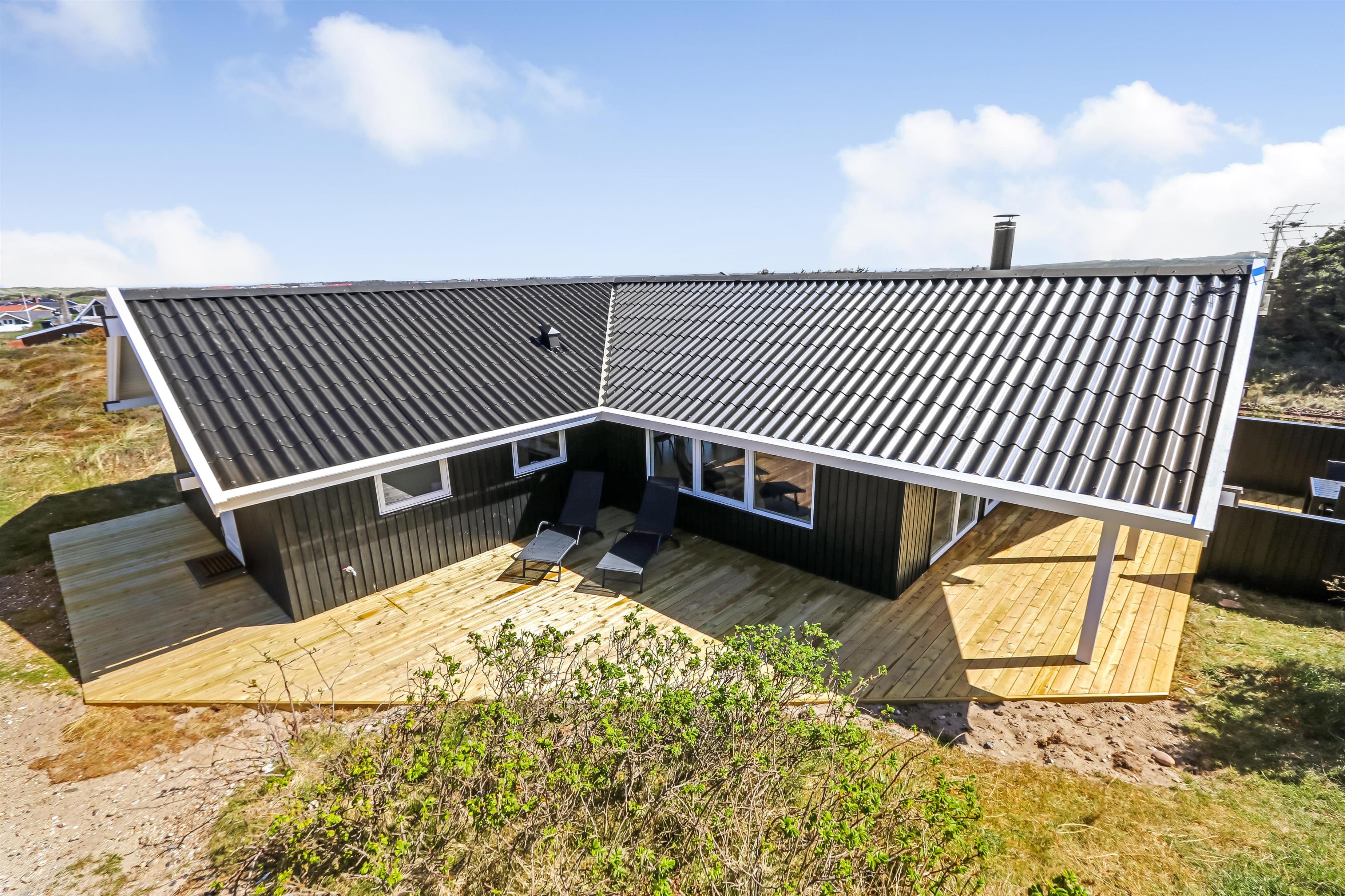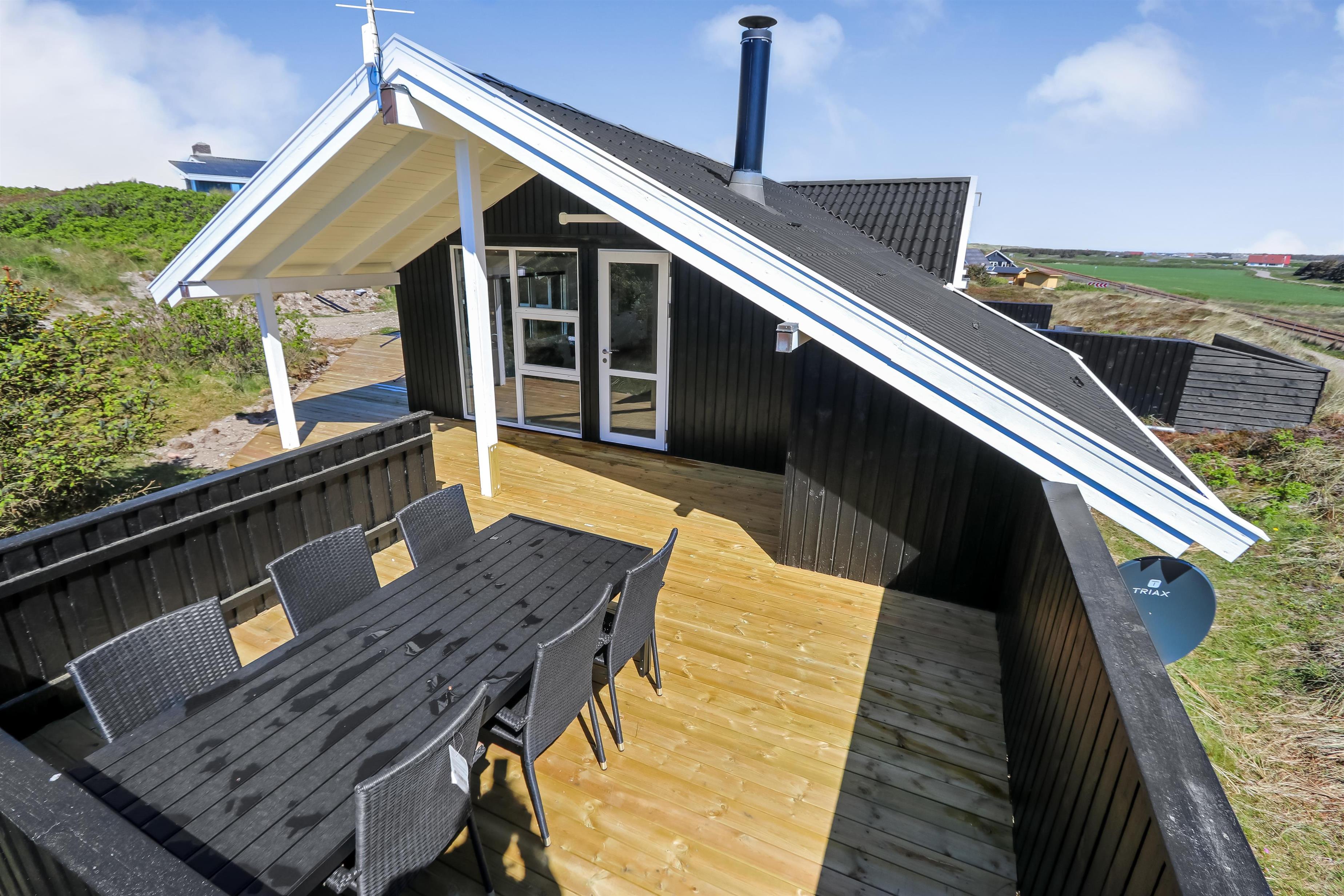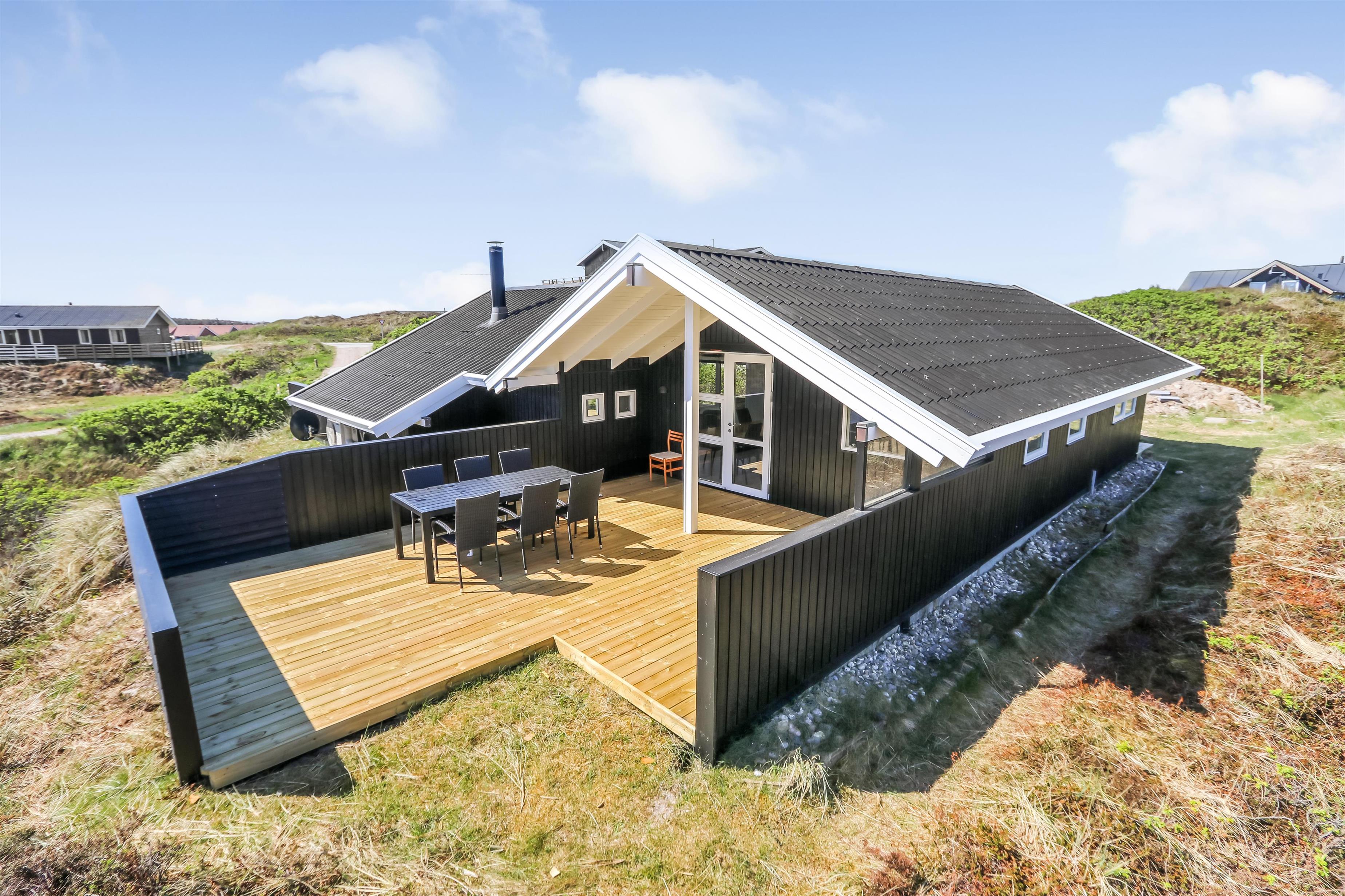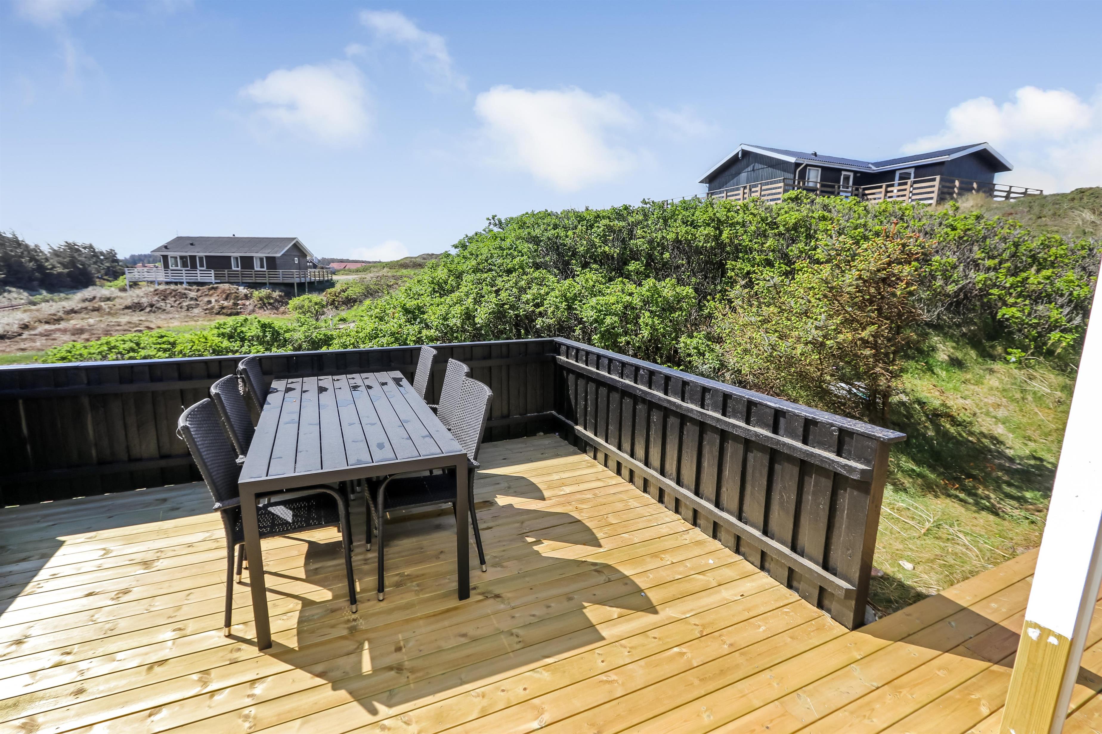 Huset er beliggende på en ca. 1.161 m2 stor kuperet, naturgrund kun 200 m fra Vesterhavet. Der er udgang til 2 fantastisk, nylavet yerasser, hvoraf den ene er delvis overdækket. Havemøbler, solvogne og gas-grill som kan flyttes rundt efter behag. Et utrolig dejligt hus, hvor der er tænkt på det meste og med masser af muligheder. 5 - 10 min fra huset ligger Vesterhavet, der altid invitere til en frisk gå- eller løbetur. Områdets købmand har sæsonåbent og ligger ca. 1.500 m fra huset og som i sæsonen byder på frisk morgenbrød. Her kan de daglige indkøb også klares. Også området madsted ligger ca. 1.500 fra huset. Inden for 25-30 minutter kan flere aktiviteter og shoppingmuligheder nås. Så hvad enten I er til aktiv ferie eller total afslapning, danner dette flotte feriehus en dejlig ramme både hvad angår hus, beliggenhed og omgivelser.