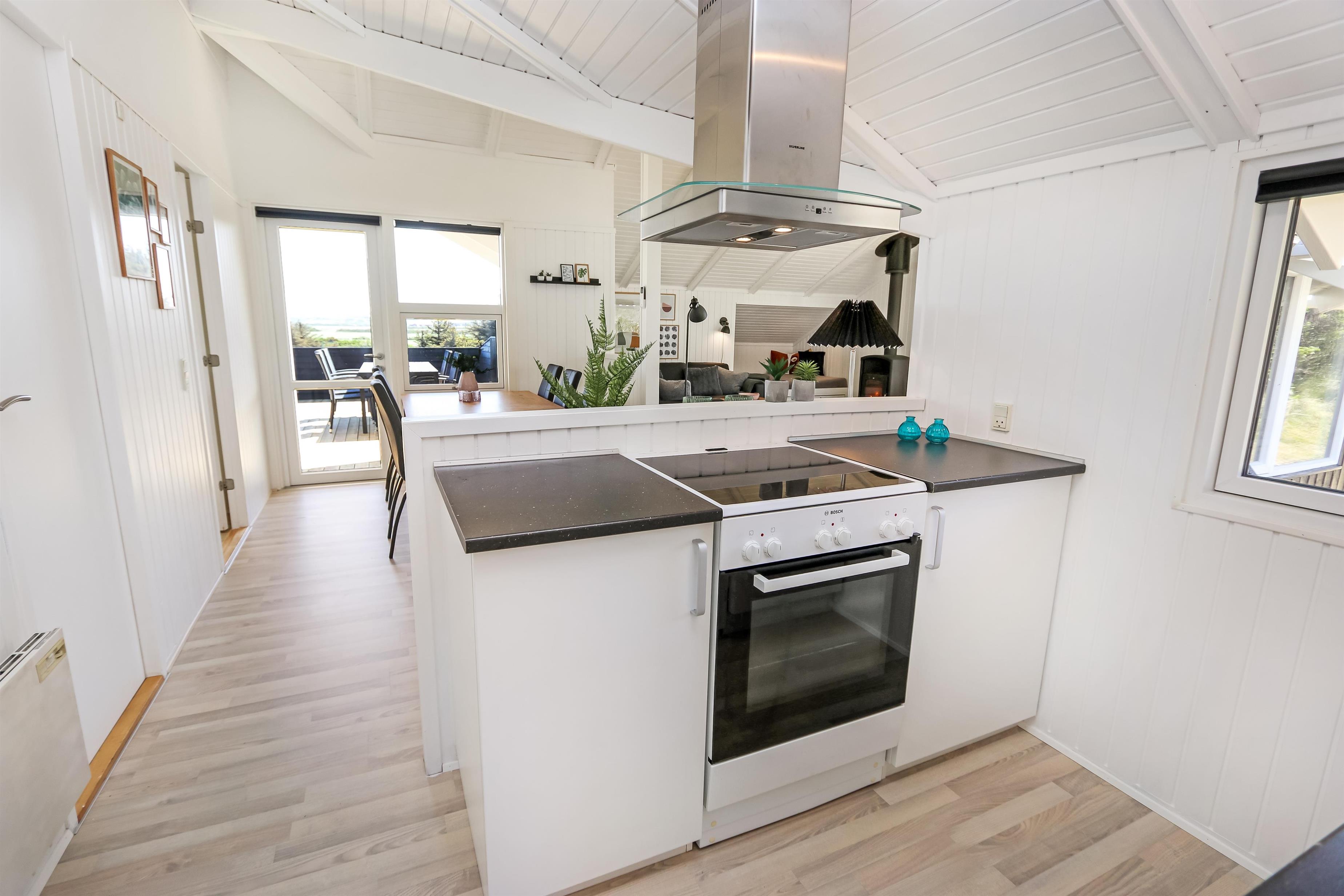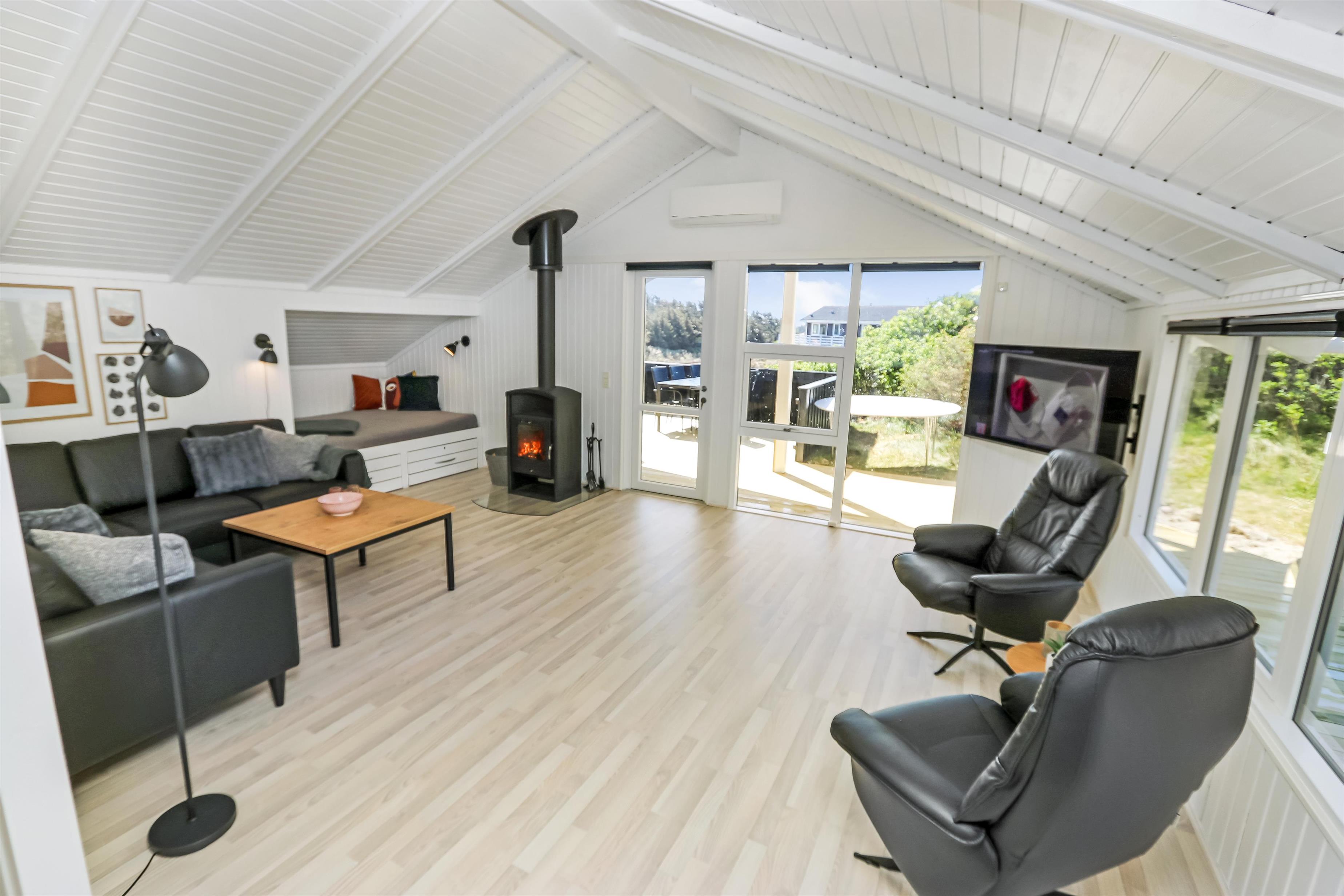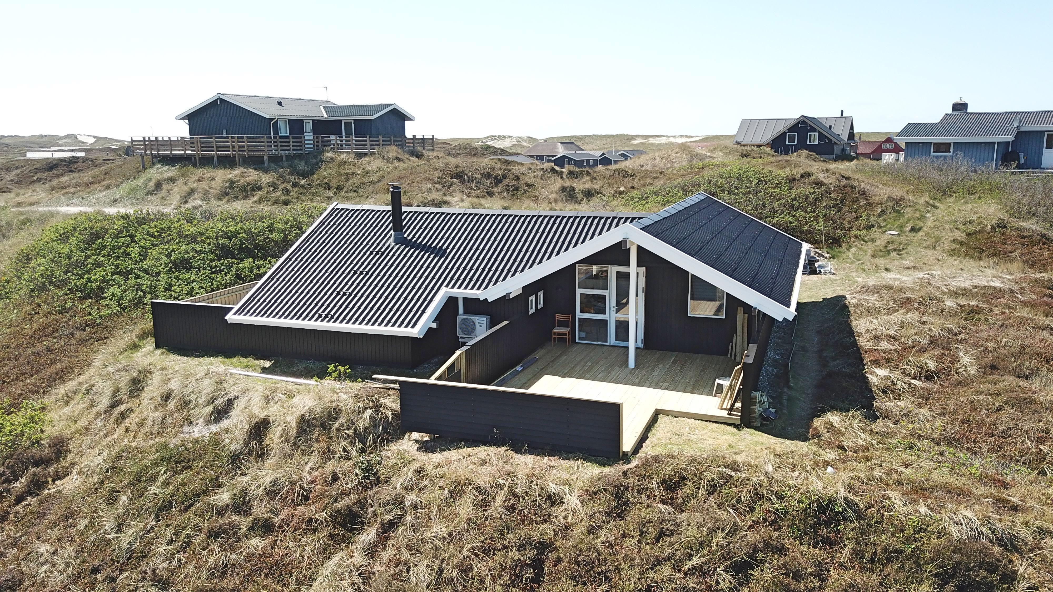 På en dejlig, kuperet naturgrund og kun 200 m fra Vesterhavet, ligger dette pragtfulde feriehus på 76 m2. Huset er bygget i 1989 – men er i 2020 blevet totalt istandsat. Huset er minimalistisk i sit udtryk og praktisk indrettet. Entrè med ekstra afliggeplads byder velkommen. Kombineret opholdsstue og køkkenhjørne som er med loft til kip. Opholdsstuen med, nye lækre lædermøbler, spisebord, Smart-TV med danske og tyske programmer samt mulighed for streaming af TV / radio / Apps, så har du en mobiltelefon eller et andet device med kan du streame hvad du nu har abonnement. Slap af foran den knitrende brændeovn som sammen med varmepumpen hjælper med at reducere udgiften til varmeregningen. Praktiske hårde gulve i opholdsstue og køkkenhjørne. 3 gode soverum med gode nye senge (1DS, 1DS, 1KS samt en alkove med 2 ekstra sovepladser i opholdsstuen). Til de små gæster er der barneseng og barnestol til rådighed. Helt nyt og lækkert køkkenhjørne med alt i service / køkkengrej samt komfur med glaskeramiske kogeplader, emhætte, opvaskemaskine, køleskab med fryseboks og mikroovn. Flot, nyt badeværelse klinkegulv toilet, håndvask og bruser. Vaskemaskine forefindes. Ikke ryger hus. Max. 1 husdyr er tilladt.