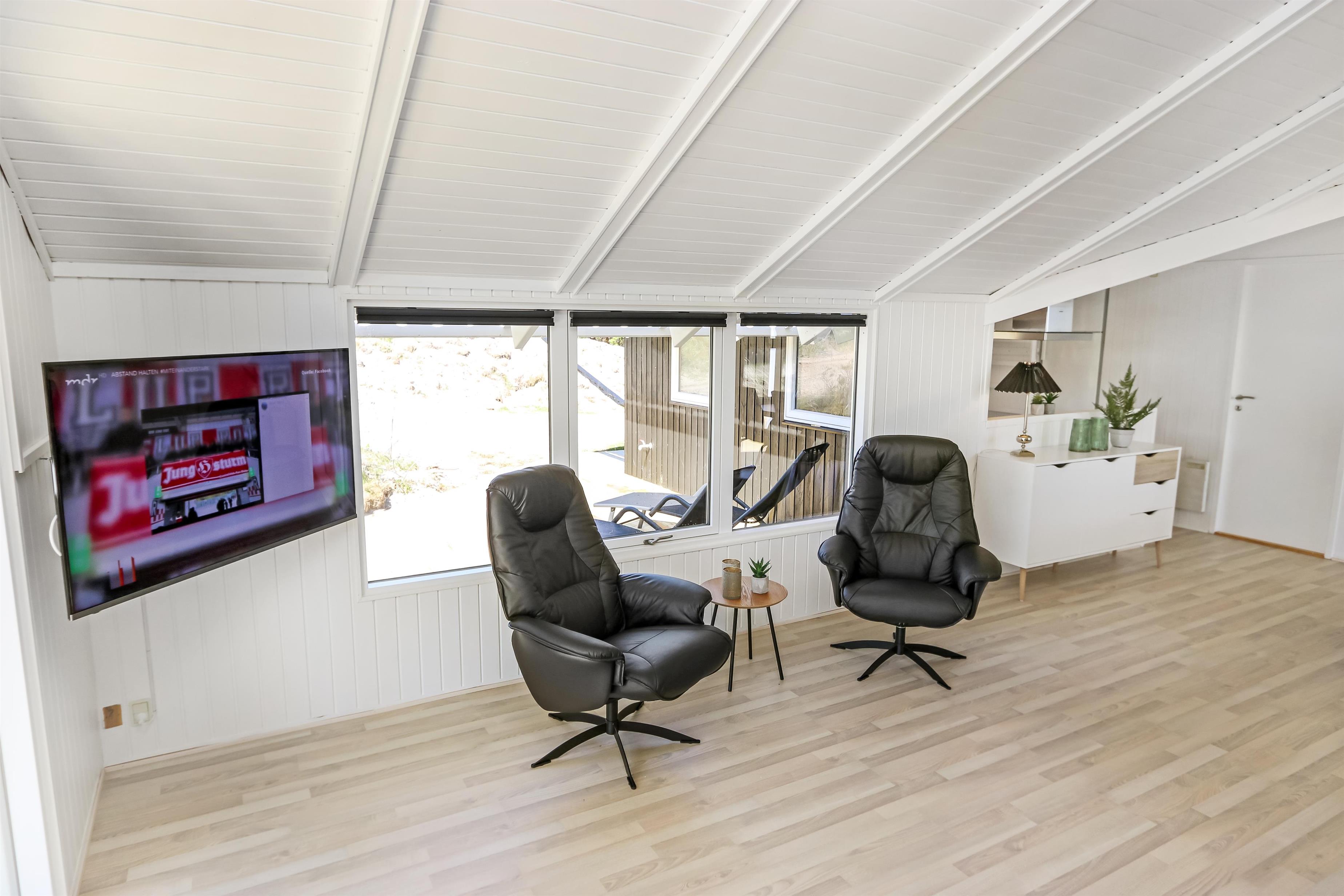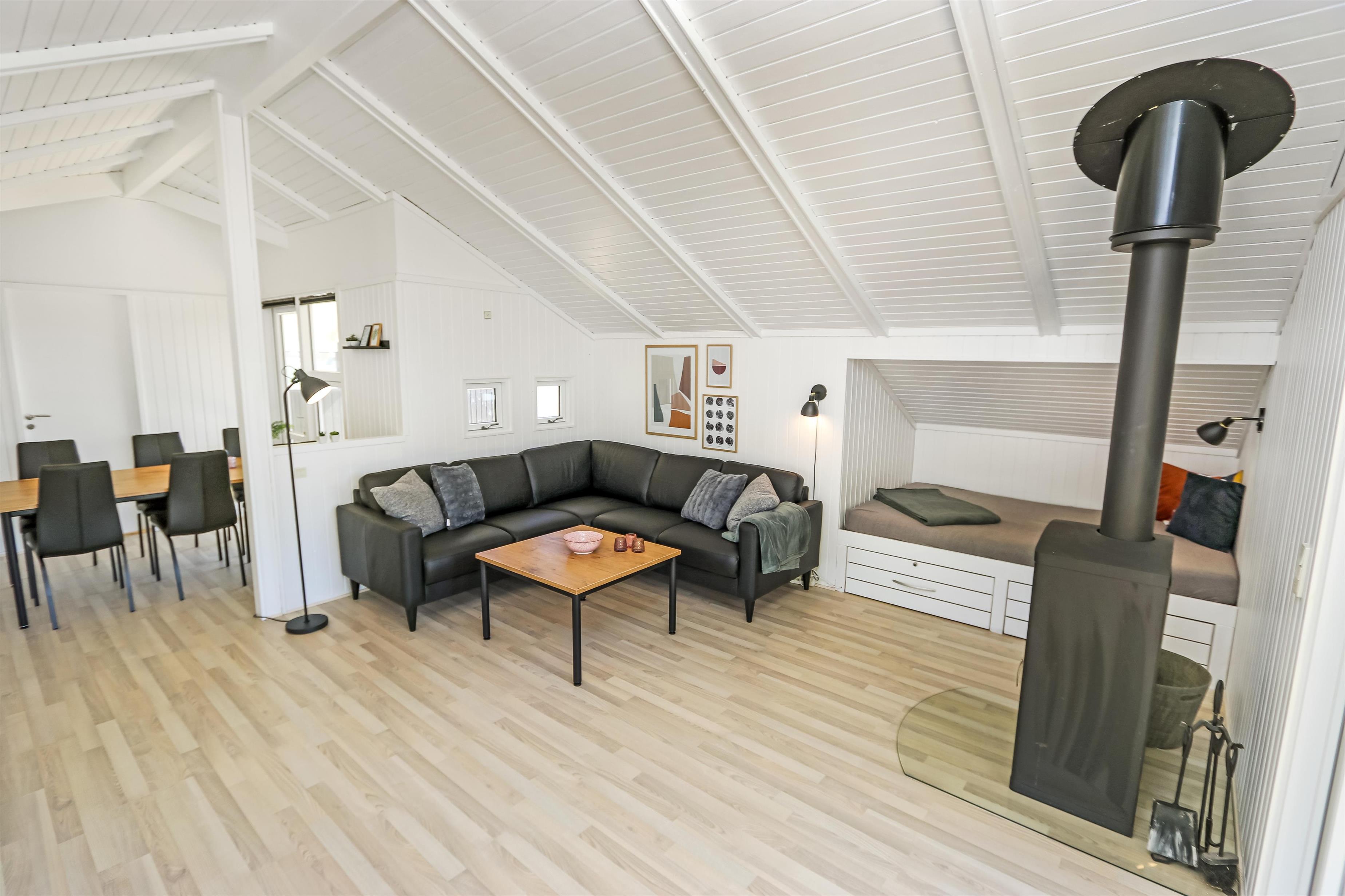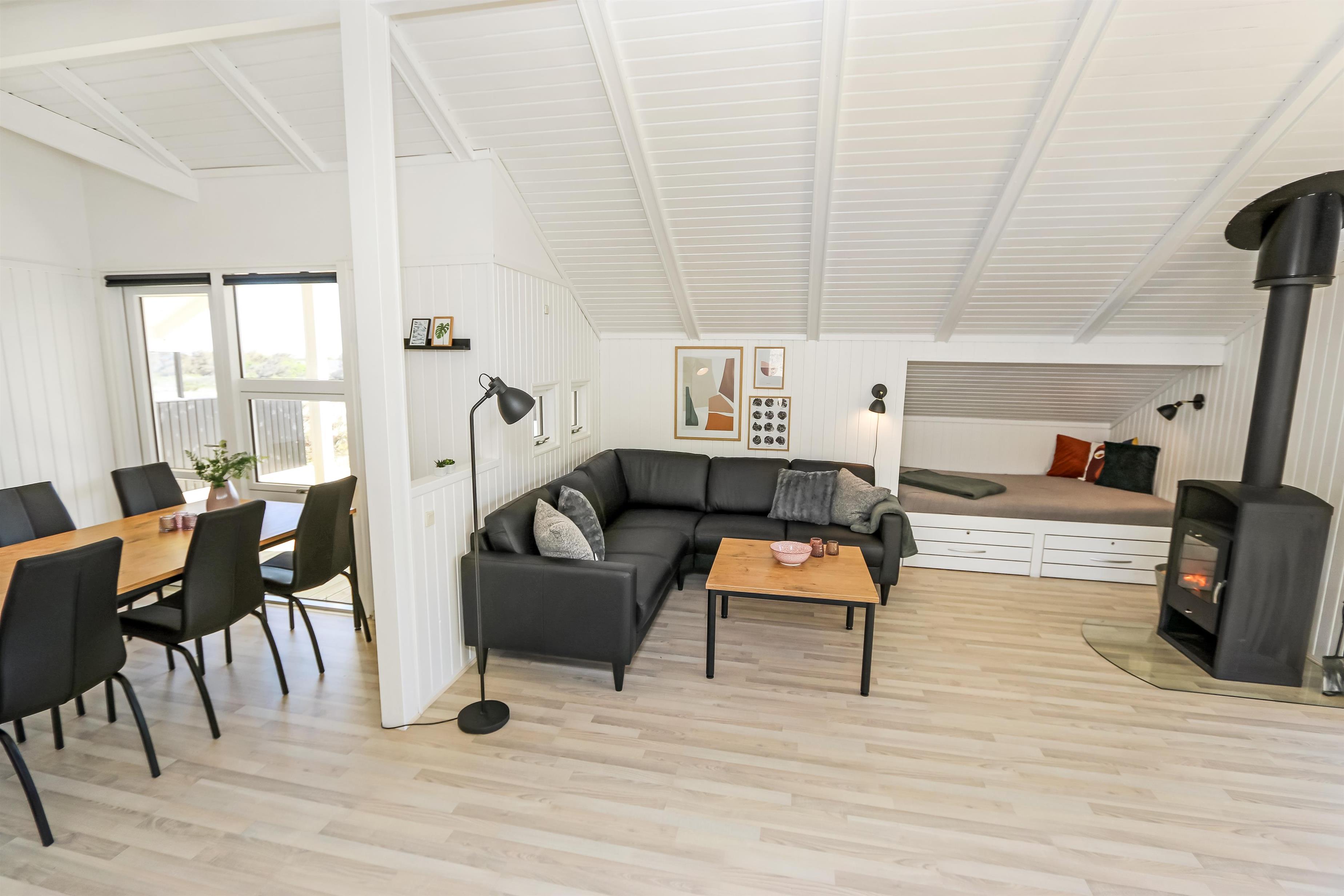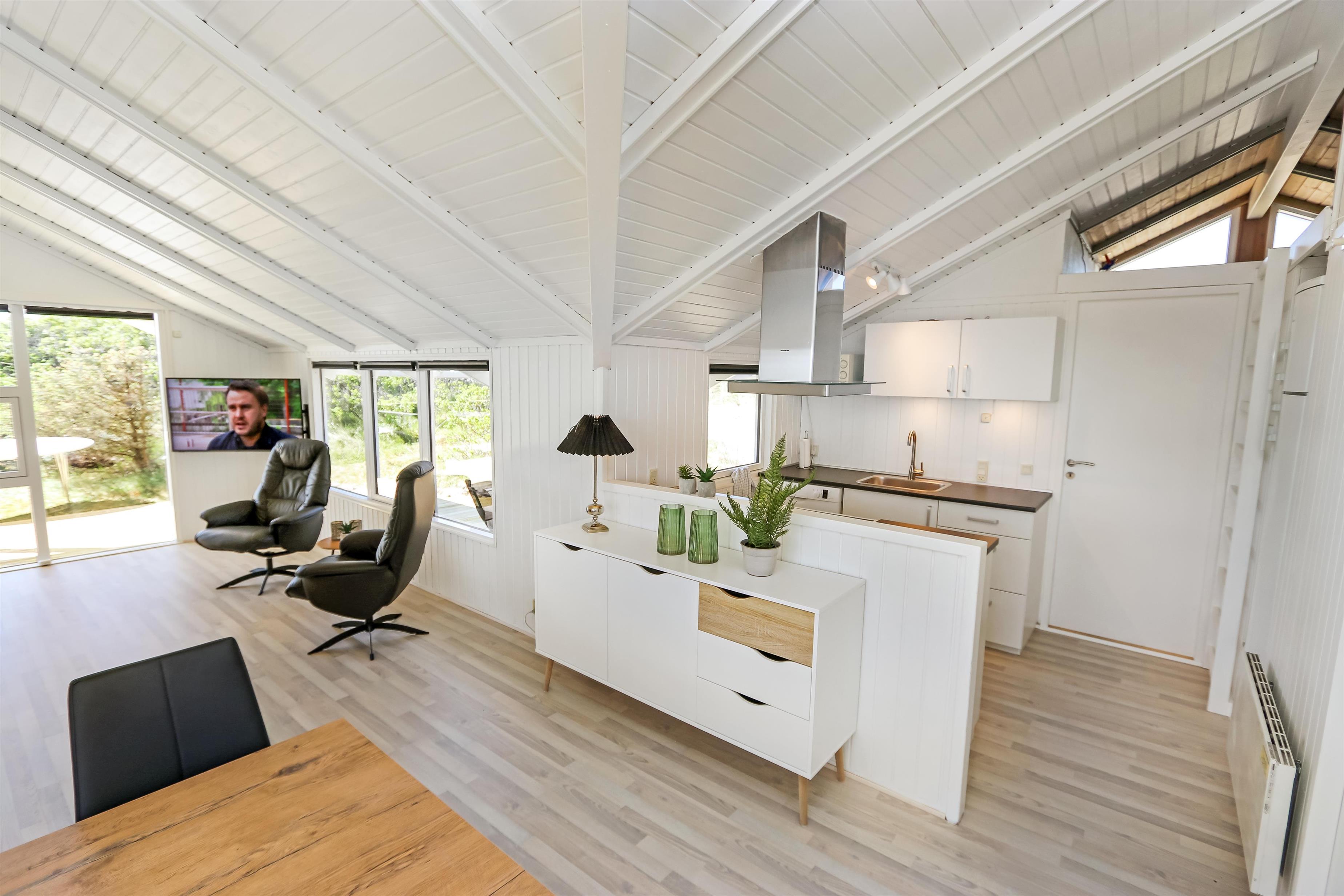 På en dejlig, kuperet naturgrund og kun 200 m fra Vesterhavet, ligger dette pragtfulde feriehus på 76 m2. Huset er bygget i 1989 – men er i 2020 blevet totalt istandsat. Huset er minimalistisk i sit udtryk og praktisk indrettet. Entrè med ekstra afliggeplads byder velkommen. Kombineret opholdsstue og køkkenhjørne som er med loft til kip. Opholdsstuen med, nye lækre lædermøbler, spisebord, Smart-TV med danske og tyske programmer samt mulighed for streaming af TV / radio / Apps, så har du en mobiltelefon eller et andet device med kan du streame hvad du nu har abonnement. Slap af foran den knitrende brændeovn som sammen med varmepumpen hjælper med at reducere udgiften til varmeregningen. Praktiske hårde gulve i opholdsstue og køkkenhjørne. 3 gode soverum med gode nye senge (1DS, 1DS, 1KS samt en alkove med 2 ekstra sovepladser i opholdsstuen). Til de små gæster er der barneseng og barnestol til rådighed. Helt nyt og lækkert køkkenhjørne med alt i service / køkkengrej samt komfur med glaskeramiske kogeplader, emhætte, opvaskemaskine, køleskab med fryseboks og mikroovn. Flot, nyt badeværelse klinkegulv toilet, håndvask og bruser. Vaskemaskine forefindes. Ikke ryger hus. Max. 1 husdyr er tilladt.