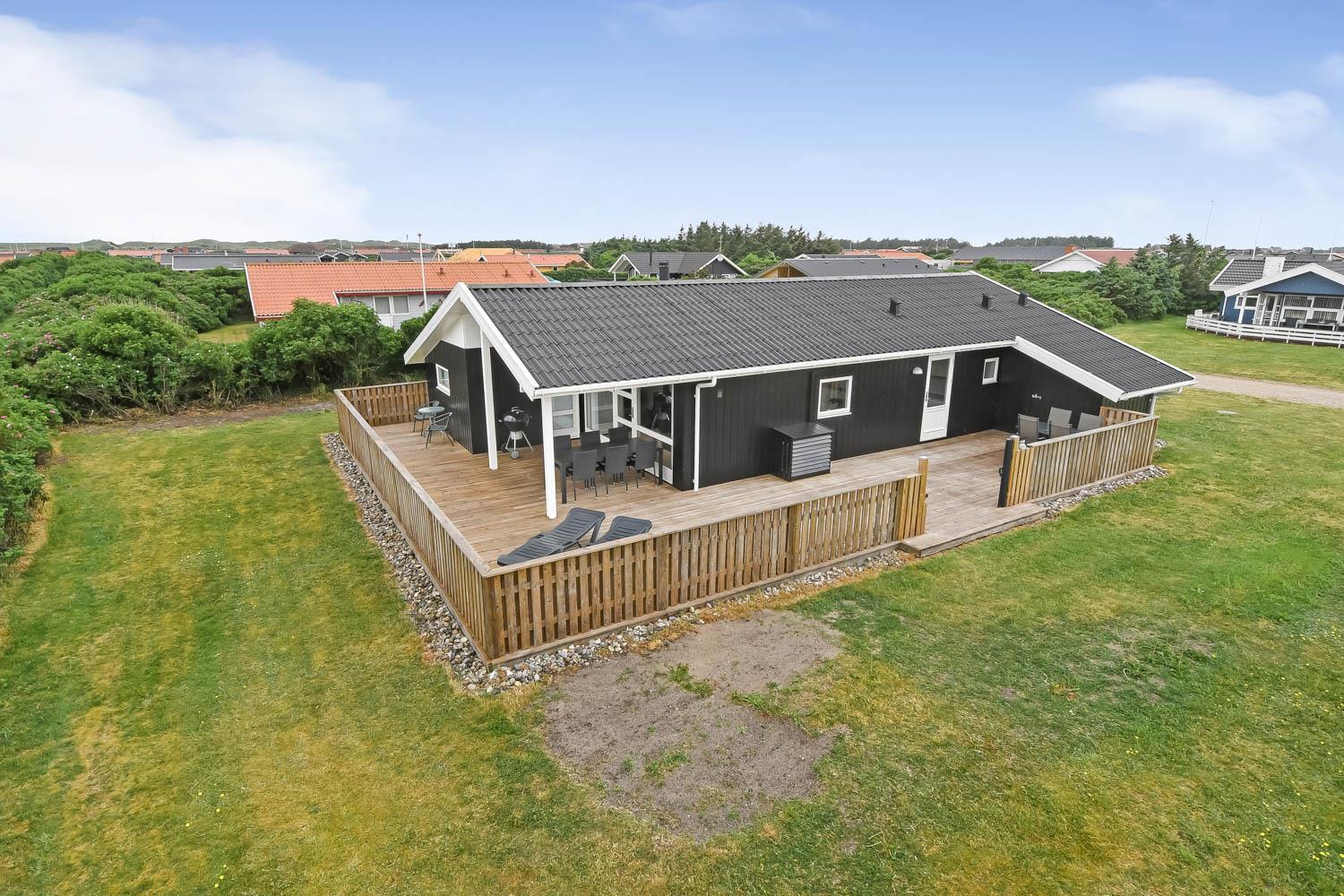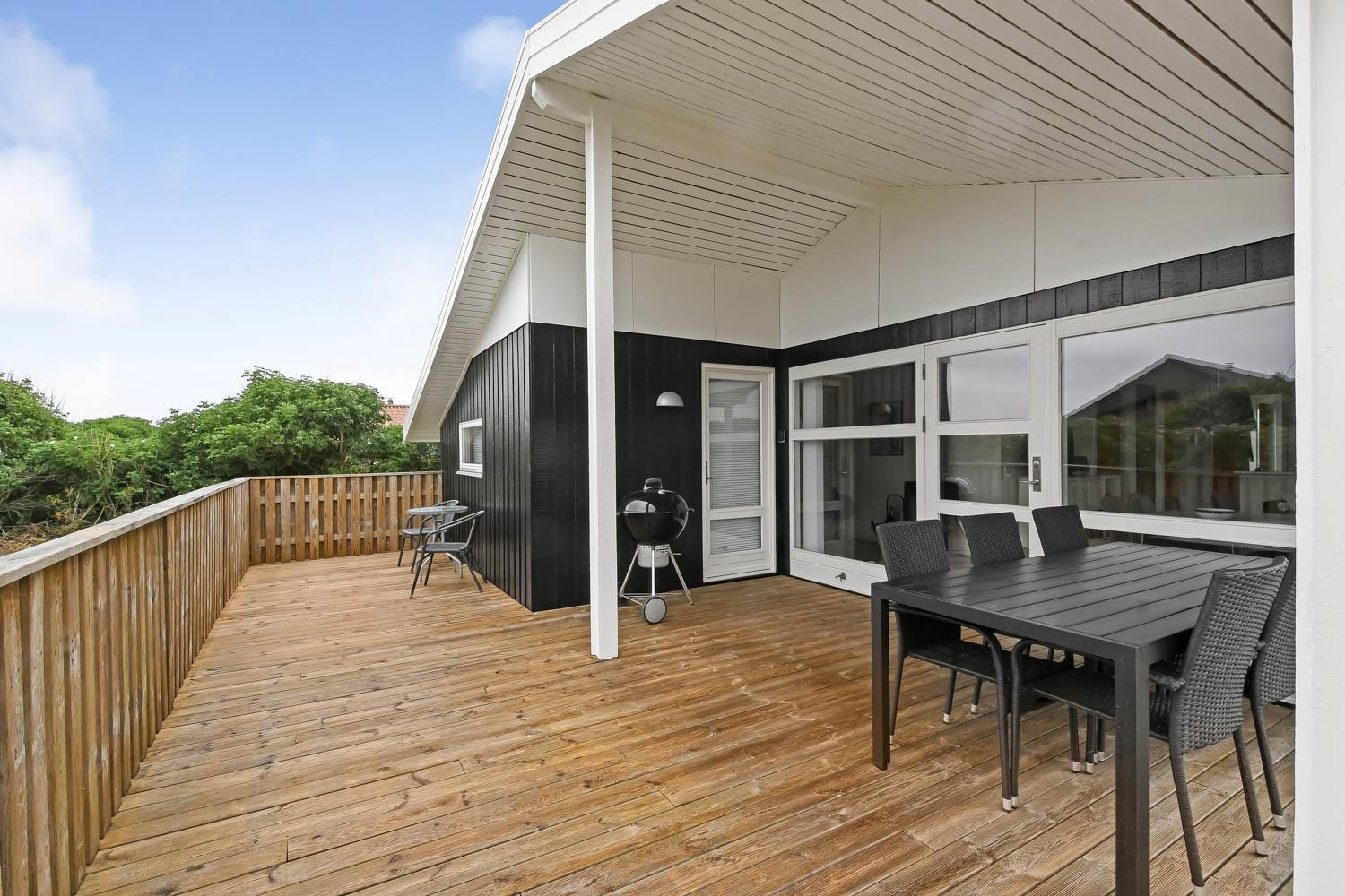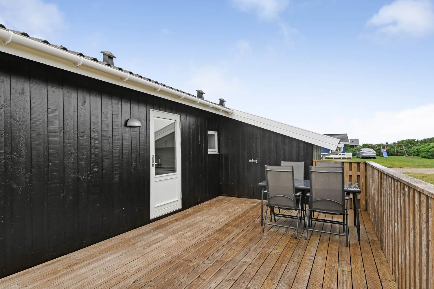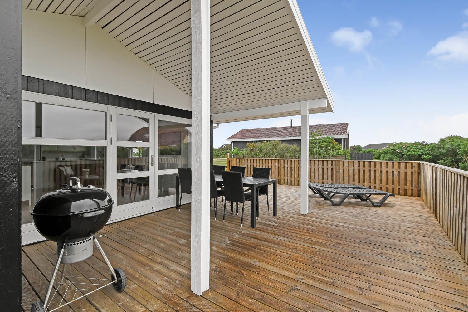 Fra stue og køkkenrummet er der 2 udgange til den store terrasseanlæg som er fortrinsvis syd og østvendt. Dette er meget praktisk, da den dominerende vindretning er vest og dermed har man ofte læ. Terrassen har både havemøbler, grill og 2 solvogne, så her er udstyret i orden til mange hyggelige afslappende timer. Der er kun 300 meter til Vejlby Torv med købmanden og Cafe John Wayne, så dette gør kun ferien endnu mere komfortabel. Vejlby Klit er omgivet af vand på begge sider med Vesterhavet mod vest som altid er et besøg værd. Her kan man bade, lave sandslotte, fiske, flyve med drage eller ganske enkelt blot gå een lang tur og nyde ensomheden eller familiens nærvær. Det samme gælder iøvrigt den tætte beliggenhed til Ferring Sø hvor der går en vandrerute rundt om.