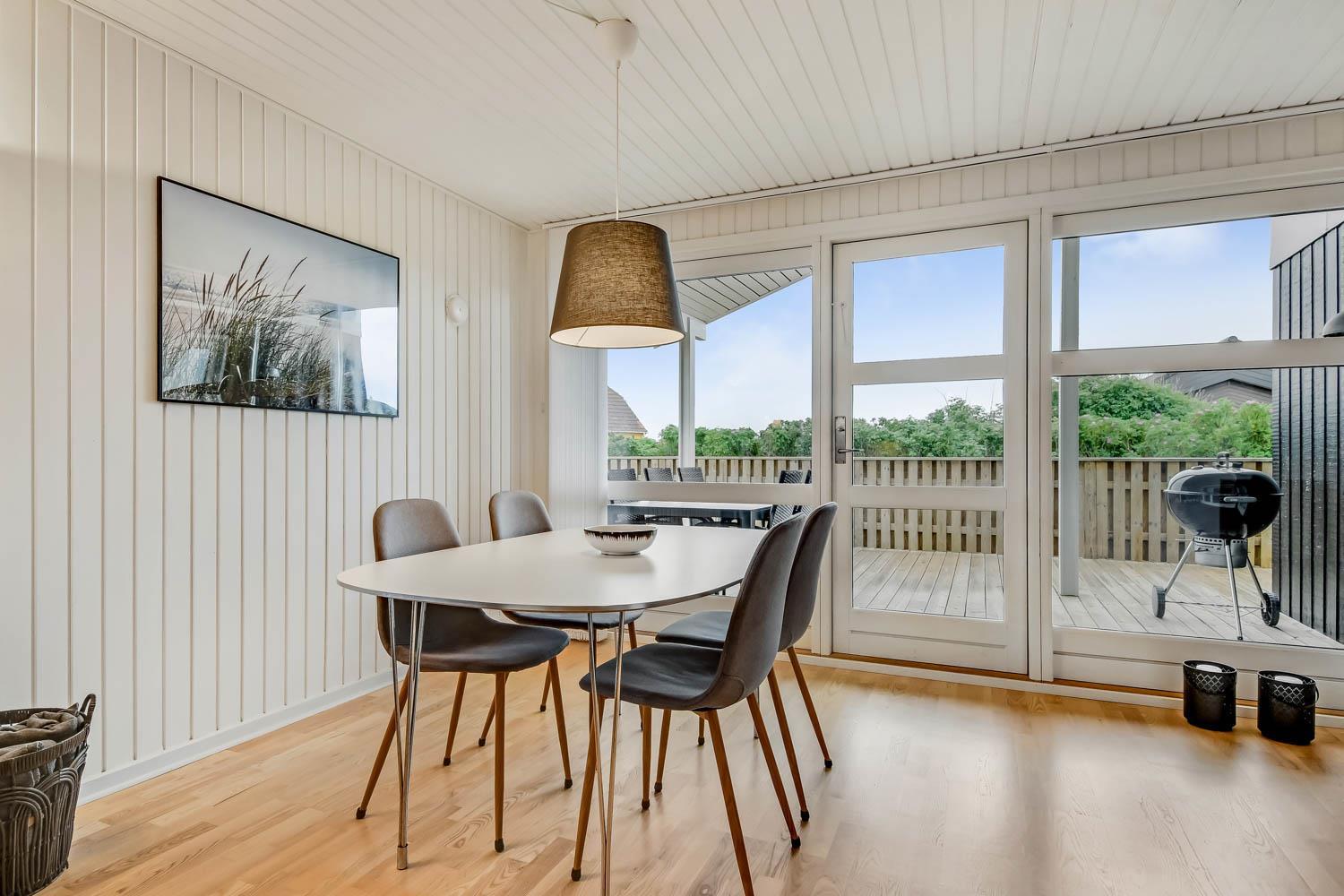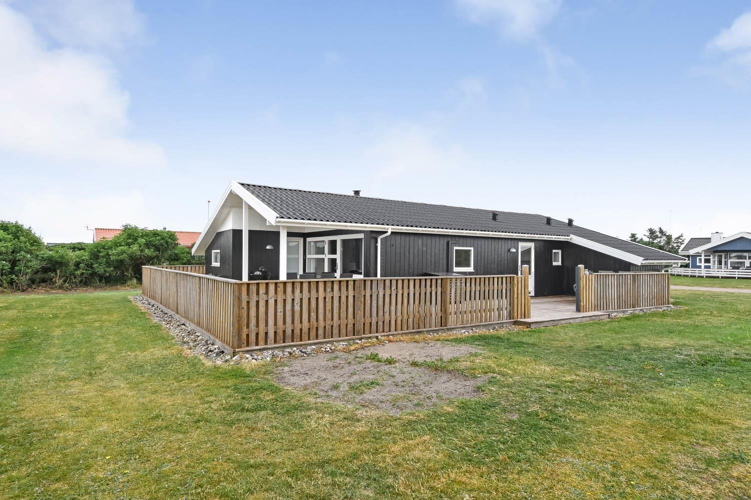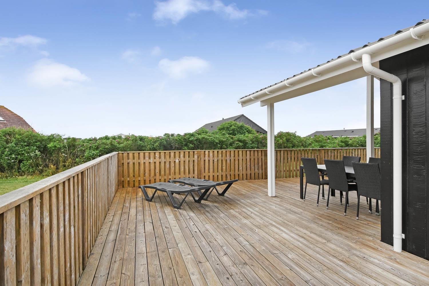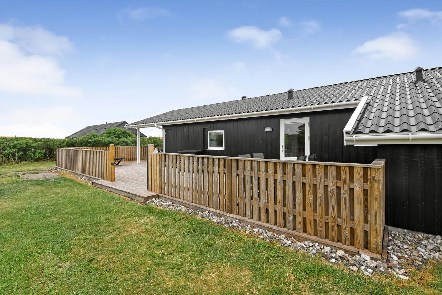 Fra stue og køkkenrummet er der 2 udgange til den store terrasseanlæg som er fortrinsvis syd og østvendt. Dette er meget praktisk, da den dominerende vindretning er vest og dermed har man ofte læ. Terrassen har både havemøbler, grill og 2 solvogne, så her er udstyret i orden til mange hyggelige afslappende timer. Der er kun 300 meter til Vejlby Torv med købmanden og Cafe John Wayne, så dette gør kun ferien endnu mere komfortabel. Vejlby Klit er omgivet af vand på begge sider med Vesterhavet mod vest som altid er et besøg værd. Her kan man bade, lave sandslotte, fiske, flyve med drage eller ganske enkelt blot gå een lang tur og nyde ensomheden eller familiens nærvær. Det samme gælder iøvrigt den tætte beliggenhed til Ferring Sø hvor der går en vandrerute rundt om.