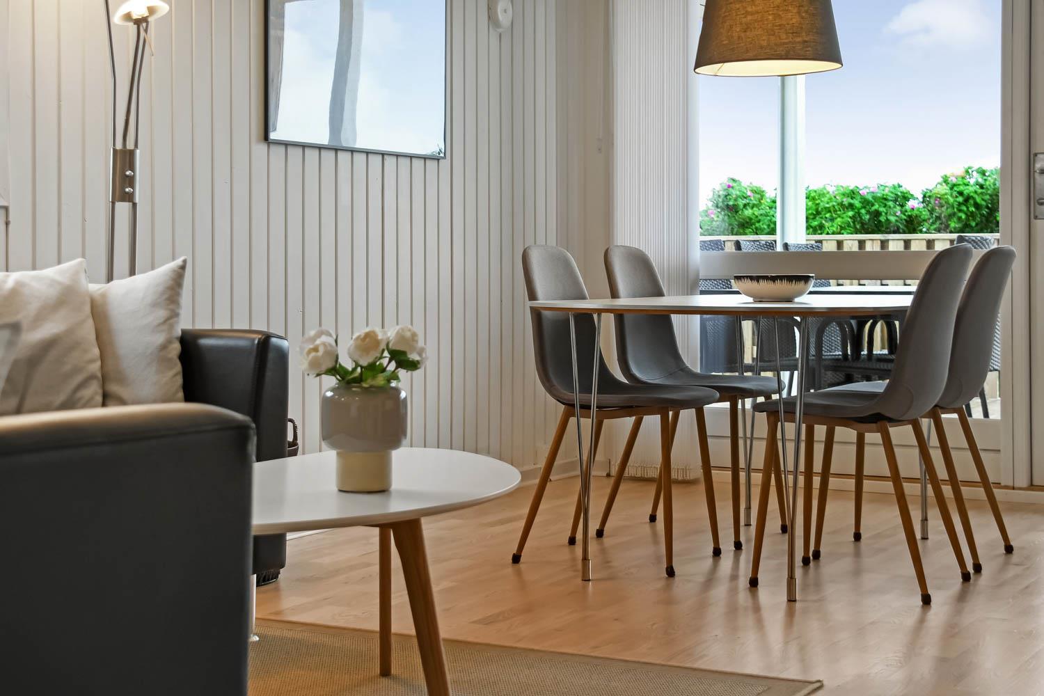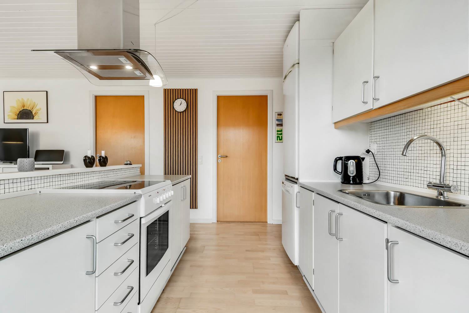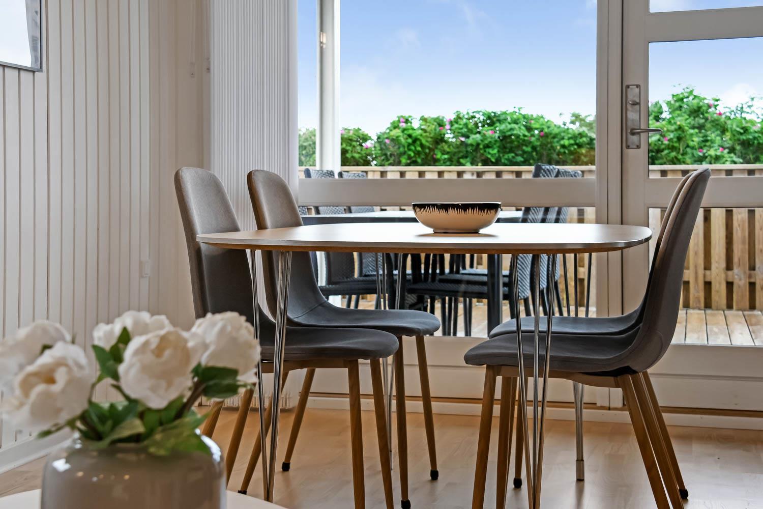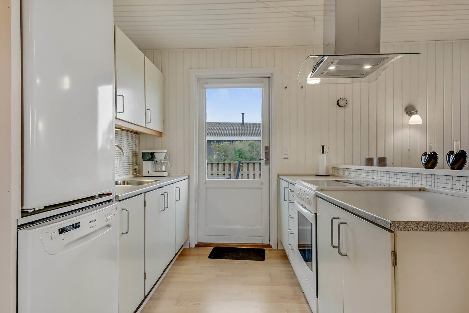 Fra stue og køkkenrummet er der 2 udgange til den store terrasseanlæg som er fortrinsvis syd og østvendt. Dette er meget praktisk, da den dominerende vindretning er vest og dermed har man ofte læ. Terrassen har både havemøbler, grill og 2 solvogne, så her er udstyret i orden til mange hyggelige afslappende timer. Der er kun 300 meter til Vejlby Torv med købmanden og Cafe John Wayne, så dette gør kun ferien endnu mere komfortabel. Vejlby Klit er omgivet af vand på begge sider med Vesterhavet mod vest som altid er et besøg værd. Her kan man bade, lave sandslotte, fiske, flyve med drage eller ganske enkelt blot gå een lang tur og nyde ensomheden eller familiens nærvær. Det samme gælder iøvrigt den tætte beliggenhed til Ferring Sø hvor der går en vandrerute rundt om.