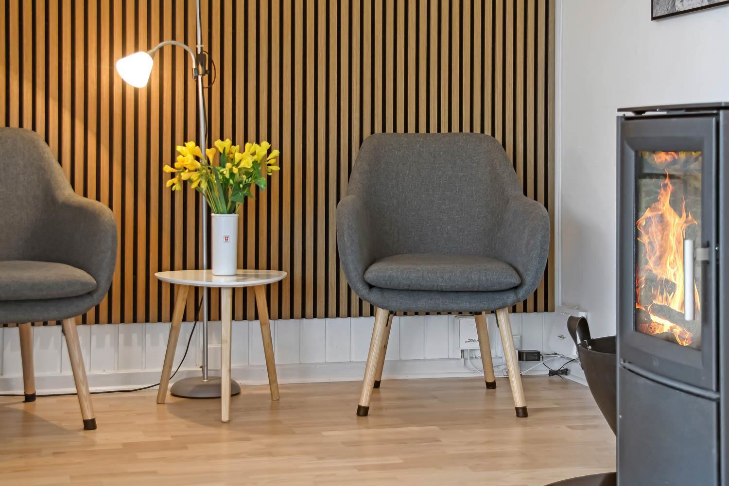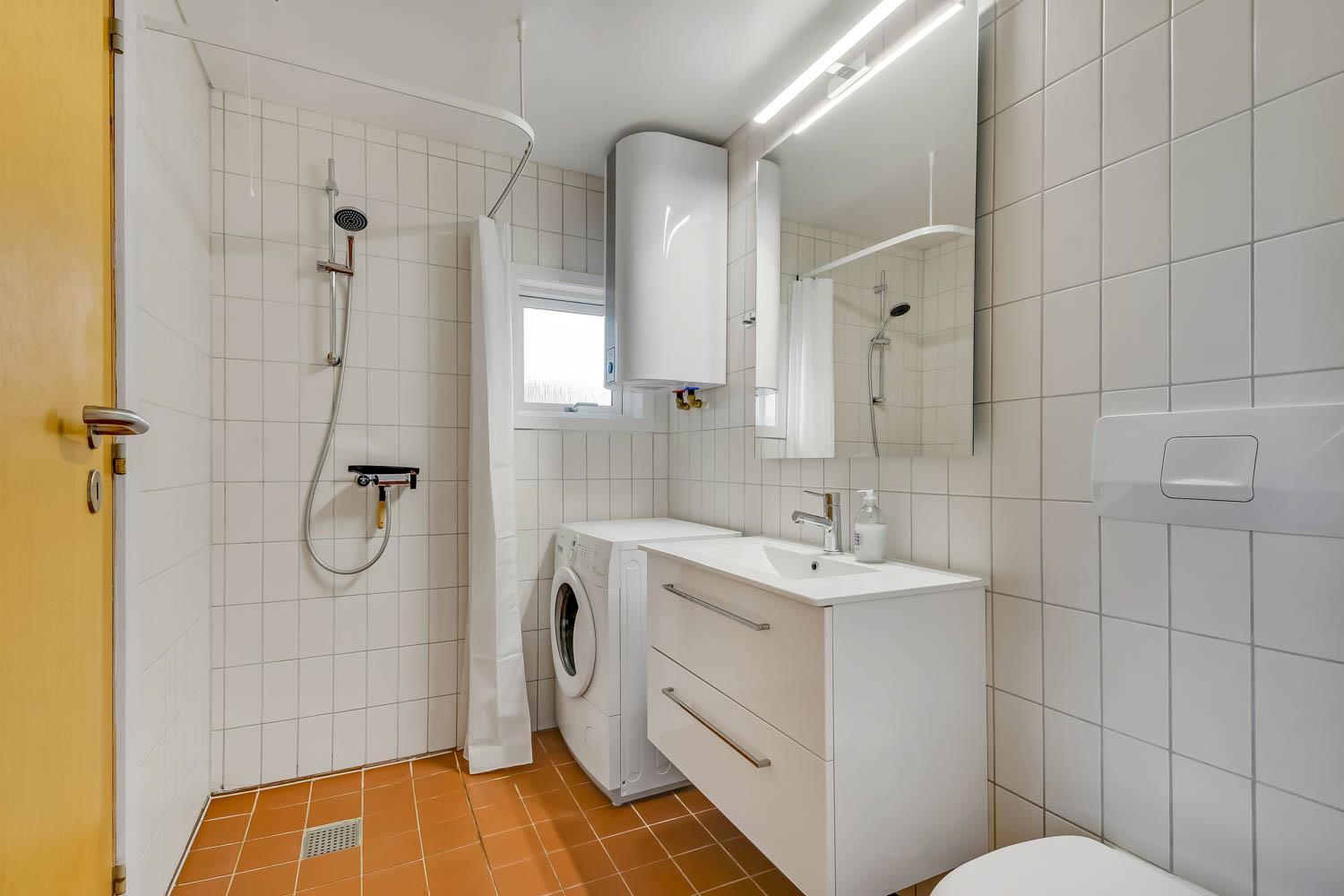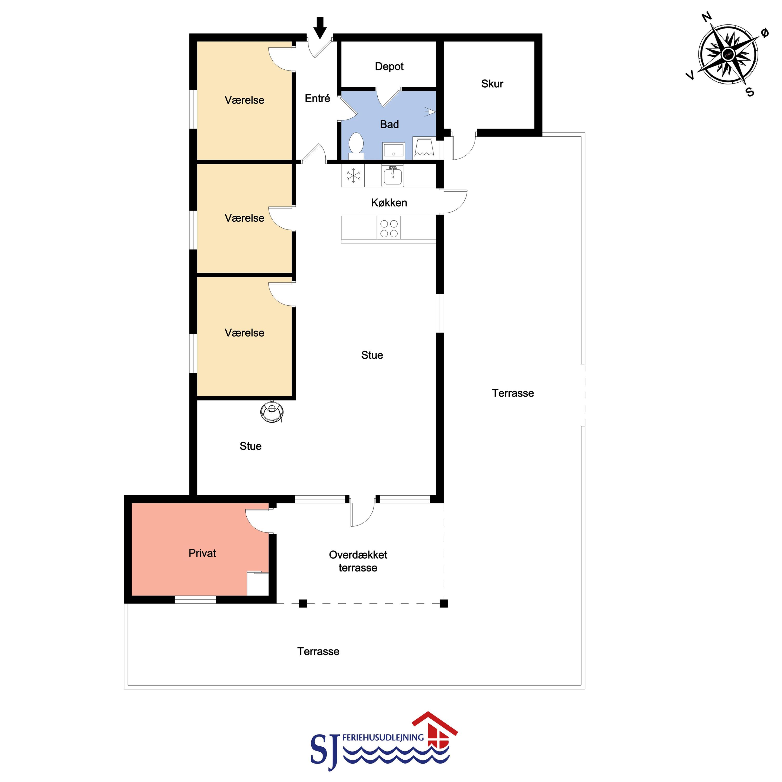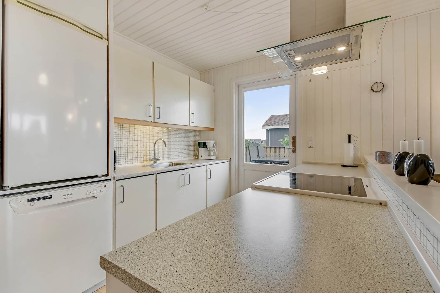 Fra stue og køkkenrummet er der 2 udgange til den store terrasseanlæg som er fortrinsvis syd og østvendt. Dette er meget praktisk, da den dominerende vindretning er vest og dermed har man ofte læ. Terrassen har både havemøbler, grill og 2 solvogne, så her er udstyret i orden til mange hyggelige afslappende timer. Der er kun 300 meter til Vejlby Torv med købmanden og Cafe John Wayne, så dette gør kun ferien endnu mere komfortabel. Vejlby Klit er omgivet af vand på begge sider med Vesterhavet mod vest som altid er et besøg værd. Her kan man bade, lave sandslotte, fiske, flyve med drage eller ganske enkelt blot gå een lang tur og nyde ensomheden eller familiens nærvær. Det samme gælder iøvrigt den tætte beliggenhed til Ferring Sø hvor der går en vandrerute rundt om.