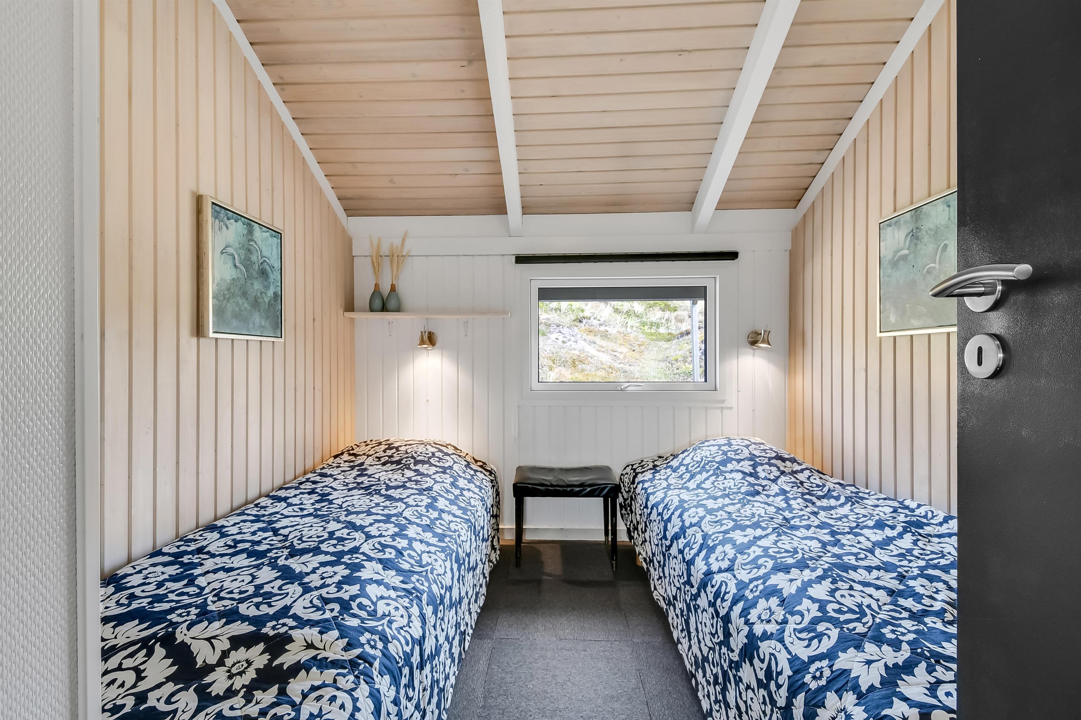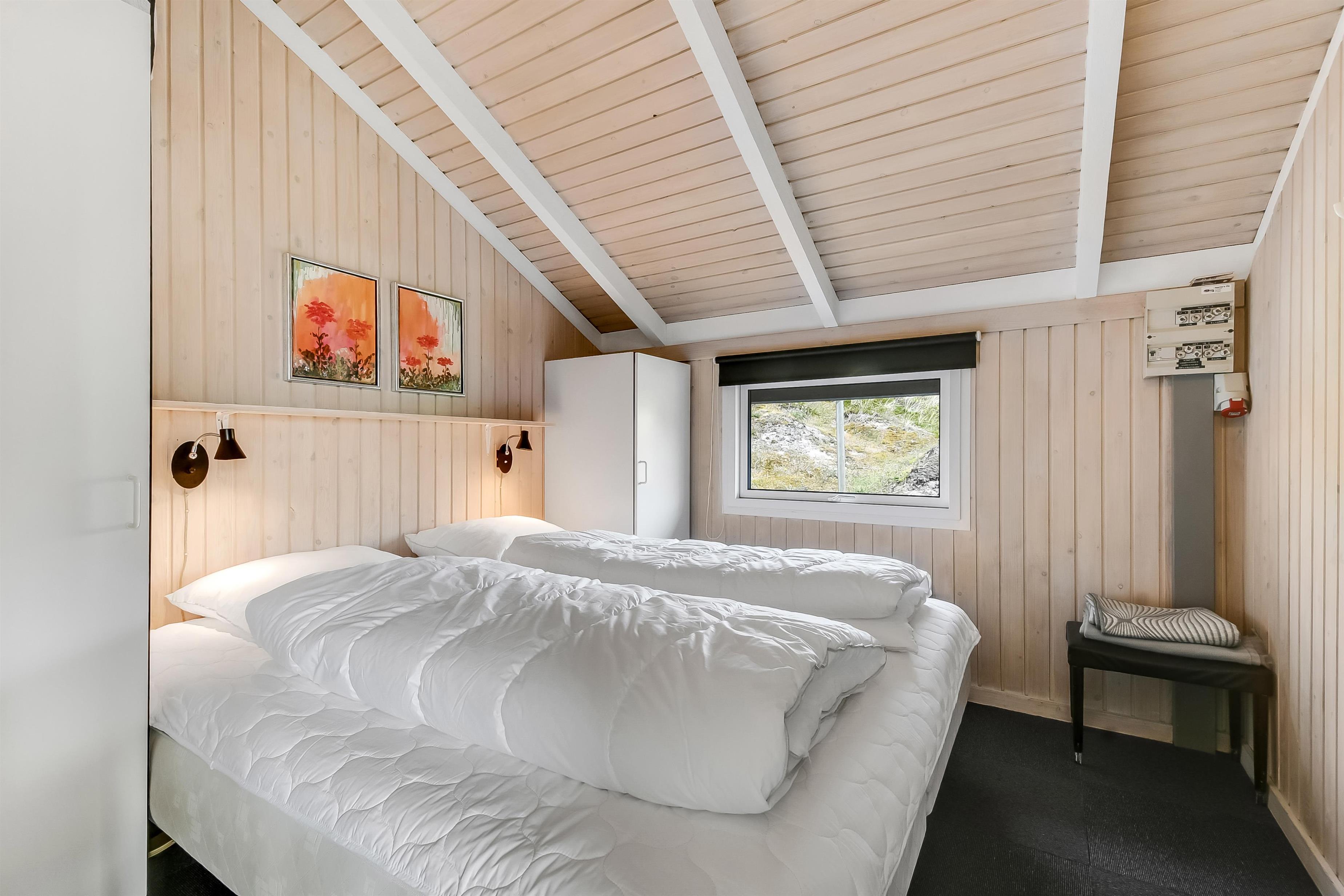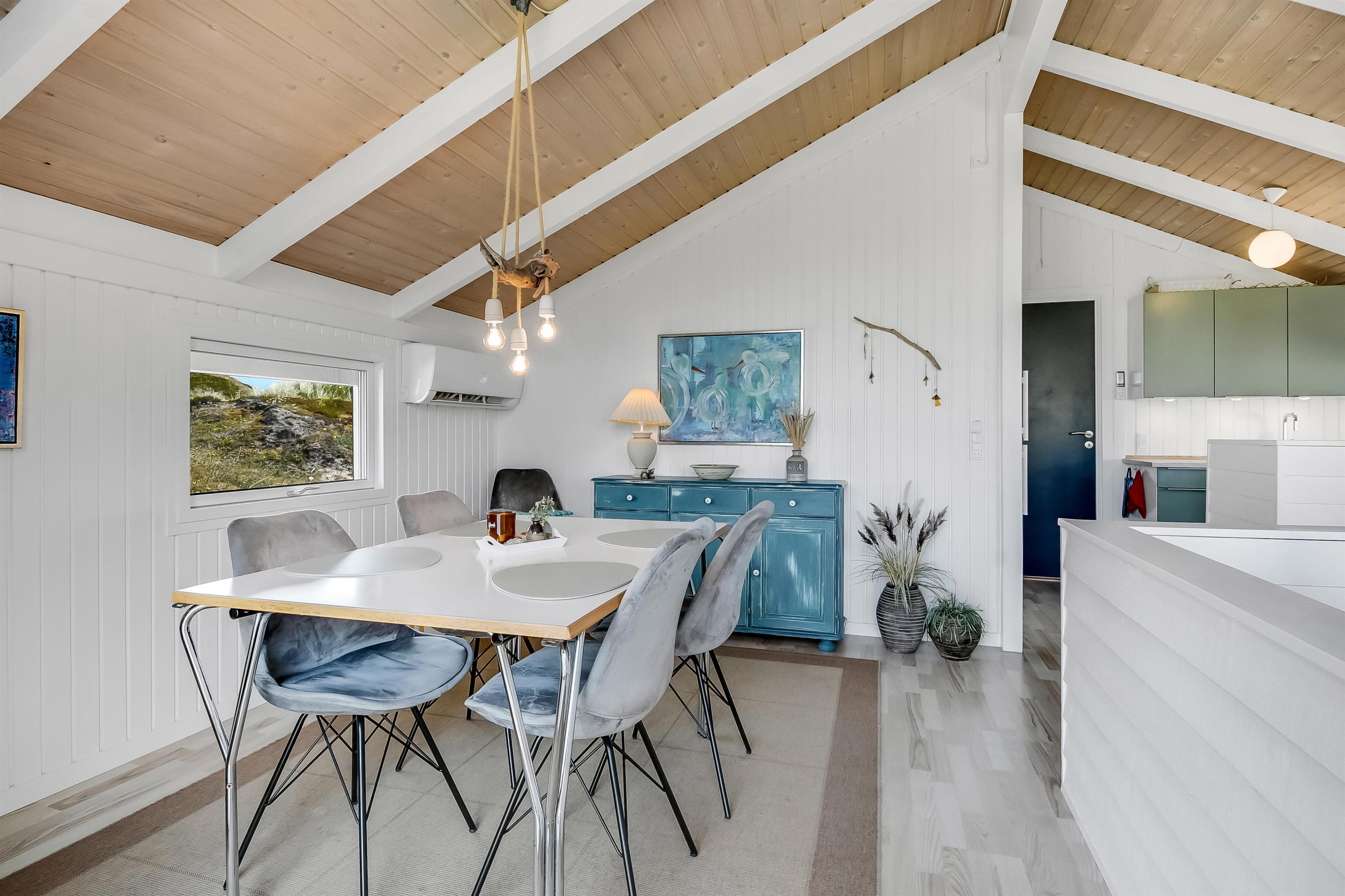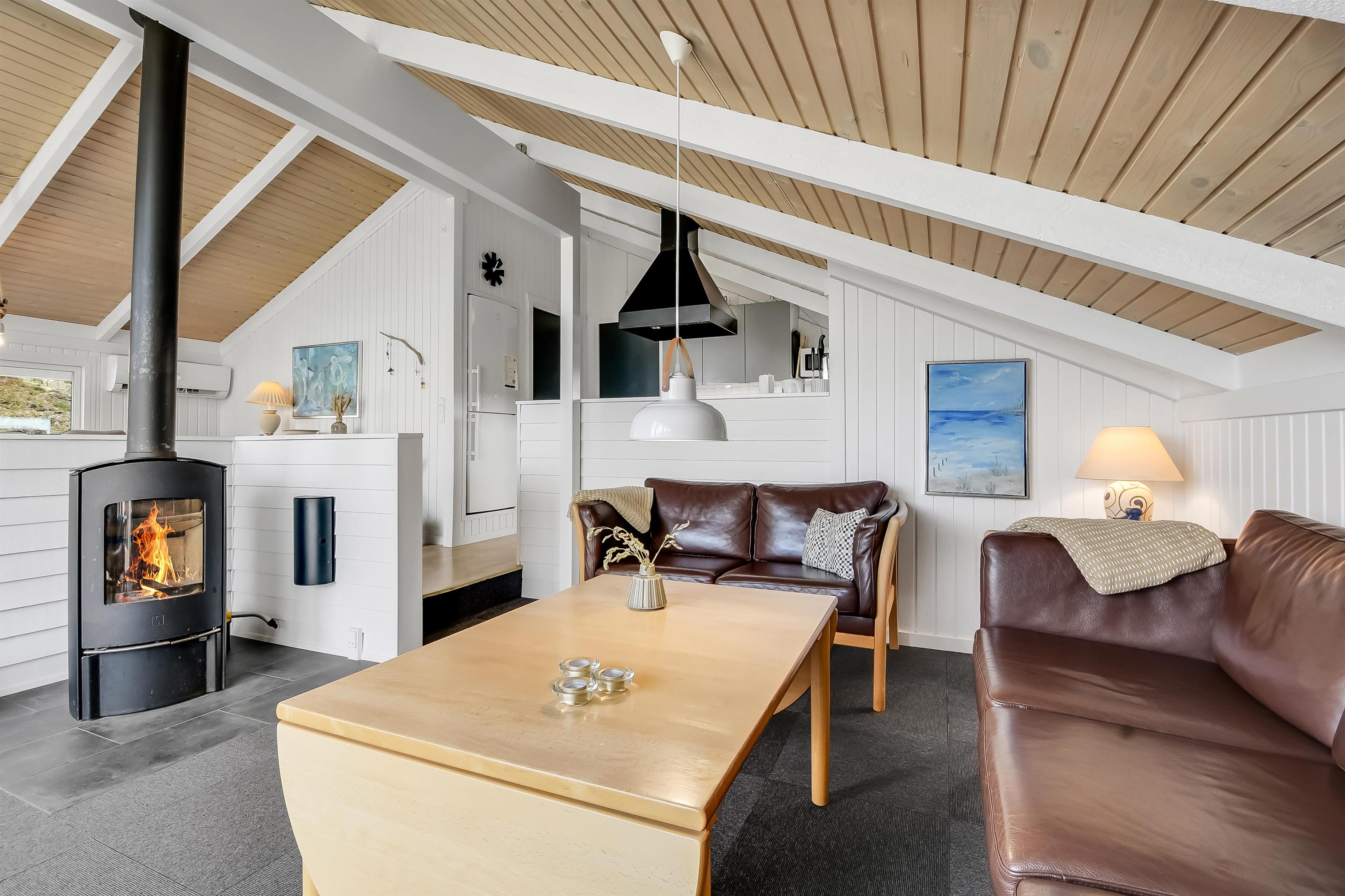 Huset indeholder en forsænket pejsestue kombineret med spisestue og køkken. Køkkenet er åbent og veludstyret. Pejsestuen er indrettet med lædermøbler, TV med danske og tyske programmer og en skøn brændeovn, som giver en hyggelig varme i de kolde perioder på året. Der er desuden DVD og stereoanlæg med CD. Spisestuen har et stort vinduesparti, så man fra spisebordet har en flot udsigt ud over området. Nyrenoveret badeværelse med toilet, håndvask og bruser og vaskemaskine. Huset har 4 soverum: 3 med dobbeltsenge og et med 2 enkeltsenge. Fra gangen er der adgang til husets sauna. Huset har 2 nyrenoverede terrasser, som er udstyret med havemøbler og liggestole. 1 husdyr er tilladt. Ikke ryger-hus.