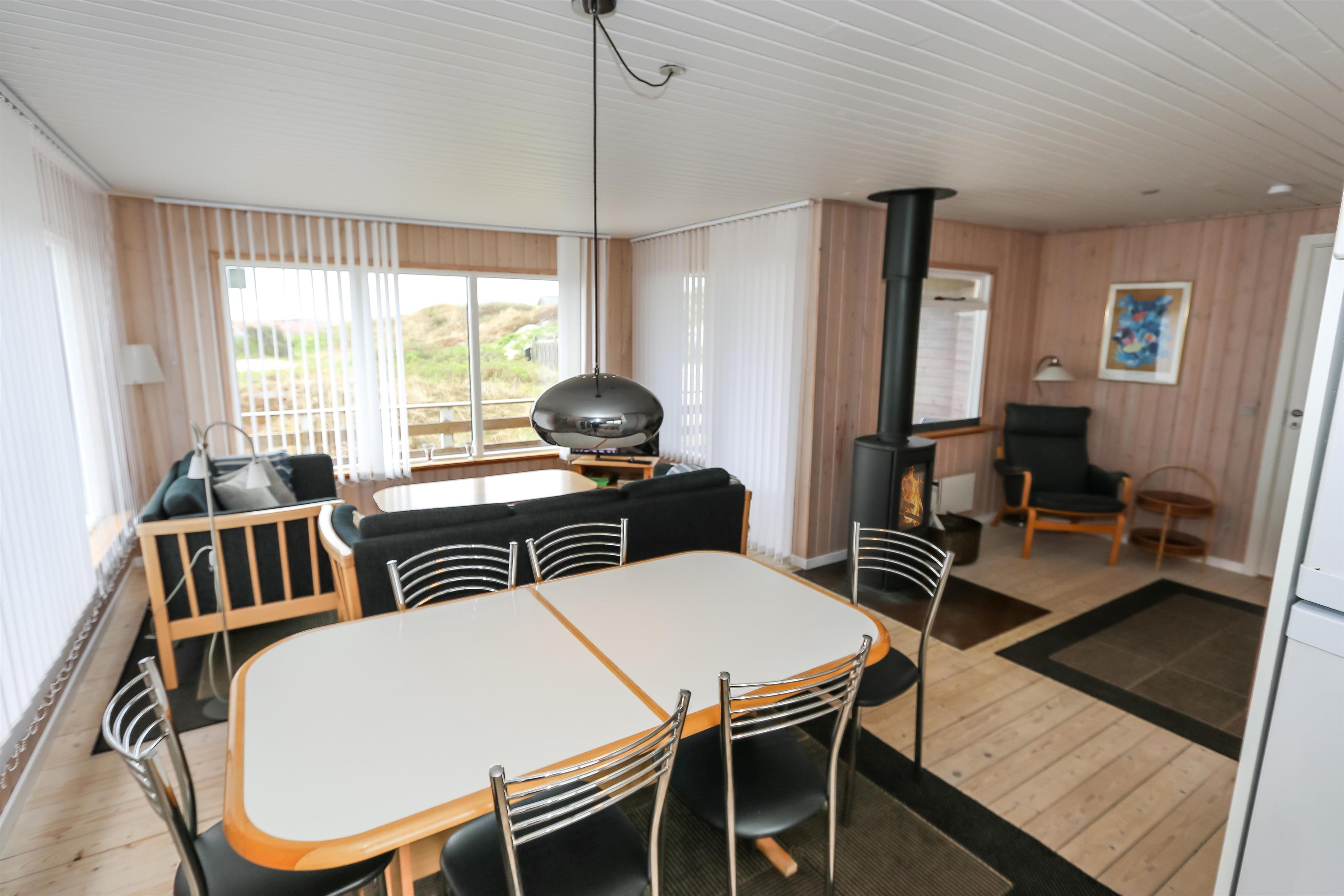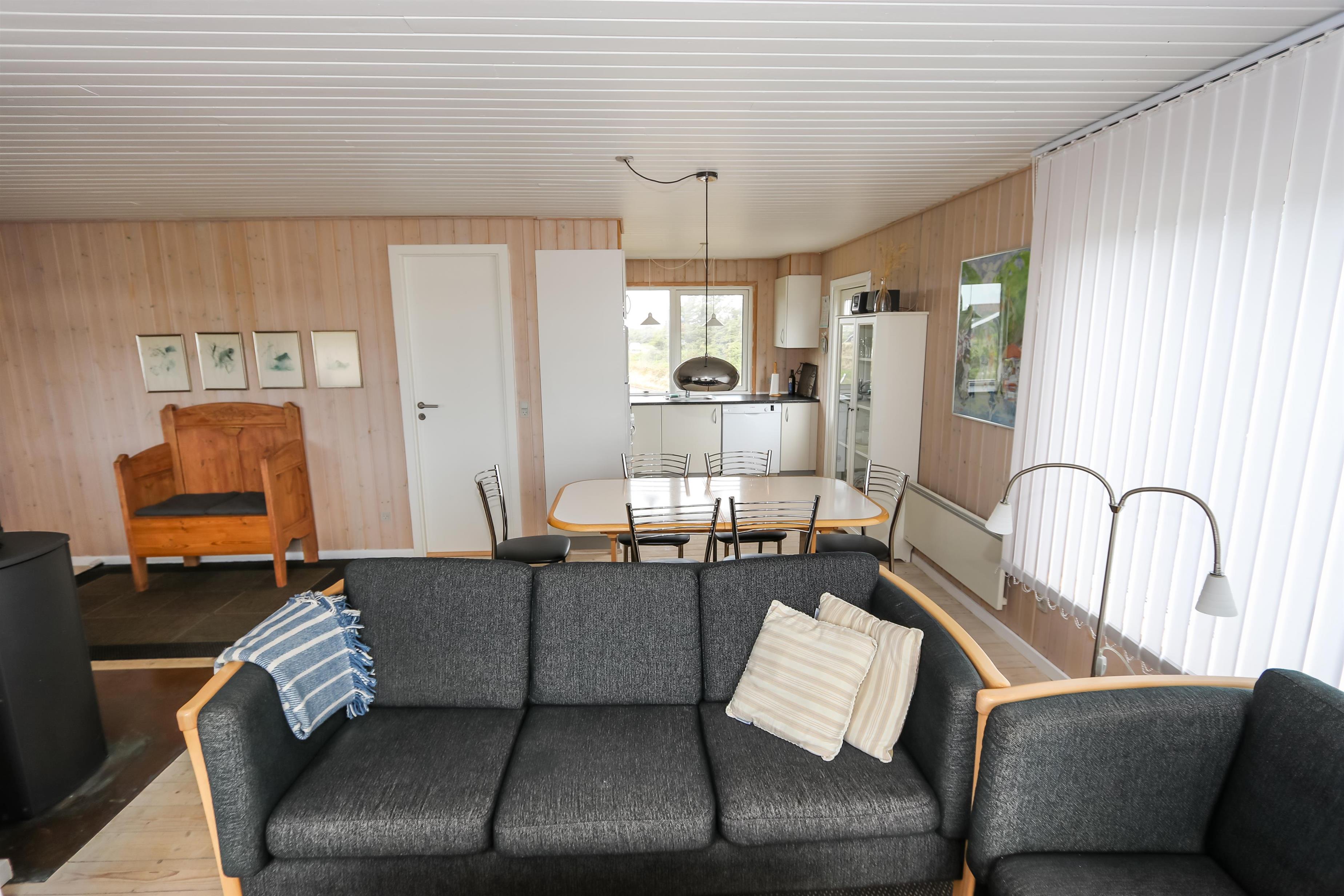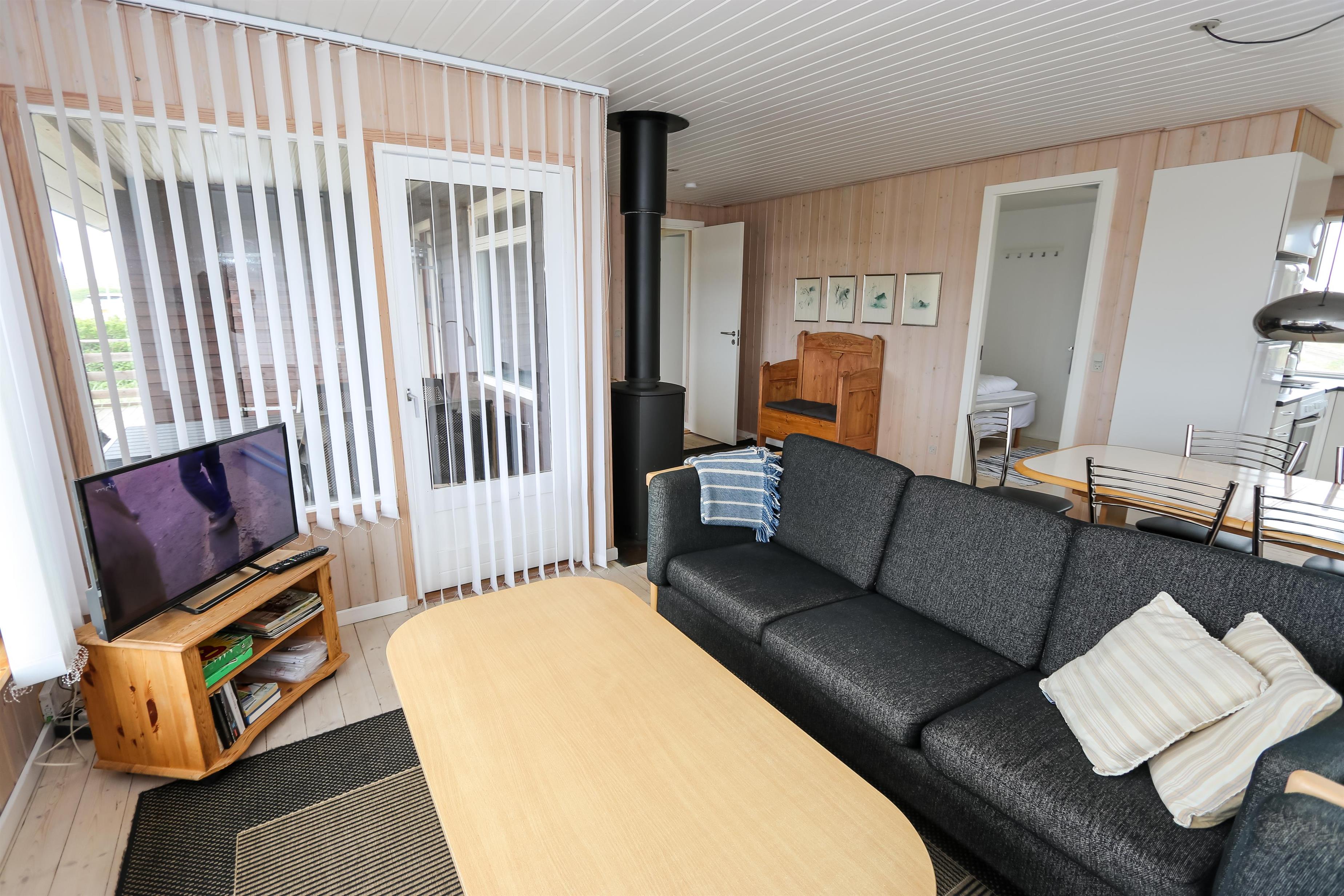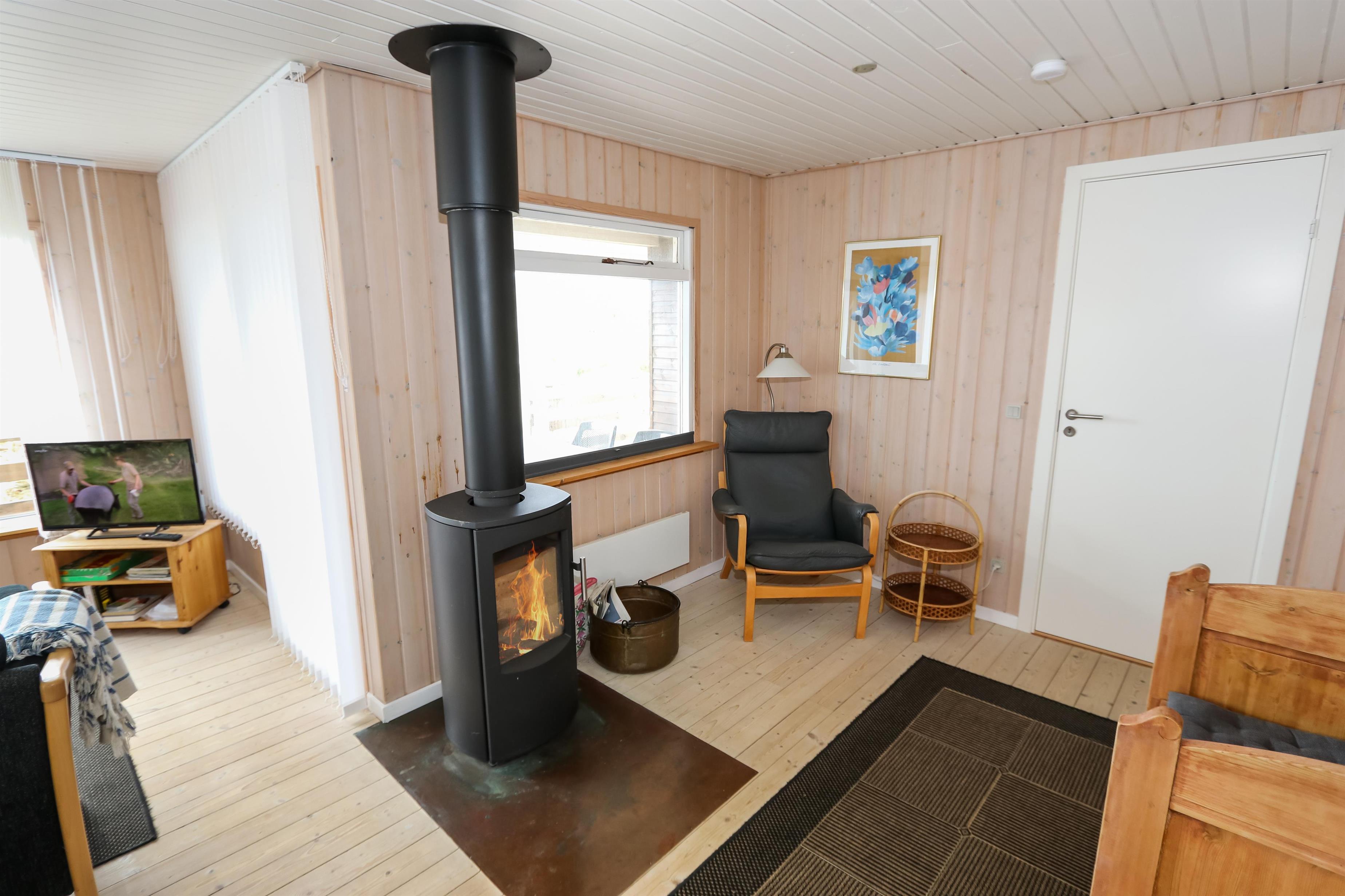 Indvendigt byder huset på smukke trælofter og trægulve med løse tæpper, som skaber en varm og hyggelig atmosfære. Den rummelige opholdsstue er indrettet med pæne og komfortable møbler og indbyder til afslapning efter en dag ved havet. Her kan I nyde varmen fra brændeovnen på køligere dage eller slappe af foran fladskærms-tv med parabol og et bredt udvalg af kanaler.